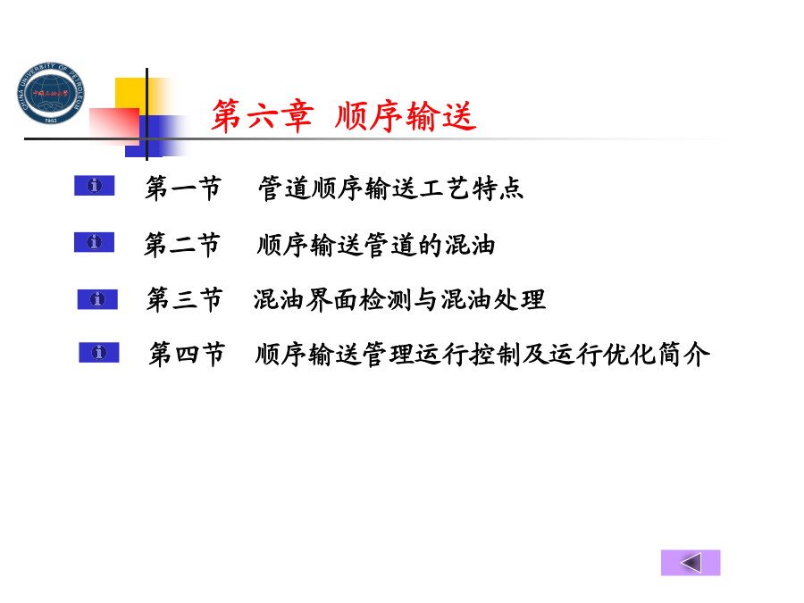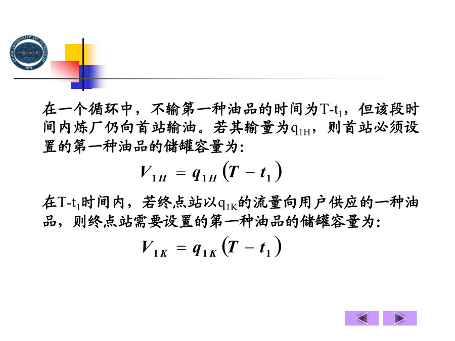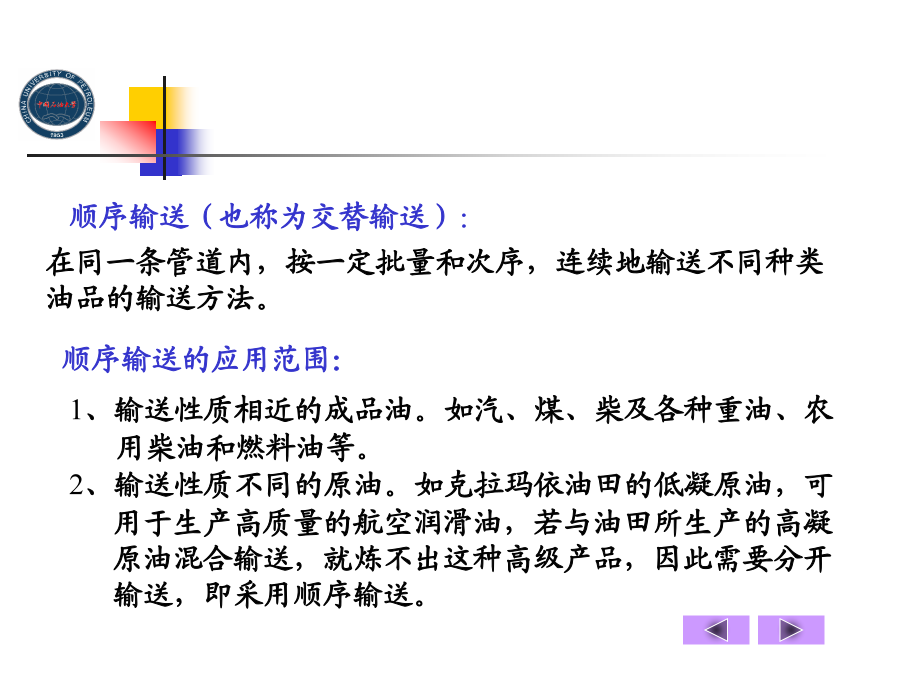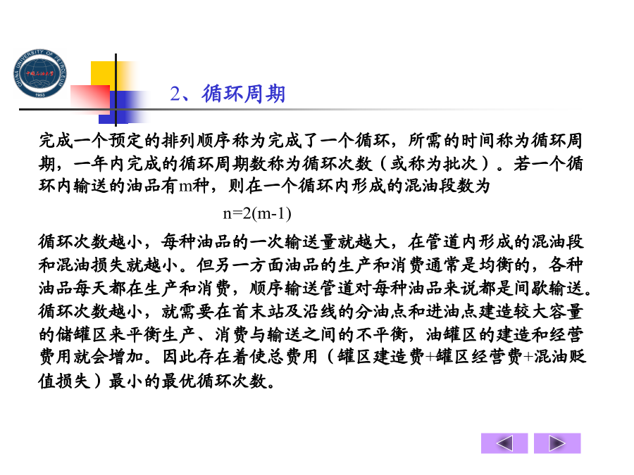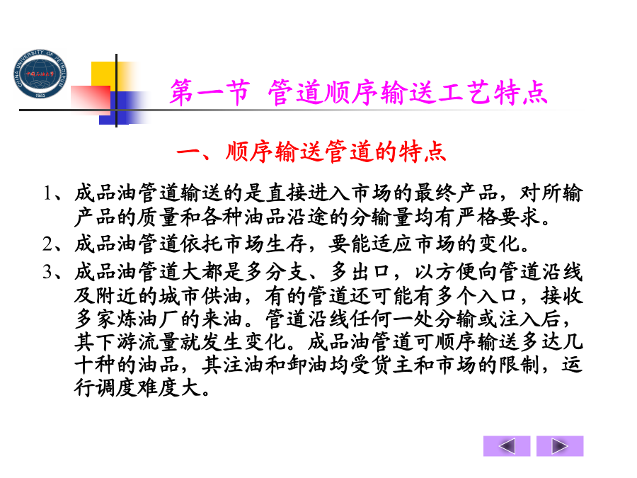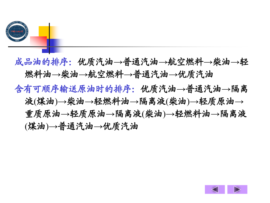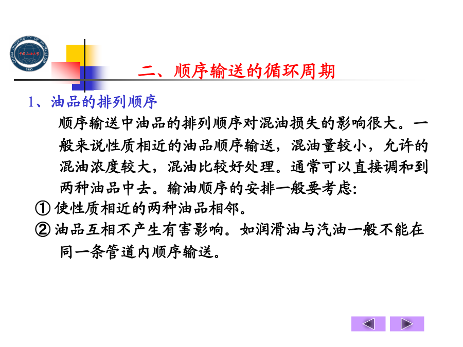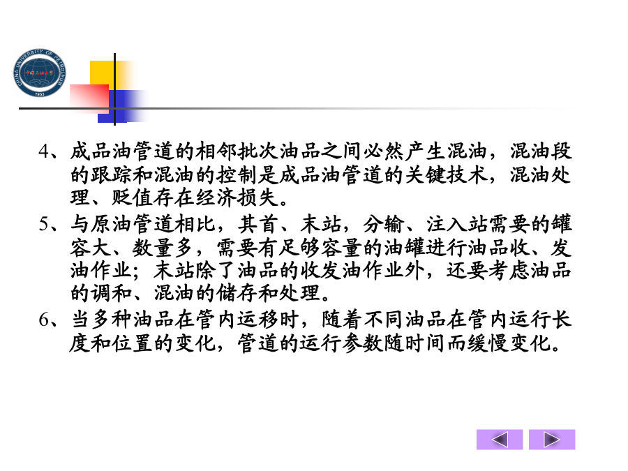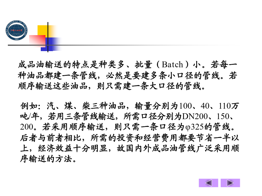 第一节管道顺序输送工艺特点顺序输送(也称为交替输送):成品油输送的特点是种类多、批量(Batch)小。若每一种油品都建一条管线,必然是要建多条小口径的管线。若顺序输送这些油品,则只需建一条大口径的管线。一、顺序输送管道的特点4、成品油管道的相邻批次油品之间必然产生混油,混油段的跟踪和混油的控制是成品油管道的关键技术,混油处理、贬值存在经济损失。5、与原油管道相比,其首、末站,分输、注入站需要的罐容大、数量多,需要有足够容量的油罐进行油品收、发油作业;末站除了油品的收发油作业外,还要考虑油品的调和、混油的储存和处理。6、当多种油品在管内运移时,随着不同油品在管内运行长度和位置的变化,管道的运行参数随时间而缓慢变化。二、顺序输送的循环周期成品油的排序:优质汽油→普通汽油→航空燃料→柴油→轻燃料油→柴油→航空燃料→普通汽油→优质汽油含有可顺序输送原油时的排序:优质汽油→普通汽油→隔离液(煤油)→柴油→轻燃料油→隔离液(柴油)→轻质原油→重质原油→轻质原油→隔离液(柴油)→轻燃料油→隔离液(煤油)→普通汽油→优质汽油完成一个预定的排列顺序称为完成了一个循环,所需的时间称为循环周期,一年内完成的循环周期数称为循环次数(或称为批次)。若一个循环内输送的油品有m种,则在一个循环内形成的混油段数为n=2(m-1)循环次数越小,每种油品的一次输送量就越大,在管道内形成的混油段和混油损失就越小。但另一方面油品的生产和消费通常是均衡的,各种油品每天都在生产和消费,顺序输送管道对每种油品来说都是间歇输送。循环次数越小,就需要在首末站及沿线的分油点和进油点建造较大容量的储罐区来平衡生产、消费与输送之间的不平衡,油罐区的建造和经营费用就会增加。因此存在着使总费用(罐区建造费+罐区经营费+混油贬值损失)最小的最优循环次数。三、循环次数和罐容的优化设计在一个循环中,不输第一种油品的时间为T-t1,但该段时间内炼厂仍向首站输油。若其输量为q1H,则首站必须设置的第一种油品的储罐容量为:若管线共有s个注入站分别与相邻的炼厂相连接,在T-t1时间内第一种油不能进输油管,需要在进油点设置储罐把炼厂来油储存起来。各注入站储存第一种油品的储罐总容量应为:若管线共有r个分输站,同样各分输站需设置的储存第一种油品的储罐总容量应为:为协调各种油品供、销、运之间的不平衡,输油管道全线需设置的储罐总容量分别为:分输站:式中:D──输油管道每年的工作时间;Dp──每年输送第p种油的时间;N──循环次数。E──石油工业规定的投资年回收系数;G──单位有效容积储罐的经营费用;A──每次循环混油的贬值损失,;n──每次循环混油段的数目;ai──第i个混油段的混油贬值损失;VKH──管道终点接收混油的储罐容量,VKH=(Vh-Vs)N;Vh──在循环周期内管道终点接收的混油量;Vs──在循环周期内能够销售或与纯净油调和的混油量。上式对循环次数N求导,可求得总损失费用最小的最优循环次数Nop说明:实际上批次(循环次数)和罐容优化是很难用上述公式进行计算的。因为成品油管道是面向市场的,虽然炼油厂的生产是连续的,但市场需求和销售并不似公式中给出的那么均匀。考虑原油和成品油价格随国际油价的变化、炼厂事故及停工检修等因素,需要在管道首末站多建一些油罐以适应市场变化使企业获得效益,加之储罐需要按系列选取,所以按上面的优化方法进行计算往往不能满足实际需要,但这些数学关系可便于管理者理清一些基本规律。一般情况下是以设计输量为基础,选择一系列循环次数进行罐容、占地、混油处理等等方面的技术经济比较,确定优化的循环次数。再根据设计规范确定各种油品所需的油罐容量和个数。在首末站应留有一定量的备用罐以备事故时管道正常输油。同时应考虑市场变化对末站罐容的影响。每种油品至少应设置2-3座油罐。顺序输送轻质成品油的管道,沿线不需要加热。在管内油品流速不是很高的情况下,油品在管道中输送一段距离后,管内油温将等于管道埋深处的地温。管道压降计算及泵站特性计算公式与等温管道相同。对于流速比较高的情况,必须对成品油管道沿线的摩擦温升给予关注。当输送介质为轻质油品且流速大时,温升现象明显。油品流动的水力特性与物性、温度密切相关,而温度分布又与流动特性相关。因此,在成品油管道设计、运行、管理和离线仿真中,应正确反应油品温度变化的影响,这对判断是否存在泄漏,正确跟踪顺序输送过程中的油品界面也是十分必要的。1、输油管道中油流温度升高的主要原因2、成品油管道温度变化的计算(1)计算油品通过泵站的温升,主要是泵内损失转化的热能,对于轻烃要考虑经过泵压缩而升高的油温;(2)计算油品在站间流动时的摩擦温升,管道中油流的摩擦温升是压力损失、液体的质量流量、油品粘度和密度的函数;(3)计算站间管道向环境散热的温降,这与