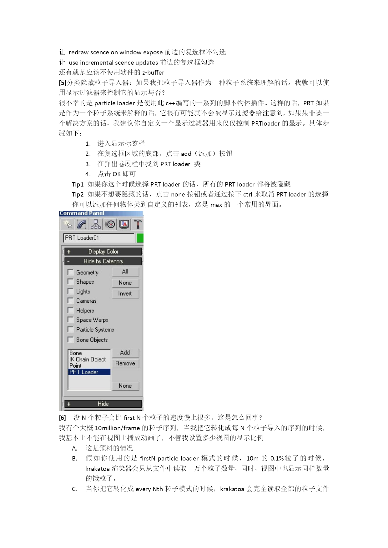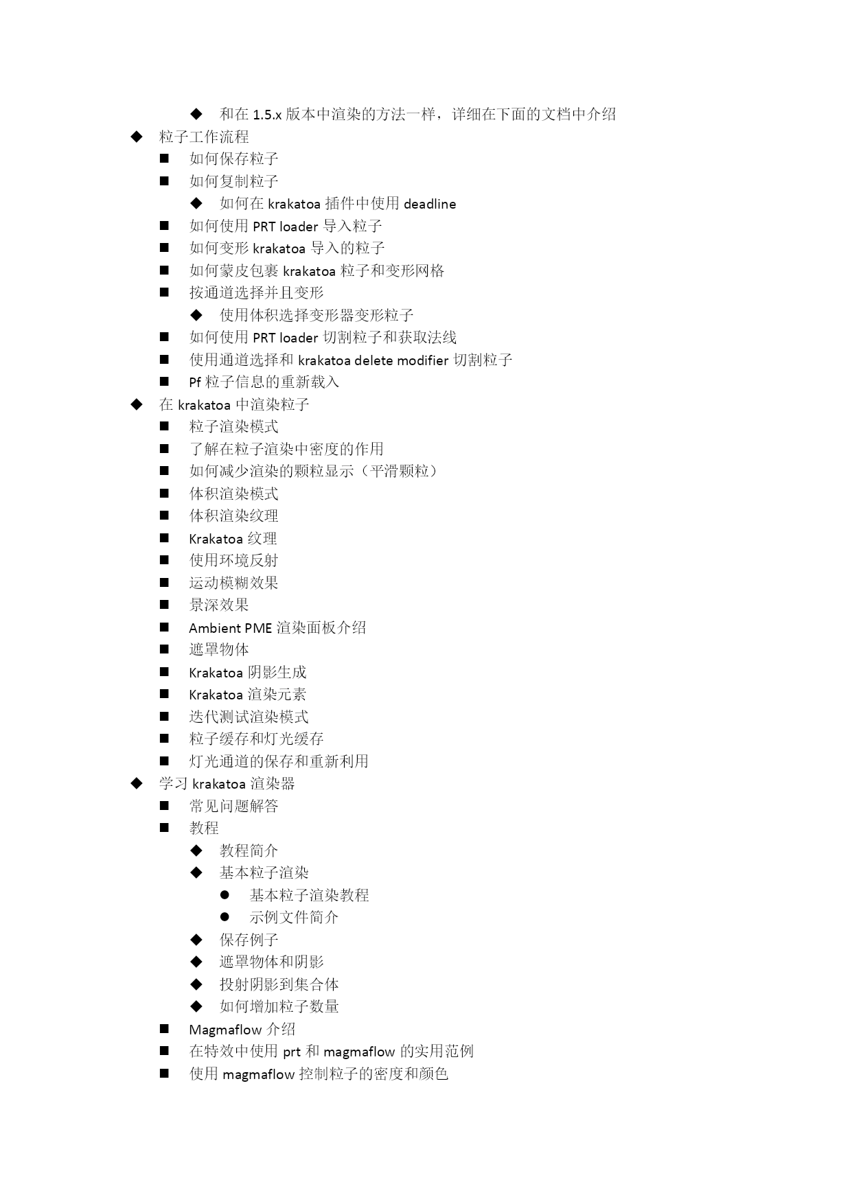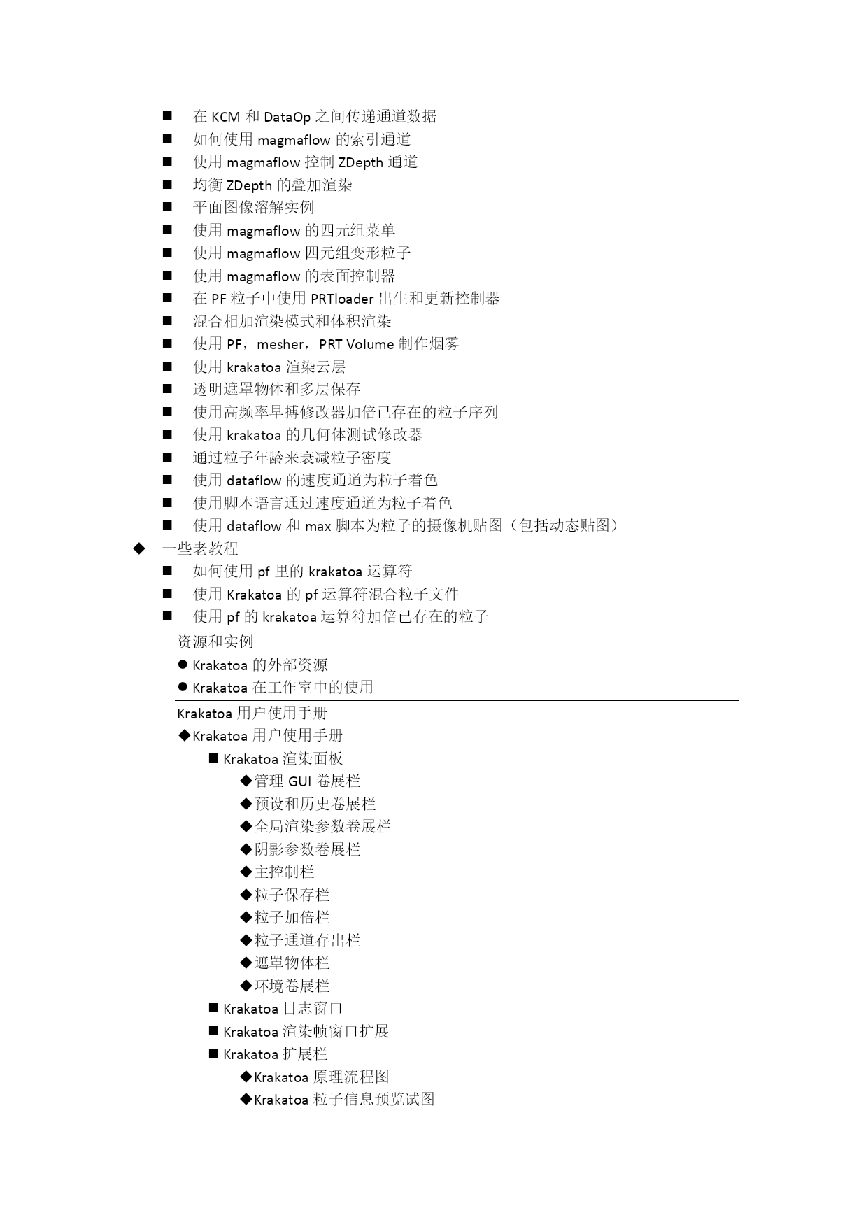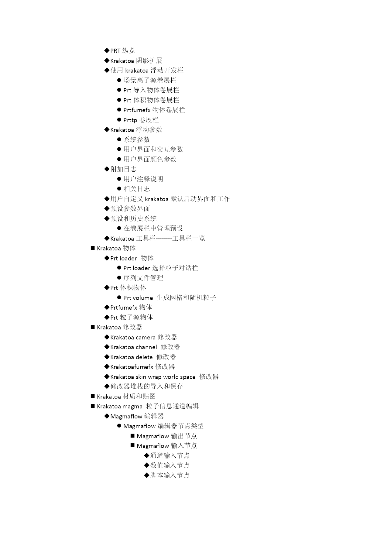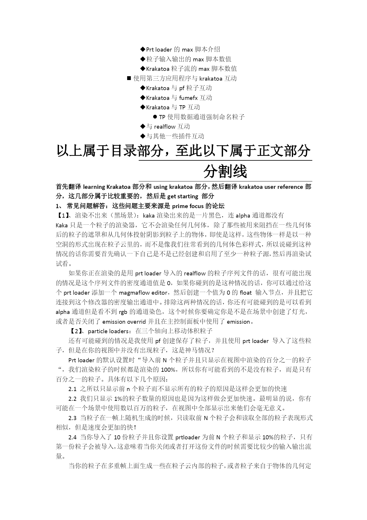 Krakatoa1.60用户使用手册内容概要:最新更新至:2010年9月8号(注意:本文档仅仅适用于krakatoav1.6.0版本,如果您现在使用的是krakatoav1.5.x系列版本的话,您可以在网上重新搜索到后发给我,我重新给您翻译一遍,一般来说,高版本的包括低版本的各种主要内容)目录指引快速开始Krakatoa介绍和安装Krakatoa插件简介Krakatoa插件各个版本历史系统需求在一个工作站中为3dsmax安装krakatoa插件注册(该部分由于使用的是破解版,省略)在渲染节点中安装krakatoa插件简单错误介绍及解决Krakatoa脚本——krakatoa菜单和工具栏渲染器的设置3dsMax设置Krakatoa主界面快速预览Krakatoa插件的使用3dsMax的整合支持的3dsMax的物体类型和属性支持的摄像机和灯光类型支持的材质和贴图类型支持标准材质支持建筑材质支持混合材质支持复合材质支持多为自对象材质支持顶底材质支持位图贴图支持相机贴图支持衰减贴图支持定点着色贴图可以渲染的粒子来源渲染particleflow粒子渲染max内置基本粒子渲染物体顶点渲染PRTloader导入的物体渲染PRTVolume物体渲染thinkingparticle粒子渲染fumefx模拟的粒子和在1.5.x版本中渲染的方法一样,详细在下面的文档中介绍粒子工作流程如何保存粒子如何复制粒子如何在krakatoa插件中使用deadline如何使用PRTloader导入粒子如何变形krakatoa导入的粒子如何蒙皮包裹krakatoa粒子和变形网格按通道选择并且变形使用体积选择变形器变形粒子如何使用PRTloader切割粒子和获取法线使用通道选择和krakatoadeletemodifier切割粒子Pf粒子信息的重新载入在krakatoa中渲染粒子粒子渲染模式了解在粒子渲染中密度的作用如何减少渲染的颗粒显示(平滑颗粒)体积渲染模式体积渲染纹理Krakatoa纹理使用环境反射运动模糊效果景深效果AmbientPME渲染面板介绍遮罩物体Krakatoa阴影生成Krakatoa渲染元素迭代测试渲染模式粒子缓存和灯光缓存灯光通道的保存和重新利用学习krakatoa渲染器常见问题解答教程教程简介基本粒子渲染基本粒子渲染教程示例文件简介保存例子遮罩物体和阴影投射阴影到集合体如何增加粒子数量Magmaflow介绍在特效中使用prt和magmaflow的实用范例使用magmaflow控制粒子的密度和颜色在KCM和DataOp之间传递通道数据如何使用magmaflow的索引通道使用magmaflow控制ZDepth通道均衡ZDepth的叠加渲染平面图像溶解实例使用magmaflow的四元组菜单使用magmaflow四元组变形粒子使用magmaflow的表面控制器在PF粒子中使用PRTloader出生和更新控制器混合相加渲染模式和体积渲染使用PF,mesher,PRTVolume制作烟雾使用krakatoa渲染云层透明遮罩物体和多层保存使用高频率早搏修改器加倍已存在的粒子序列使用krakatoa的几何体测试修改器通过粒子年龄来衰减粒子密度使用dataflow的速度通道为粒子着色使用脚本语言通过速度通道为粒子着色使用dataflow和max脚本为粒子的摄像机贴图(包括动态贴图)一些老教程如何使用pf里的krakatoa运算符使用Krakatoa的pf运算符混合粒子文件使用pf的krakatoa运算符加倍已存在的粒子资源和实例Krakatoa的外部资源Krakatoa在工作室中的使用Krakatoa用户使用手册Krakatoa用户使用手册Krakatoa渲染面板管理GUI卷展栏预设和历史卷展栏全局渲染参数卷展栏阴影参数卷展栏主控制栏粒子保存栏粒子加倍栏粒子通道存出栏遮罩物体栏环境卷展栏Krakatoa日志窗口Krakatoa渲染帧窗口扩展Krakatoa扩展栏Krakatoa原理流程图Krakatoa粒子信息预览试图PRT纵览Krakatoa阴影扩展使用krakatoa浮动开发栏场景离子源卷展栏Prt导入物体卷展栏Prt体积物体卷展栏Prtfumefx物体卷展栏Prttp卷展栏Krakatoa浮动参数系统参数用户界面和交互参数用户界面颜色参数附加日志用户注释说明相关日志用户自定义krakatoa默认启动界面和工作预设参数界面预设和历史系统在卷展栏中管理预设Krakat
