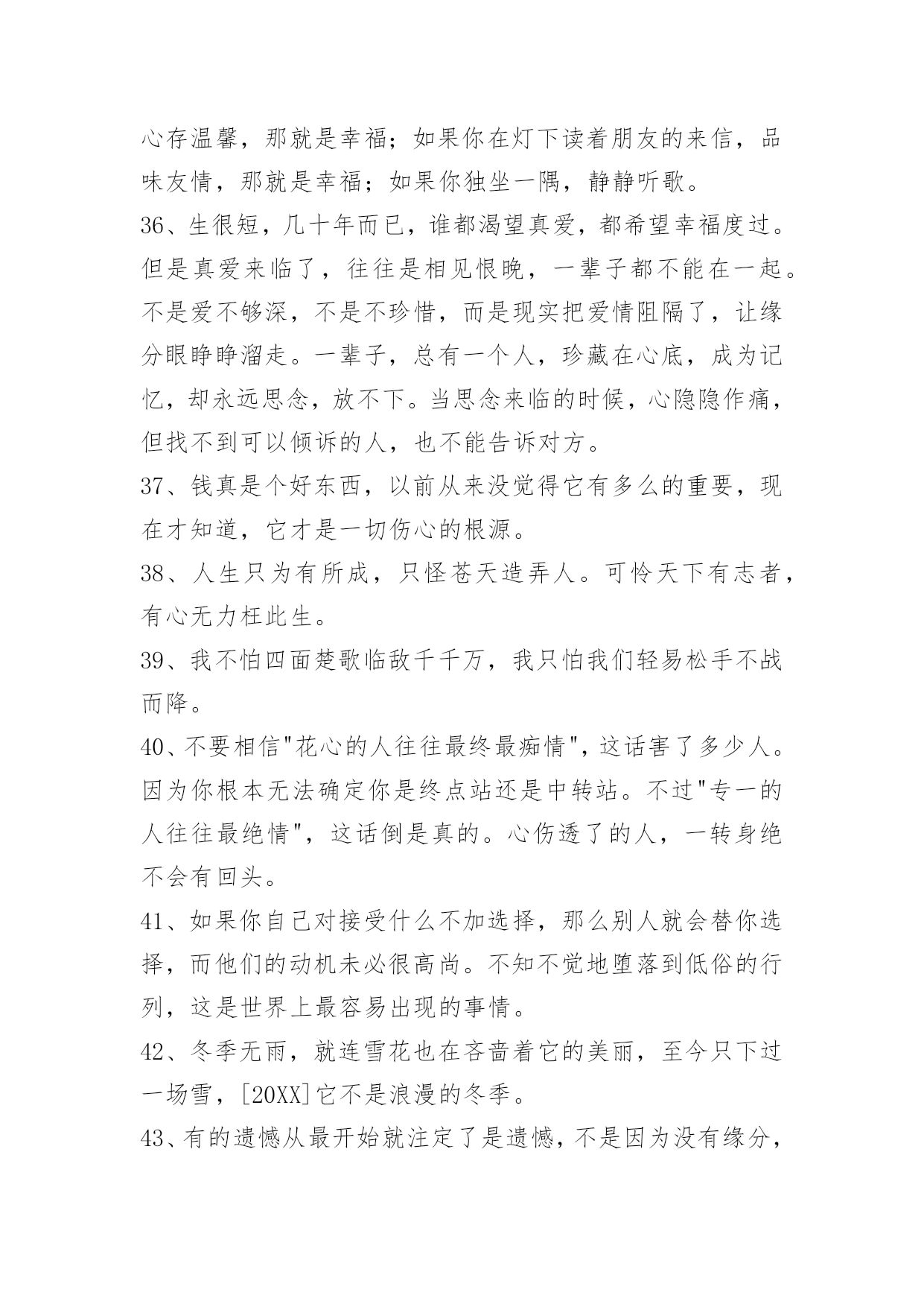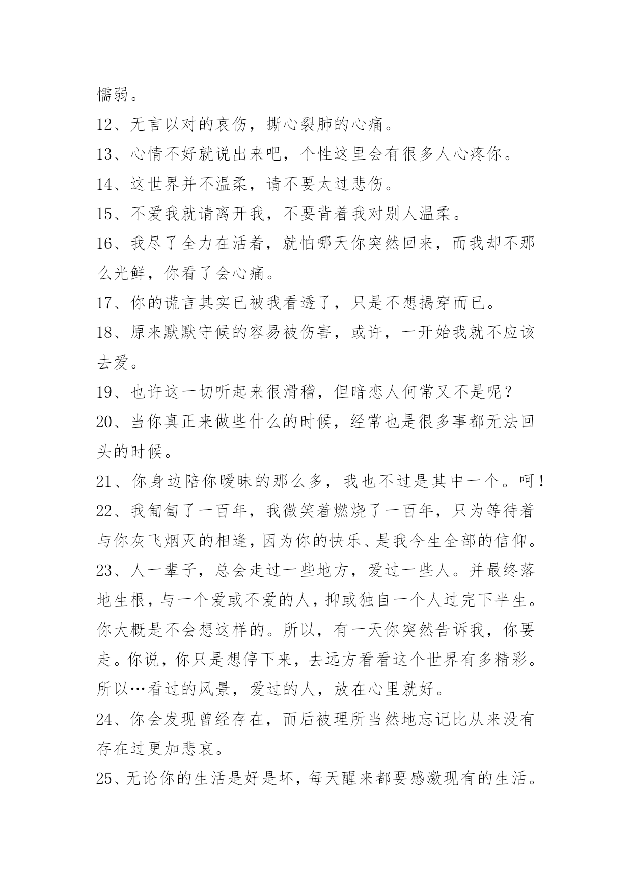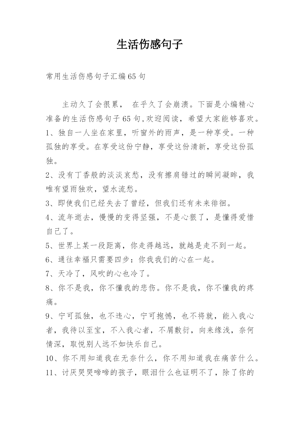 生活伤感句子常用生活伤感句子汇编65句主动久了会很累,在乎久了会崩溃。下面是小编精心准备的生活伤感句子65句,欢迎阅读,希望大家能够喜欢。1、独自一人坐在家里,听窗外的雨声,是一种享受。一种孤独的享受。在享受这份宁静,享受这份清新,享受这份孤独。2、没有丁香般的淡淡哀愁,没有擦肩错过的瞬间凝眸,我唯有望雨独欢,望水流愁。3、即使我们已经失去了曾经,但我们还有未来徘徊。4、流年逝去,慢慢的变得坚强,不是心狠了,是懂得爱惜自己了。5、世界上某一段距离,你走得越远,就越是走不到一起。6、通往幸福只需要四步:你我我们的心在一起。7、天冷了,风吹的心也冷了。8、你不是我,你不懂我的悲伤。你不是我,你不懂我的疼痛。9、宁可孤独,也不违心,宁可抱憾,也不将就,能入我心者,我待以至宝,不入我心者,不屑敷衍,向来缘浅,奈何情深,取悦别人远不如快乐自己。10、你不用知道我在无奈什么,你不用知道我在痛苦什么。11、讨厌哭哭啼啼的孩子,眼泪什么也证明不了,除了你的懦弱。12、无言以对的哀伤,撕心裂肺的心痛。13、心情不好就说出来吧,个性这里会有很多人心疼你。14、这世界并不温柔,请不要太过悲伤。15、不爱我就请离开我,不要背着我对别人温柔。16、我尽了全力在活着,就怕哪天你突然回来,而我却不那么光鲜,你看了会心痛。17、你的谎言其实已被我看透了,只是不想揭穿而已。18、原来默默守候的容易被伤害,或许,一开始我就不应该去爱。19、也许这一切听起来很滑稽,但暗恋人何常又不是呢?20、当你真正来做些什么的时候,经常也是很多事都无法回头的时候。21、你身边陪你暧昧的那么多,我也不过是其中一个。呵!22、我匍匐了一百年,我微笑着燃烧了一百年,只为等待着与你灰飞烟灭的相逢,因为你的快乐、是我今生全部的信仰。23、人一辈子,总会走过一些地方,爱过一些人。并最终落地生根,与一个爱或不爱的人,抑或独自一个人过完下半生。你大概是不会想这样的。所以,有一天你突然告诉我,你要走。你说,你只是想停下来,去远方看看这个世界有多精彩。所以…看过的风景,爱过的人,放在心里就好。24、你会发现曾经存在,而后被理所当然地忘记比从来没有存在过更加悲哀。25、无论你的生活是好是坏,每天醒来都要感激现有的生活。要知道某些地方的某些人还在为生存而苦苦挣扎。26、没什么是比和你在一起更幸福的事。27、如果不曾遇到你,我还会不会如此时一样伤感,闭眼沉思,脑海中还是你的身影和脸庞。28、恣意奔波挥洒的青春,色彩斑斓的美好年华,青春流逝,内心是惆怅与悲伤,孤独的灵魂,总爱寻找"空山星雨后,天气晚来秋"的慰藉。虽在奔跑,却依旧留恋,不舍。29、人生如初见,当一颗疲惫了的心,在曾经相处的时光中纠缠,当所有欢乐的瞬间在回忆里一一呈现。30、我们永远就像旋转木马,总是不停地追赶,却总也无法逾越那既定的距离!想触摸你的心,可是,我却无能为力。31、多年后,年华已去,青春已老,你不再骄傲、粗心,我不再自卑、敏感,可是,我们却再不会那么用力、那么用力地去爱。我只能唱起那首老歌,在泪光中,回忆起你曾很认真、很笨拙地爱过我,一个人微笑。32、相爱可以不必轻易地急于付出,但如若付出,请不要后悔,也不必痛恨,因为曾经的那一刻你们是相爱的,即使他是欺骗,也请相信,在那一刻,你的美丽。33、总有几颗泪,其中的每一次抽泣,你都愿意拿满手的承诺去代替。34、爱情,是命运布下的一个局,聚散离合无法摆脱宿命的安排,无论抗拒,还是不抗拒,都难逃脱宿命的劫,这就是命,一个人的宿命。35、时时刻刻围绕在你身旁。如果你从母亲手中接过饭碗,心存温馨,那就是幸福;如果你在灯下读着朋友的来信,品味友情,那就是幸福;如果你独坐一隅,静静听歌。36、生很短,几十年而已,谁都渴望真爱,都希望幸福度过。但是真爱来临了,往往是相见恨晚,一辈子都不能在一起。不是爱不够深,不是不珍惜,而是现实把爱情阻隔了,让缘分眼睁睁溜走。一辈子,总有一个人,珍藏在心底,成为记忆,却永远思念,放不下。当思念来临的时候,心隐隐作痛,但找不到可以倾诉的人,也不能告诉对方。37、钱真是个好东西,以前从来没觉得它有多么的重要,现在才知道,它才是一切伤心的根源。38、人生只为有所成,只怪苍天造弄人。可怜天下有志者,有心无力枉此生。39、我不怕四面楚歌临敌千千万,我只怕我们轻易松手不战而降。40、不要相信"花心的人往往最终最痴情",这话害了多少人。因为你根本无法确定你是终点站还是中转站。不过"专一的人往往最绝情",这话倒是真的。心伤透了的人,一转身绝不会有回头。41、如果你自己对接受什么不加选择,那么别人就会替你选择,而他们的动机未必很高尚。不知不觉地堕落到低俗的行列,这是世界上最容易出现的事情。42、冬季无雨,就连雪花也在吝啬着它的美丽,至今只下过一场雪,[20XX]它不是浪漫的冬季