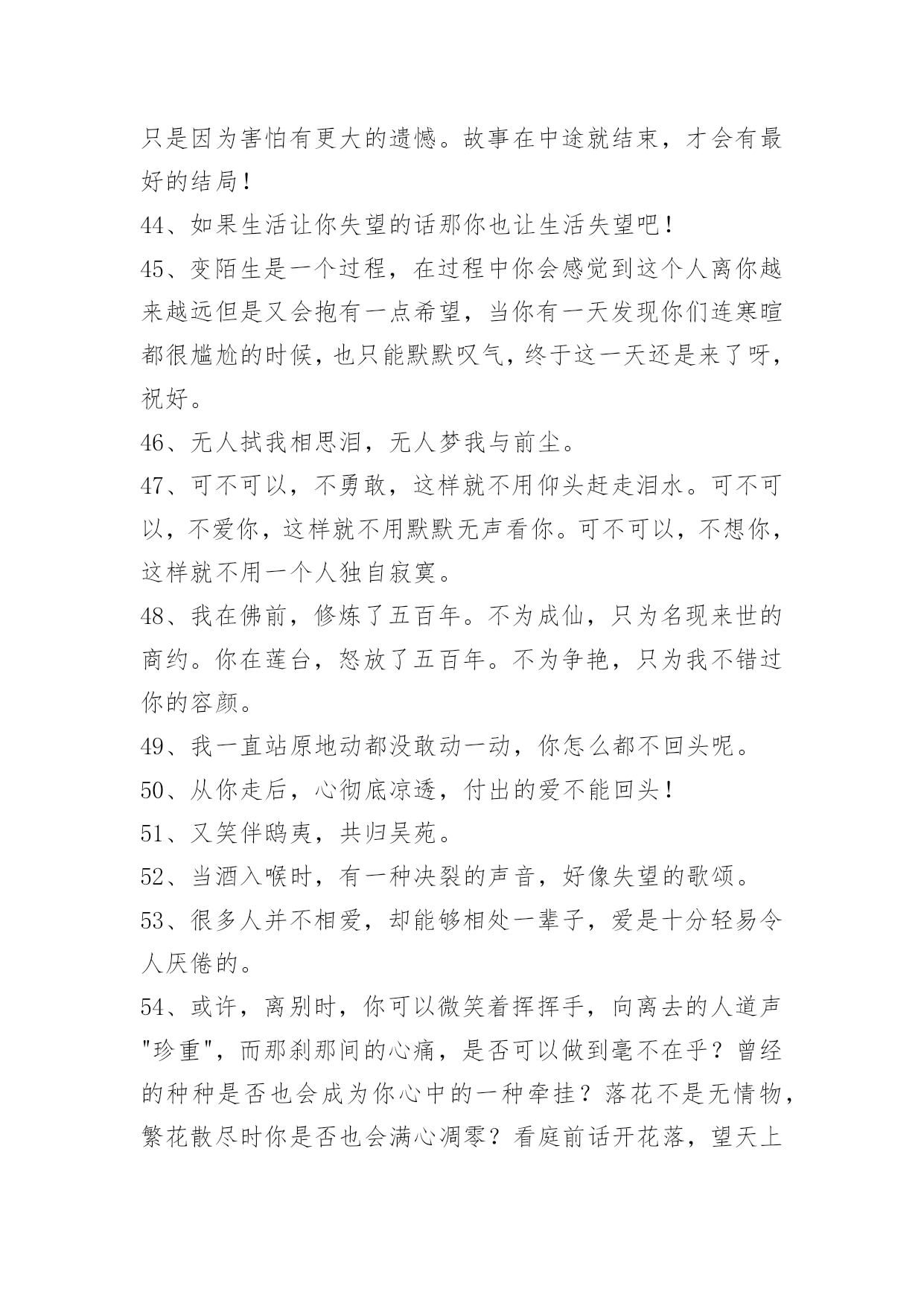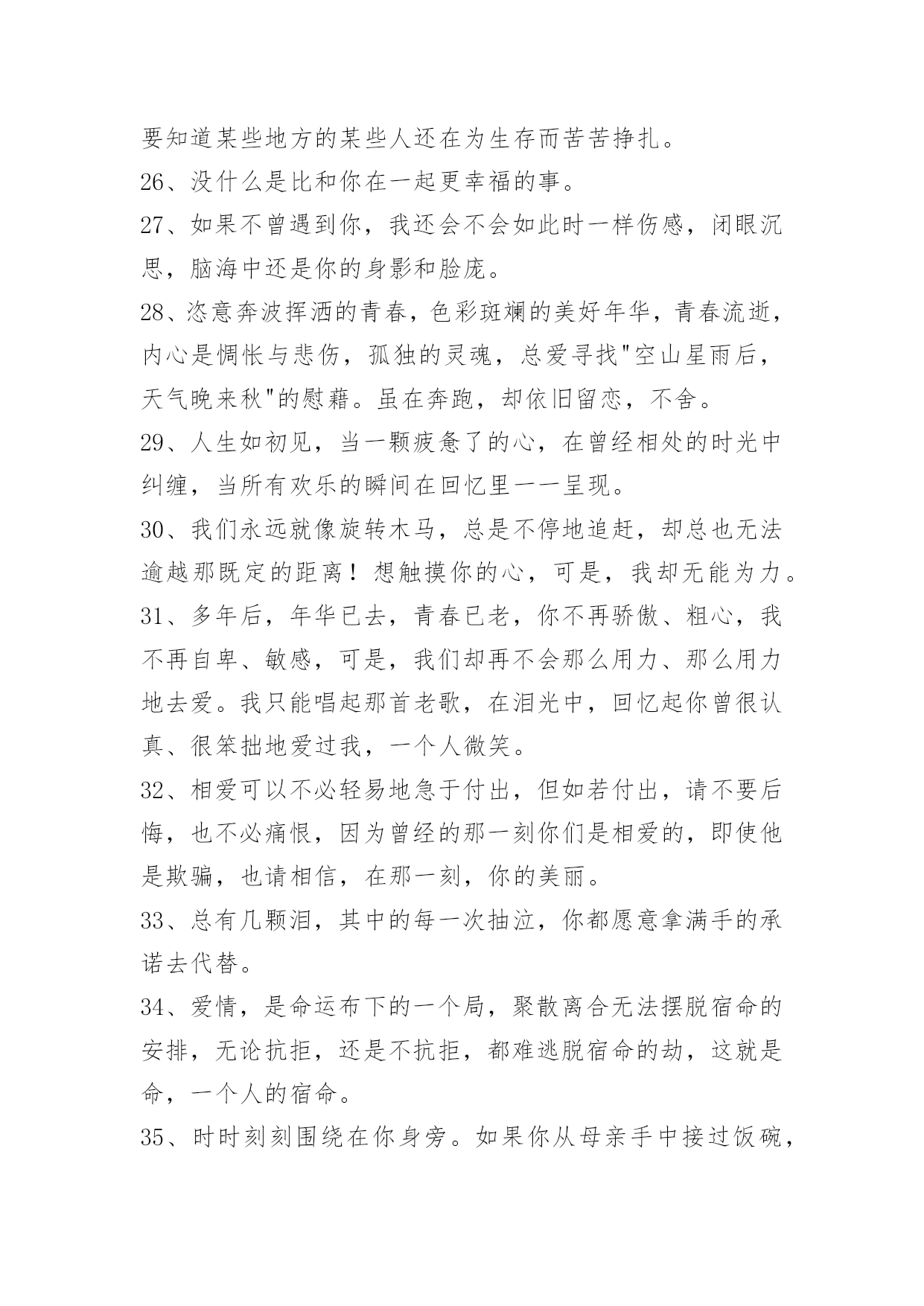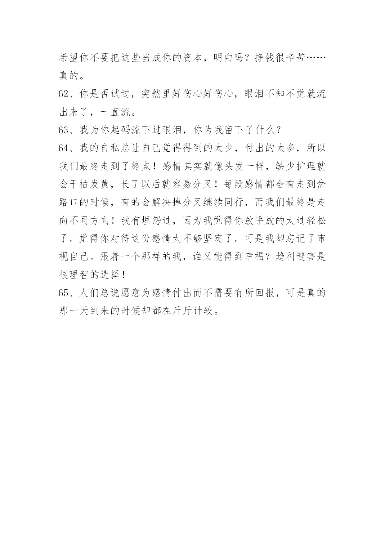 生活伤感句子常用生活伤感句子汇编65句主动久了会很累,在乎久了会崩溃。下面是小编精心准备的生活伤感句子65句,欢迎阅读,希望大家能够喜欢。1、独自一人坐在家里,听窗外的雨声,是一种享受。一种孤独的享受。在享受这份宁静,享受这份清新,享受这份孤独。2、没有丁香般的淡淡哀愁,没有擦肩错过的瞬间凝眸,我唯有望雨独欢,望水流愁。3、即使我们已经失去了曾经,但我们还有未来徘徊。4、流年逝去,慢慢的变得坚强,不是心狠了,是懂得爱惜自己了。5、世界上某一段距离,你走得越远,就越是走不到一起。6、通往幸福只需要四步:你我我们的心在一起。7、天冷了,风吹的心也冷了。8、你不是我,你不懂我的悲伤。你不是我,你不懂我的疼痛。9、宁可孤独,也不违心,宁可抱憾,也不将就,能入我心者,我待以至宝,不入我心者,不屑敷衍,向来缘浅,奈何情深,取悦别人远不如快乐自己。10、你不用知道我在无奈什么,你不用知道我在痛苦什么。11、讨厌哭哭啼啼的孩子,眼泪什么也证明不了,除了你的懦弱。12、无言以对的哀伤,撕心裂肺的心痛。13、心情不好就说出来吧,个性这里会有很多人心疼你。14、这世界并不温柔,请不要太过悲伤。15、不爱我就请离开我,不要背着我对别人温柔。16、我尽了全力在活着,就怕哪天你突然回来,而我却不那么光鲜,你看了会心痛。17、你的谎言其实已被我看透了,只是不想揭穿而已。18、原来默默守候的容易被伤害,或许,一开始我就不应该去爱。19、也许这一切听起来很滑稽,但暗恋人何常又不是呢?20、当你真正来做些什么的时候,经常也是很多事都无法回头的时候。21、你身边陪你暧昧的那么多,我也不过是其中一个。呵!22、我匍匐了一百年,我微笑着燃烧了一百年,只为等待着与你灰飞烟灭的相逢,因为你的快乐、是我今生全部的信仰。23、人一辈子,总会走过一些地方,爱过一些人。并最终落地生根,与一个爱或不爱的人,抑或独自一个人过完下半生。你大概是不会想这样的。所以,有一天你突然告诉我,你要走。你说,你只是想停下来,去远方看看这个世界有多精彩。所以…看过的风景,爱过的人,放在心里就好。24、你会发现曾经存在,而后被理所当然地忘记比从来没有存在过更加悲哀。25、无论你的生活是好是坏,每天醒来都要感激现有的生活。要知道某些地方的某些人还在为生存而苦苦挣扎。26、没什么是比和你在一起更幸福的事。27、如果不曾遇到你,我还会不会如此时一样伤感,闭眼沉思,脑海中还是你的身影和脸庞。28、恣意奔波挥洒的青春,色彩斑斓的美好年华,青春流逝,内心是惆怅与悲伤,孤独的灵魂,总爱寻找"空山星雨后,天气晚来秋"的慰藉。虽在奔跑,却依旧留恋,不舍。29、人生如初见,当一颗疲惫了的心,在曾经相处的时光中纠缠,当所有欢乐的瞬间在回忆里一一呈现。30、我们永远就像旋转木马,总是不停地追赶,却总也无法逾越那既定的距离!想触摸你的心,可是,我却无能为力。31、多年后,年华已去,青春已老,你不再骄傲、粗心,我不再自卑、敏感,可是,我们却再不会那么用力、那么用力地去爱。我只能唱起那首老歌,在泪光中,回忆起你曾很认真、很笨拙地爱过我,一个人微笑。32、相爱可以不必轻易地急于付出,但如若付出,请不要后悔,也不必痛恨,因为曾经的那一刻你们是相爱的,即使他是欺骗,也请相信,在那一刻,你的美丽。33、总有几颗泪,其中的每一次抽泣,你都愿意拿满手的承诺去代替。34、爱情,是命运布下的一个局,聚散离合无法摆脱宿命的安排,无论抗拒,还是不抗拒,都难逃脱宿命的劫,这就是命,一个人的宿命。35、时时刻刻围绕在你身旁。如果你从母亲手中接过饭碗,心存温馨,那就是幸福;如果你在灯下读着朋友的来信,品味友情,那就是幸福;如果你独坐一隅,静静听歌。36、生很短,几十年而已,谁都渴望真爱,都希望幸福度过。但是真爱来临了,往往是相见恨晚,一辈子都不能在一起。不是爱不够深,不是不珍惜,而是现实把爱情阻隔了,让缘分眼睁睁溜走。一辈子,总有一个人,珍藏在心底,成为记忆,却永远思念,放不下。当思念来临的时候,心隐隐作痛,但找不到可以倾诉的人,也不能告诉对方。37、钱真是个好东西,以前从来没觉得它有多么的重要,现在才知道,它才是一切伤心的根源。38、人生只为有所成,只怪苍天造弄人。可怜天下有志者,有心无力枉此生。39、我不怕四面楚歌临敌千千万,我只怕我们轻易松手不战而降。40、不要相信"花心的人往往最终最痴情",这话害了多少人。因为你根本无法确定你是终点站还是中转站。不过"专一的人往往最绝情",这话倒是真的。心伤透了的人,一转身绝不会有回头。41、如果你自己对接受什么不加选择,那么别人就会替你选择,而他们的动机未必很高尚。不知不觉地堕落到低俗的行列,这是世界上最容易出现的事情。42、冬季无雨,就连雪花也在吝啬着它的美丽,至今只下过一场雪,[20XX]它不是浪漫的冬季