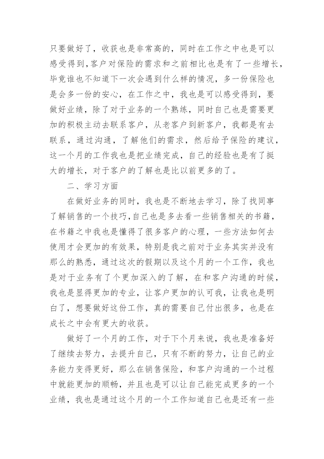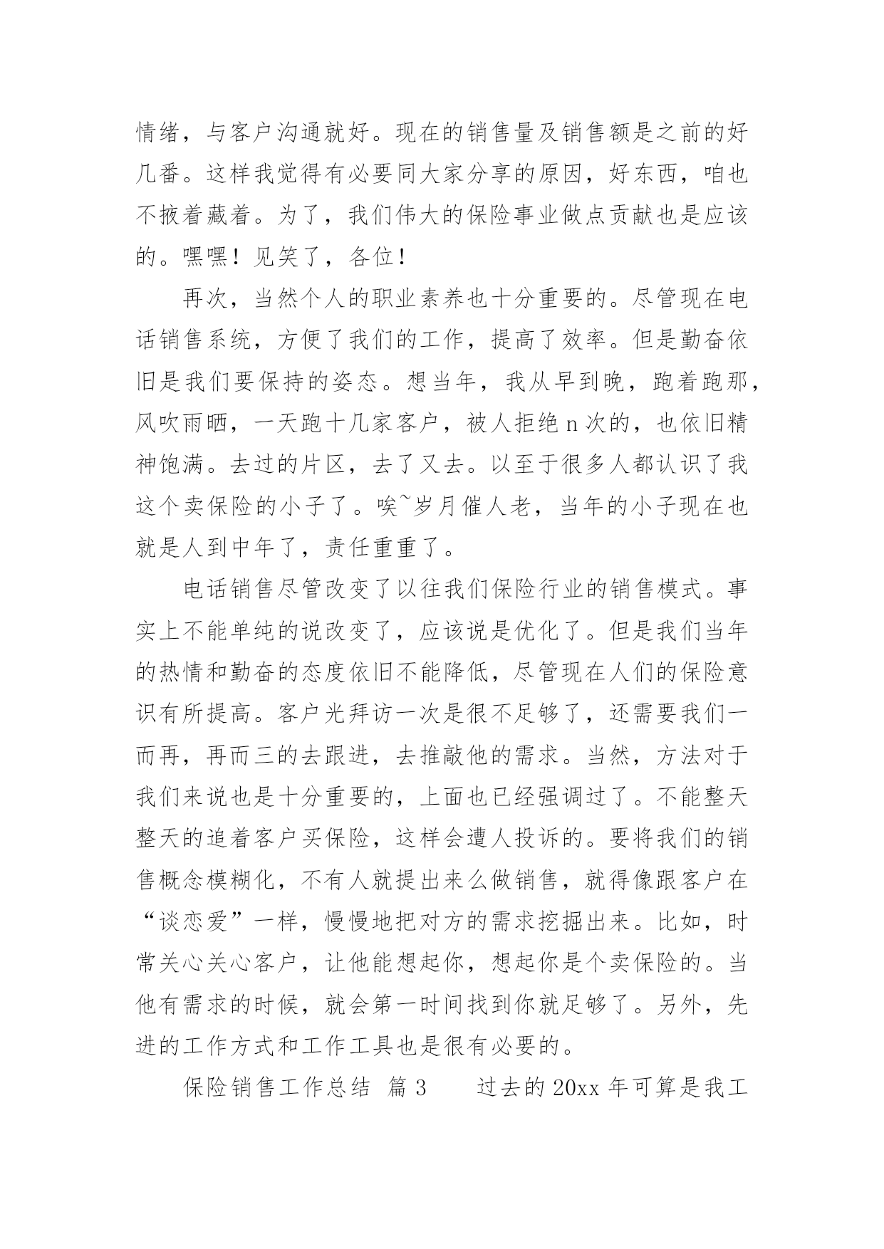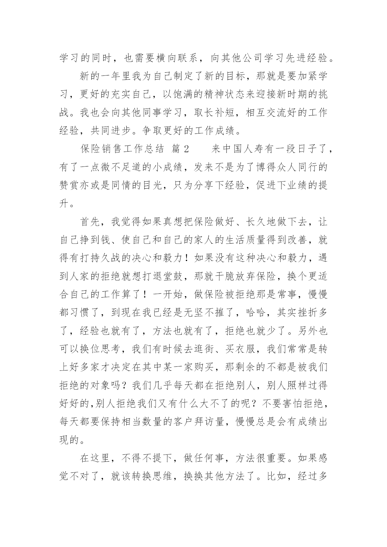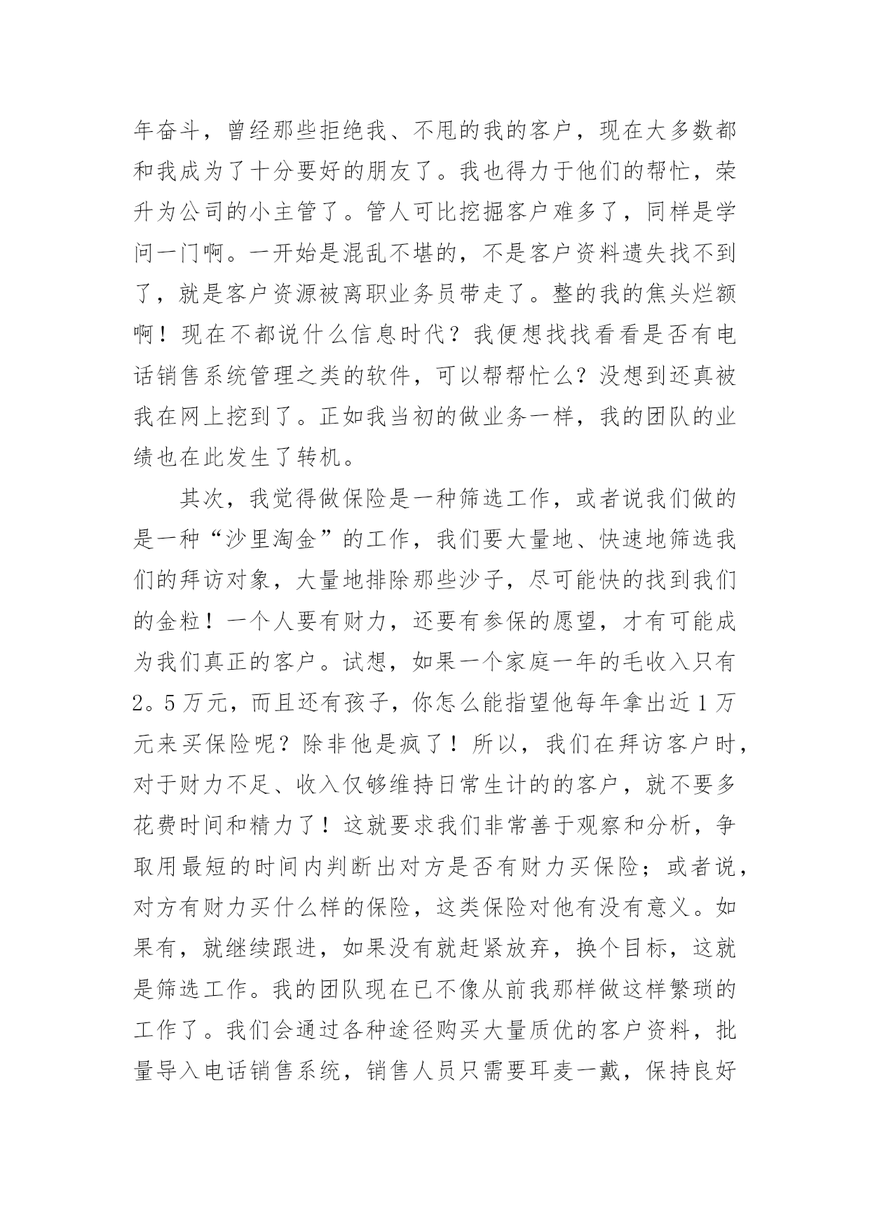 保险销售工作总结保险销售工作总结总结是在某一时期、某一项目或某些工作告一段落或者全部完成后进行回顾检查、分析评价,从而得出教训和一些规律性认识的一种书面材料,通过它可以全面地、系统地了解以往的学习和工作情况,因此我们需要回头归纳,写一份总结了。那么总结应该包括什么内容呢?下面是小编收集整理的保险销售工作总结,欢迎阅读与收藏。保险销售工作总结篇1又到年终岁尾,回首过去的一年,內心不禁感慨万千。时间如梭,转眼间又跨过了一个年度之坎,回首望,虽沒有轰轰烈烈的战果,但也算经历了一段不平凡的考验和磨砺。非常感谢公司给我这个成长的平台,令我在工作中不断的学习,不断的进步,慢慢的提升自身的素质与才能,回首过往,公司陪伴我走过人生很重要的一个阶段,使我懂得了很多,领导对我的支持与关爱,同事们的鼎力协助,使我在工作中更加的得心应手,在此我向公司的领导以及全体同事表示最衷心的感谢。同时也将这一年的工作向大家做以总结。一、严于律已,团结同志;以身作则,任劳任怨在工作中严格要求自己,响应公司各项号召,积极参加公司的各项活动。克服种。种困难,不计个人得失,加班加点学习业务知识,在短时间内完成了多起案件的接案、立案、查勘、跟踪、医疗审核等多个工作程序,赢得了客户的好评,较好的完成了领导交给的任务。二、树立中心形象,维护公司及客户利益在工作中发现,多家医院存在收费不合理现象,导致公司和客户损失。在掌握足够证据情况下,多次到问题医院据理力争,为客户挽回了损失,也避免了我公司的损失,在客户及医院面前均树立了人保理赔的良好形象。三、发现问题、解决问题。寻求创新,促进工作1、经过市场调查,结合家政及各家医院的特点,提出护理费实行统一价格,既节省了理赔手续,又降低了此项费用的赔付。2、涉及人伤(病)案件流程、非车险特别告知单证、人伤案件跟踪表、医疗审核表等单证。使人伤案件集中立案,集中医疗审核,简化了理赔程序,也大大降低了赔付。四、提升深化服务,服务于客户、服务于承保公司1、将理赔工作前置,在交警队调解前为客户把关。2、针对不同险种,配合支公司处理人伤赔偿纠纷,不仅降低了赔付,同时为支公司稳定、争取了客户,得到了各支公司的好评。五、保持成绩,找出不足,加倍努力,更上一层楼1、我们业务小组工作刚刚起步,各方面经验还很不足,需要大家共同学习,加倍努力。同时因工作中涉及多个险种,需要多个部门的支持与配合,今后要加强各方面的协调工作。2、随着新险种的开展,还有许多新问题,在加强业务学习的同时,也需要横向联系,向其他公司学习先进经验。新的一年里我为自己制定了新的目标,那就是要加紧学习,更好的充实自己,以饱满的精神状态来迎接新时期的挑战。我也会向其他同事学习,取长补短,相互交流好的工作经验,共同进步。争取更好的工作成绩。保险销售工作总结篇2来中国人寿有一段日子了,有了一点微不足道的小成绩,发来不是为了博得众人同行的赞赏亦或是同情的目光,只为分享下经验,促进下业绩的提升。首先,我觉得如果真想把保险做好、长久地做下去,让自己挣到钱、使自己和自己的家人的生活质量得到改善,就得有打持久战的决心和毅力!如果没有这种决心和毅力,遇到人家的拒绝就想打退堂鼓,那就干脆放弃保险,换个更适合自己的工作算了!一开始,做保险被拒绝那是常事,慢慢都习惯了,到现在我已经是无坚不摧了,哈哈,其实挫折多了,经验也就有了,方法也就有了,拒绝也就少了。另外也可以换位思考,我们有时候去逛街、买衣服,我们常常是转上好多家才决定在其中某一家购买,那剩余的不都是被我们拒绝的对象吗?我们几乎每天都在拒绝别人,别人照样过得好好的,别人拒绝我们又有什么大不了的呢?不要害怕拒绝,每天都要保持相当数量的客户拜访量,慢慢总是会有成绩出现的。在这里,不得不提下,做任何事,方法很重要。如果感觉不对了,就该转换思维,换换其他方法了。比如,经过多年奋斗,曾经那些拒绝我、不甩的我的客户,现在大多数都和我成为了十分要好的朋友了。我也得力于他们的帮忙,荣升为公司的小主管了。管人可比挖掘客户难多了,同样是学问一门啊。一开始是混乱不堪的,不是客户资料遗失找不到了,就是客户资源被离职业务员带走了。整的我的焦头烂额啊!现在不都说什么信息时代?我便想找找看看是否有电话销售系统管理之类的软件,可以帮帮忙么?没想到还真被我在网上挖到了。正如我当初的做业务一样,我的团队的业绩也在此发生了转机。其次,我觉得做保险是一种筛选工作,或者说我们做的是一种“沙里淘金”的工作,我们要大量地、快速地筛选我们的拜访对象,大量地排除那些沙子,尽可能快的找到我们的金粒!一个人要有财力,还要有参保的愿望,才有可能成为我们真正的客户。试想,如果一个家庭一年的毛收入只有2。5万元,而且还有孩子,你怎么能指望他每年拿出近1万元来买保险呢?除非他是疯了!所以,我们在拜访客户时,对于财力不