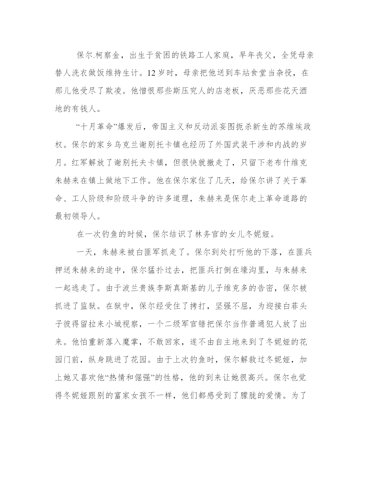 《钢铁是怎样炼成的》基础导读钢铁是怎样炼成的导读一钢铁是怎样炼成的尼古拉.奥斯特洛夫斯基(1904_1936),苏联著名的布尔什维克作家,自他的小说钢铁是怎样炼成的问世以来,他就同书中的保尔.柯察金一道,成了世界上千万千万有志青年的朋友和楷模。1904年,奥斯特洛夫斯基出生在乌克兰一个工人家庭,父亲是一家酿酒厂的季节工,母亲在大户人家当厨娘,家境十分贫寒。因此,他只念了三年的书,十岁左右就开始干活谋生。奥斯特洛夫斯基干过各种职业,如帮人家牧马,在车站食堂当小伙计,在发电厂当助理司炉等,贫困屈辱的生活培养了他对旧世界的仇恨和反抗性格。13岁的时候,他就开始积极参加革命活动。1918年,奥斯特洛夫斯基的家乡一度被德国军队占领,他冒着生命危险去完成组织上交给自己的收集敌人情报和将革命布告贴到德军司令部哨兵棚上的任务,显示了他机智、勇敢、不怕牺牲的精神,得到了同志们的赞扬。1919年7月,奥斯特洛夫斯基的家乡成立了共青团,他成了第一代共青团,并参加红军奔赴前线同白匪军作战。第二年在一次激战中,他的头部、腹部多处受伤,右眼因伤而丧失了80%的视力。严重的伤痛使奥斯特洛夫不得不离开队伍。然而,伤势刚刚有所好转,他就以高度的革命自觉性转入劳动建设,先是到一家铁路工厂当助理电机师,后又自愿报名参加突击队,投入修筑铁路的艰苦劳动。在工地上,他染上了伤寒并患了风湿病,常处于昏迷状态。这场大病还未痊愈,他又积极参加在第伯聂河上抢捞木柴的紧张劳动。因为长时间泡在齐腰深的冰水中,致使风湿病更加严重,又很快迸发了多发性关节炎,肺炎。从此失去了最起码的健康,并日趋恶化,到1929年,他全身瘫痪,双目失明,完全失去了活动能力,但他丝毫也不悲观消沉,“只要心脏还没有停止跳动,就要使自己成为一个对党有用的人。”学习文学创作,是躺在病床上的奥斯特洛夫斯基找到的“进入生活的入场券”。1927年底,奥斯特洛夫斯基在与病魔做斗争的同时,创作了一篇关于科托夫骑兵旅成长壮大以及英勇征战的中篇小说。两个月后小说写完了,他把小说封好让妻子寄给敖德萨科托夫骑兵旅的战友们,征求他们的意见,战友们热情地评价了这部小说,可万万没想到,手稿在回寄途中被邮局弄丢了。这意外的打击对他来说,实在是太残酷了,但这并没有挫败他的坚强意志,在参加斯维尔德洛夫共产主义函授大学学习的同时,他开始构思规模更大的小说——钢铁是怎样炼成的。1934年小说出版,获得了巨大的成功,他也被吸收为苏联作家协会会员。随后,奥斯特洛夫斯基开始创作另一组三步曲长篇小说暴风雨中诞生,以表彰他在文学方面的创造性劳动和卓越贡献。1936年12月,由于重病复发,奥斯特洛夫斯基在莫斯科逝世。二故事梗概保尔.柯察金,出生于贫困的铁路工人家庭,早年丧父,全凭母亲替人洗衣做饭维持生计。12岁时,母亲把他送到车站食堂当杂役,在那儿他受尽了欺凌。他憎恨那些斯压究人的店老板,厌恶那些花天酒地的有钱人。“十月革命”爆发后,帝国主义和反动派妄图扼杀新生的苏维埃政权。保尔的家乡乌克兰谢别托卡镇也经历了外国武装干涉和内战的岁月。红军解放了谢别托夫卡镇,但很快就撤走了,只留下老布什维克朱赫来在镇上做地下工作。他在保尔家住了几天,给保尔讲了关于革命、工人阶级和阶级斗争的许多道理,朱赫来是保尔走上革命道路的最初领导人。在一次钓鱼的时候,保尔结识了林务官的女儿冬妮娅。一天,朱赫来被白匪军抓走了。保尔到处打听他的下落,在匪兵押送朱赫来的途中,保尔猛扑过去,把匪兵打倒在壕沟里,与朱赫来一起逃走了。由于波兰贵族李斯真斯基的儿子维克多的告密,保尔被抓进了监狱。在狱中,保尔经受住了拷打,坚强不屈,为迎接白菲头子彼得留拉来小城视察,一个二级军官错把保尔当作普通犯人放了出来。他怕重新落入魔掌,不敢回家,遂不由自主地来到了冬妮娅的花园门前,纵身跳进了花园。由于上次钓鱼时,保尔解救过冬妮娅,加上她又喜欢他“热情和倔强”的性格,他的到来让她很高兴。保尔也觉得冬妮娅跟别的富家女孩不一样,他们都感受到了朦胧的爱情。为了避难,他答应了冬妮娅的请求,住了下来。几天后,冬妮娅找到了保尔的哥哥阿尔青,他把弟弟送到喀察丁参加了红军。