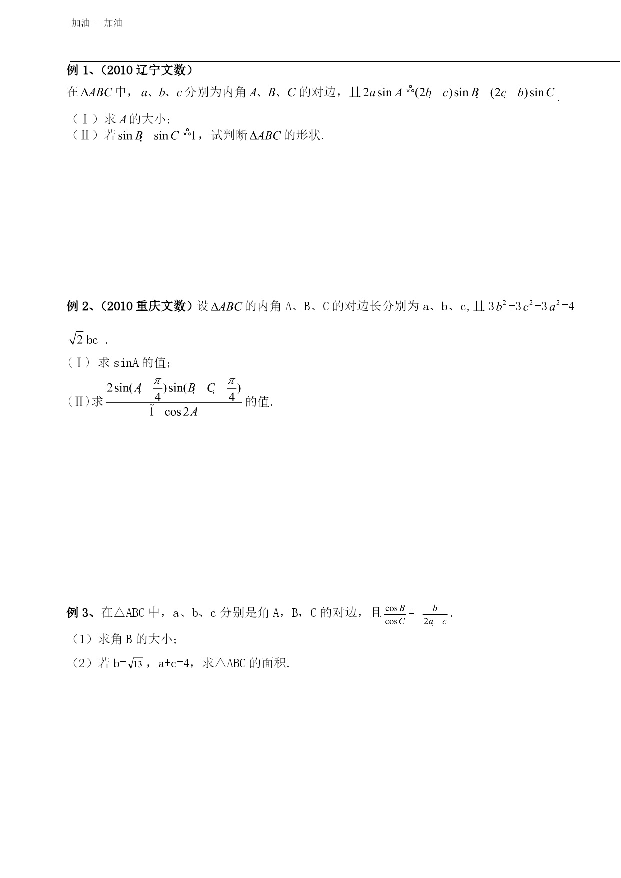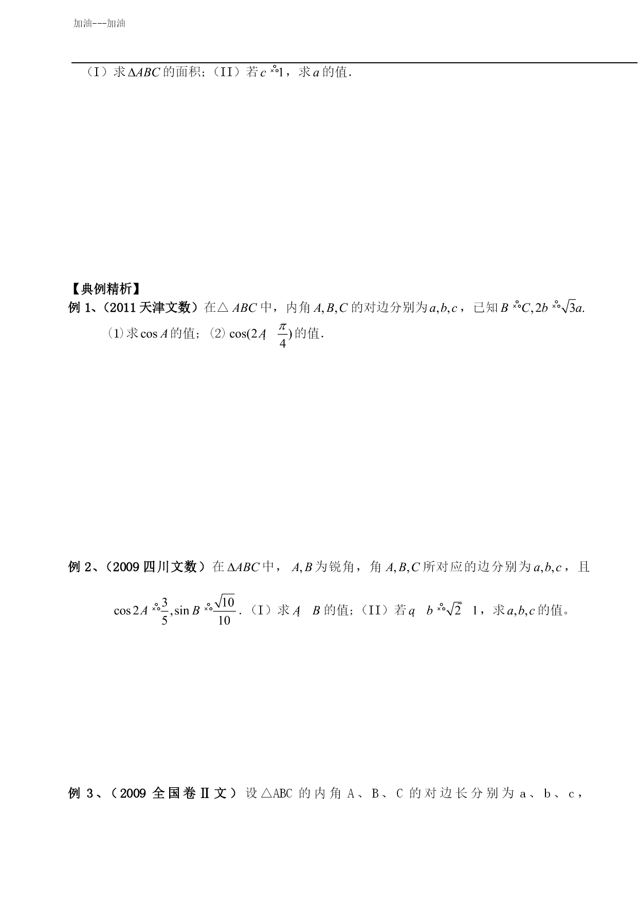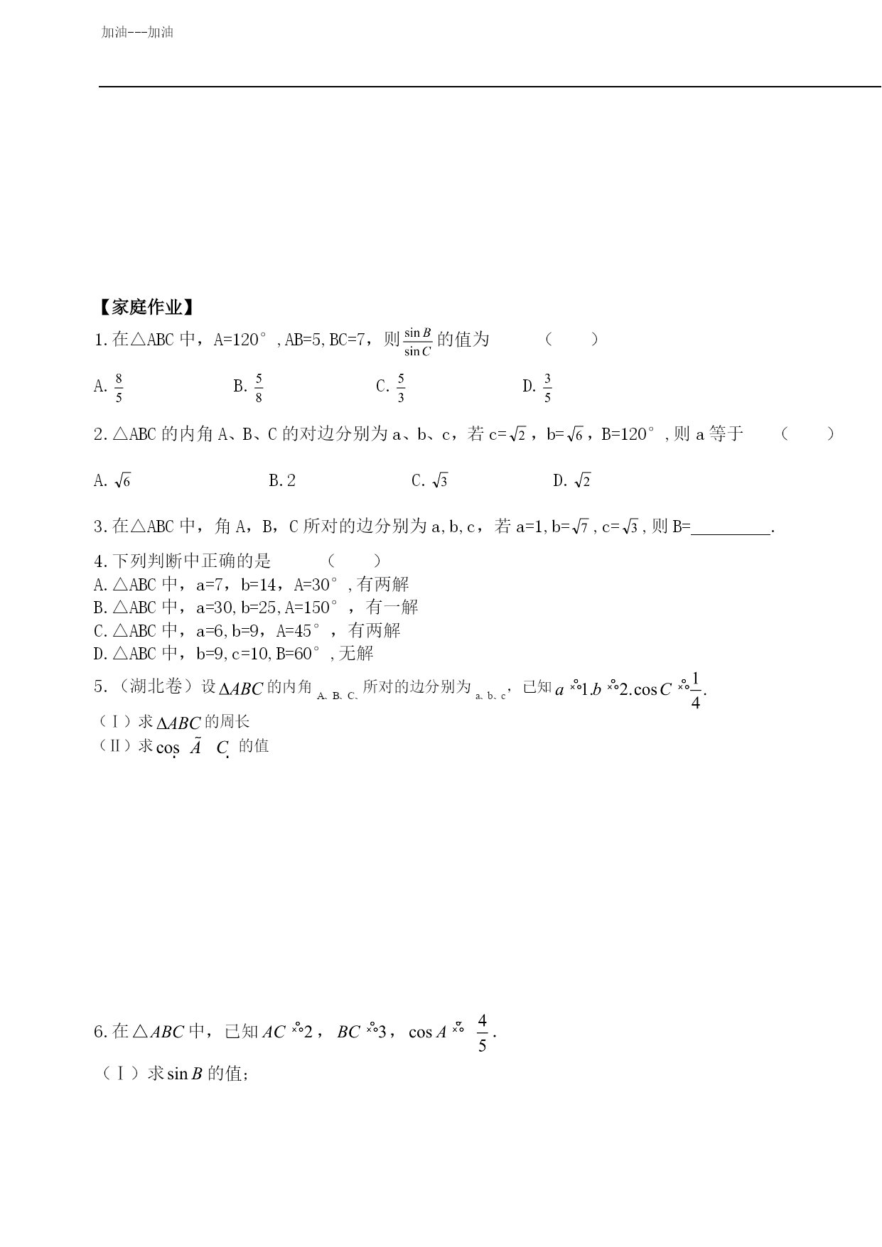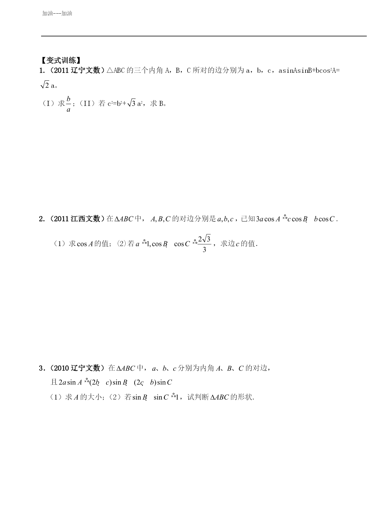 加油---加油解三角形【考点及要求】掌握正弦定理、余弦定理;并能初步应用正弦定理、余弦定理解决三角形中的有关问题.【基础知识】在所对的边,的外接圆半径,则有,1.正弦定理:;2.余弦定理:3.常用公式:(1);(2)知识点一:解直角三角形【典型例题讲练】例1在ΔABC中,已知a=,b=,B=45°,求A,C及边c.【变式训练】1.在△ABC中,已知a=,b=,B=45°,求A、C和c.知识点二:正、余弦定理的运用【典例精析】例1、(2010辽宁文数)在中,分别为内角的对边,且.(Ⅰ)求的大小;(Ⅱ)若,试判断的形状.例2、(2010重庆文数)设的内角A、B、C的对边长分别为a、b、c,且3+3-3=4bc.(Ⅰ)求sinA的值;(Ⅱ)求的值.例3、在△ABC中,a、b、c分别是角A,B,C的对边,且=-.(1)求角B的大小;(2)若b=,a+c=4,求△ABC的面积.例4、在△ABC中,角A、B、C的对边分别为a、b、c,已知a+b=5,c=,且4sin2-cos2C=.(1)求角C的大小;(2)求△ABC的面积.【变式训练】1.(2010天津文数)在ABC中,。(Ⅰ)证明B=C:(Ⅱ)若=-,求sin的值。2.(2010浙江文数)在△ABC中,角A,B,C所对的边分别为a,b,c,设S为△ABC的面积,满足。(Ⅰ)求角C的大小;(Ⅱ)求的最大值。【家庭作业】1.在△ABC中,A=120°,AB=5,BC=7,则的值为()A.B.C.D.2.△ABC的内角A、B、C的对边分别为a、b、c,若c=,b=,B=120°,则a等于()A.B.2C.D.3.在△ABC中,角A,B,C所对的边分别为a,b,c,若a=1,b=,c=,则B=.4.下列判断中正确的是()A.△ABC中,a=7,b=14,A=30°,有两解B.△ABC中,a=30,b=25,A=150°,有一解C.△ABC中,a=6,b=9,A=45°,有两解D.△ABC中,b=9,c=10,B=60°,无解5.(湖北卷)设的内角A、B、C、所对的边分别为a、b、c,已知(Ⅰ)求的周长(Ⅱ)求的值6.在中,已知,,.(Ⅰ)求的值;(Ⅱ)求的值.知识点三:正余弦定理的应用(2)【典例精析】例1、(2011四川文数)在△ABC中,sin2A≤sin2B+sin2C-sinBsinC,则A的取值范围是()A.B.C.D.例2、(2011全国Ⅰ文科)△ABC的内角A、B、C的对边分别为a、b、c.己知.(1)求B;(2)若.例3、(2011山东文数)在△ABC中,内角A,B,C的对边分别为a,b,c.已知.(1)求的值;(2)若cosB=,【变式训练】1.(2011辽宁文数)△ABC的三个内角A,B,C所对的边分别为a,b,c,asinAsinB+bcos2A=a。(I)求;(II)若c2=b2+a2,求B。2.(2011江西文数)在中,的对边分别是,已知.(1)求的值;(2)若,求边的值.3.(2010辽宁文数)在中,分别为内角的对边,且(1)求的大小;(2)若,试判断的形状.【典例精析】例1、(2009重庆)设的三个内角,向量,,若,则=()A.B.C.D.例2、(2009江西卷文)在△中,所对的边分别为,,.(1)求;(2)若,求,,.例3、(2010安徽文数)的面积是30,内角所对边长分别为,。(Ⅰ)求向量AB与向量AC的内积;(Ⅱ)若,求的值。【变式训练】1.(2009浙江文)在中,角所对的边分别为,且满足,.(I)求的面积;(II)若,求的值.【典例精析】例1、(2011天津文数)在△中,内角的对边分别为,已知求的值;(2)的值.例2、(2009四川文数)在中,为锐角,角所对应的边分别为,且.(=1\*ROMANI)求的值;(=2\*ROMANII)若,求的值。例3、(2009全国卷Ⅱ文)设△ABC的内角A、B、C的对边长分别为a、b、c,,,求B.【变式训练】1.(2009全国)在ABC中,内角A、