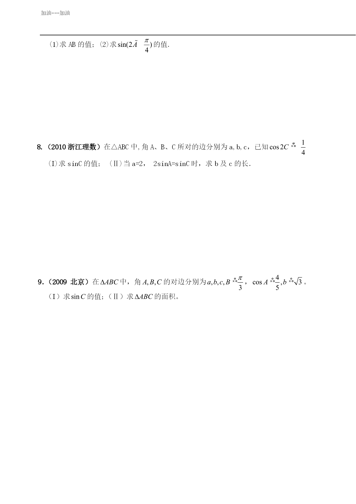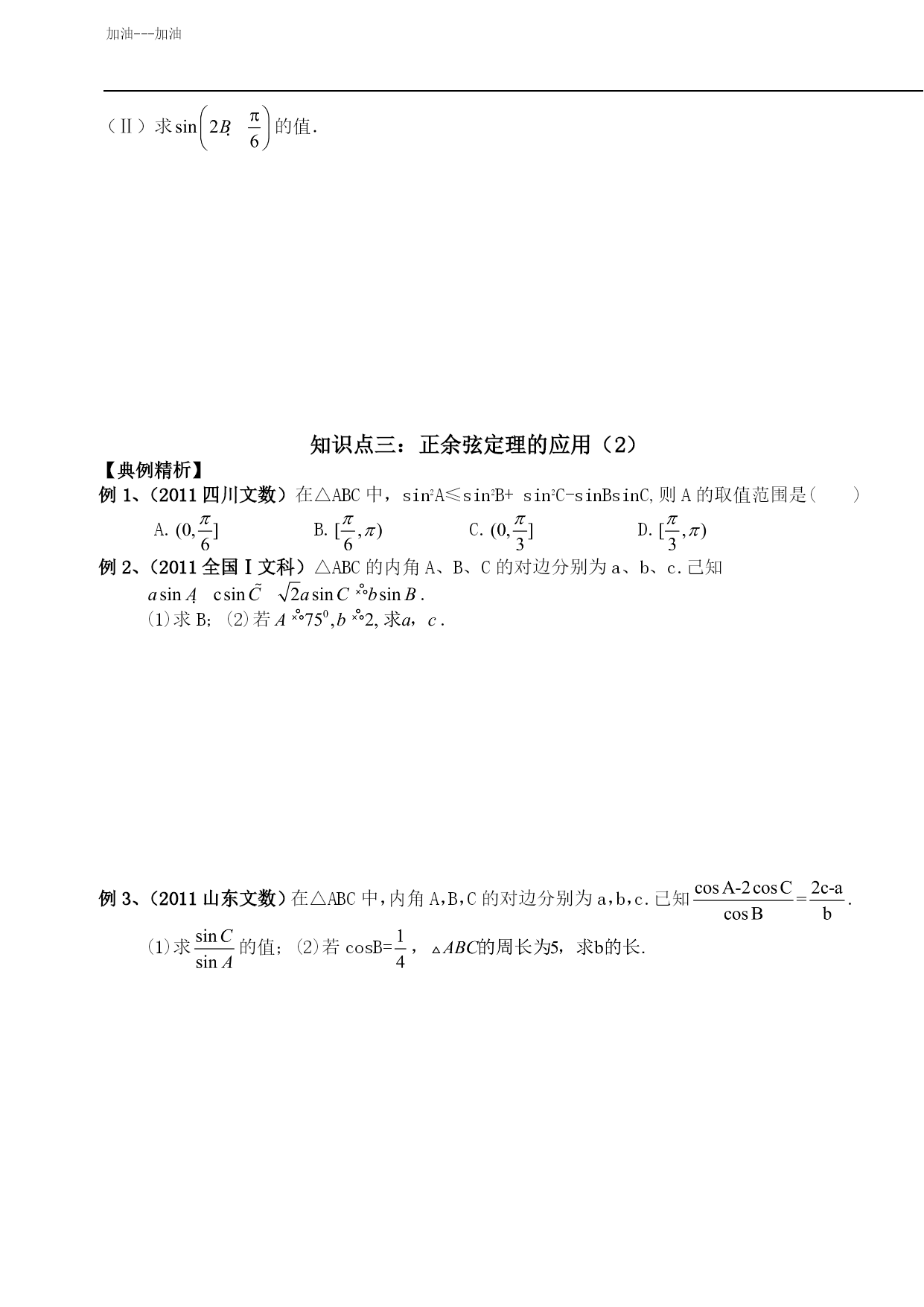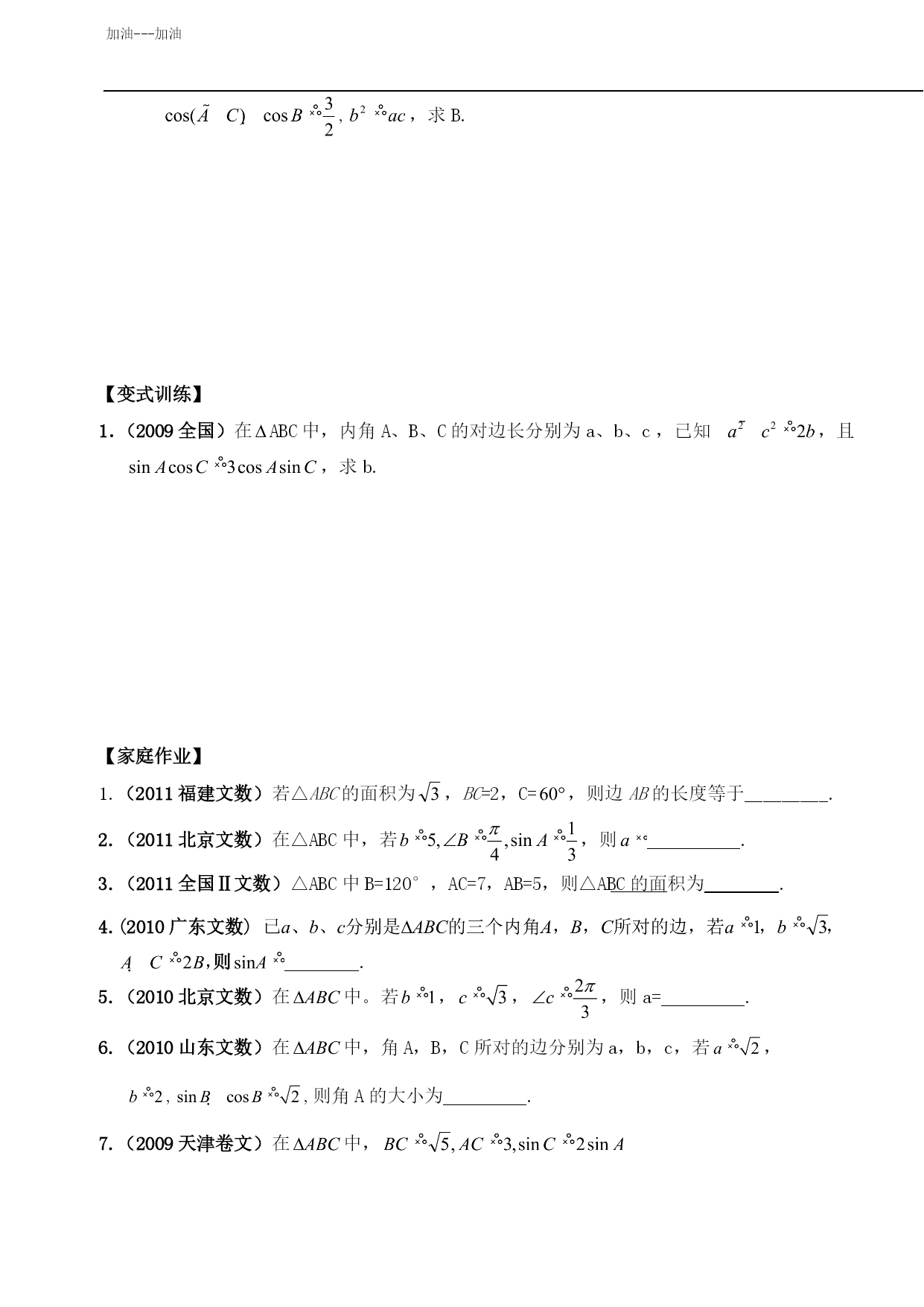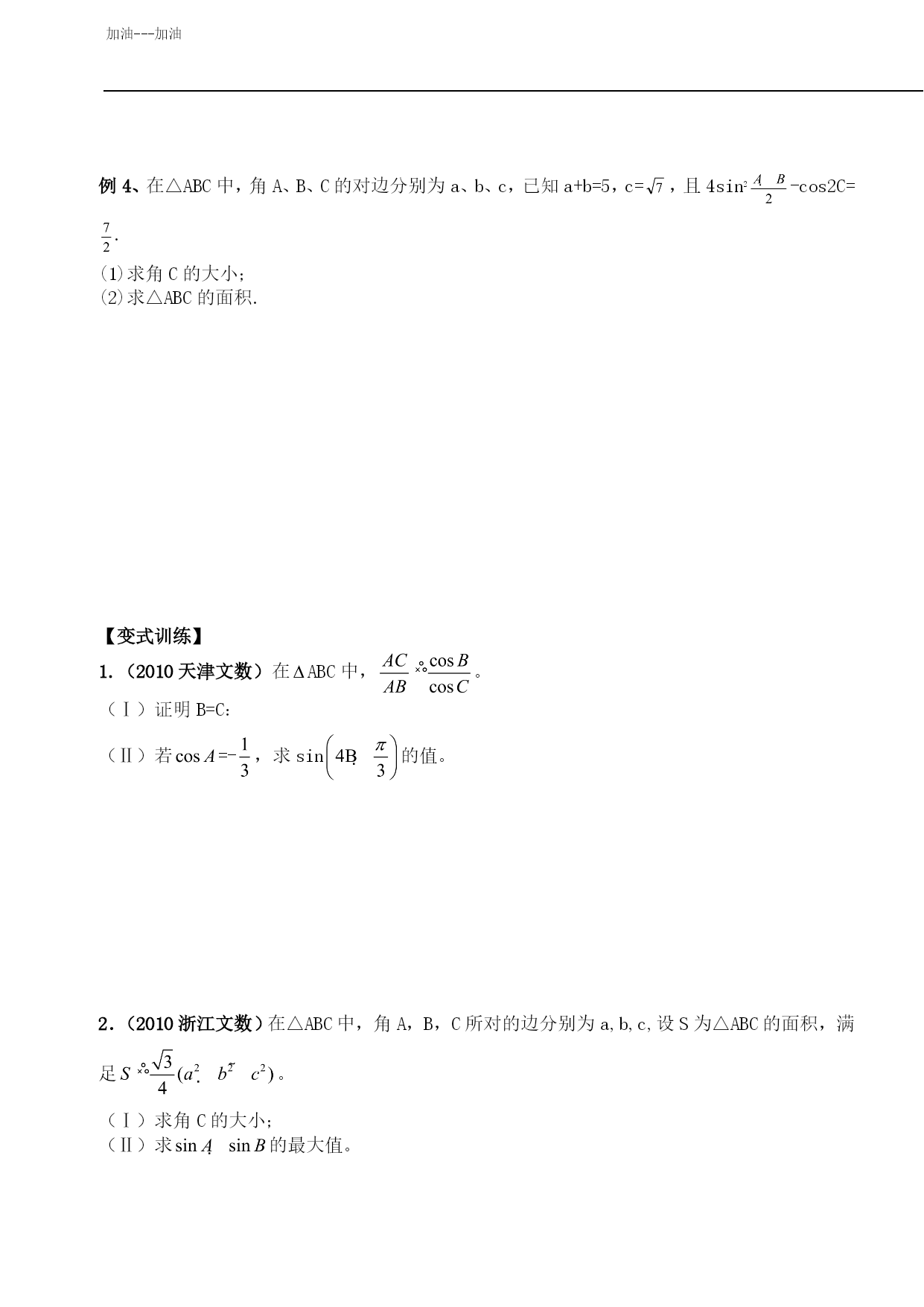 加油---加油解三角形【考点及要求】掌握正弦定理、余弦定理;并能初步应用正弦定理、余弦定理解决三角形中的有关问题.【基础知识】在所对的边,的外接圆半径,则有,1.正弦定理:;2.余弦定理:3.常用公式:(1);(2)知识点一:解直角三角形【典型例题讲练】例1在ΔABC中,已知a=,b=,B=45°,求A,C及边c.【变式训练】1.在△ABC中,已知a=,b=,B=45°,求A、C和c.知识点二:正、余弦定理的运用【典例精析】例1、(2010辽宁文数)在中,分别为内角的对边,且.(Ⅰ)求的大小;(Ⅱ)若,试判断的形状.例2、(2010重庆文数)设的内角A、B、C的对边长分别为a、b、c,且3+3-3=4bc.(Ⅰ)求sinA的值;(Ⅱ)求的值.例3、在△ABC中,a、b、c分别是角A,B,C的对边,且=-.(1)求角B的大小;(2)若b=,a+c=4,求△ABC的面积.例4、在△ABC中,角A、B、C的对边分别为a、b、c,已知a+b=5,c=,且4sin2-cos2C=.(1)求角C的大小;(2)求△ABC的面积.【变式训练】1.(2010天津文数)在ABC中,。(Ⅰ)证明B=C:(Ⅱ)若=-,求sin的值。2.(2010浙江文数)在△ABC中,角A,B,C所对的边分别为a,b,c,设S为△ABC的面积,满足。(Ⅰ)求角C的大小;(Ⅱ)求的最大值。【家庭作业】1.在△ABC中,A=120°,AB=5,BC=7,则的值为()A.B.C.D.2.△ABC的内角A、B、C的对边分别为a、b、c,若c=,b=,B=120°,则a等于()A.B.2C.D.3.在△ABC中,角A,B,C所对的边分别为a,b,c,若a=1,b=,c=,则B=.4.下列判断中正确的是()A.△ABC中,a=7,b=14,A=30°,有两解B.△ABC中,a=30,b=25,A=150°,有一解C.△ABC中,a=6,b=9,A=45°,有两解D.△ABC中,b=9,c=10,B=60°,无解5.(湖北卷)设的内角A、B、C、所对的边分别为a、b、c,已知(Ⅰ)求的周长(Ⅱ)求的值6.在中,已知,,.(Ⅰ)求的值;(Ⅱ)求的值.知识点三:正余弦定理的应用(2)【典例精析】例1、(2011四川文数)在△ABC中,sin2A≤sin2B+sin2C-sinBsinC,则A的取值范围是()A.B.C.D.例2、(2011全国Ⅰ文科)△ABC的内角A、B、C的对边分别为a、b、c.己知.(1)求B;(2)若.例3、(2011山东文数)在△ABC中,内角A,B,C的对边分别为a,b,c.已知.(1)求的值;(2)若cosB=,【变式训练】1.(2011辽宁文数)△ABC的三个内角A,B,C所对的边分别为a,b,c,asinAsinB+bcos2A=a。(I)求;(II)若c2=b2+a2,求B。2.(2011江西文数)在中,的对边分别是,已知.(1)求的值;(2)若,求边的值.3.(2010辽宁文数)在中,分别为内角的对边,且(1)求的大小;(2)若,试判断的形状.【典例精析】例1、(2009重庆)设的三个内角,向量,,若,则=()A.B.C.D.例2、(2009江西卷文)在△中,所对的边分别为,,.(1)求;(2)若,求,,.例3、(2010安徽文数)的面积是30,内角所对边长分别为,。(Ⅰ)求向量AB与向量AC的内积;(Ⅱ)若,求的值。【变式训练】1.(2009浙江文)在中,角所对的边分别为,且满足,.(I)求的面积;(II)若,求的值.【典例精析】例1、(2011天津文数)在△中,内角的对边分别为,已知求的值;(2)的值.例2、(2009四川文数)在中,为锐角,角所对应的边分别为,且.(=1\*ROMANI)求的值;(=2\*ROMANII)若,求的值。例3、(2009全国卷Ⅱ文)设△ABC的内角A、B、C的对边长分别为a、b、c,,,求B.【变式训练】1.(2009全国)在ABC中,内角A、