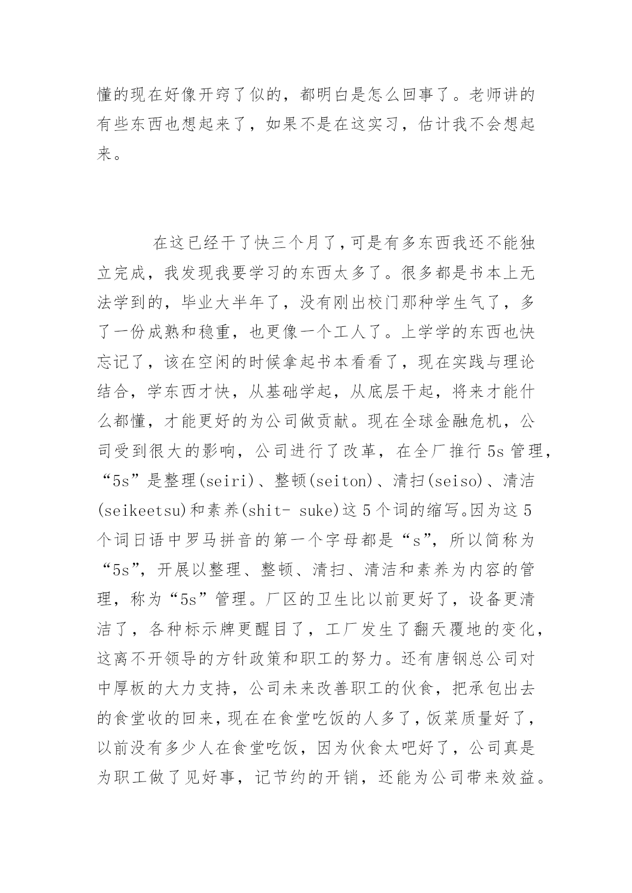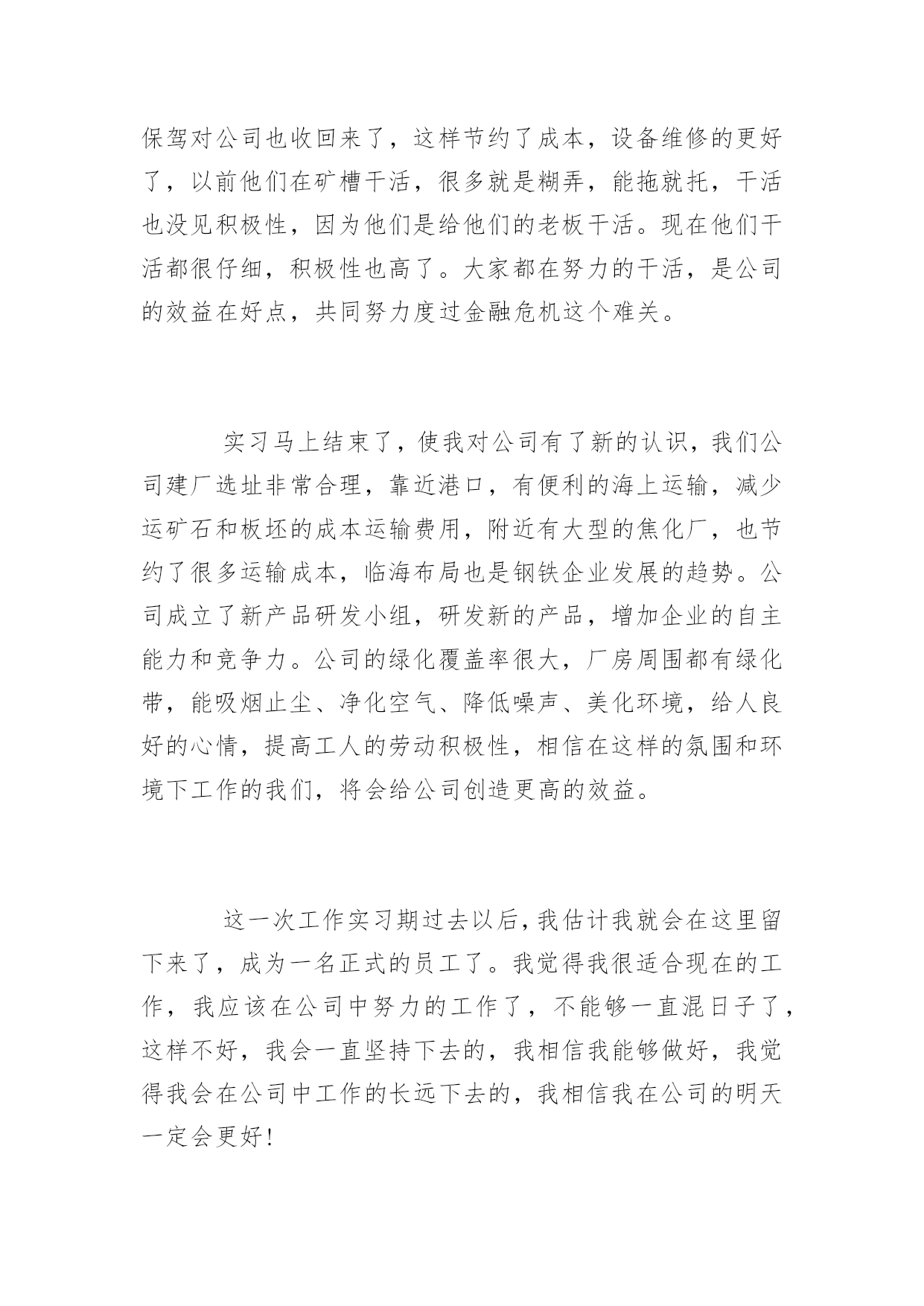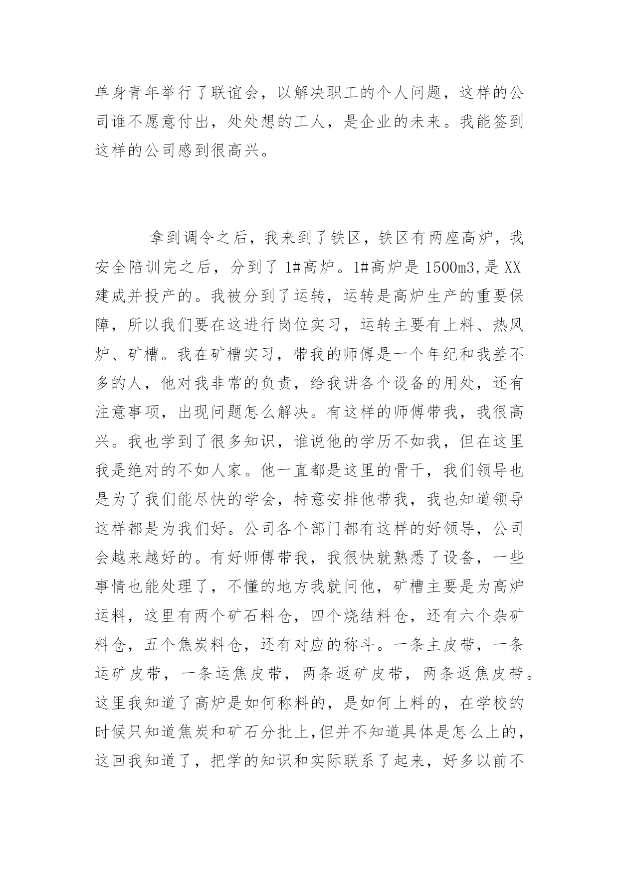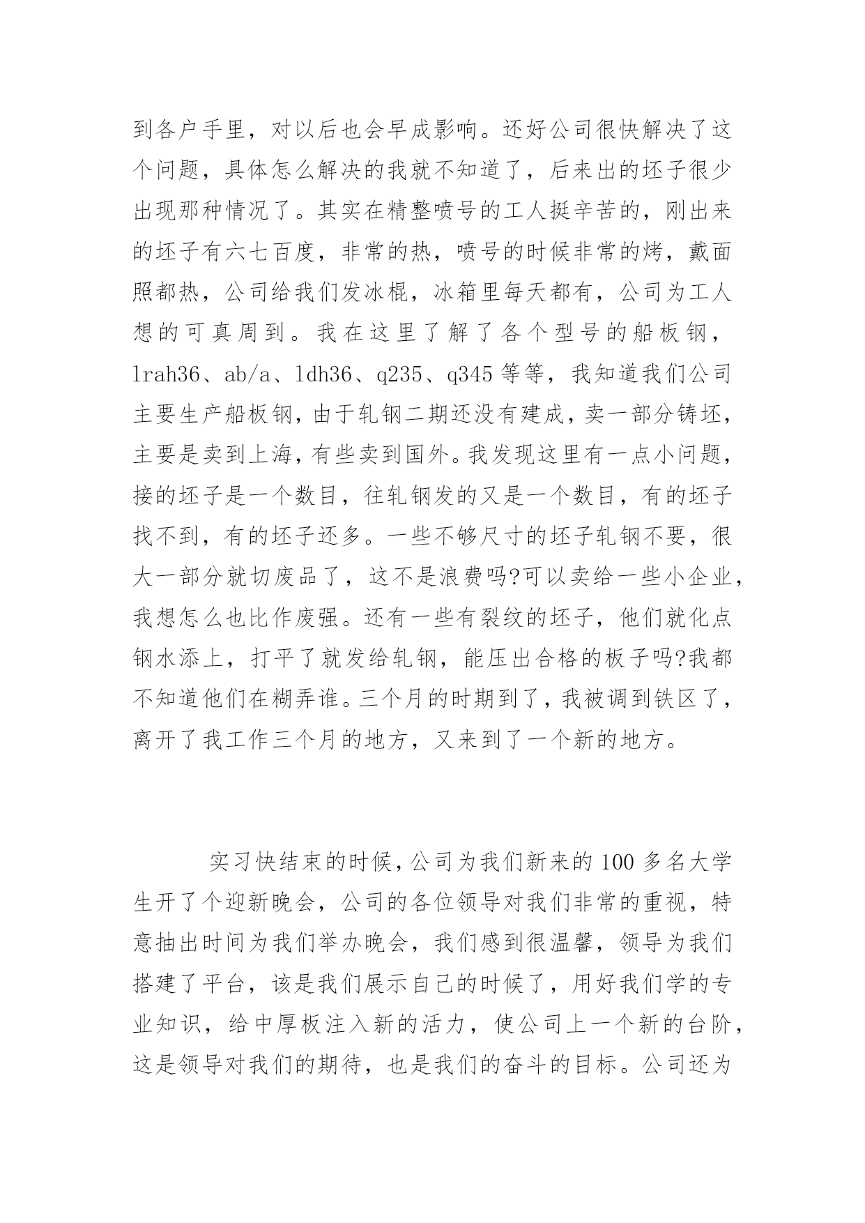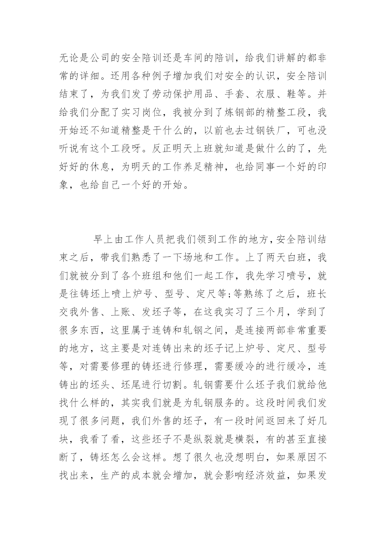 钢铁厂生产实习报告钢铁厂生产实习报告范文毕业已经有一年了,不过工作还是没有稳定下来,很多的现实情况摆在我的面前,工作不合适,各种方面的不合适,导致我换了几个工作,就是没有稳定下来。不过最近我找到现在这份工作,我觉得我应该在这里稳定下来了,我应该开始我的正经的工作了,我觉得我应该可以了,因为现在我找到的是一份钢铁厂的工作。时光荏苒,转眼来到中厚板已经有半年多的时间了,通过实习,让我了解钢铁厂生产工艺流程,适应由大学到工厂身份和环境的改变,熟悉工作环境和工作性质,使自己对生产的各个方面都有了解,对所学专业知识的应用有个全面的认识,为以后的工作打下了良好的基础。去年的七月刚刚毕业的我来到了自己工作的地方唐山中厚板材有限公司。带着对学校的恋恋不舍,对自己未来的梦想和满腔的热血来到了公司。在劳资科人员的帮助下,我签完了合同,并领了自己的行李,住进了我们的职工宿舍,工作人员非常热心的帮助我们,使我感觉自己不是在异地他乡,好像是在自己的家,同宿舍的人都是我们学校的,有的还认识,我们都心情非常的激动,马上就能自己挣钱了,也可以让父母放心了。今天是我成为正式职工的第一天,早上起来自己转了转厂区,厂区还真大,各种设备都在运行着,我也不知道都是什么车间。我心想新厂子就是不一样,看看干净的厂房和厂区街道,感觉不像是在钢铁企业,在我的印象中钢铁厂都是粉尘多、噪音大、漫天的红烟,在这你根本看不见那些情况。下午劳资的工作人员给我打电话说要给我们分派工作,就是实习岗位,我们还很纳闷,昨天还说不知道什么时间才能给我们安排,怎么今天就安排了,而且听语气很着急,我们就去开会了。首先,对我们实行了安全培训,我们公司实行的是三级安全教育,就是公司先进行安全培训,陪训结束了进行安全考试,通过了才派到各个部门,进行二级安全教育。各部门在进行安全培训,考试通过了派到车间,车间进行三级教育,通过了才可以上岗。我们就是走的这样的程序,公司的安全教育机制很好,这样使职工安全得到了保障,什么危险什么不危险自己心中都有了底,工作时也不会犯安全的错误。无论是公司的安全陪训还是车间的陪训,给我们讲解的都非常的详细。还用各种例子增加我们对安全的认识,安全陪训结束了,为我们发了劳动保护用品、手套、衣服、鞋等。并给我们分配了实习岗位,我被分到了炼钢部的精整工段,我开始还不知道精整是干什么的,以前也去过钢铁厂,可也没听说有这个工段呀。反正明天上班就知道是做什么的了,先好好的休息,为明天的工作养足精神,也给同事一个好的印象,也给自己一个好的开始。早上由工作人员把我们领到工作的地方,安全陪训结束之后,带我们熟悉了一下场地和工作。上了两天白班,我们就被分到了各个班组和他们一起工作,我先学习喷号,就是往铸坯上喷上炉号、型号、定尺等;等熟练了之后,班长交我外售、上账、发坯子等,在这我实习了三个月,学到了很多东西,这里属于连铸和轧钢之间,是连接两部非常重要的地方,这主要是对连铸出来的坯子记上炉号、定尺、型号等,对需要修理的铸坯进行修理,需要缓冷的进行缓冷,连铸出的坯头、坯尾进行切割。轧钢需要什么坯子我们就给他找什么样的,其实我们就是为轧钢服务的。这段时间我们发现了很多问题,我们外售的坯子,有一段时间返回来了好几块,我看了看,这些坯子不是纵裂就是横裂,有的甚至直接断了,铸坯怎么会这样。想了很久也没想明白,如果原因不找出来,生产的成本就会增加,就会影响经济效益,如果发到各户手里,对以后也会早成影响。还好公司很快解决了这个问题,具体怎么解决的我就不知道了,后来出的坯子很少出现那种情况了。其实在精整喷号的工人挺辛苦的,刚出来的坯子有六七百度,非常的热,喷号的时候非常的烤,戴面照都热,公司给我们发冰棍,冰箱里每天都有,公司为工人想的可真周到。我在这里了解了各个型号的船板钢,lrah36、ab/a、ldh36、q235、q345等等,我知道我们公司主要生产船板钢,由于轧钢二期还没有建成,卖一部分铸坯,主要是卖到上海,有些卖到国外。我发现这里有一点小问题,接的坯子是一个数目,往轧钢发的又是一个数目,有的坯子找不到,有的坯子还多。一些不够尺寸的坯子轧钢不要,很大一部分就切废品了,这不是浪费吗?可以卖给一些小企业,我想怎么也比作废强。还有一些有裂纹的坯子,他们就化点钢水添上,打平了就发给轧钢,能压出合格的板子吗?我都不知道他们在糊弄谁。三个月的时期到了,我被调到铁区了,离开了我工作三个月的地方,又来到了一个新的地方。实习快结束的时候,公司为我们新来的100多名大学生开了个迎新晚会,公司的各位领导对我们非常的重视,特意抽出时间为我们举办晚会,我们感到很温馨,领导为我们搭建了平台,该是我们展示自己的时候了,用好我们学的专业知识,给中厚板注入新的活力,使公司上一个新的台阶,这是领导对我们的期待,也是我们的奋斗的目