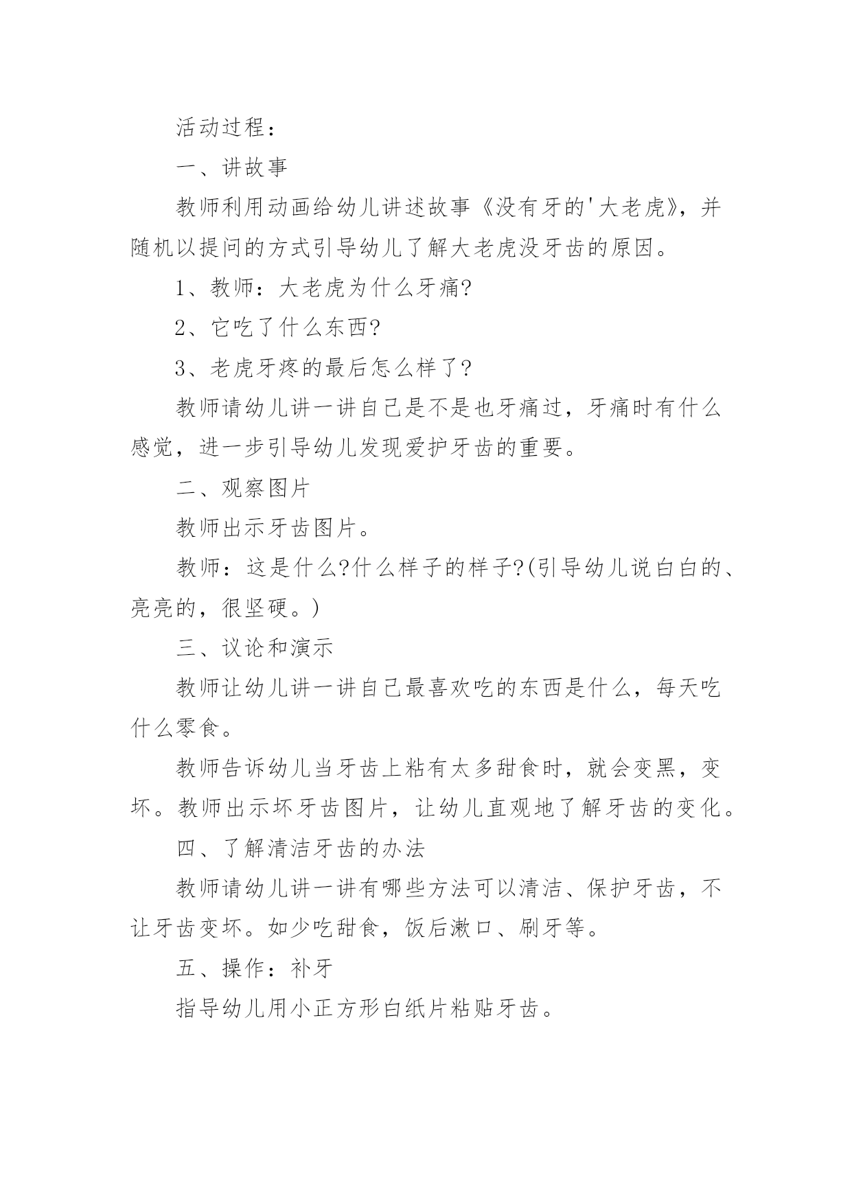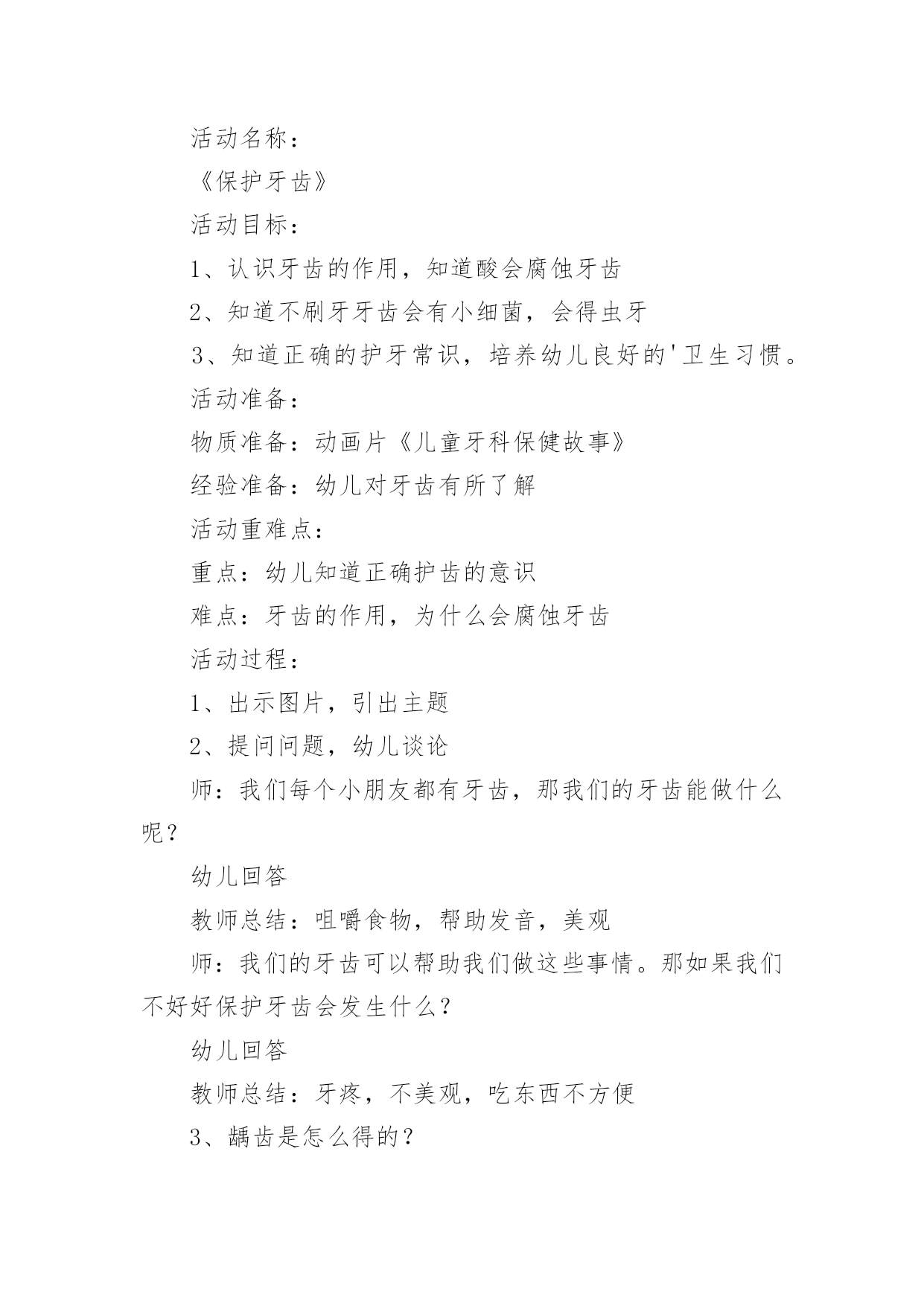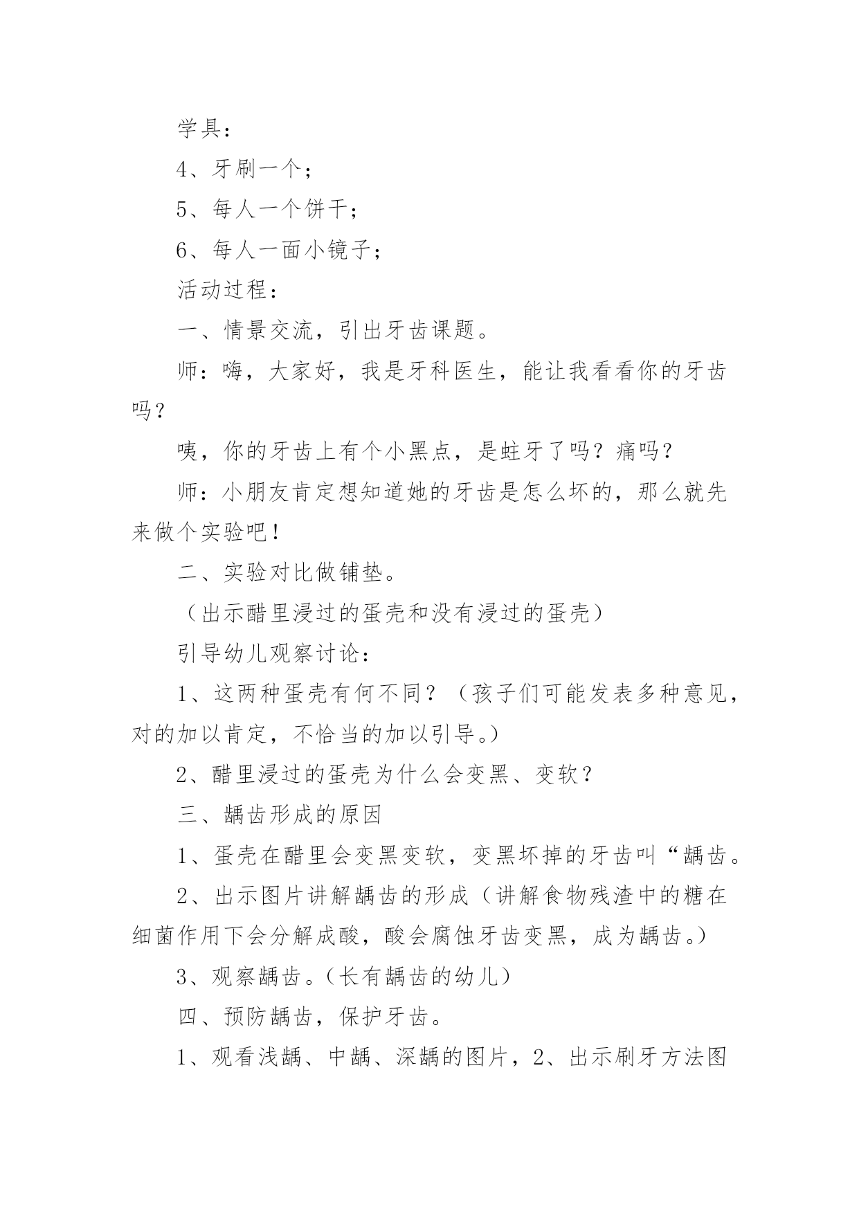 保护牙齿健康教案作为一名教师,通常需要用到教案来辅助教学,教案是教学活动的总的组织纲领和行动方案。那么你有了解过教案吗?下面是小编帮大家整理的保护牙齿健康教案,希望能够帮助到大家。保护牙齿健康教案1一、设计意图:在日常活动中,我发现幼儿对牙齿的了解并不深入,有坚持早晚刷牙习惯的幼儿并不多,蛀牙问题在幼儿中也严重存在,根据本班幼儿的认知特点和兴趣,我设想通过具体的牙齿模型、幼儿日常的生活经验,使幼儿在活动中整理和提升自己的经验,并寻找保护牙齿的方法。二、活动目标:1、了解牙齿的重要性。2、通过活动使幼儿了解蛀牙形成的原因。3、了解换牙的常识,学会保护恒牙,养成坚持每天刷牙的习惯。4、喜爱参加体育锻炼,养成爱运动的好习惯。5、培养幼儿养成良好生活习惯的意识。三、活动准备:1、牙模、牙刷;2、蛀牙形成的`图片两张;四、活动重点:了解牙齿的重要性,学会正确的刷牙方法。五、活动难点:蛀牙形成的原因。六、活动过程:(一)以猜谜语的形式引出主题师:今天老师请小朋友猜一个谜语,我请小朋友们猜到的小朋友上来轻轻的告诉老师,兄弟生来白又白,整整齐齐排两排。切菜舂米快又快,人人吃饭离不开。(牙齿)二、比一比,看一看1.师:小朋友们真棒呀,一下子就猜到答案了,小朋友洁白美丽的牙齿使人更健康,美观。小朋友我们的牙齿漂亮吗。我们同桌的小朋友互相看看2.看,这个就是我们的牙齿的模型,哪位小朋友能告诉我牙齿有什么作用呢?"(引导幼儿发散思维,对积极回答的幼儿给予肯定表扬)(二)讲述绘本故事《蛀牙王子》1,看完了故事,蛀牙王子为什么会得蛀牙啊?2,患了蛀牙之后会怎么样啊?(三)知道正确的刷牙方法1、师:刚才我们有小朋友说了早晚都刷牙可以不让我们的牙宝宝变成大蛀牙,那你们能坚持做到早晚都刷牙吗?2、学习刷牙步骤3、请幼儿演示刷牙动作师:我请小朋友做做看,刷牙的动作是怎么样的?(幼儿上前在牙模上演示)师:小朋友们的刷牙动作都不大一样,那跟着老师一边听音乐,一边做刷牙操吧!教学反思通过讲述保护牙齿这一教育活动,我觉得我班幼儿对如何保护牙齿这一内容十分感兴趣,在活动在组织过程中,我尝试运用了多种类型的师幼互动方式来推动幼儿的发展。在幼儿看课件《没有牙的大老虎》时,将几个问题抛给幼儿,“老虎的牙齿哪去了?”“故事里的老虎大王为什么会有蛀牙?”引导幼儿思考,蛀牙是怎样形成的呢?再通过吃饼干,逐个让幼儿看看,闻闻、摸摸醋中蛋壳,让幼儿知道吃完东西后会有食物残渣留在牙缝里,时间久了牙齿就象浸泡在醋里的蛋壳,会变软,变黑,久了牙齿还会掉落,此时的师幼互动达到一个小高潮,从而提高幼儿保护牙齿的意识。幼儿了解蛀牙形成的原因后,启发幼儿讨论如何预防蛀牙?怎样保护牙齿?通过保护牙齿的课件,使幼儿形像的观察了解到了牙齿的作用,掌握了正确的刷牙方法,特别是我在我在讲述正确的刷牙方法时,有的孩子都争先恐后的替我讲述,好像他们是老师似的,因此幼儿对“刷牙”的动作就有了一定的兴趣,因此在学习刷牙的时候,孩子参与的积极性很高,孩子都浸在了欢乐愉快的氛围之中。同时也在快乐的学习中懂得了怎样保护牙齿,并掌握正确的刷牙方法。保护牙齿健康教案2活动名称:《保护牙齿》活动目标:1、认识牙齿的作用,知道酸会腐蚀牙齿2、知道不刷牙牙齿会有小细菌,会得虫牙3、知道正确的护牙常识,培养幼儿良好的'卫生习惯。活动准备:物质准备:动画片《儿童牙科保健故事》经验准备:幼儿对牙齿有所了解活动重难点:重点:幼儿知道正确护齿的意识难点:牙齿的作用,为什么会腐蚀牙齿活动过程:1、出示图片,引出主题2、提问问题,幼儿谈论师:我们每个小朋友都有牙齿,那我们的牙齿能做什么呢?幼儿回答教师总结:咀嚼食物,帮助发音,美观师:我们的牙齿可以帮助我们做这些事情。那如果我们不好好保护牙齿会发生什么?幼儿回答教师总结:牙疼,不美观,吃东西不方便3、龋齿是怎么得的?请幼儿观看图片龋齿的由来,幼儿讨论龋齿的由来特点。准备一些图片,并让小朋友来讨论这些行为做的对嘛?为什么?请幼儿动画片《保护牙齿宣传故事》4、谈论幼儿怎么保护牙齿?饭后漱口、早晚刷牙、多吃水果蔬菜少吃甜食少吃过冷过硬的食物5、学习《好习惯》三字歌小牙刷、手中拿。小娃娃,来刷牙。里和外,上和下。都刷刷,没蛀牙。保护牙齿健康教案3活动目标:1、欣赏并理解故事《没有牙的大老虎》。2、使幼儿知道过多吃甜食会损坏牙齿,了解进餐后清洁口腔的基本方法。活动准备:1、小图片:糖果、甜饼干、饮料、小吃、2、操作图片活动过程:一、讲故事教师利用动画给幼儿讲述故事《没有牙的'大老虎》,并随机以提问的方式引导幼儿了解大老虎没牙齿的原因。1、教师:大老虎为什么牙痛?2、它吃了什么东西?3、老虎牙疼的最后怎么样了?教师请幼儿讲一讲自己是不是也牙痛过,牙痛时有什么感觉,进一步引导幼儿发现爱护牙齿的重要。二、观察图