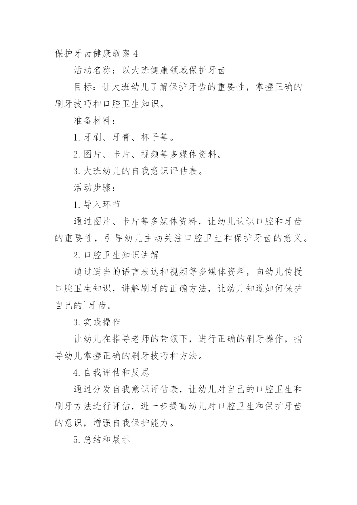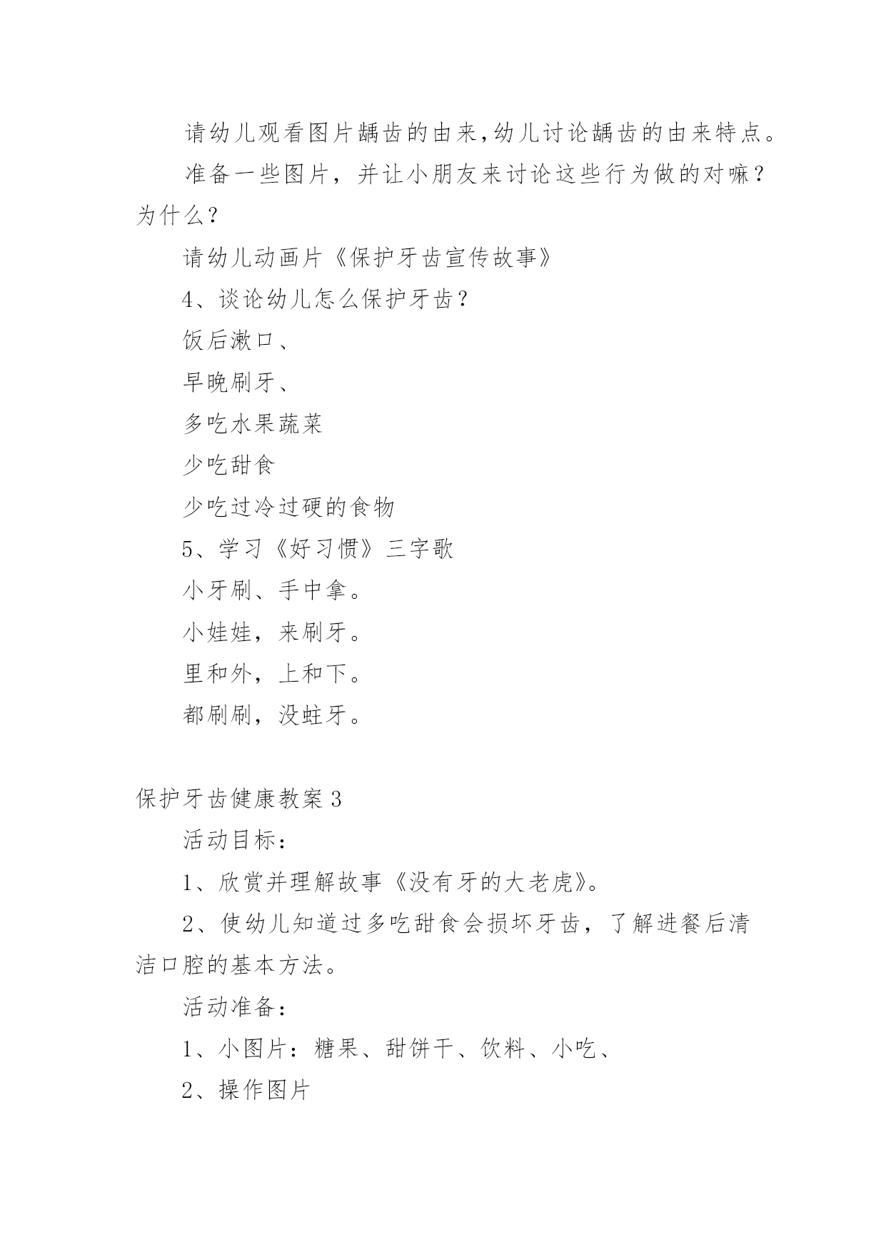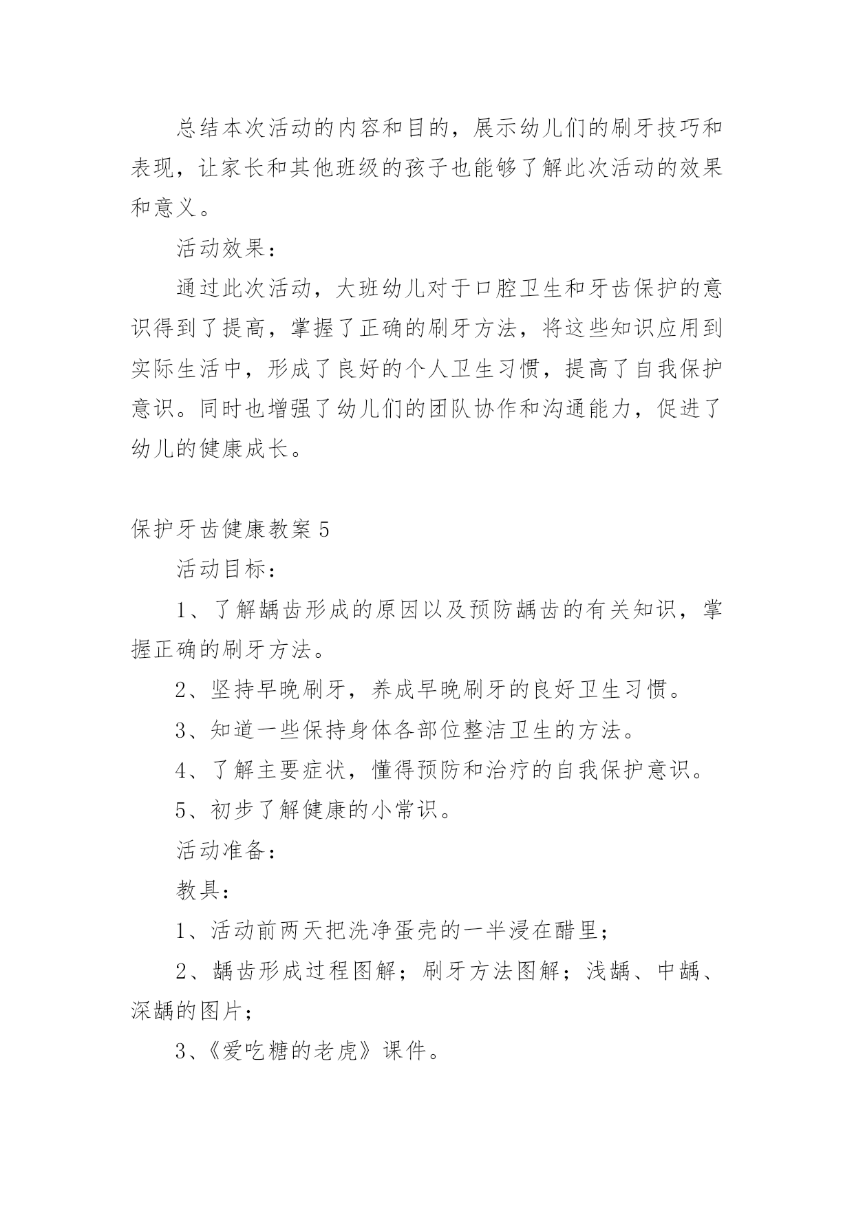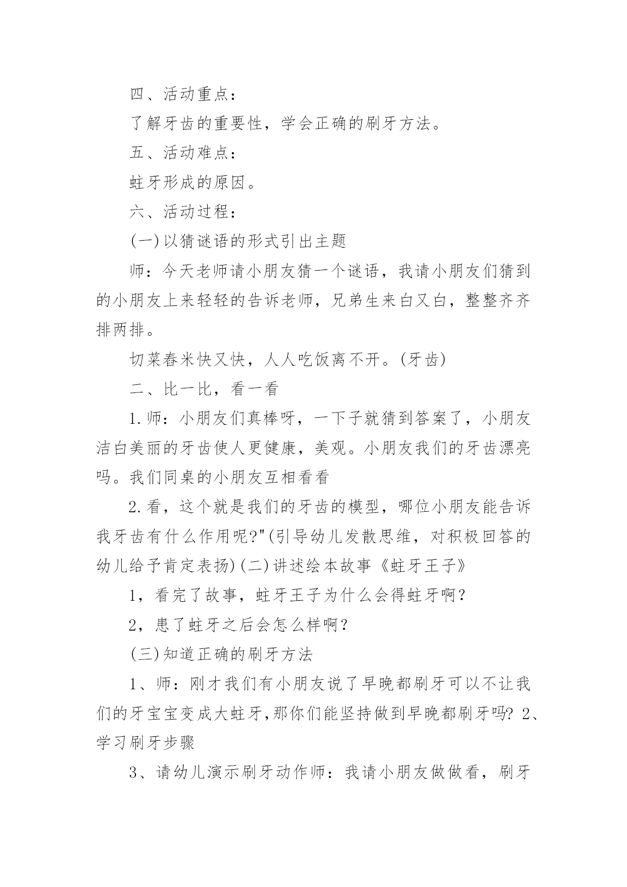 保护牙齿健康教案作为一名教师,通常需要用到教案来辅助教学,教案是教学活动的总的组织纲领和行动方案。那么你有了解过教案吗?下面是小编帮大家整理的保护牙齿健康教案,希望能够帮助到大家。保护牙齿健康教案1一、设计意图:在日常活动中,我发现幼儿对牙齿的了解并不深入,有坚持早晚刷牙习惯的幼儿并不多,蛀牙问题在幼儿中也严重存在,根据本班幼儿的认知特点和兴趣,我设想通过具体的牙齿模型、幼儿日常的生活经验,使幼儿在活动中整理和提升自己的经验,并寻找保护牙齿的方法。二、活动目标:1、了解牙齿的重要性。2、通过活动使幼儿了解蛀牙形成的原因。3、了解换牙的常识,学会保护恒牙,养成坚持每天刷牙的习惯。4、喜爱参加体育锻炼,养成爱运动的好习惯。5、培养幼儿养成良好生活习惯的意识。三、活动准备:1、牙模、牙刷;2、蛀牙形成的`图片两张;四、活动重点:了解牙齿的重要性,学会正确的刷牙方法。五、活动难点:蛀牙形成的原因。六、活动过程:(一)以猜谜语的形式引出主题师:今天老师请小朋友猜一个谜语,我请小朋友们猜到的小朋友上来轻轻的告诉老师,兄弟生来白又白,整整齐齐排两排。切菜舂米快又快,人人吃饭离不开。(牙齿)二、比一比,看一看1.师:小朋友们真棒呀,一下子就猜到答案了,小朋友洁白美丽的牙齿使人更健康,美观。小朋友我们的牙齿漂亮吗。我们同桌的小朋友互相看看2.看,这个就是我们的牙齿的模型,哪位小朋友能告诉我牙齿有什么作用呢?"(引导幼儿发散思维,对积极回答的幼儿给予肯定表扬)(二)讲述绘本故事《蛀牙王子》1,看完了故事,蛀牙王子为什么会得蛀牙啊?2,患了蛀牙之后会怎么样啊?(三)知道正确的刷牙方法1、师:刚才我们有小朋友说了早晚都刷牙可以不让我们的牙宝宝变成大蛀牙,那你们能坚持做到早晚都刷牙吗?2、学习刷牙步骤3、请幼儿演示刷牙动作师:我请小朋友做做看,刷牙的动作是怎么样的?(幼儿上前在牙模上演示)师:小朋友们的刷牙动作都不大一样,那跟着老师一边听音乐,一边做刷牙操吧!教学反思通过讲述保护牙齿这一教育活动,我觉得我班幼儿对如何保护牙齿这一内容十分感兴趣,在活动在组织过程中,我尝试运用了多种类型的师幼互动方式来推动幼儿的发展。在幼儿看课件《没有牙的大老虎》时,将几个问题抛给幼儿,“老虎的牙齿哪去了?”“故事里的老虎大王为什么会有蛀牙?”引导幼儿思考,蛀牙是怎样形成的呢?再通过吃饼干,逐个让幼儿看看,闻闻、摸摸醋中蛋壳,让幼儿知道吃完东西后会有食物残渣留在牙缝里,时间久了牙齿就象浸泡在醋里的蛋壳,会变软,变黑,久了牙齿还会掉落,此时的师幼互动达到一个小高潮,从而提高幼儿保护牙齿的意识。幼儿了解蛀牙形成的原因后,启发幼儿讨论如何预防蛀牙?怎样保护牙齿?通过保护牙齿的课件,使幼儿形像的观察了解到了牙齿的作用,掌握了正确的刷牙方法,特别是我在我在讲述正确的刷牙方法时,有的孩子都争先恐后的替我讲述,好像他们是老师似的,因此幼儿对“刷牙”的动作就有了一定的兴趣,因此在学习刷牙的时候,孩子参与的积极性很高,孩子都浸在了欢乐愉快的氛围之中。同时也在快乐的学习中懂得了怎样保护牙齿,并掌握正确的刷牙方法。保护牙齿健康教案2活动名称:《保护牙齿》活动目标:1、认识牙齿的作用,知道酸会腐蚀牙齿2、知道不刷牙牙齿会有小细菌,会得虫牙3、知道正确的护牙常识,培养幼儿良好的'卫生习惯。活动准备:物质准备:动画片《儿童牙科保健故事》经验准备:幼儿对牙齿有所了解活动重难点:重点:幼儿知道正确护齿的意识难点:牙齿的作用,为什么会腐蚀牙齿活动过程:1、出示图片,引出主题2、提问问题,幼儿谈论师:我们每个小朋友都有牙齿,那我们的牙齿能做什么呢?幼儿回答教师总结:咀嚼食物,帮助发音,美观师:我们的牙齿可以帮助我们做这些事情。那如果我们不好好保护牙齿会发生什么?幼儿回答教师总结:牙疼,不美观,吃东西不方便3、龋齿是怎么得的?请幼儿观看图片龋齿的由来,幼儿讨论龋齿的由来特点。准备一些图片,并让小朋友来讨论这些行为做的对嘛?为什么?请幼儿动画片《保护牙齿宣传故事》4、谈论幼儿怎么保护牙齿?饭后漱口、早晚刷牙、多吃水果蔬菜少吃甜食少吃过冷过硬的食物5、学习《好习惯》三字歌小牙刷、手中拿。小娃娃,来刷牙。里和外,上和下。都刷刷,没蛀牙。保护牙齿健康教案3活动目标:1、欣赏并理解故事《没有牙的大老虎》。2、使幼儿知道过多吃甜食会损坏牙齿,了解进餐后清洁口腔的基本方法。活动准备:1、小图片:糖果、甜饼干、饮料、小吃、2、操作图片活动过程:一、讲故事教师利用动画给幼儿讲述故事《没有牙的'大老虎》,并随机以提问的方式引导幼儿了解大老虎没牙齿的原因。1、教师:大老虎为什么牙痛?2、它吃了什么东西?3、老虎牙疼的最后怎么样了?教师请幼儿讲一讲自己是不是也牙痛过,牙痛时有什么感觉,进一步引导幼儿发现爱护牙齿的重要。二、观察图