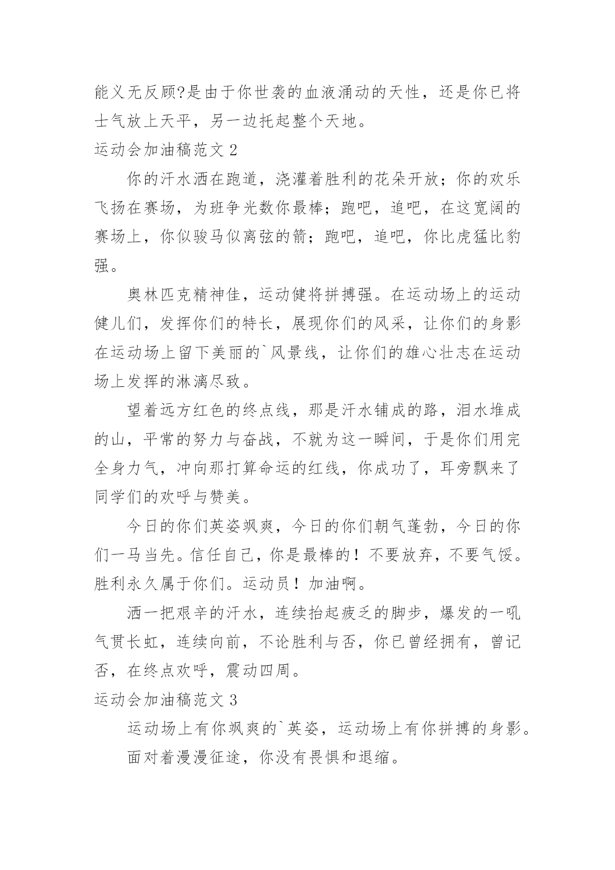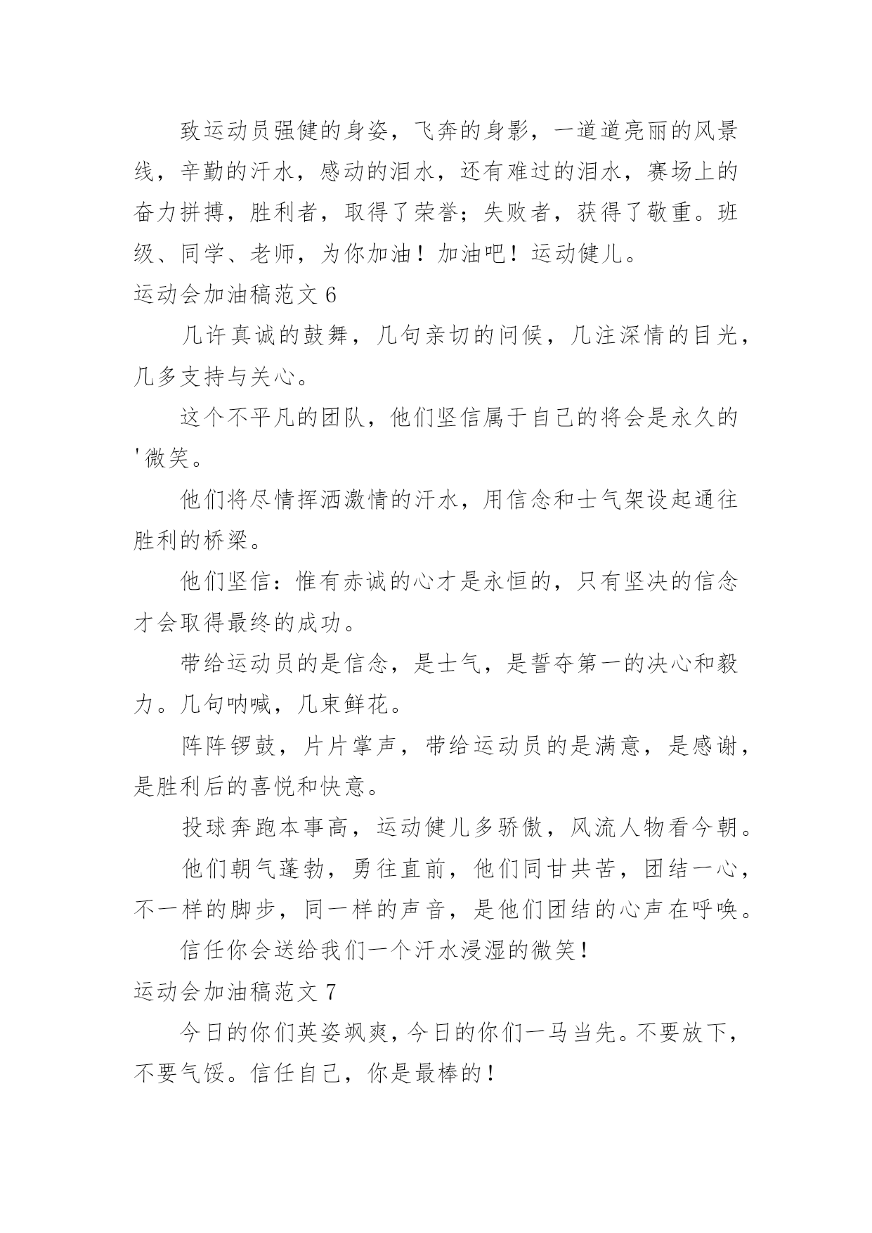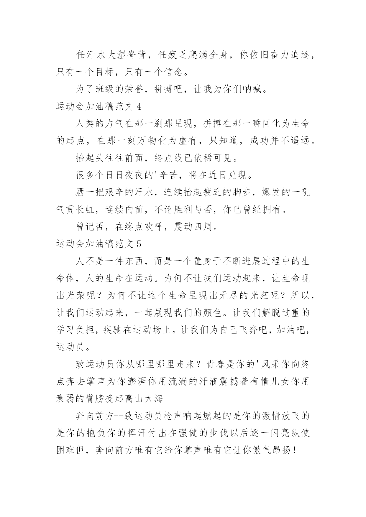 运动会加油稿运动会加油稿范文大全(10篇)随着社会不断地进步,用到加油稿的地方越来越多,借助加油稿可以给对方传达鼓励。写加油稿的注意事项有许多,你确定会写吗?以下是小编精心整理的运动会加油稿范文,仅供参考,希望能够帮助到大家。运动会加油稿范文1带着青春的朝气,散发着年轻的激情,搏击生命的长空,高吼一声:“我们来啦。”我们走进了杭电高校生冬季运动会。来自五湖四海的莘莘学子共聚杭电一方,学习上你追我赶,运动场上随处可见他们强健的身影,在杭电高校生运动会上他们踊跃报名,以期一展当代高校生的风采。在运动会的几天里,他们始终坚持发扬友情第一,重在参加的优良风格,赛出成果赛出风格将会伴随运动会顺当结束,拭目以待吧,友爱的师生。运动会加油稿200字4开朗和阴郁都曾写在前额,昨天和明天都没有放弃执著。狂风的.日子里我是卷起的浪,晴朗的日子里我是闪亮的玻,不改的是奔流的本色。胜利和失败都镌刻进生活,春履和秋痕都不失为景色。你犹如插上了飞跃地平线的翅膀,追踪流星、闪逝无迹,或撞成碎片,或射向天际。为什么你能冲开一切?为什么你能义无反顾?是由于你世袭的血液涌动的天性,还是你已将士气放上天平,另一边托起整个天地。运动会加油稿范文2你的汗水洒在跑道,浇灌着胜利的花朵开放;你的欢乐飞扬在赛场,为班争光数你最棒;跑吧,追吧,在这宽阔的赛场上,你似骏马似离弦的箭;跑吧,追吧,你比虎猛比豹强。奥林匹克精神佳,运动健将拼搏强。在运动场上的运动健儿们,发挥你们的特长,展现你们的风采,让你们的身影在运动场上留下美丽的`风景线,让你们的雄心壮志在运动场上发挥的淋漓尽致。望着远方红色的终点线,那是汗水铺成的路,泪水堆成的山,平常的努力与奋战,不就为这一瞬间,于是你们用完全身力气,冲向那打算命运的红线,你成功了,耳旁飘来了同学们的欢呼与赞美。今日的你们英姿飒爽,今日的你们朝气蓬勃,今日的你们一马当先。信任自己,你是最棒的!不要放弃,不要气馁。胜利永久属于你们。运动员!加油啊。洒一把艰辛的汗水,连续抬起疲乏的脚步,爆发的一吼气贯长虹,连续向前,不论胜利与否,你已曾经拥有,曾记否,在终点欢呼,震动四周。运动会加油稿范文3运动场上有你飒爽的`英姿,运动场上有你拼搏的身影。面对着漫漫征途,你没有畏惧和退缩。任汗水大湿脊背,任疲乏爬满全身,你依旧奋力追逐,只有一个目标,只有一个信念。为了班级的荣誉,拼搏吧,让我为你们呐喊。运动会加油稿范文4人类的力气在那一刹那呈现,拼搏在那一瞬间化为生命的起点,在那一刻万物化为虚有,只知道,成功并不遥远。抬起头往往前面,终点线已依稀可见。很多个日日夜夜的'辛苦,将在近日兑现。洒一把艰辛的汗水,连续抬起疲乏的脚步,爆发的一吼气贯长虹,连续向前,不论胜利与否,你已曾经拥有。曾记否,在终点欢呼,震动四周。运动会加油稿范文5人不是一件东西,而是一个置身于不断进展过程中的生命体,人的生命在运动。为何不让我们运动起来,让生命现出光荣呢?为何不让这个生命呈现出无尽的光茫呢?所以,让我们运动起来,一起展现我们的颜色。让我们解脱过重的学习负担,疾驰在运动场上。让我们为自已飞奔吧,加油吧,运动员。致运动员你从哪里哪里走来?青春是你的'风采你向终点奔去掌声为你澎湃你用流淌的汗液震撼着有情儿女你用衰弱的臂膀挽起高山大海奔向前方--致运动员枪声响起燃起的是你的激情放飞的是你的抱负你的挥汗付出在强健的步伐以后逐一闪亮纵使困难但,奔向前方唯有它给你掌声唯有它让你傲气昂扬!致运动员强健的身姿,飞奔的身影,一道道亮丽的风景线,辛勤的汗水,感动的泪水,还有难过的泪水,赛场上的奋力拼搏,胜利者,取得了荣誉;失败者,获得了敬重。班级、同学、老师,为你加油!加油吧!运动健儿。运动会加油稿范文6几许真诚的鼓舞,几句亲切的问候,几注深情的目光,几多支持与关心。这个不平凡的团队,他们坚信属于自己的将会是永久的'微笑。他们将尽情挥洒激情的汗水,用信念和士气架设起通往胜利的桥梁。他们坚信:惟有赤诚的心才是永恒的,只有坚决的信念才会取得最终的成功。带给运动员的是信念,是士气,是誓夺第一的决心和毅力。几句呐喊,几束鲜花。阵阵锣鼓,片片掌声,带给运动员的是满意,是感谢,是胜利后的喜悦和快意。投球奔跑本事高,运动健儿多骄傲,风流人物看今朝。他们朝气蓬勃,勇往直前,他们同甘共苦,团结一心,不一样的脚步,同一样的声音,是他们团结的心声在呼唤。信任你会送给我们一个汗水浸湿的微笑!运动会加油稿范文7今日的你们英姿飒爽,今日的你们一马当先。不要放下,不要气馁。信任自己,你是最棒的!时值秋暮冬初,虽然已过了金秋十月,然而初冬依旧暖阳高照,校运动会在这样风和日丽的天气里如期进行了。努力吧!加油啊!时间短暂并不代表你活力短暂,距离不长却表示你胜利不远,信任自己,冲啊!成功就在眼前,失去不会再现!漫漫长路,你愿一人独撑,