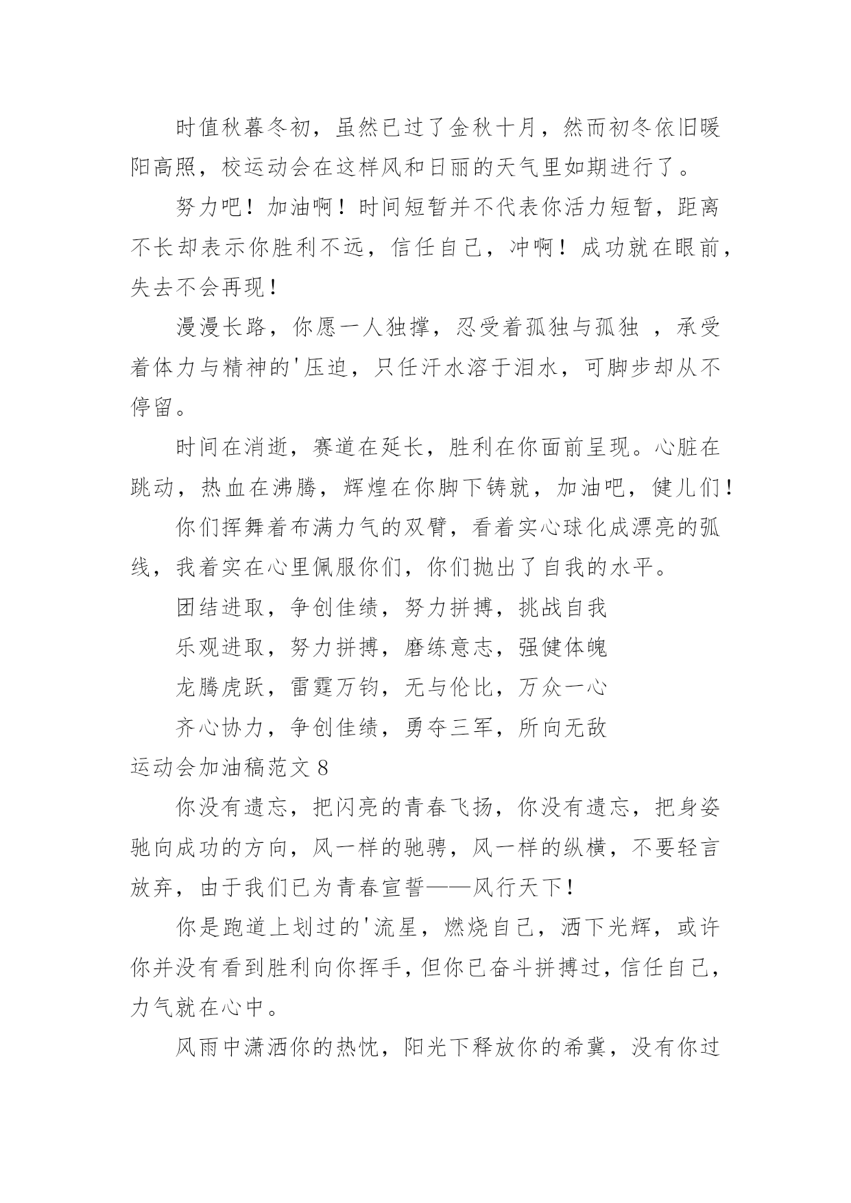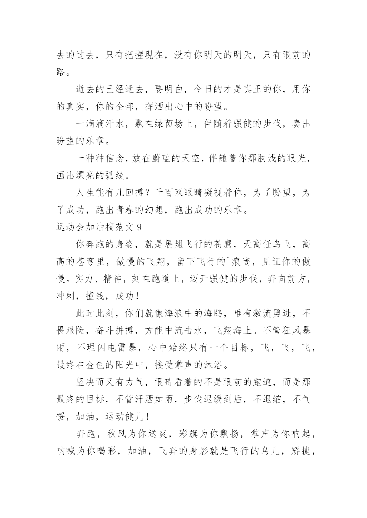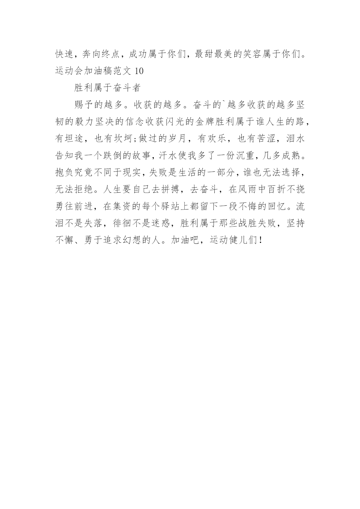 运动会加油稿运动会加油稿范文大全(10篇)随着社会不断地进步,用到加油稿的地方越来越多,借助加油稿可以给对方传达鼓励。写加油稿的注意事项有许多,你确定会写吗?以下是小编精心整理的运动会加油稿范文,仅供参考,希望能够帮助到大家。运动会加油稿范文1带着青春的朝气,散发着年轻的激情,搏击生命的长空,高吼一声:“我们来啦。”我们走进了杭电高校生冬季运动会。来自五湖四海的莘莘学子共聚杭电一方,学习上你追我赶,运动场上随处可见他们强健的身影,在杭电高校生运动会上他们踊跃报名,以期一展当代高校生的风采。在运动会的几天里,他们始终坚持发扬友情第一,重在参加的优良风格,赛出成果赛出风格将会伴随运动会顺当结束,拭目以待吧,友爱的师生。运动会加油稿200字4开朗和阴郁都曾写在前额,昨天和明天都没有放弃执著。狂风的.日子里我是卷起的浪,晴朗的日子里我是闪亮的玻,不改的是奔流的本色。胜利和失败都镌刻进生活,春履和秋痕都不失为景色。你犹如插上了飞跃地平线的翅膀,追踪流星、闪逝无迹,或撞成碎片,或射向天际。为什么你能冲开一切?为什么你能义无反顾?是由于你世袭的血液涌动的天性,还是你已将士气放上天平,另一边托起整个天地。运动会加油稿范文2你的汗水洒在跑道,浇灌着胜利的花朵开放;你的欢乐飞扬在赛场,为班争光数你最棒;跑吧,追吧,在这宽阔的赛场上,你似骏马似离弦的箭;跑吧,追吧,你比虎猛比豹强。奥林匹克精神佳,运动健将拼搏强。在运动场上的运动健儿们,发挥你们的特长,展现你们的风采,让你们的身影在运动场上留下美丽的`风景线,让你们的雄心壮志在运动场上发挥的淋漓尽致。望着远方红色的终点线,那是汗水铺成的路,泪水堆成的山,平常的努力与奋战,不就为这一瞬间,于是你们用完全身力气,冲向那打算命运的红线,你成功了,耳旁飘来了同学们的欢呼与赞美。今日的你们英姿飒爽,今日的你们朝气蓬勃,今日的你们一马当先。信任自己,你是最棒的!不要放弃,不要气馁。胜利永久属于你们。运动员!加油啊。洒一把艰辛的汗水,连续抬起疲乏的脚步,爆发的一吼气贯长虹,连续向前,不论胜利与否,你已曾经拥有,曾记否,在终点欢呼,震动四周。运动会加油稿范文3运动场上有你飒爽的`英姿,运动场上有你拼搏的身影。面对着漫漫征途,你没有畏惧和退缩。任汗水大湿脊背,任疲乏爬满全身,你依旧奋力追逐,只有一个目标,只有一个信念。为了班级的荣誉,拼搏吧,让我为你们呐喊。运动会加油稿范文4人类的力气在那一刹那呈现,拼搏在那一瞬间化为生命的起点,在那一刻万物化为虚有,只知道,成功并不遥远。抬起头往往前面,终点线已依稀可见。很多个日日夜夜的'辛苦,将在近日兑现。洒一把艰辛的汗水,连续抬起疲乏的脚步,爆发的一吼气贯长虹,连续向前,不论胜利与否,你已曾经拥有。曾记否,在终点欢呼,震动四周。运动会加油稿范文5人不是一件东西,而是一个置身于不断进展过程中的生命体,人的生命在运动。为何不让我们运动起来,让生命现出光荣呢?为何不让这个生命呈现出无尽的光茫呢?所以,让我们运动起来,一起展现我们的颜色。让我们解脱过重的学习负担,疾驰在运动场上。让我们为自已飞奔吧,加油吧,运动员。致运动员你从哪里哪里走来?青春是你的'风采你向终点奔去掌声为你澎湃你用流淌的汗液震撼着有情儿女你用衰弱的臂膀挽起高山大海奔向前方--致运动员枪声响起燃起的是你的激情放飞的是你的抱负你的挥汗付出在强健的步伐以后逐一闪亮纵使困难但,奔向前方唯有它给你掌声唯有它让你傲气昂扬!致运动员强健的身姿,飞奔的身影,一道道亮丽的风景线,辛勤的汗水,感动的泪水,还有难过的泪水,赛场上的奋力拼搏,胜利者,取得了荣誉;失败者,获得了敬重。班级、同学、老师,为你加油!加油吧!运动健儿。运动会加油稿范文6几许真诚的鼓舞,几句亲切的问候,几注深情的目光,几多支持与关心。这个不平凡的团队,他们坚信属于自己的将会是永久的'微笑。他们将尽情挥洒激情的汗水,用信念和士气架设起通往胜利的桥梁。他们坚信:惟有赤诚的心才是永恒的,只有坚决的信念才会取得最终的成功。带给运动员的是信念,是士气,是誓夺第一的决心和毅力。几句呐喊,几束鲜花。阵阵锣鼓,片片掌声,带给运动员的是满意,是感谢,是胜利后的喜悦和快意。投球奔跑本事高,运动健儿多骄傲,风流人物看今朝。他们朝气蓬勃,勇往直前,他们同甘共苦,团结一心,不一样的脚步,同一样的声音,是他们团结的心声在呼唤。信任你会送给我们一个汗水浸湿的微笑!运动会加油稿范文7今日的你们英姿飒爽,今日的你们一马当先。不要放下,不要气馁。信任自己,你是最棒的!时值秋暮冬初,虽然已过了金秋十月,然而初冬依旧暖阳高照,校运动会在这样风和日丽的天气里如期进行了。努力吧!加油啊!时间短暂并不代表你活力短暂,距离不长却表示你胜利不远,信任自己,冲啊!成功就在眼前,失去不会再现!漫漫长路,你愿一人独撑,