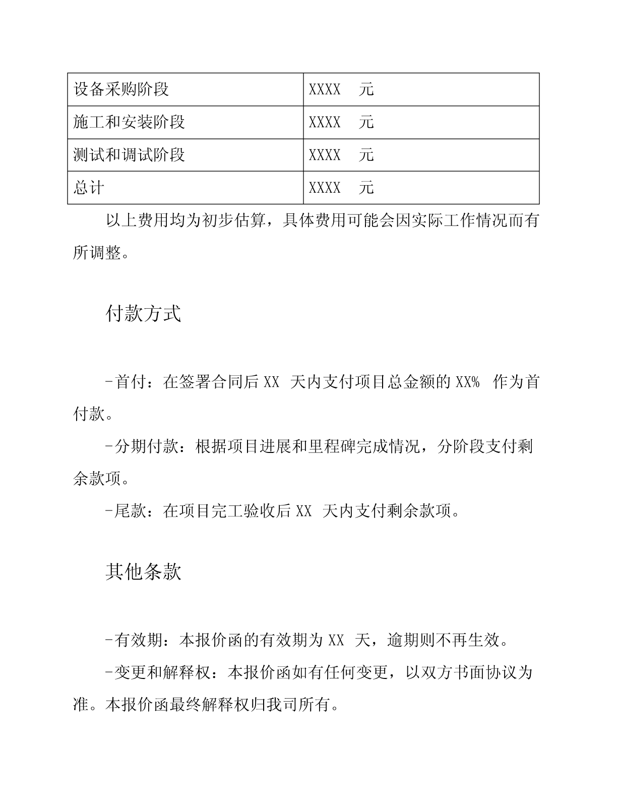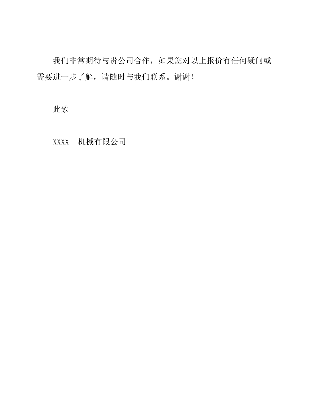 机械工程报价函尊敬的客户,感谢贵公司对我们的关注和支持。根据您的要求,我们荣幸地向您提供机械工程项目的报价。以下是我们对该项目的详细报价:项目概述-项目名称:XXXX机械工程项目-项目地点:XXXX市-项目周期:XX个月-项目起始日期:XXXX年XX月XX日项目费用我们经过仔细评估和调研,为您提供以下费用估算:项目阶段费用估算(人民币)设计和规划阶段XXXX元设备采购阶段XXXX元施工和安装阶段XXXX元测试和调试阶段XXXX元总计XXXX元以上费用均为初步估算,具体费用可能会因实际工作情况而有所调整。付款方式-首付:在签署合同后XX天内支付项目总金额的XX%作为首付款。-分期付款:根据项目进展和里程碑完成情况,分阶段支付剩余款项。-尾款:在项目完工验收后XX天内支付剩余款项。其他条款-有效期:本报价函的有效期为XX天,逾期则不再生效。-变更和解释权:本报价函如有任何变更,以双方书面协议为准。本报价函最终解释权归我司所有。我们非常期待与贵公司合作,如果您对以上报价有任何疑问或需要进一步了解,请随时与我们联系。谢谢!此致XXXX机械有限公司