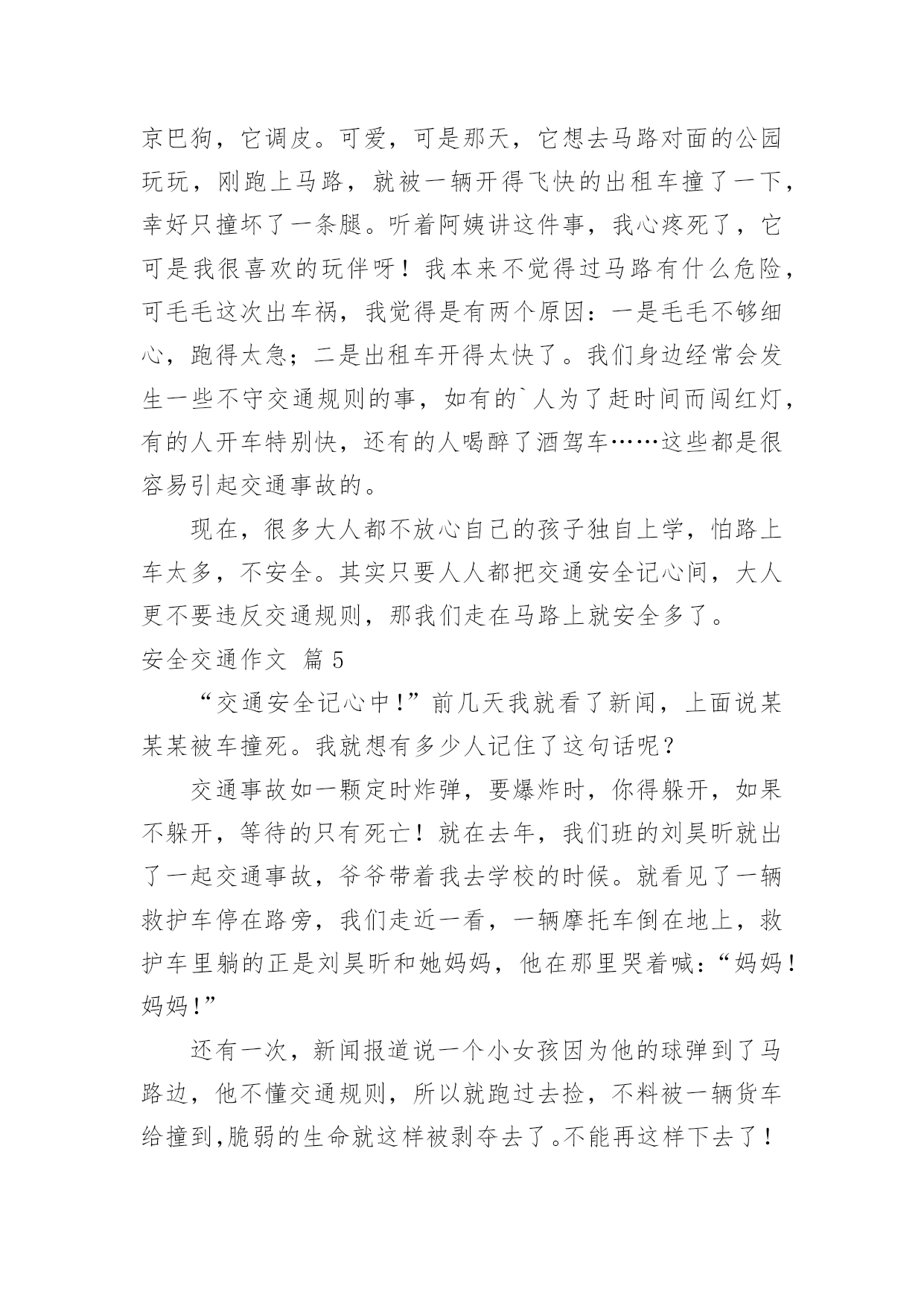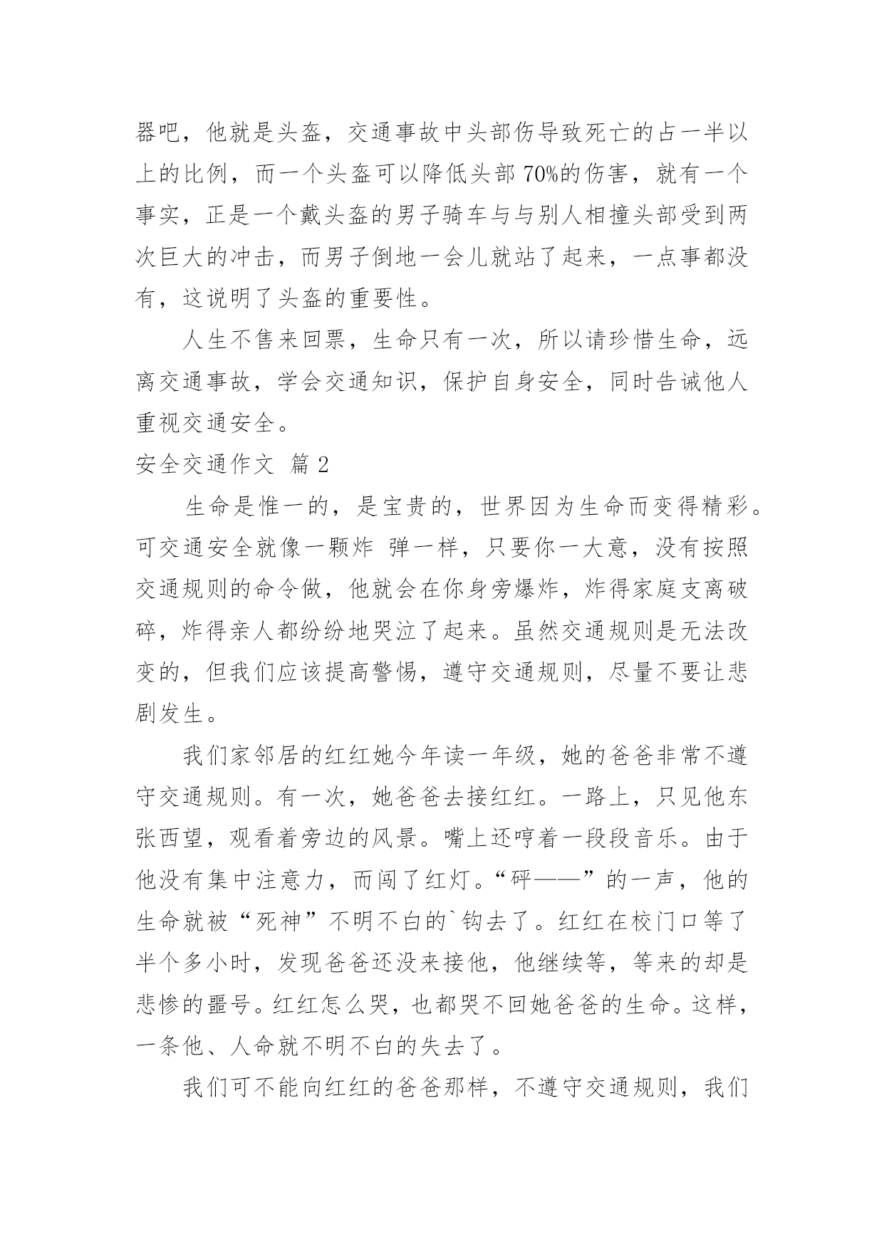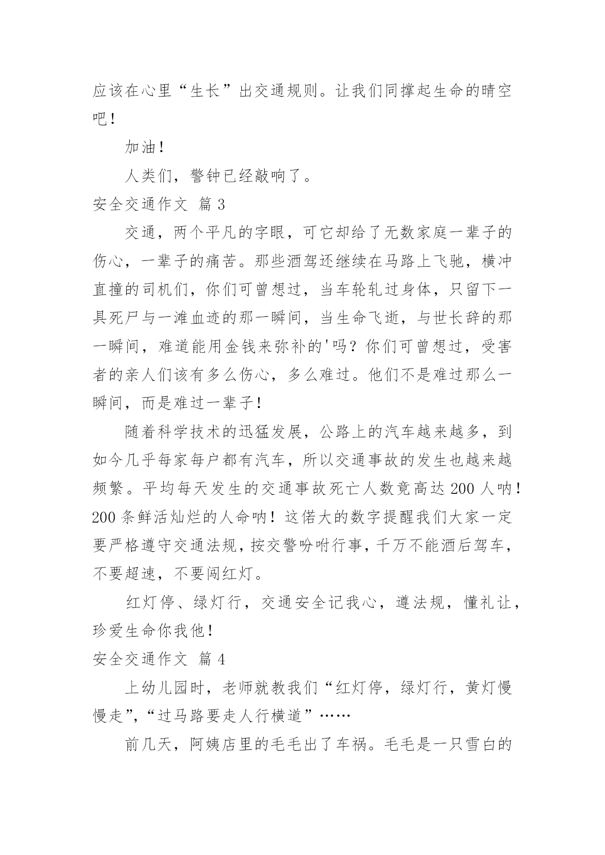 安全交通作文安全交通作文(精选)在日常的学习、工作、生活中,大家总少不了接触作文吧,借助作文人们可以实现文化交流的目的。那么,怎么去写作文呢?以下是小编精心整理的安全交通作文5篇,欢迎大家借鉴与参考,希望对大家有所帮助。安全交通作文篇1交通安全是每个人都要面临的问题。每一次出门都有可能遇到交通事故,可又不能一直不出门,所以交通安全是我们必须注意的问题,就让我们来聊聊吧。最近晋城交警发布了关于交通安全的短片,让我们来看看吧,他主要讲了等车的站位,汽车的盲区,什么年龄段可以骑的车,酒驾的危害,头盔的作用等方面等车时应离大货车远一些,如果太近会因为两个轮胎的差距而超出只预测的道路会被擦伤,每辆汽车都有盲区,尤其是大货车,因为大货车几乎有80%的盲区,而这个问题出现的原因就是大货车驾驶座位太高,说完大货车就再说说学生骑的车吧,初中生可以骑的是自行车,到了18岁拥有驾驶证才可以驾驶机动车。而现在有些中学生偷偷骑电动车上下学,这就是一个巨大的隐患,中学生遇事会慌慌张张,而大人们也有意识不清醒的.时候,那就是睡不足和喝酒后,这种情况的人们在开车途中无法集中注意力,还会有几秒钟的闭眼时间,就会在这关键时刻导致车祸的发生,说完了危险就在说说保命的神器吧,他就是头盔,交通事故中头部伤导致死亡的占一半以上的比例,而一个头盔可以降低头部70%的伤害,就有一个事实,正是一个戴头盔的男子骑车与与别人相撞头部受到两次巨大的冲击,而男子倒地一会儿就站了起来,一点事都没有,这说明了头盔的重要性。人生不售来回票,生命只有一次,所以请珍惜生命,远离交通事故,学会交通知识,保护自身安全,同时告诫他人重视交通安全。安全交通作文篇2生命是惟一的,是宝贵的,世界因为生命而变得精彩。可交通安全就像一颗炸弹一样,只要你一大意,没有按照交通规则的命令做,他就会在你身旁爆炸,炸得家庭支离破碎,炸得亲人都纷纷地哭泣了起来。虽然交通规则是无法改变的,但我们应该提高警惕,遵守交通规则,尽量不要让悲剧发生。我们家邻居的红红她今年读一年级,她的爸爸非常不遵守交通规则。有一次,她爸爸去接红红。一路上,只见他东张西望,观看着旁边的风景。嘴上还哼着一段段音乐。由于他没有集中注意力,而闯了红灯。“砰——”的一声,他的生命就被“死神”不明不白的`钩去了。红红在校门口等了半个多小时,发现爸爸还没来接他,他继续等,等来的却是悲惨的噩号。红红怎么哭,也都哭不回她爸爸的生命。这样,一条他、人命就不明不白的失去了。我们可不能向红红的爸爸那样,不遵守交通规则,我们应该在心里“生长”出交通规则。让我们同撑起生命的晴空吧!加油!人类们,警钟已经敲响了。安全交通作文篇3交通,两个平凡的字眼,可它却给了无数家庭一辈子的伤心,一辈子的痛苦。那些酒驾还继续在马路上飞驰,横冲直撞的司机们,你们可曾想过,当车轮轧过身体,只留下一具死尸与一滩血迹的那一瞬间,当生命飞逝,与世长辞的那一瞬间,难道能用金钱来弥补的'吗?你们可曾想过,受害者的亲人们该有多么伤心,多么难过。他们不是难过那么一瞬间,而是难过一辈子!随着科学技术的迅猛发展,公路上的汽车越来越多,到如今几乎每家每户都有汽车,所以交通事故的发生也越来越频繁。平均每天发生的交通事故死亡人数竟高达200人呐!200条鲜活灿烂的人命呐!这偌大的数字提醒我们大家一定要严格遵守交通法规,按交警吩咐行事,千万不能酒后驾车,不要超速,不要闯红灯。红灯停、绿灯行,交通安全记我心,遵法规,懂礼让,珍爱生命你我他!安全交通作文篇4上幼儿园时,老师就教我们“红灯停,绿灯行,黄灯慢慢走”,“过马路要走人行横道”……前几天,阿姨店里的毛毛出了车祸。毛毛是一只雪白的京巴狗,它调皮。可爱,可是那天,它想去马路对面的公园玩玩,刚跑上马路,就被一辆开得飞快的出租车撞了一下,幸好只撞坏了一条腿。听着阿姨讲这件事,我心疼死了,它可是我很喜欢的玩伴呀!我本来不觉得过马路有什么危险,可毛毛这次出车祸,我觉得是有两个原因:一是毛毛不够细心,跑得太急;二是出租车开得太快了。我们身边经常会发生一些不守交通规则的事,如有的`人为了赶时间而闯红灯,有的人开车特别快,还有的人喝醉了酒驾车……这些都是很容易引起交通事故的。现在,很多大人都不放心自己的孩子独自上学,怕路上车太多,不安全。其实只要人人都把交通安全记心间,大人更不要违反交通规则,那我们走在马路上就安全多了。安全交通作文篇5“交通安全记心中!”前几天我就看了新闻,上面说某某某被车撞死。我就想有多少人记住了这句话呢?交通事故如一颗定时炸弹,要爆炸时,你得躲开,如果不躲开,等待的只有死亡!就在去年,我们班的刘昊昕就出了一起交通事故,爷爷带着我去学校的时候。就看见了一辆救护车停在路旁,我们走近一看,一辆摩托车倒在地上,救护车里躺的正是刘昊昕和她妈妈,他在那里哭着喊:“妈妈!妈