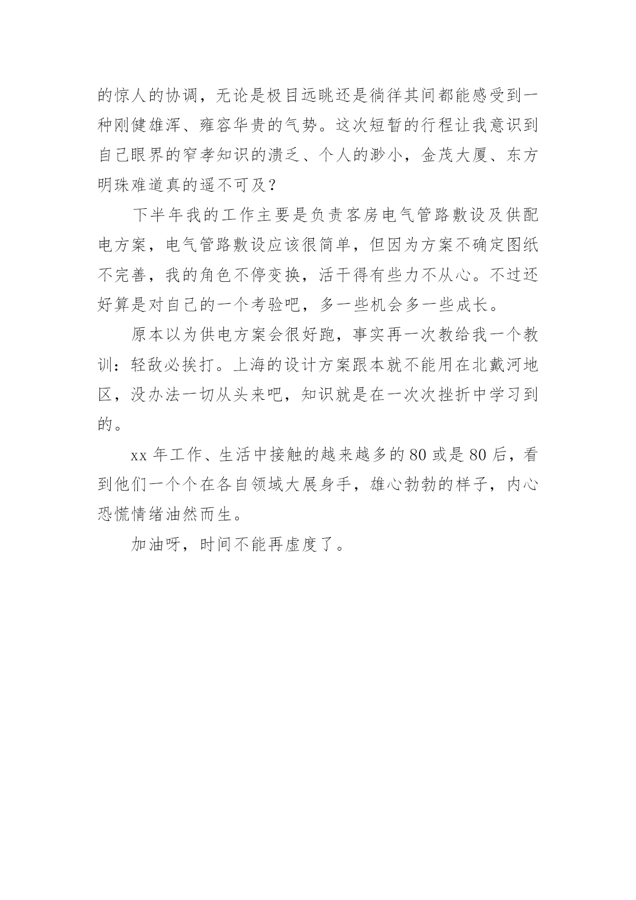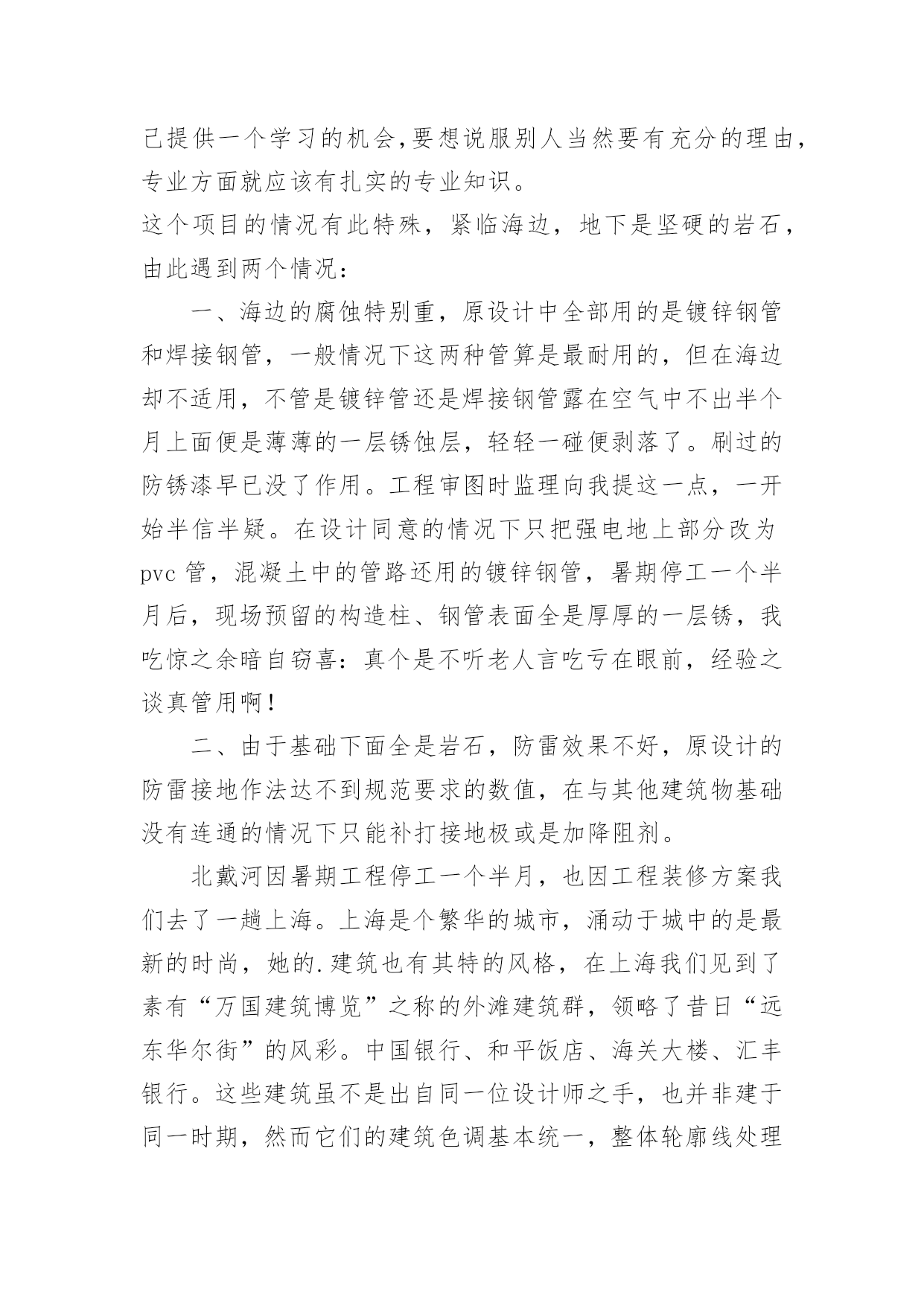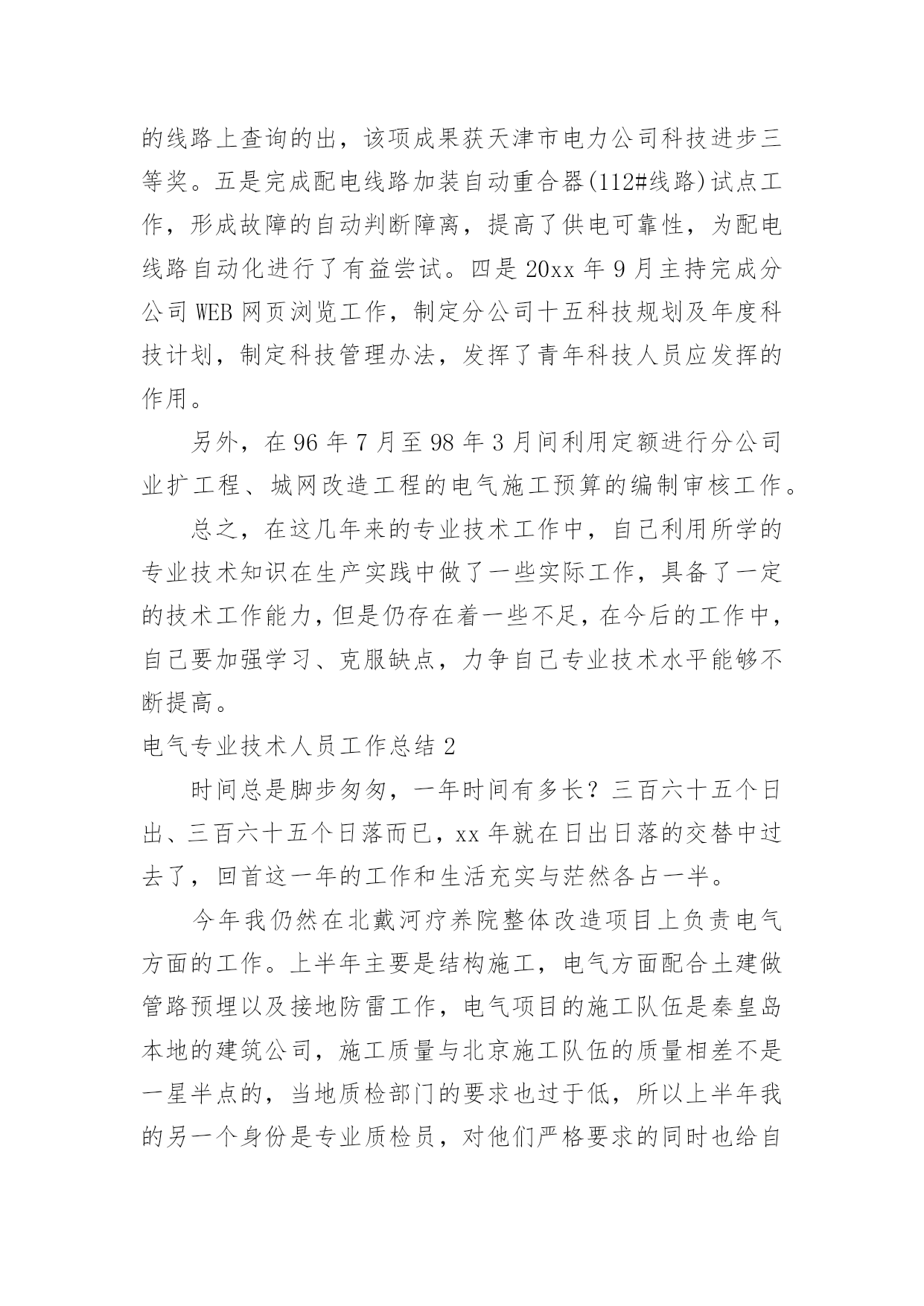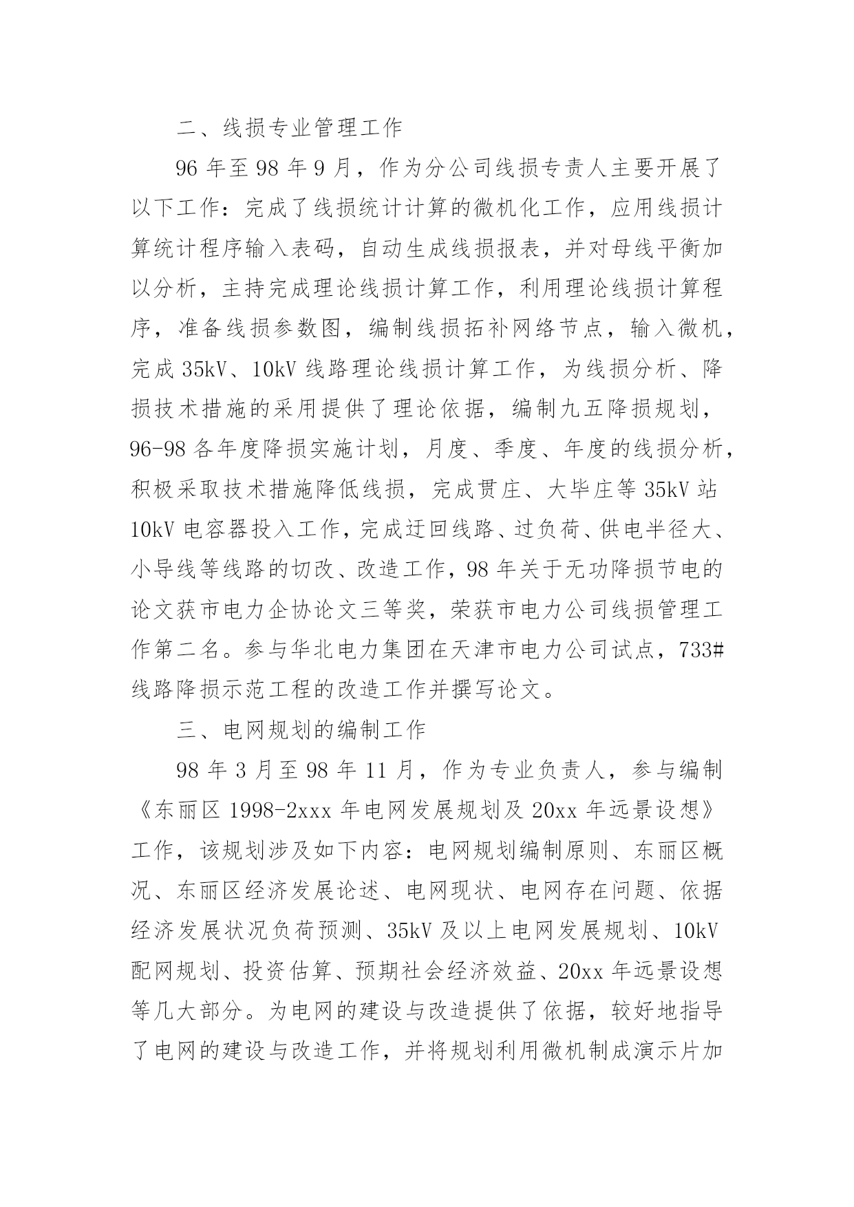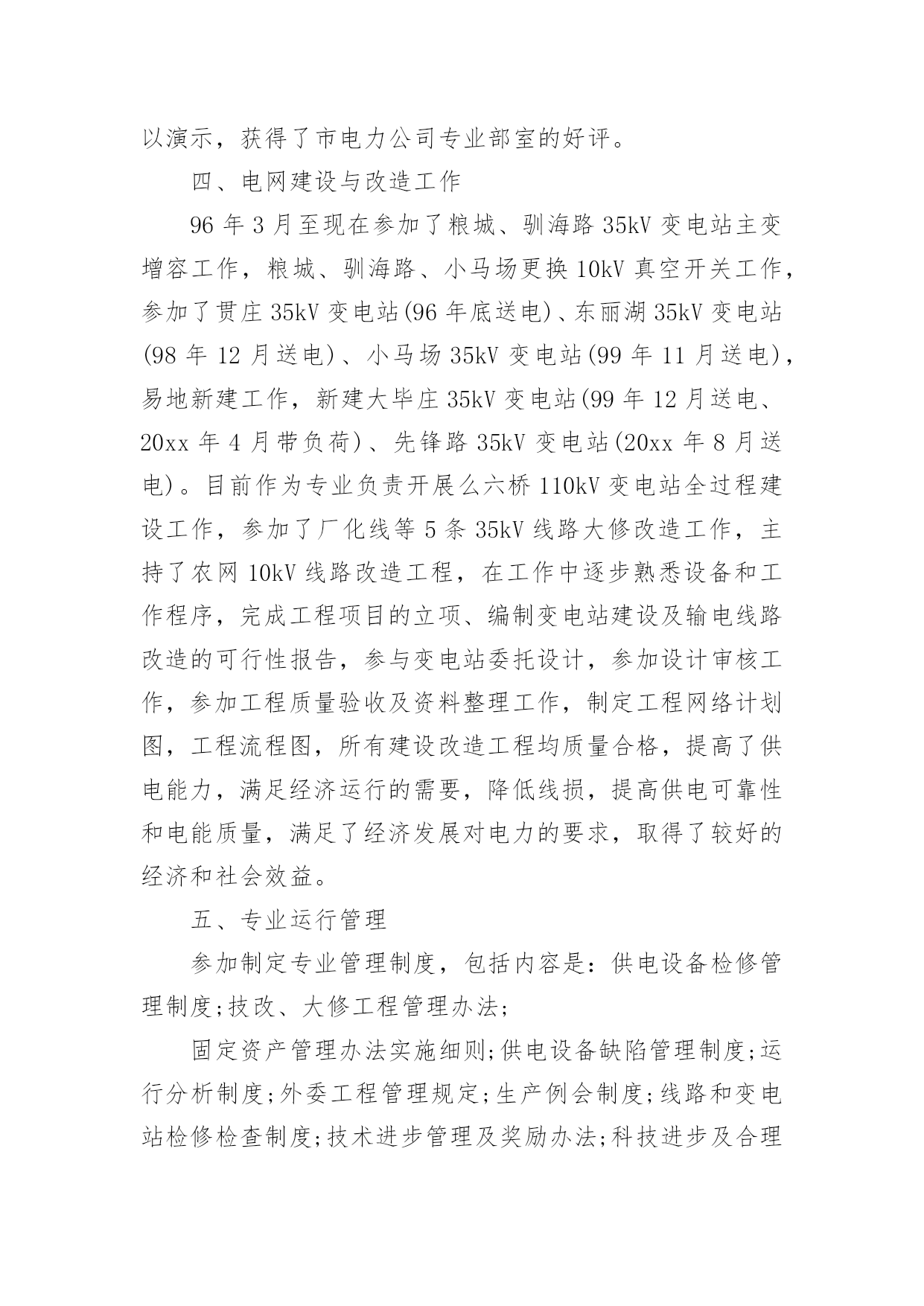 电气专业技术人员工作总结电气专业技术人员工作总结总结是把一定阶段内的有关情况分析研究,做出有指导性的经验方法以及结论的书面材料,它可使零星的、肤浅的、表面的感性认知上升到全面的、系统的、本质的理性认识上来,是时候写一份总结了。那么总结应该包括什么内容呢?下面是小编收集整理的电气专业技术人员工作总结,欢迎阅读与收藏。电气专业技术人员工作总结1一、继电保护定值整定工作(10kV及以下)96年9月至97年担负分公司10kV配电线路(含电容器)、10kV用户站继电保护定值整定工作,由于分公司原来没有整定人员,但自从开展工作以来建立了继电保护整定档案资料,如系统阻抗表、分线路阻抗图、系统站定值单汇总(分线路)用户站定值单汇总(分线路),并将定值单用微机打印以规范管理,还包括各重新整定定值的计算依据和计算过程,形成较为完善的定值整定计算的管理资料。近两年时间内完成新建贯庄35kV变电站出线定值整定工作和审核工作。未出现误整定现象,且通过对系统短路容量的计算为配电线路开关等设备的选择提供了依据。97年底由于机构设置变化,指导初级技术人员开展定值整定工作并顺利完成工作交接。二、线损专业管理工作96年至98年9月,作为分公司线损专责人主要开展了以下工作:完成了线损统计计算的微机化工作,应用线损计算统计程序输入表码,自动生成线损报表,并对母线平衡加以分析,主持完成理论线损计算工作,利用理论线损计算程序,准备线损参数图,编制线损拓补网络节点,输入微机,完成35kV、10kV线路理论线损计算工作,为线损分析、降损技术措施的采用提供了理论依据,编制九五降损规划,96-98各年度降损实施计划,月度、季度、年度的线损分析,积极采取技术措施降低线损,完成贯庄、大毕庄等35kV站10kV电容器投入工作,完成迂回线路、过负荷、供电半径大、小导线等线路的切改、改造工作,98年关于无功降损节电的论文获市电力企协论文三等奖,荣获市电力公司线损管理工作第二名。参与华北电力集团在天津市电力公司试点,733#线路降损示范工程的改造工作并撰写论文。三、电网规划的编制工作98年3月至98年11月,作为专业负责人,参与编制《东丽区1998-2xxx年电网发展规划及20xx年远景设想》工作,该规划涉及如下内容:电网规划编制原则、东丽区概况、东丽区经济发展论述、电网现状、电网存在问题、依据经济发展状况负荷预测、35kV及以上电网发展规划、10kV配网规划、投资估算、预期社会经济效益、20xx年远景设想等几大部分。为电网的建设与改造提供了依据,较好地指导了电网的建设与改造工作,并将规划利用微机制成演示片加以演示,获得了市电力公司专业部室的好评。四、电网建设与改造工作96年3月至现在参加了粮城、驯海路35kV变电站主变增容工作,粮城、驯海路、小马场更换10kV真空开关工作,参加了贯庄35kV变电站(96年底送电)、东丽湖35kV变电站(98年12月送电)、小马场35kV变电站(99年11月送电),易地新建工作,新建大毕庄35kV变电站(99年12月送电、20xx年4月带负荷)、先锋路35kV变电站(20xx年8月送电)。目前作为专业负责开展么六桥110kV变电站全过程建设工作,参加了厂化线等5条35kV线路大修改造工作,主持了农网10kV线路改造工程,在工作中逐步熟悉设备和工作程序,完成工程项目的立项、编制变电站建设及输电线路改造的可行性报告,参与变电站委托设计,参加设计审核工作,参加工程质量验收及资料整理工作,制定工程网络计划图,工程流程图,所有建设改造工程均质量合格,提高了供电能力,满足经济运行的需要,降低线损,提高供电可靠性和电能质量,满足了经济发展对电力的要求,取得了较好的经济和社会效益。五、专业运行管理参加制定专业管理制度,包括内容是:供电设备检修管理制度;技改、大修工程管理办法;固定资产管理办法实施细则;供电设备缺陷管理制度;运行分析制度;外委工程管理规定;生产例会制度;线路和变电站检修检查制度;技术进步管理及奖励办法;科技进步及合理化建议管理制度;计算机管理办法、计算机系统操作规程。技术监督管理与考核实施细则;主持制定供电营业所配电管理基本制度汇编。参加制定生产管理标准,内容是:电压和无功管理标准;线损管理标准;经济活动分析管理标准;设备全过程管理标准;主持制定专业管理责任制:线路运行专业工作管理网及各级人员责任制;变压器专业工作管理网及各级人员责任制;防污闪工作管理责任制;防雷工作管理责任制;电缆运行专业工作管理网及各级人员责任制;变压器反措实施细则。主持制定工程建设项目法人(经理)负责制实施细则及管理办法;城乡电网改造工程招投标管理办法(试行);城乡电网改造工程质量管理暂行办法等。积极开展季节性工作,安排布置年度的重要节日保电工作、重大治活动保电安排、防汛渡夏工作,