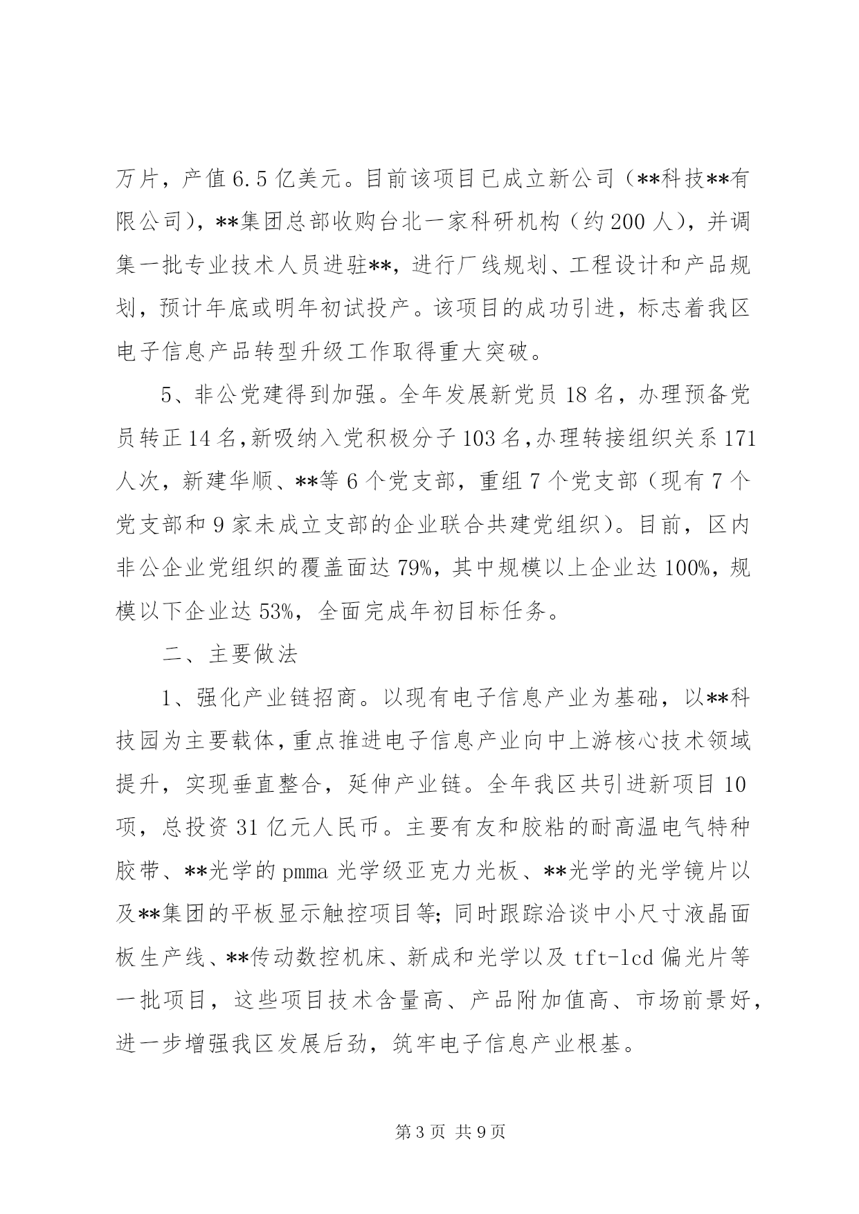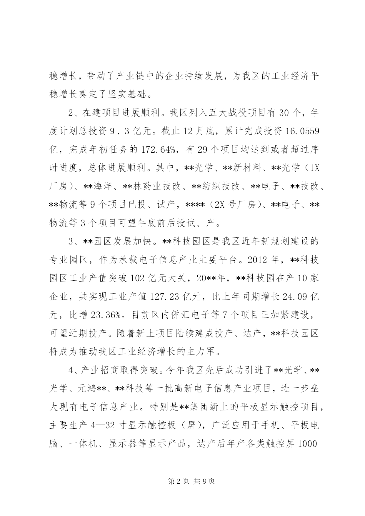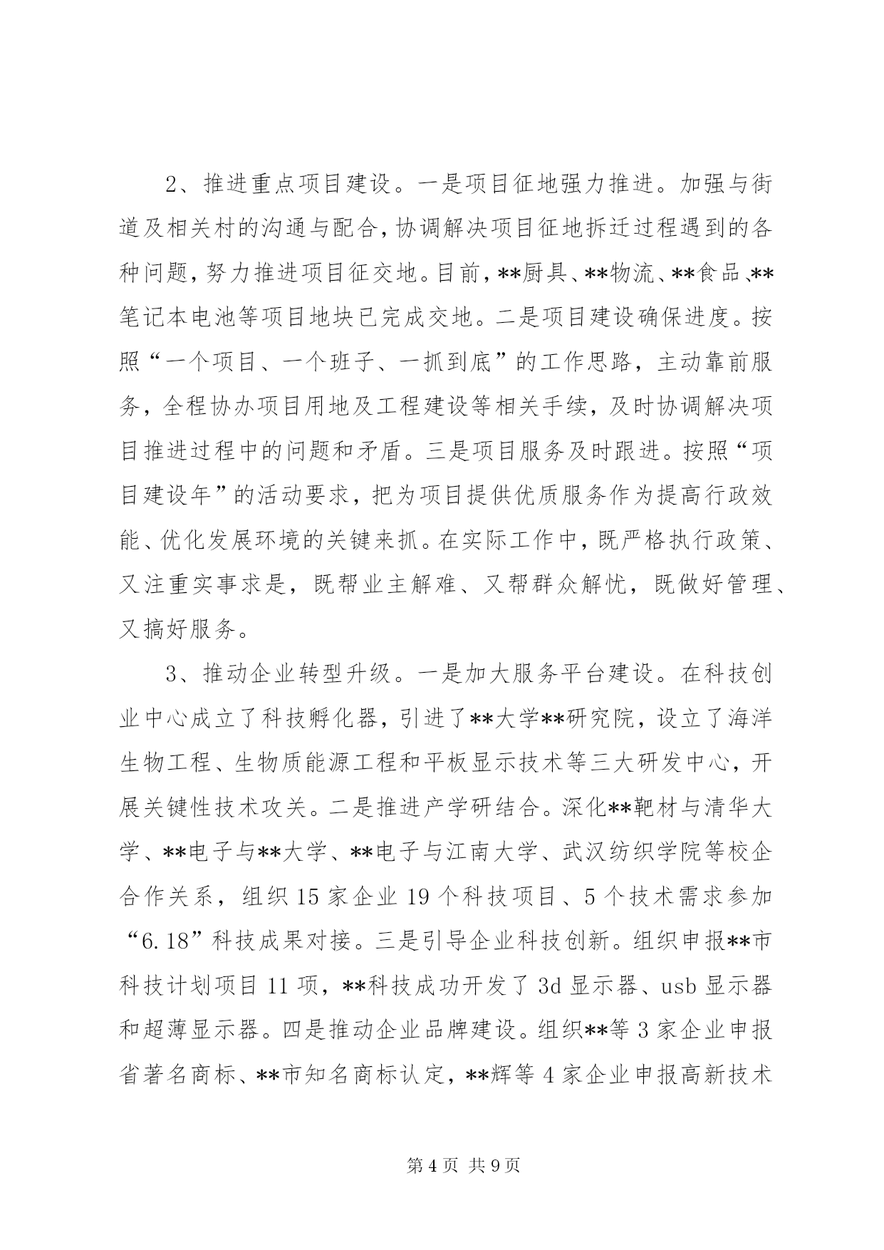 第PAGE\*Arabic\*MERGEFORMAT9页共NUMPAGES\*MERGEFORMAT9页经济技术开发区全年工作总结经济技术开发区工作总结20**年,我区按照**市委、市政府制定的目标任务,积极开展“项目建设年”活动,认真落实“三年倍增计划”、“加快工业园区发展”等政策措施,进一步解放思想,更新观念,开拓进取,凝心聚力,扎实苦干,在经济运行、招商引资、项目建设、基础设施配套、协调服务、社会事务和园区管理上下功夫,努力推进园区工业经济平稳健康发展。一、主要工作完成情况据统计,20**年**开发区中心区实现规模以上工业总产值501.17亿元,比增5.05%,完成年初任务的88.4%;完成固定资产投资80.657亿元,比增52.9%,完成年初任务**1.15%;实际利用外资3528万美元,比增0.8%,完成年初任务105%;合同利用外资5493万美元,比增37.3%,完成年初任务121.79%;内资实际到资16.9亿元,比增63.4%,完成年初任务163.3%。20**年,我区工业经济平稳增长,各项工作有序推进,呈五个亮点。1、骨干企业增长平稳。在世界经济不景气,国内外市场需求疲软的大背景下,我区大多骨干企业能适时调整产品结构,加大科技创新,实现平稳增长。20**年,**电子完成产值197亿元,比增-4.4%;**集团完成产值43亿元,比增2.3%。龙头企业平稳增长,带动了产业链中的企业持续发展,为我区的工业经济平稳增长奠定了坚实基础。2、在建项目进展顺利。我区列入五大战役项目有30个,年度计划总投资9.3亿元。截止12月底,累计完成投资16.0559亿,完成年初任务的172.64%,有29个项目均达到或者超过序时进度,总体进展顺利。其中,**光学、**新材料、**光学(1X厂房)、**海洋、**林药业技改、**纺织技改、**电子、**技改、**物流等9个项目已投、试产,****(2X号厂房)、**电子、**物流等3个项目可望年底前后投试、产。3、**园区发展加快。**科技园区是我区近年新规划建设的专业园区,作为承载电子信息产业主要平台。2012年,**科技园区工业产值突破102亿元大关,20**年,**科技园在产10家企业,共实现工业产值127.23亿元,比上年同期增长24.09亿元,比增23.36%。目前区内侨汇电子等7个项目正加紧建设,可望近期投产。随着新上项目陆续建成投产、达产,**科技园区将成为推动我区工业经济增长的主力军。4、产业招商取得突破。今年我区先后成功引进了**光学、**光学、元鸿**、**科技等一批高新电子信息产业项目,进一步垒大现有电子信息产业。特别是**集团新上的平板显示触控项目,主要生产4—32寸显示触控板(屏),广泛应用于手机、平板电脑、一体机、显示器等显示产品,达产后年产各类触控屏1000万片,产值6.5亿美元。目前该项目已成立新公司(**科技**有限公司),**集团总部收购台北一家科研机构(约200人),并调集一批专业技术人员进驻**,进行厂线规划、工程设计和产品规划,预计年底或明年初试投产。该项目的成功引进,标志着我区电子信息产品转型升级工作取得重大突破。5、非公党建得到加强。全年发展新党员18名,办理预备党员转正14名,新吸纳入党积极分子103名,办理转接组织关系171人次,新建华顺、**等6个党支部,重组7个党支部(现有7个党支部和9家未成立支部的企业联合共建党组织)。目前,区内非公企业党组织的覆盖面达79%,其中规模以上企业达100%,规模以下企业达53%,全面完成年初目标任务。二、主要做法1、强化产业链招商。以现有电子信息产业为基础,以**科技园为主要载体,重点推进电子信息产业向中上游核心技术领域提升,实现垂直整合,延伸产业链。全年我区共引进新项目10项,总投资31亿元人民币。主要有友和胶粘的耐高温电气特种胶带、**光学的pmma光学级亚克力光板、**光学的光学镜片以及**集团的平板显示触控项目等;同时跟踪洽谈中小尺寸液晶面板生产线、**传动数控机床、新成和光学以及tft-lcd偏光片等一批项目,这些项目技术含量高、产品附加值高、市场前景好,进一步增强我区发展后劲,筑牢电子信息产业根基。2、推进重点项目建设。一是项目征地强力推进。加强与街道及相关村的沟通与配合,协调解决项目征地拆迁过程遇到的各种问题,努力推进项目征交地。目前,**厨具、**物流、**食品、**笔记本电池等项目地块已完成交地。二是项目建设确保进度。按照“一个项目、一个班子、一抓到底”的工作思路,主动靠前服务,全程协办项目用地及工程建设等相关手续,及时协调解决项目推进过程中的问题和矛盾。三是项目服务及时跟进。按照“项目建设年”的活动要求,把为项目提供优质服务作为提高行政效能、优化发展环境