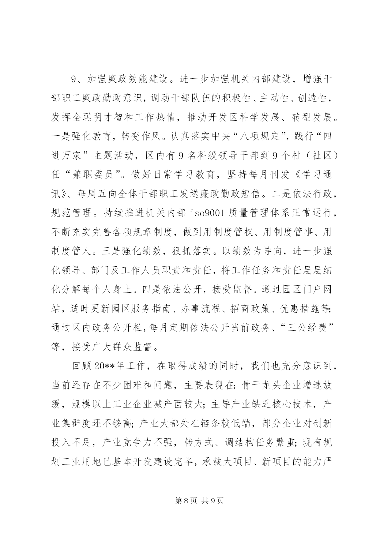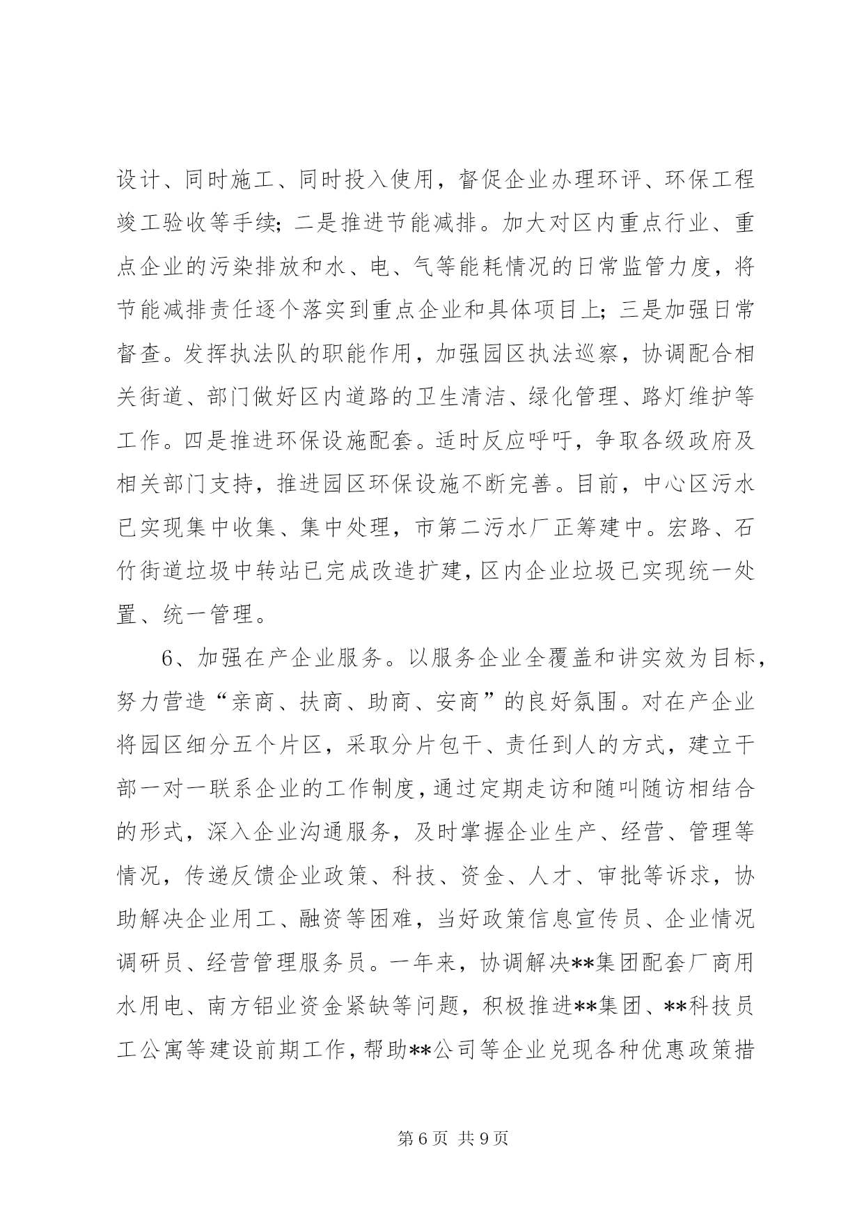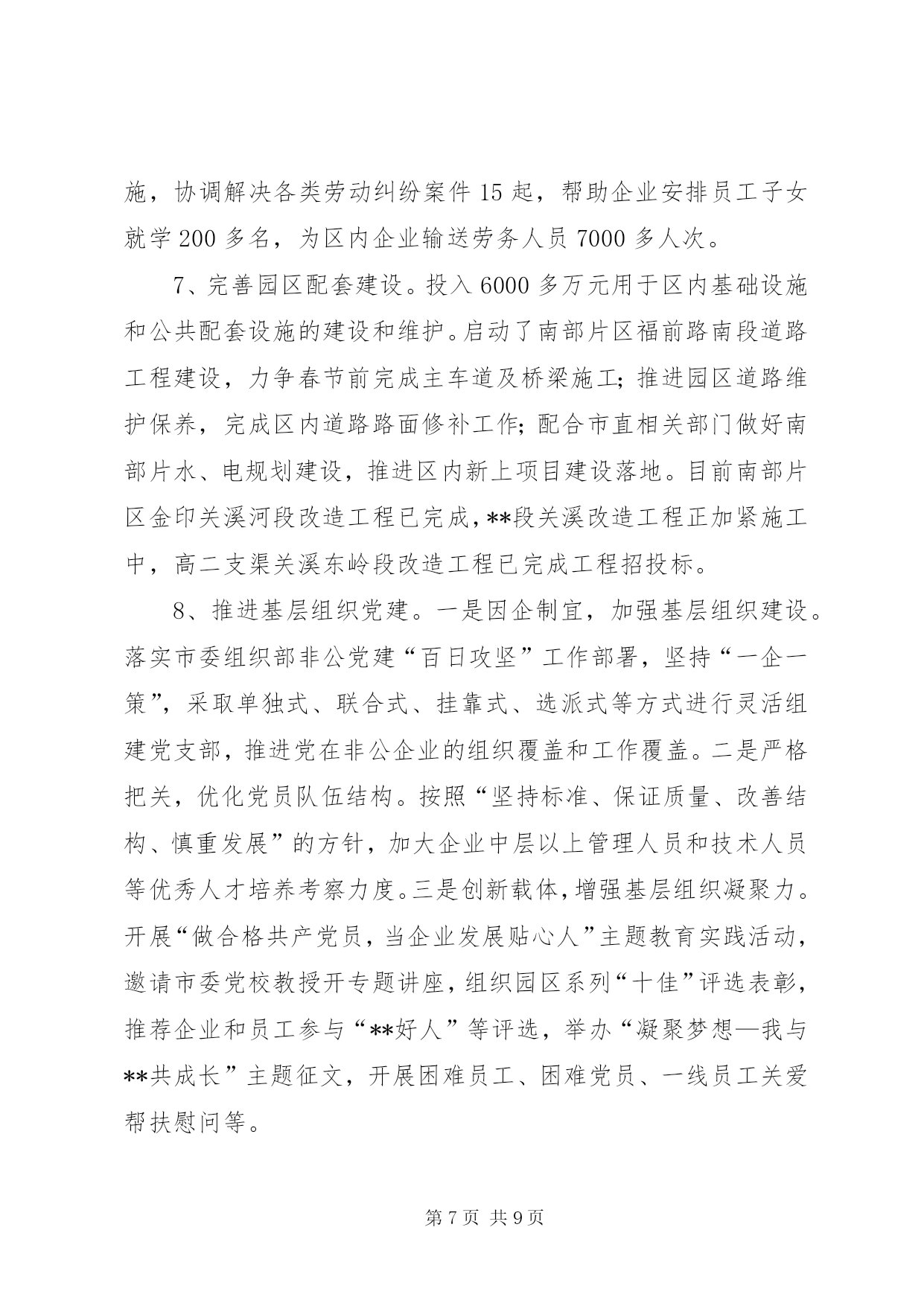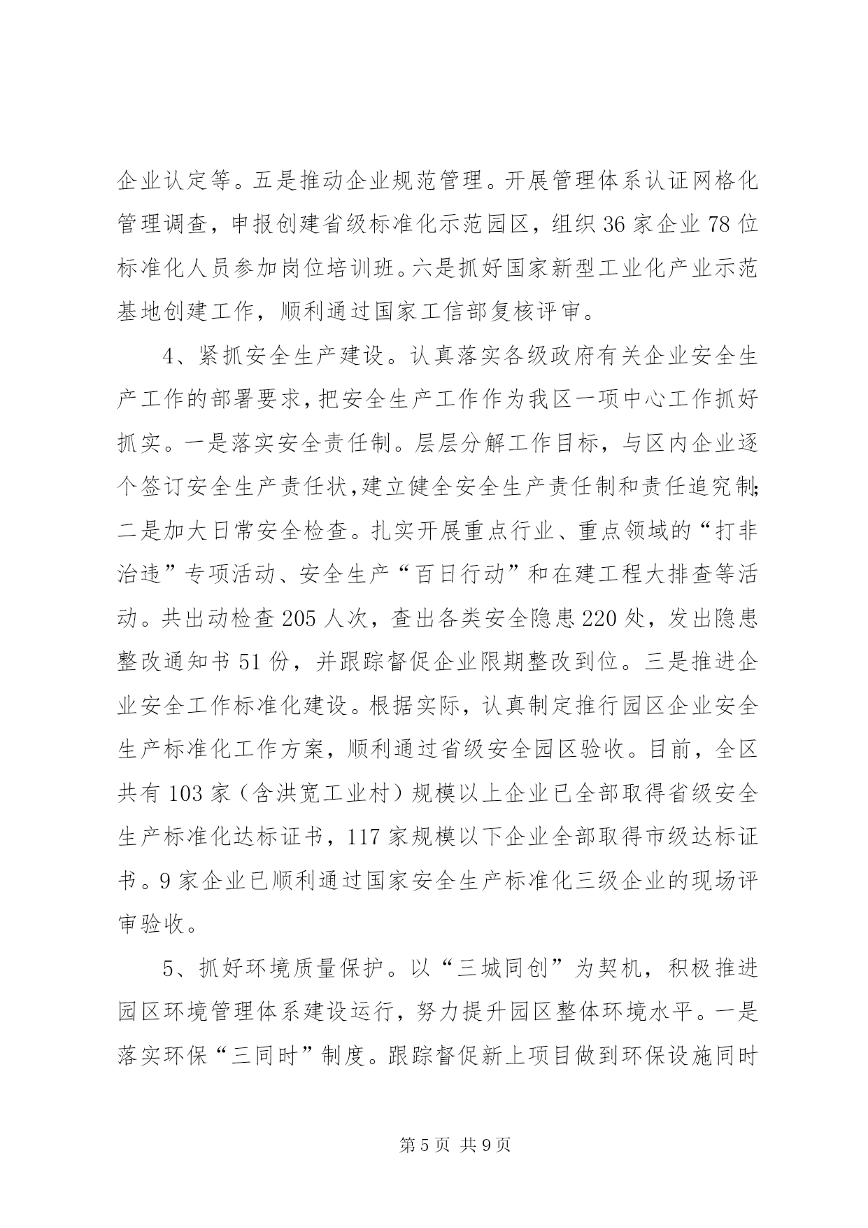 第PAGE\*Arabic\*MERGEFORMAT9页共NUMPAGES\*MERGEFORMAT9页经济技术开发区全年工作总结经济技术开发区工作总结20**年,我区按照**市委、市政府制定的目标任务,积极开展“项目建设年”活动,认真落实“三年倍增计划”、“加快工业园区发展”等政策措施,进一步解放思想,更新观念,开拓进取,凝心聚力,扎实苦干,在经济运行、招商引资、项目建设、基础设施配套、协调服务、社会事务和园区管理上下功夫,努力推进园区工业经济平稳健康发展。一、主要工作完成情况据统计,20**年**开发区中心区实现规模以上工业总产值501.17亿元,比增5.05%,完成年初任务的88.4%;完成固定资产投资80.657亿元,比增52.9%,完成年初任务**1.15%;实际利用外资3528万美元,比增0.8%,完成年初任务105%;合同利用外资5493万美元,比增37.3%,完成年初任务121.79%;内资实际到资16.9亿元,比增63.4%,完成年初任务163.3%。20**年,我区工业经济平稳增长,各项工作有序推进,呈五个亮点。1、骨干企业增长平稳。在世界经济不景气,国内外市场需求疲软的大背景下,我区大多骨干企业能适时调整产品结构,加大科技创新,实现平稳增长。20**年,**电子完成产值197亿元,比增-4.4%;**集团完成产值43亿元,比增2.3%。龙头企业平稳增长,带动了产业链中的企业持续发展,为我区的工业经济平稳增长奠定了坚实基础。2、在建项目进展顺利。我区列入五大战役项目有30个,年度计划总投资9.3亿元。截止12月底,累计完成投资16.0559亿,完成年初任务的172.64%,有29个项目均达到或者超过序时进度,总体进展顺利。其中,**光学、**新材料、**光学(1X厂房)、**海洋、**林药业技改、**纺织技改、**电子、**技改、**物流等9个项目已投、试产,****(2X号厂房)、**电子、**物流等3个项目可望年底前后投试、产。3、**园区发展加快。**科技园区是我区近年新规划建设的专业园区,作为承载电子信息产业主要平台。2012年,**科技园区工业产值突破102亿元大关,20**年,**科技园在产10家企业,共实现工业产值127.23亿元,比上年同期增长24.09亿元,比增23.36%。目前区内侨汇电子等7个项目正加紧建设,可望近期投产。随着新上项目陆续建成投产、达产,**科技园区将成为推动我区工业经济增长的主力军。4、产业招商取得突破。今年我区先后成功引进了**光学、**光学、元鸿**、**科技等一批高新电子信息产业项目,进一步垒大现有电子信息产业。特别是**集团新上的平板显示触控项目,主要生产4—32寸显示触控板(屏),广泛应用于手机、平板电脑、一体机、显示器等显示产品,达产后年产各类触控屏1000万片,产值6.5亿美元。目前该项目已成立新公司(**科技**有限公司),**集团总部收购台北一家科研机构(约200人),并调集一批专业技术人员进驻**,进行厂线规划、工程设计和产品规划,预计年底或明年初试投产。该项目的成功引进,标志着我区电子信息产品转型升级工作取得重大突破。5、非公党建得到加强。全年发展新党员18名,办理预备党员转正14名,新吸纳入党积极分子103名,办理转接组织关系171人次,新建华顺、**等6个党支部,重组7个党支部(现有7个党支部和9家未成立支部的企业联合共建党组织)。目前,区内非公企业党组织的覆盖面达79%,其中规模以上企业达100%,规模以下企业达53%,全面完成年初目标任务。二、主要做法1、强化产业链招商。以现有电子信息产业为基础,以**科技园为主要载体,重点推进电子信息产业向中上游核心技术领域提升,实现垂直整合,延伸产业链。全年我区共引进新项目10项,总投资31亿元人民币。主要有友和胶粘的耐高温电气特种胶带、**光学的pmma光学级亚克力光板、**光学的光学镜片以及**集团的平板显示触控项目等;同时跟踪洽谈中小尺寸液晶面板生产线、**传动数控机床、新成和光学以及tft-lcd偏光片等一批项目,这些项目技术含量高、产品附加值高、市场前景好,进一步增强我区发展后劲,筑牢电子信息产业根基。2、推进重点项目建设。一是项目征地强力推进。加强与街道及相关村的沟通与配合,协调解决项目征地拆迁过程遇到的各种问题,努力推进项目征交地。目前,**厨具、**物流、**食品、**笔记本电池等项目地块已完成交地。二是项目建设确保进度。按照“一个项目、一个班子、一抓到底”的工作思路,主动靠前服务,全程协办项目用地及工程建设等相关手续,及时协调解决项目推进过程中的问题和矛盾。三是项目服务及时跟进。按照“项目建设年”的活动要求,把为项目提供优质服务作为提高行政效能、优化发展环境