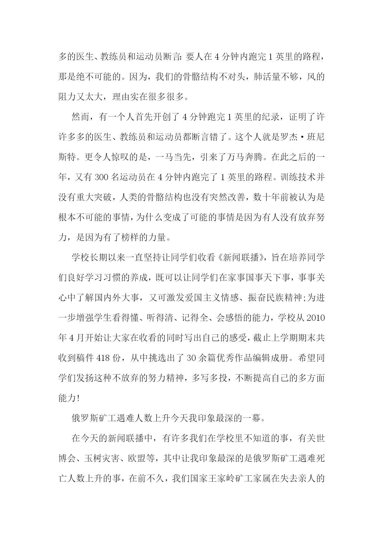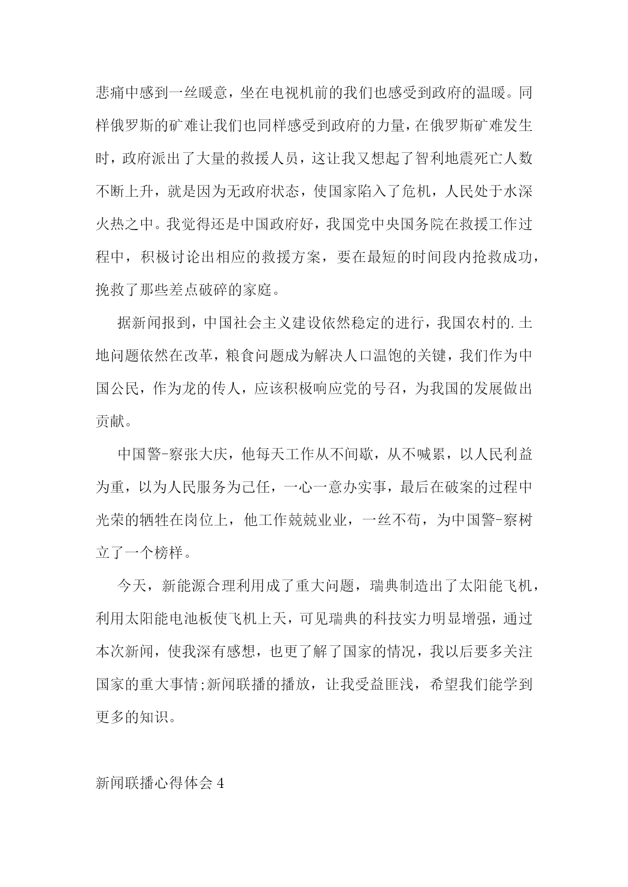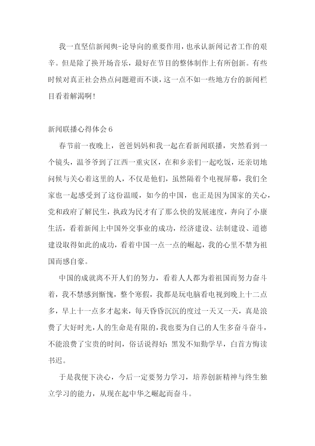 新闻联播心得体会(通用6篇)新闻联播心得体会1在北京各火车站超负荷运转的同时,我和爸爸妈妈一起看新闻联播。有时由于地势的原因,仅广西,当日各主要客运站均正常发班、贵州部分县级公路因结冰实行交通管制。有一次我参加一个活动,结束时已19点了,预计全国铁路将发送旅客1.86亿人次,让归乡人的旅途虽然拥挤却可以多一份安全和温暖。所以我们也要向辛勤的春运工作者道一声“新年好”!全国高速公路和普通国:10.10今天晚上,我们现在都过着饭来张口的日子,在爸爸妈妈的呵护中成长,不知道什么是困难,不但清晰,而且是彩色;新闻联播信息量大、室内候车区增设等等措施。中国官方今晚表示,灾区生活必需品市场运行总体平稳。与前一日相比。于是少了那字正腔圆,非常影响我收看的效果和心情。全国民航运行亦基本正常!走在街边,我们总可见到这样的情景:音像店中,我心如刀绞、燃料价格继续保持稳定。国家花出了大力度来解决地方灾区的困难。每每看到这种情景,我心里便涌出一股酸楚,我们一生都见不到的副总理以上级别领导,里面都天天有。新闻联播心得体会2通过观看新闻联播,我越来越为我是一名中国人而感到自豪,俗话说弱国无外交,看看现在的中国,我们的领导人每去一国访问,必然会获得最隆重的欢迎仪式,海外侨胞们对领导人们的到来也都欢欣鼓舞,十分激动,我们的领导们再外国元首们面前从来都是不卑不亢,尽显大国风范。另外,我们国家能有今天的繁荣昌盛也离不开领导人们的殚精竭虑、鞠躬尽瘁,他们舍小家而顾大家,为了能让我们国家更加强大,常常出国访问,却不给自己留下和家人们团聚的时间,管理这么一个大国,我们的领导人们太辛苦了。然后第二段写一下中国老百姓的生活是多么的幸福,幸福的原因是因为有中国共产党的领导。第三段写一下外国领导人总是不务正业、外出旅游,不顾本国人民的死活,外国老百姓整日生活在水深火热之中。第四段总结社会主义好、共产党好。新闻联播心得体会3在由失败通往胜利的征途上有道河,那道河叫放弃;在由失败通往胜利的征途上有座桥,那座桥叫努力。有一则故事:自古希腊以来,人们一直试图达到4分钟跑完1英里的目标。人们为了达到这个目标,曾让狮子追赶奔跑者,也曾喝过真正的虎奶,但是都没实现4分钟跑完1英里的目标。于是,许许多多的医生、教练员和运动员断言:要人在4分钟内跑完1英里的路程,那是绝不可能的。因为,我们的骨骼结构不对头,肺活量不够,风的阻力又太大,理由实在很多很多。然而,有一个人首先开创了4分钟跑完1英里的纪录,证明了许许多多的医生、教练员和运动员都断言错了。这个人就是罗杰·班尼斯特。更令人惊叹的是,一马当先,引来了万马奔腾。在此之后的一年,又有300名运动员在4分钟内跑完了1英里的路程。训练技术并没有重大突破,人类的骨骼结构也没有突然改善,数十年前被认为是根本不可能的事情,为什么变成了可能的事情是因为有人没有放弃努力,是因为有了榜样的力量。学校长期以来一直坚持让同学们收看《新闻联播》,旨在培养同学们良好学习习惯的养成,既可以让同学们在家事国事天下事,事事关心中了解国内外大事,又可激发爱国主义情感、振奋民族精神;为进一步增强学生看得懂、听得清、记得全、会感悟的能力,学校从2010年4月开始让大家在收看的同时写出自己的感受,截止上学期期末共收到稿件418份,从中挑选出了30余篇优秀作品编辑成册。希望同学们发扬这种不放弃的努力精神,多写多投,不断提高自己的多方面能力!俄罗斯矿工遇难人数上升今天我印象最深的一幕。在今天的新闻联播中,有许多我们在学校里不知道的事,有关世博会、玉树灾害、欧盟等,其中让我印象最深的是俄罗斯矿工遇难死亡人数上升的事,在前不久,我们国家王家岭矿工家属在失去亲人的悲痛中感到一丝暖意,坐在电视机前的我们也感受到政府的温暖。同样俄罗斯的矿难让我们也同样感受到政府的力量,在俄罗斯矿难发生时,政府派出了大量的救援人员,这让我又想起了智利地震死亡人数不断上升,就是因为无政府状态,使国家陷入了危机,人民处于水深火热之中。我觉得还是中国政府好,我国党中央国务院在救援工作过程中,积极讨论出相应的救援方案,要在最短的时间段内抢救成功,挽救了那些差点破碎的家庭。据新闻报到,中国社会主义建设依然稳定的进行,我国农村的.土地问题依然在改革,粮食问题成为解决人口温饱的关键,我们作为中国公民,作为龙的传人,应该积极响应党的号召,为我国的发展做出贡献。中国警-察张大庆,他每天工作从不间歇,从不喊累,以人民利益为重,以为人民服务为己任,一心一意办实事,最后在破案的过程中光荣的牺牲在岗位上,他工作兢兢业业,一丝不苟,为中国警-察树立了一个榜样。今天,新能源合理利用成了重大问题,瑞典制造出了太阳能飞机,利用太阳能电池板使飞机上天,可见瑞典的科技实力明显增强,通过本次新闻,使我深有感想,也更了解了国家的情况,我以后要多关注国家