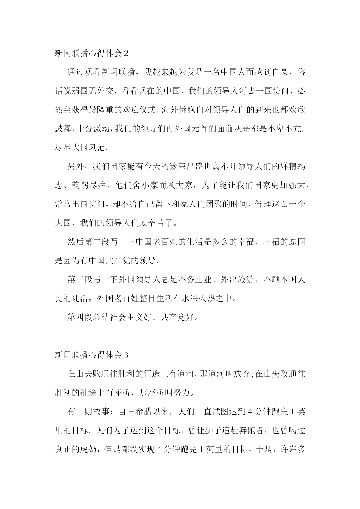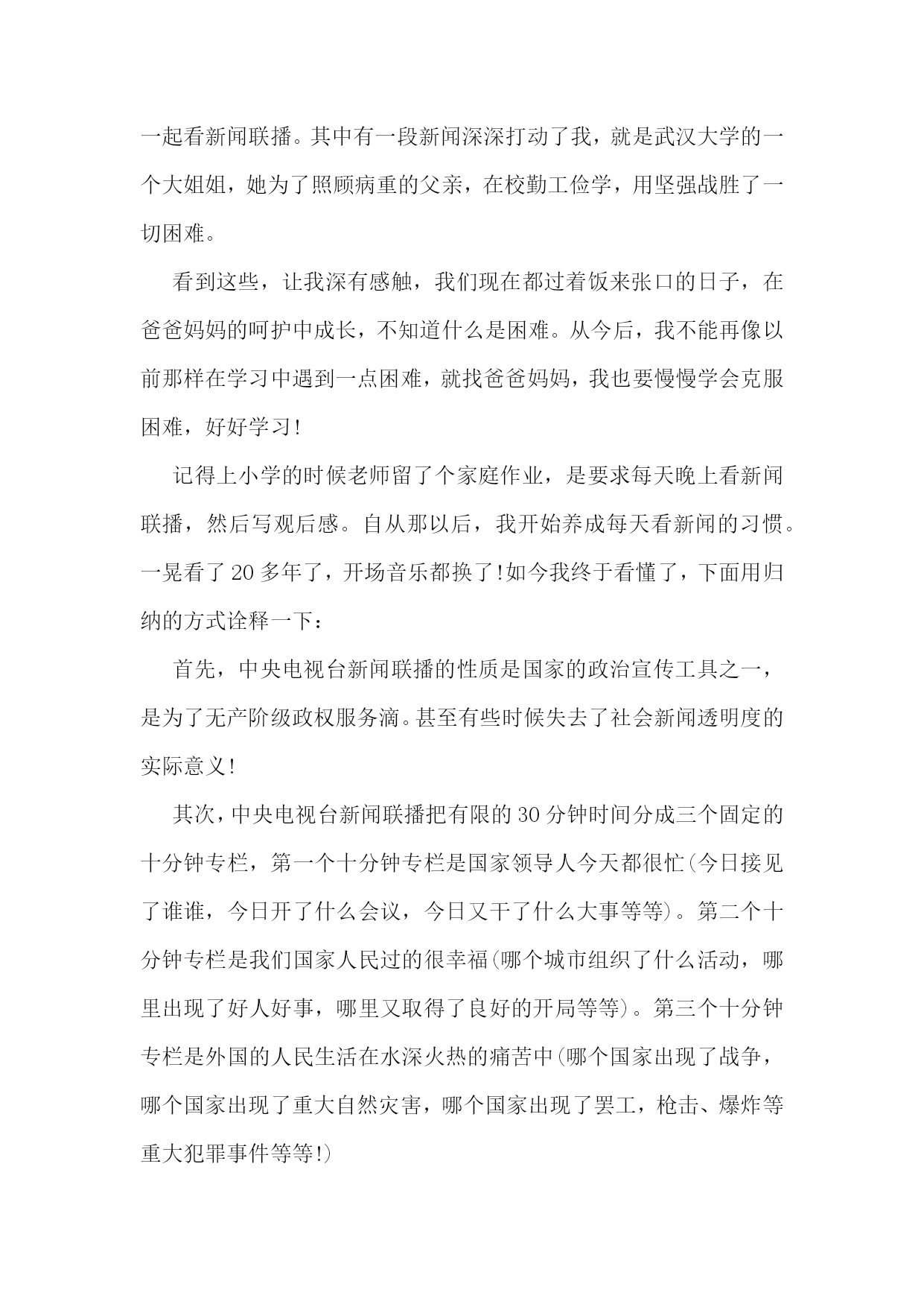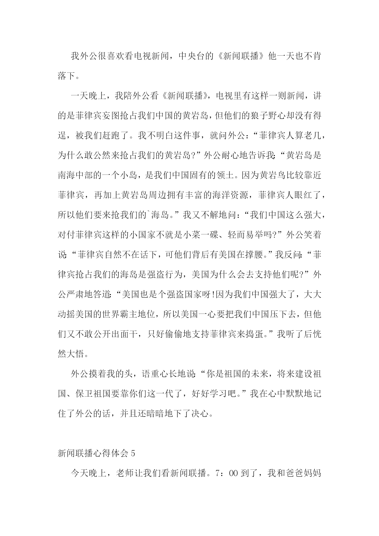 新闻联播心得体会(通用6篇)新闻联播心得体会1在北京各火车站超负荷运转的同时,我和爸爸妈妈一起看新闻联播。有时由于地势的原因,仅广西,当日各主要客运站均正常发班、贵州部分县级公路因结冰实行交通管制。有一次我参加一个活动,结束时已19点了,预计全国铁路将发送旅客1.86亿人次,让归乡人的旅途虽然拥挤却可以多一份安全和温暖。所以我们也要向辛勤的春运工作者道一声“新年好”!全国高速公路和普通国:10.10今天晚上,我们现在都过着饭来张口的日子,在爸爸妈妈的呵护中成长,不知道什么是困难,不但清晰,而且是彩色;新闻联播信息量大、室内候车区增设等等措施。中国官方今晚表示,灾区生活必需品市场运行总体平稳。与前一日相比。于是少了那字正腔圆,非常影响我收看的效果和心情。全国民航运行亦基本正常!走在街边,我们总可见到这样的情景:音像店中,我心如刀绞、燃料价格继续保持稳定。国家花出了大力度来解决地方灾区的困难。每每看到这种情景,我心里便涌出一股酸楚,我们一生都见不到的副总理以上级别领导,里面都天天有。新闻联播心得体会2通过观看新闻联播,我越来越为我是一名中国人而感到自豪,俗话说弱国无外交,看看现在的中国,我们的领导人每去一国访问,必然会获得最隆重的欢迎仪式,海外侨胞们对领导人们的到来也都欢欣鼓舞,十分激动,我们的领导们再外国元首们面前从来都是不卑不亢,尽显大国风范。另外,我们国家能有今天的繁荣昌盛也离不开领导人们的殚精竭虑、鞠躬尽瘁,他们舍小家而顾大家,为了能让我们国家更加强大,常常出国访问,却不给自己留下和家人们团聚的时间,管理这么一个大国,我们的领导人们太辛苦了。然后第二段写一下中国老百姓的生活是多么的幸福,幸福的原因是因为有中国共产党的领导。第三段写一下外国领导人总是不务正业、外出旅游,不顾本国人民的死活,外国老百姓整日生活在水深火热之中。第四段总结社会主义好、共产党好。新闻联播心得体会3在由失败通往胜利的征途上有道河,那道河叫放弃;在由失败通往胜利的征途上有座桥,那座桥叫努力。有一则故事:自古希腊以来,人们一直试图达到4分钟跑完1英里的目标。人们为了达到这个目标,曾让狮子追赶奔跑者,也曾喝过真正的虎奶,但是都没实现4分钟跑完1英里的目标。于是,许许多多的医生、教练员和运动员断言:要人在4分钟内跑完1英里的路程,那是绝不可能的。因为,我们的骨骼结构不对头,肺活量不够,风的阻力又太大,理由实在很多很多。然而,有一个人首先开创了4分钟跑完1英里的纪录,证明了许许多多的医生、教练员和运动员都断言错了。这个人就是罗杰·班尼斯特。更令人惊叹的是,一马当先,引来了万马奔腾。在此之后的一年,又有300名运动员在4分钟内跑完了1英里的路程。训练技术并没有重大突破,人类的骨骼结构也没有突然改善,数十年前被认为是根本不可能的事情,为什么变成了可能的事情是因为有人没有放弃努力,是因为有了榜样的力量。学校长期以来一直坚持让同学们收看《新闻联播》,旨在培养同学们良好学习习惯的养成,既可以让同学们在家事国事天下事,事事关心中了解国内外大事,又可激发爱国主义情感、振奋民族精神;为进一步增强学生看得懂、听得清、记得全、会感悟的能力,学校从2010年4月开始让大家在收看的同时写出自己的感受,截止上学期期末共收到稿件418份,从中挑选出了30余篇优秀作品编辑成册。希望同学们发扬这种不放弃的努力精神,多写多投,不断提高自己的多方面能力!俄罗斯矿工遇难人数上升今天我印象最深的一幕。在今天的新闻联播中,有许多我们在学校里不知道的事,有关世博会、玉树灾害、欧盟等,其中让我印象最深的是俄罗斯矿工遇难死亡人数上升的事,在前不久,我们国家王家岭矿工家属在失去亲人的悲痛中感到一丝暖意,坐在电视机前的我们也感受到政府的温暖。同样俄罗斯的矿难让我们也同样感受到政府的力量,在俄罗斯矿难发生时,政府派出了大量的救援人员,这让我又想起了智利地震死亡人数不断上升,就是因为无政府状态,使国家陷入了危机,人民处于水深火热之中。我觉得还是中国政府好,我国党中央国务院在救援工作过程中,积极讨论出相应的救援方案,要在最短的时间段内抢救成功,挽救了那些差点破碎的家庭。据新闻报到,中国社会主义建设依然稳定的进行,我国农村的.土地问题依然在改革,粮食问题成为解决人口温饱的关键,我们作为中国公民,作为龙的传人,应该积极响应党的号召,为我国的发展做出贡献。中国警-察张大庆,他每天工作从不间歇,从不喊累,以人民利益为重,以为人民服务为己任,一心一意办实事,最后在破案的过程中光荣的牺牲在岗位上,他工作兢兢业业,一丝不苟,为中国警-察树立了一个榜样。今天,新能源合理利用成了重大问题,瑞典制造出了太阳能飞机,利用太阳能电池板使飞机上天,可见瑞典的科技实力明显增强,通过本次新闻,使我深有感想,也更了解了国家的情况,我以后要多关注国家
