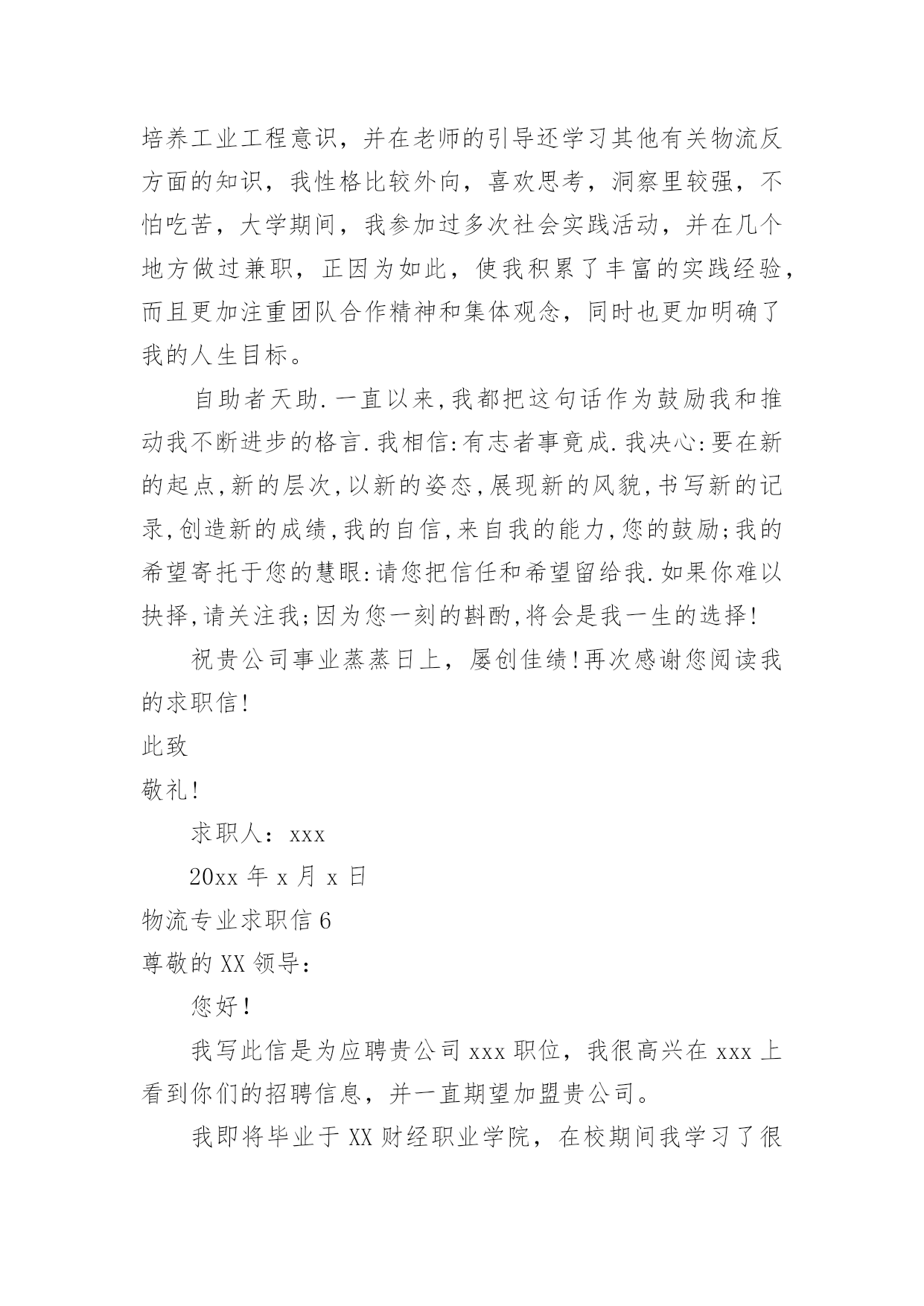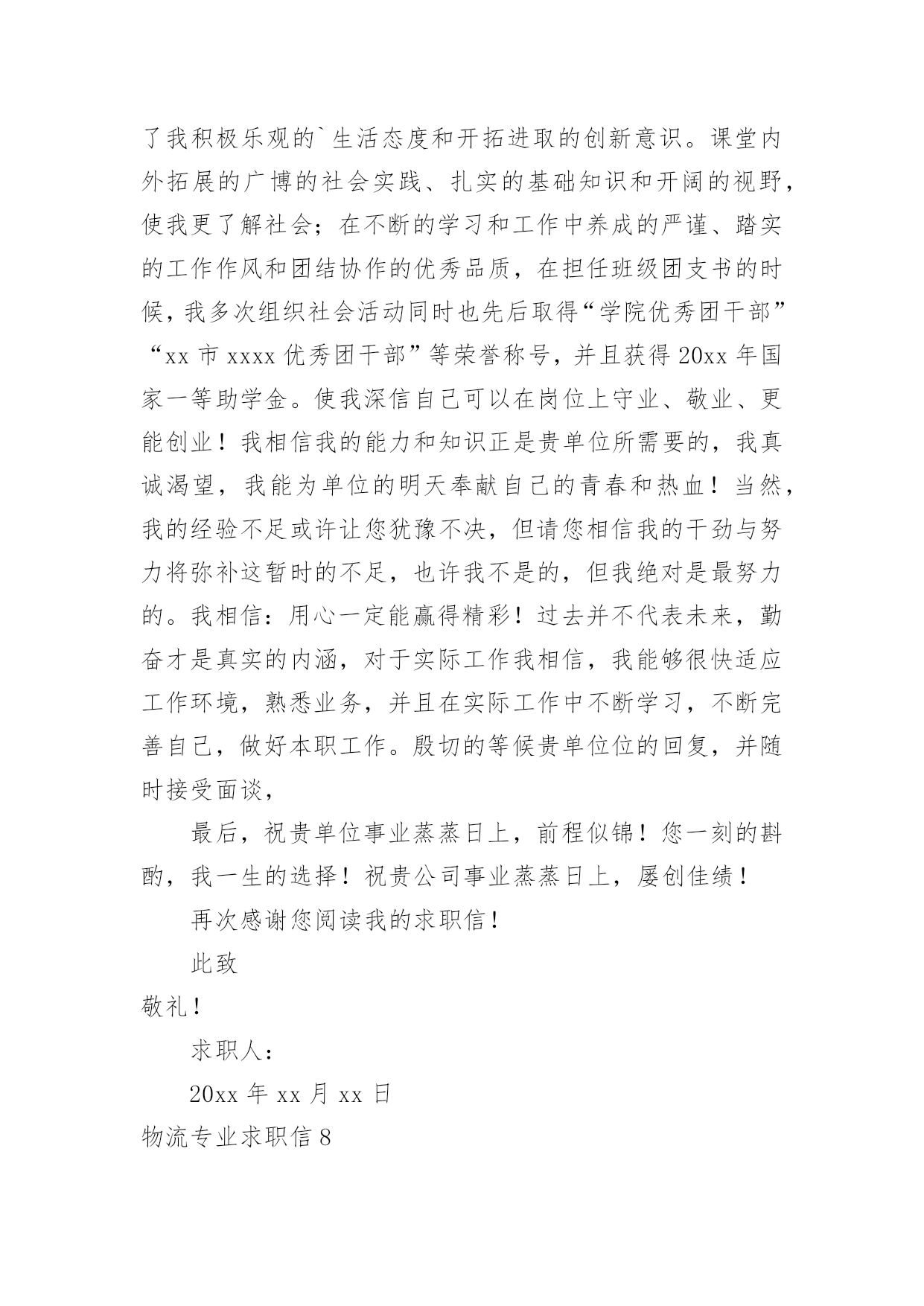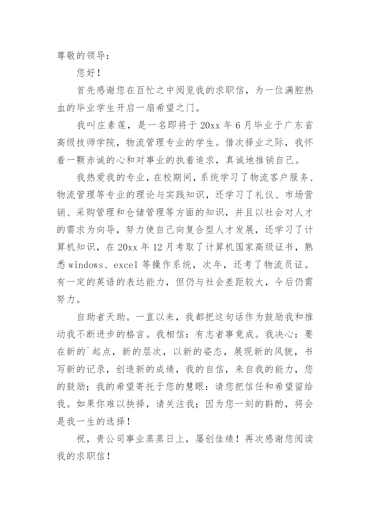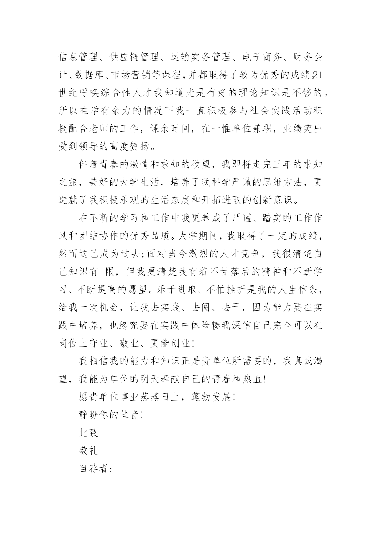 物流专业求职信物流专业求职信(15篇)时间过得飞快,新一轮的招聘又朝我们走来,现在这个时候,写好一封求职信就十分有必要了!相信很多人都十分头疼怎么写一封精彩的求职信吧,以下是小编为大家收集的物流专业求职信,欢迎大家借鉴与参考,希望对大家有所帮助。物流专业求职信1尊敬的领导:您好!首先感谢您在百忙之中抽出宝贵的时间阅读我的自荐信!为一位满腔热情的大学生开启了一扇希望之门。我是xx财经职业学院物流管理专业20xx年毕业生,非常荣幸能加入到贵单位的招聘行列中,我真诚希望能加入贵单位,为贵单位的发展献上一份锦薄之力!伴着青春的激情和求知的欲望,我已走完三年的求知之旅,美好的大学生活,培养了我科学严谨的思维方法,更造就了我积极乐观的生活态度和开拓进取的创新意识.课堂内外拓展的广博的社会实践、扎实的基础知识和开阔的视野,使我更了解社会;在不断的学习和工作中养成的严谨、踏实的工作作风和团结协作的优秀品质,使我深信自己完全可以在岗位上守业、敬业、更能创业!我相信我的'能力和知识正是贵单位所需要的,我真诚渴望,我能为单位的明天奉献自己的青春和热血!学习和生活中的种种困难磨练了我吃苦耐劳和艰苦奋斗的良好品质,也使我积累了许多的经验,无论遇到什么困难,我总会以乐观的精神去面笑。殷切的等候贵单位位的回复,并随时接受面谈,最后,祝贵单位事业蒸蒸日上,前程似锦!此致敬礼!自荐者:20xx年x月x日物流专业求职信2尊敬的领导:你好!非常感谢你能在百忙之中抽出时间审阅我的自荐书!我是兰州外语职业学院物流管理的学生,将在xx年6月毕业。在即将踏上征程之际,在此呈上自己的求职信息,特毛遂自荐,愿意接受贵公司的考核与挑选。我通过各种渠道大致了解了贵公司的情况,知道贵公司是个很有发展前途的具有现代潮流的公司,具有很大的活力,而我也非常希望能加入这样的企业,尽自己最大努力为公司的发展奉献自己的微薄之力。同时能对自己的'发展起到积极的作用,希望能在贵公司的帮助下、在贵公司大发展的环境下促进自己的发展。现谨向你作一下自我推荐:在大学生活中,我很好的掌握了专业知识,主修了物流概论、企业物流管理、仓储与配送管理、物流经济学、物流信息管理、供应链管理、运输实务管理、电子商务、财务会计、数据库、市场营销等课程,并都取得了较为优秀的成绩。21世纪呼唤综合性人才我知道光是有好的理论知识是不够的。所以在学有余力的情况下我一直积极参与社会实践活动积极配合老师的工作,课余时间,在一惟单位兼职,业绩突出受到领导的高度赞扬。伴着青春的激情和求知的欲望,我即将走完三年的求知之旅,美好的大学生活,培养了我科学严谨的思维方法,更造就了我积极乐观的生活态度和开拓进取的创新意识。在不断的学习和工作中我更养成了严谨、踏实的工作作风和团结协作的优秀品质。大学期间,我取得了一定的成绩,然而这已成为过去;面对当今激烈的人才竞争,我很清楚自己知识有限,但我更清楚我有着不甘落后的精神和不断学习、不断提高的愿望。乐于进取、不怕挫折是我的人生信条,给我一次机会,让我去实践、去闯、去干,因为能力要在实践中培养,也终究要在实践中体险辏我深信自己完全可以在岗位上守业、敬业、更能创业!我相信我的能力和知识正是贵单位所需要的,我真诚渴望,我能为单位的明天奉献自己的青春和热血!愿贵单位事业蒸蒸日上,蓬勃发展!静盼你的佳音!此致敬礼自荐者:20xx年x月x日物流专业求职信3尊敬的领导:您好!我写此信是为应聘贵公司XXX职位,我很高兴在XXX上看到你们的招聘信息,并一直期望加盟贵公司。我即将毕业于XX职业学院,在校期间我学习了很多知识,如报关实务,国际贸易,供应链管理,国际物流,国际货运代理,企业战略管理仓储与配送管理,物流信息管理,采购管理,财务管理,生产与运作管理,企业管理(物流)组织行为学,市场营销,经济学原理物,流学概论,统计学原理,会计学原理,管理学原理等课程。还参加了学校组织的`第三方物流实训,物流流程实训,物流实务实训,仓储业务实训,网上模拟综合实训等实训操作课,本人具备一定的管理和策划能力,熟悉各种办公软件的操作。个人简历和其他材料,希望能成为贵公司的有力竞争者,并希望收到面试通知,电话:XXXXXX。感谢您阅读此信并考虑我的应聘要求!此致敬礼!求职人:XXXX年XX月XX日物流专业求职信4尊敬的****餐饮集团中国事业部:您好!首先感谢您在百忙之中抽出宝贵的时间来审阅我的求职信,您辛苦了!我叫xxx,男,1997年生,漳州人,就读于xxx职专二年级物流专业。目前已获得物流员证、采购员证、单证员证。在校期间还曾多次获得三好学生、优秀班干部等荣誉。现郑重呈上我的求职信,希望能在贵公司谋求一份相关的工作。在校近两年的学习生活中,我各门功课成绩优秀,专业基础知识扎实。在班上还担任纪律委员、班主任助理两个职位。并积极参加班