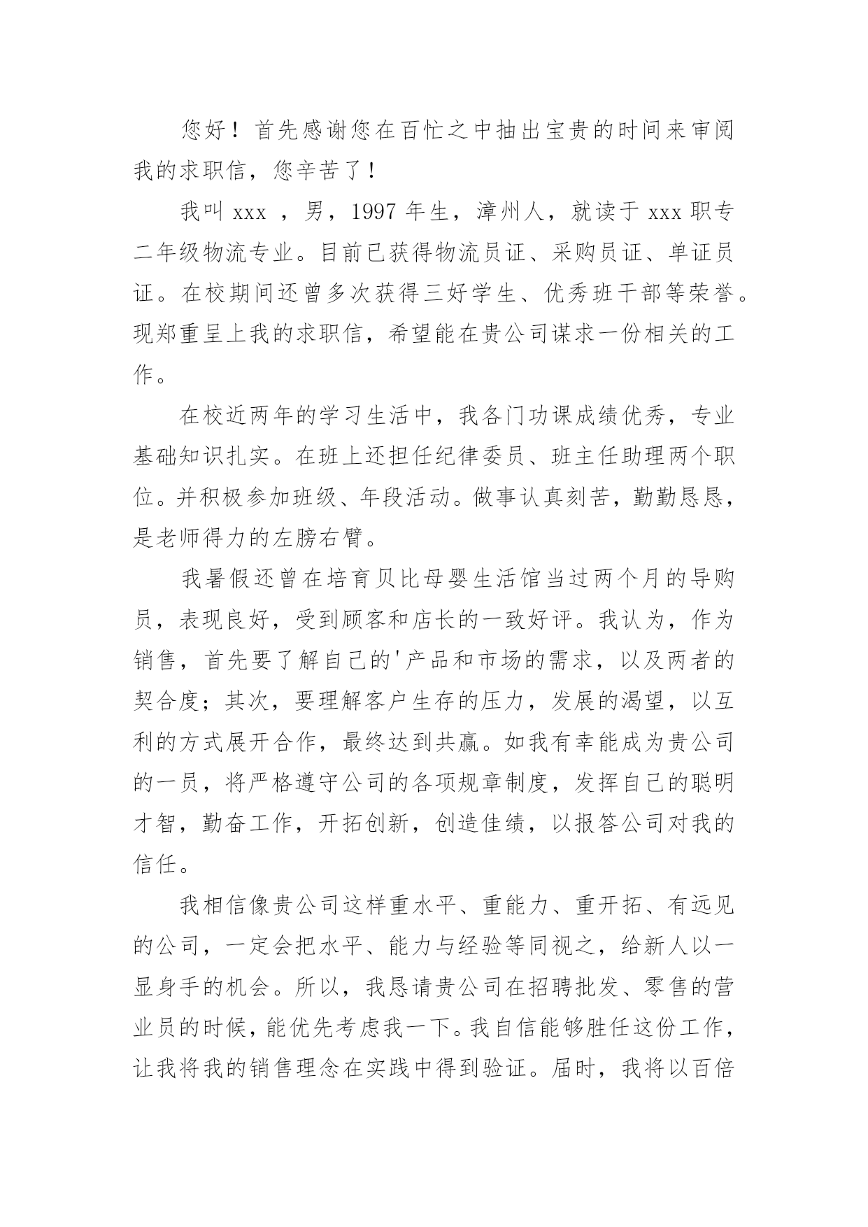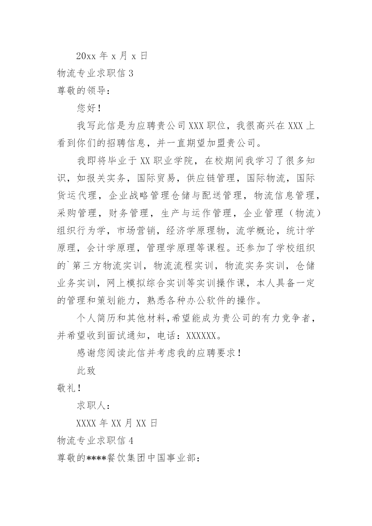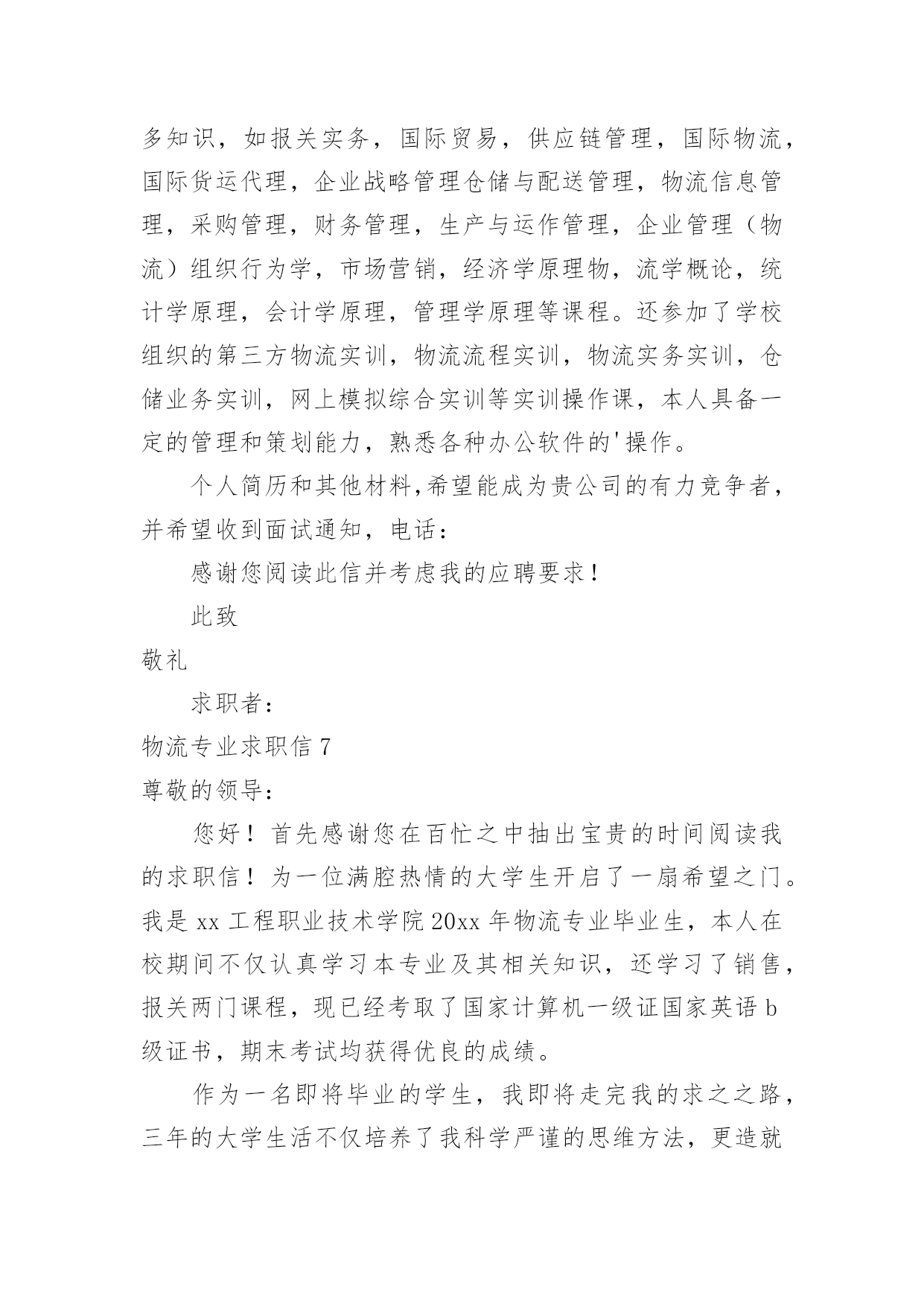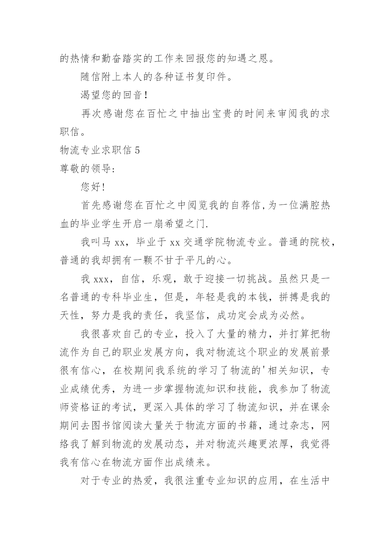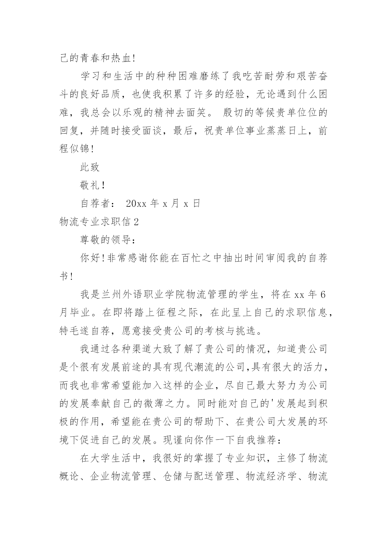物流专业求职信物流专业求职信(15篇)时间过得飞快,新一轮的招聘又朝我们走来,现在这个时候,写好一封求职信就十分有必要了!相信很多人都十分头疼怎么写一封精彩的求职信吧,以下是小编为大家收集的物流专业求职信,欢迎大家借鉴与参考,希望对大家有所帮助。物流专业求职信1尊敬的领导:您好!首先感谢您在百忙之中抽出宝贵的时间阅读我的自荐信!为一位满腔热情的大学生开启了一扇希望之门。我是xx财经职业学院物流管理专业20xx年毕业生,非常荣幸能加入到贵单位的招聘行列中,我真诚希望能加入贵单位,为贵单位的发展献上一份锦薄之力!伴着青春的激情和求知的欲望,我已走完三年的求知之旅,美好的大学生活,培养了我科学严谨的思维方法,更造就了我积极乐观的生活态度和开拓进取的创新意识.课堂内外拓展的广博的社会实践、扎实的基础知识和开阔的视野,使我更了解社会;在不断的学习和工作中养成的严谨、踏实的工作作风和团结协作的优秀品质,使我深信自己完全可以在岗位上守业、敬业、更能创业!我相信我的'能力和知识正是贵单位所需要的,我真诚渴望,我能为单位的明天奉献自己的青春和热血!学习和生活中的种种困难磨练了我吃苦耐劳和艰苦奋斗的良好品质,也使我积累了许多的经验,无论遇到什么困难,我总会以乐观的精神去面笑。殷切的等候贵单位位的回复,并随时接受面谈,最后,祝贵单位事业蒸蒸日上,前程似锦!此致敬礼!自荐者:20xx年x月x日物流专业求职信2尊敬的领导:你好!非常感谢你能在百忙之中抽出时间审阅我的自荐书!我是兰州外语职业学院物流管理的学生,将在xx年6月毕业。在即将踏上征程之际,在此呈上自己的求职信息,特毛遂自荐,愿意接受贵公司的考核与挑选。我通过各种渠道大致了解了贵公司的情况,知道贵公司是个很有发展前途的具有现代潮流的公司,具有很大的活力,而我也非常希望能加入这样的企业,尽自己最大努力为公司的发展奉献自己的微薄之力。同时能对自己的'发展起到积极的作用,希望能在贵公司的帮助下、在贵公司大发展的环境下促进自己的发展。现谨向你作一下自我推荐:在大学生活中,我很好的掌握了专业知识,主修了物流概论、企业物流管理、仓储与配送管理、物流经济学、物流信息管理、供应链管理、运输实务管理、电子商务、财务会计、数据库、市场营销等课程,并都取得了较为优秀的成绩。21世纪呼唤综合性人才我知道光是有好的理论知识是不够的。所以在学有余力的情况下我一直积极参与社会实践活动积极配合老师的工作,课余时间,在一惟单位兼职,业绩突出受到领导的高度赞扬。伴着青春的激情和求知的欲望,我即将走完三年的求知之旅,美好的大学生活,培养了我科学严谨的思维方法,更造就了我积极乐观的生活态度和开拓进取的创新意识。在不断的学习和工作中我更养成了严谨、踏实的工作作风和团结协作的优秀品质。大学期间,我取得了一定的成绩,然而这已成为过去;面对当今激烈的人才竞争,我很清楚自己知识有限,但我更清楚我有着不甘落后的精神和不断学习、不断提高的愿望。乐于进取、不怕挫折是我的人生信条,给我一次机会,让我去实践、去闯、去干,因为能力要在实践中培养,也终究要在实践中体险辏我深信自己完全可以在岗位上守业、敬业、更能创业!我相信我的能力和知识正是贵单位所需要的,我真诚渴望,我能为单位的明天奉献自己的青春和热血!愿贵单位事业蒸蒸日上,蓬勃发展!静盼你的佳音!此致敬礼自荐者:20xx年x月x日物流专业求职信3尊敬的领导:您好!我写此信是为应聘贵公司XXX职位,我很高兴在XXX上看到你们的招聘信息,并一直期望加盟贵公司。我即将毕业于XX职业学院,在校期间我学习了很多知识,如报关实务,国际贸易,供应链管理,国际物流,国际货运代理,企业战略管理仓储与配送管理,物流信息管理,采购管理,财务管理,生产与运作管理,企业管理(物流)组织行为学,市场营销,经济学原理物,流学概论,统计学原理,会计学原理,管理学原理等课程。还参加了学校组织的`第三方物流实训,物流流程实训,物流实务实训,仓储业务实训,网上模拟综合实训等实训操作课,本人具备一定的管理和策划能力,熟悉各种办公软件的操作。个人简历和其他材料,希望能成为贵公司的有力竞争者,并希望收到面试通知,电话:XXXXXX。感谢您阅读此信并考虑我的应聘要求!此致敬礼!求职人:XXXX年XX月XX日物流专业求职信4尊敬的****餐饮集团中国事业部:您好!首先感谢您在百忙之中抽出宝贵的时间来审阅我的求职信,您辛苦了!我叫xxx,男,1997年生,漳州人,就读于xxx职专二年级物流专业。目前已获得物流员证、采购员证、单证员证。在校期间还曾多次获得三好学生、优秀班干部等荣誉。现郑重呈上我的求职信,希望能在贵公司谋求一份相关的工作。在校近两年的学习生活中,我各门功课成绩优秀,专业基础知识扎实。在班上还担任纪律委员、班主任助理两个职位。并积极参加班