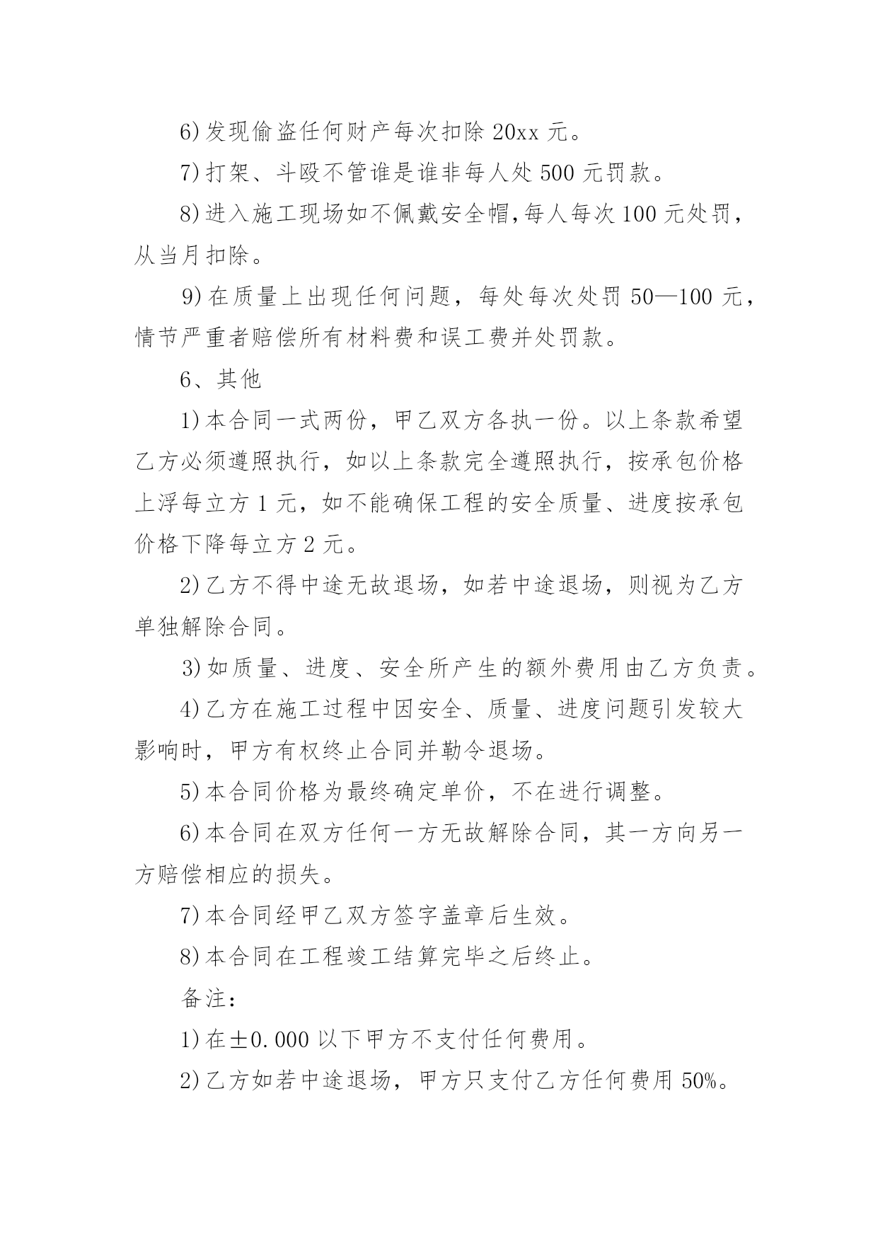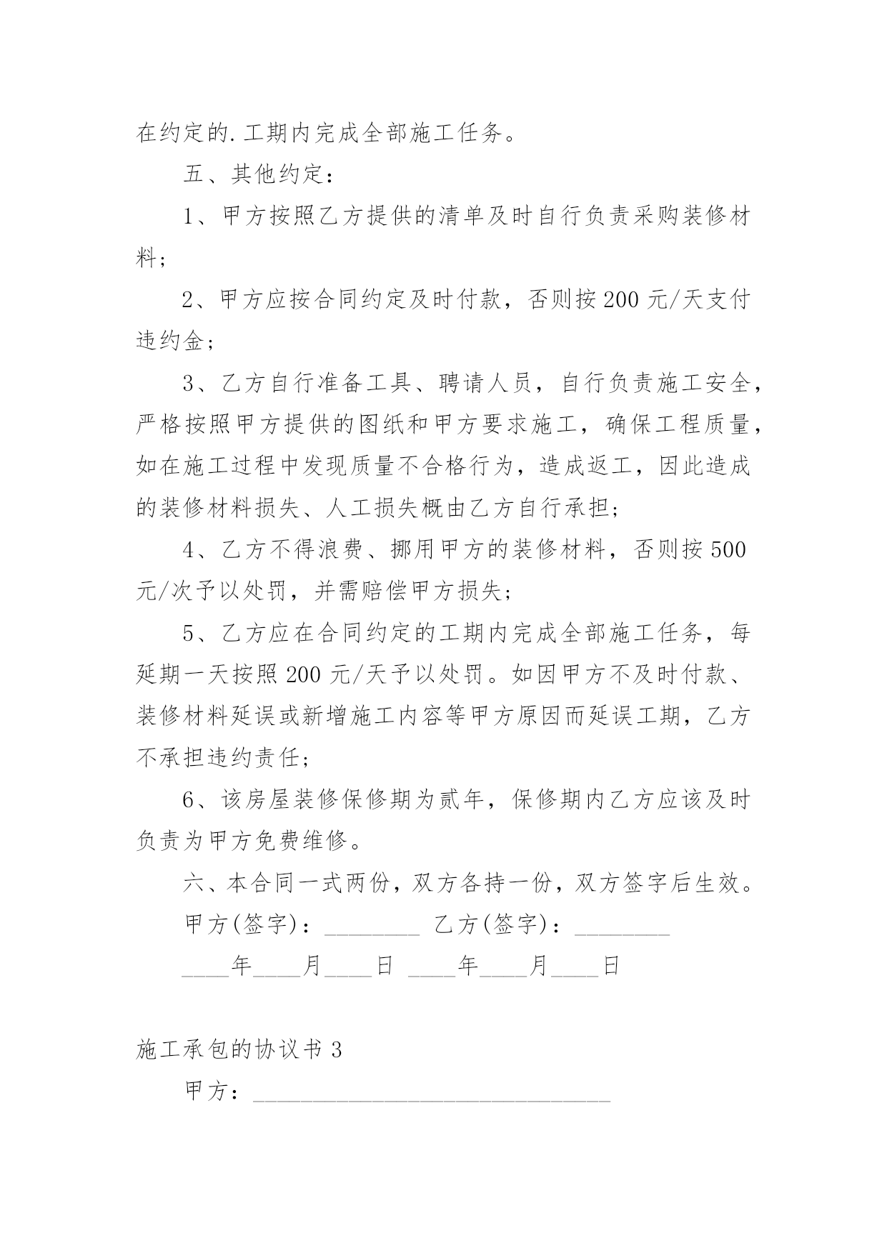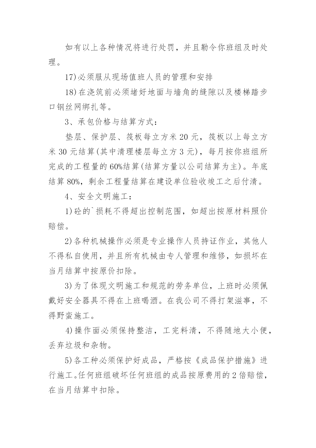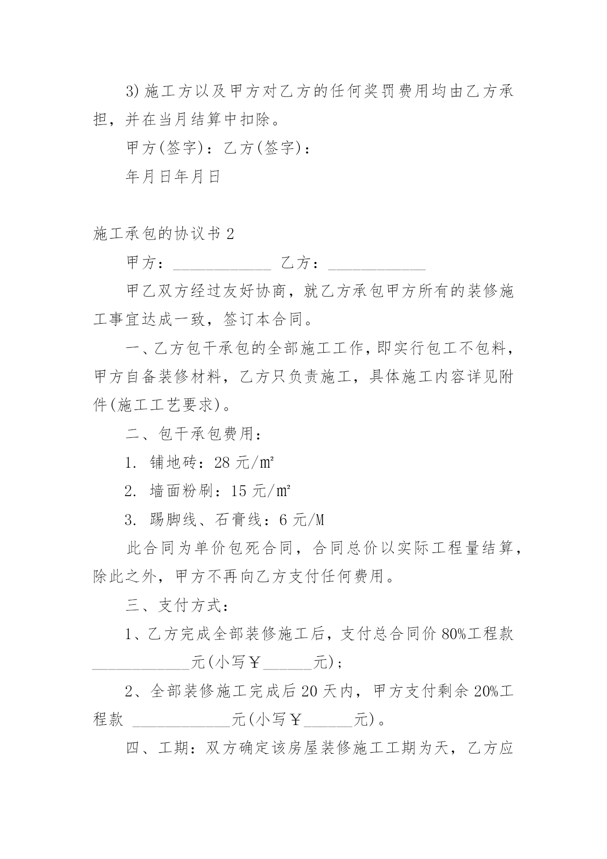 施工承包的协议书在学习、工作生活中,协议使用的情况越来越多,协议能够成为双方当事人的合法依据。那么相关的协议到底怎么写呢?下面是小编精心整理的施工承包的协议书,欢迎大家分享。施工承包的协议书1甲方(发包人):乙方(承包人):根据《中华人民共和国合同法》、《建筑法》等相关规定,经甲乙双方协商甲方将工程项目劳务承包给乙方,由乙方组织安排劳务和劳动力并具体施工,甲乙双方本着平等自愿、互利互惠、奖罚分明的原则,特签署本合同,双方共同遵照执行。第一条、项目名称、地址:第二条、承包方式:施工劳务人员大包干,部分小材料与机械。第三条、承包内容及范围:第四条、工期及甲方要求第五条、承包价格及结算方式第六条、安全文明施工要求第七条、奖罚专用条款第八条、其他未尽事宜具体内容:1、砼班组承包方式及内容:1)施工图纸(己方复印)2)结构上所有砼浇筑,包括:塔吊基础、井桩、垫层、保护层、筏板、±0.000以上和楼层墙板浇砼,屋面浇砼和二次结构浇砼等所有砼浇筑。3)现场照明甲方提供镝灯一个,其余材料及照明器具(抹子灰板、振动板、振动机、震动棒、铁锹、灰盘、对讲机、雨鞋、雨衣、塑料手套等一切小型工具和用具由乙方负责)。2、工期及甲方要求:1)乙方进场前,必须提交砼工程专项施工方案,该方案经甲方同意后,乙方必须按照方案配备人力并进行施工。2)乙方根据甲方下达的进度计划按周向项目部提交各工种用工计划和劳动力安排计划,经项目部同意或批准后,乙方不得任意变动和调整。3)在砼浇筑过程中,井桩振捣必须密实,不得出现坍落现象。桩口必须用木抹压平,井桩顶面平整、整洁、及时浇水养护。在测试试验时做好动测准备,必须振捣合格。4)在垫层浇筑砼时必须压光,按标高不得超出±0.5mm并及时养护。如多打灰或少打灰影响质量和浪费材料由你承包班组负责。5)在保护层浇筑时不得将砂浆打入井桩内,如打入井桩应及时清理干净。以免造成断桩影响质量,不得破坏防水,必须压光表面,并保持在放线前清洁。6)在浇筑剪力墙时振捣必须密实,不得出现蜂窝麻面和气泡,并且振捣时配合专业振捣工和找平抹灰工。如出现麻面应及时派人修补并且保证砼的观感。7)在平板振动时必须使用平板振捣器,尤其楼层面上反部分必须振捣密实,不得有漏筋现象。8)在振捣时不得长时间振捣某一点,造成跑模、漏浆严重由你班组负完全责任。9)所有砼浇筑8小时后必须进行养护。10)在打灰前各班组清理好自己剩余材料后,楼层由你班组进行清扫。如果其他工种没有清理完成,你班组所产生的清理费用由其他班组负责,并当月补偿你班组。你班组并承担布料机以及泵管加固、安装、顶撑、清理、疏通、拆卸等一切工作以及工作的一切费用。11)在砼浇筑时,如出现机械异常,必须积极配合处理,并清理处理好余灰,不得随地乱扔。12)在砼浇筑完之后泵车下面和楼层的余灰必须清理干净。13)在洗泵管时的余水不得随地乱洒,每次浇完后,必须处理完余渣。14)在浇筑过程中不得随意损坏钢筋和模板。15)在模板拆除后及时清理楼层的加灰和落地灰,保持楼层内干净整洁。16)在浇筑砼过程中不得随意把砼撒落在外架和隔离层上。如有以上各种情况将进行处罚,并且勒令你班组及时处理。17)必须服从现场值班人员的管理和安排18)在浇筑前必须堵好地面与墙角的缝隙以及楼梯踏步口钢丝网绑扎等。3、承包价格与结算方式:垫层、保护层、筏板每立方米20元,筏板以上每立方米30元结算(其中清理楼层每立方3元),每月按你班组所完成的工程量的60%结算(结算方量以公司结算为主)。年底结算80%,剩余工程量结算在建设单位验收竣工之后付清。4、安全文明施工:1)砼的`损耗不得超出控制范围,如超出按原材料照价赔偿。2)各种机械操作必须是专业操作人员持证作业,其他人不得私自使用,并且所有机械由专人管理和维修,如损坏在当月结算中按原价扣除。3)为了体现文明施工和规范的劳务单位,上班时必须佩戴好安全器具不得在上班喝酒。在我公司不得打架滋事,不得野蛮施工。4)操作面必须保持整洁,工完料清,不得随地大小便,丢弃垃圾和杂物。5)各工种必须保护好成品,严格按《成品保护措施》进行施工。任何班组破坏任何班组的成品按原费用的2倍赔偿,在当月结算中扣除。6)各种机械必须在保证安全的情况下进行操作,如果出现任何机械事故由乙方自行负责。7)邻舍不得私自乱拉乱接电线和使用不合格的各种电器设备,如出现用电安全事故由乙方自行负责。8)现场所有的原材料和成品料必需按指定的地方堆放整齐,如果文明施工达不到要求按你班组的所承包价下浮5%并处罚款。9)乙方进入施工现场后,应遵守甲方安全管理制度和分包队伍的管理办法,若乙方故意违反规定,除按规定处罚外情节严重者,将依法追究其法律责任。5、奖罚专用条款本着平等互利的原则,确保工程安全、质量、进度。1)在周计划未完成并无特殊原因,质量、进度滞