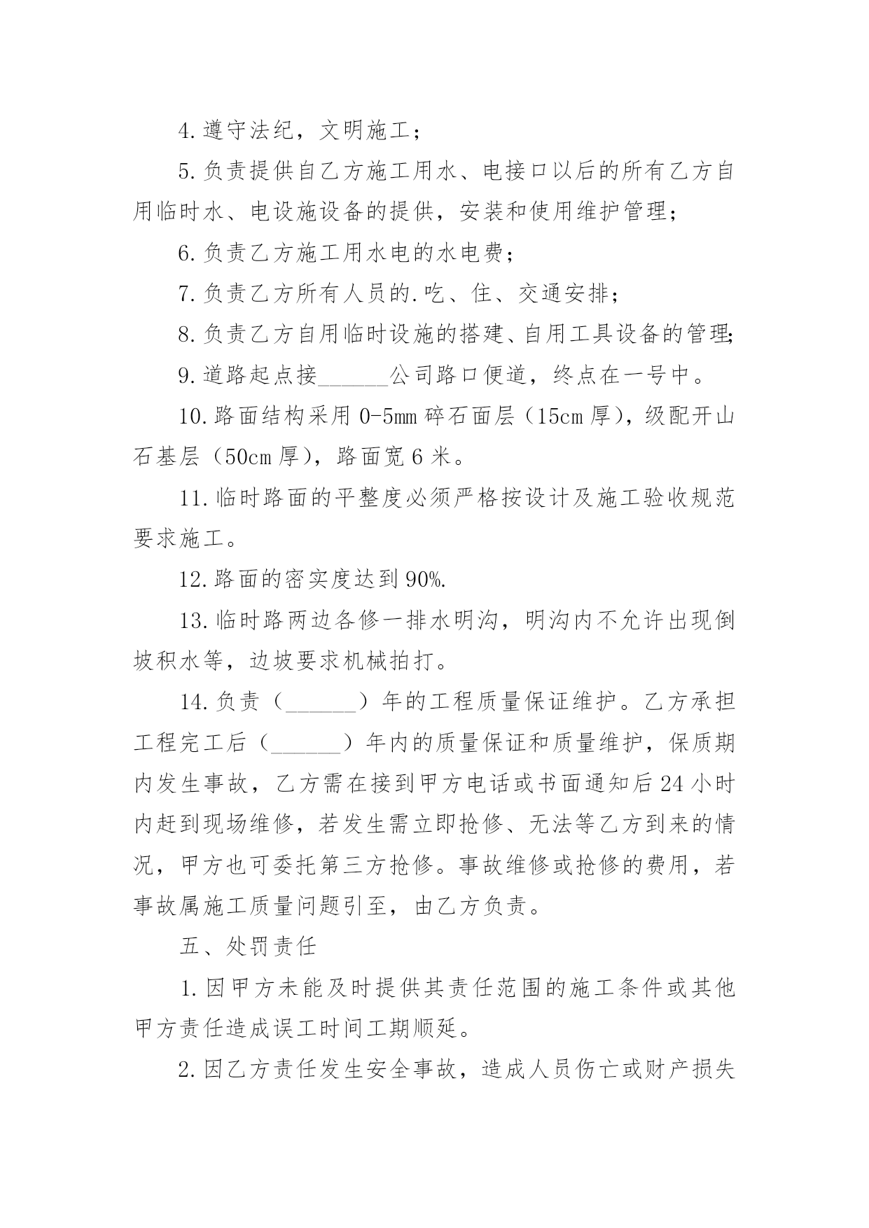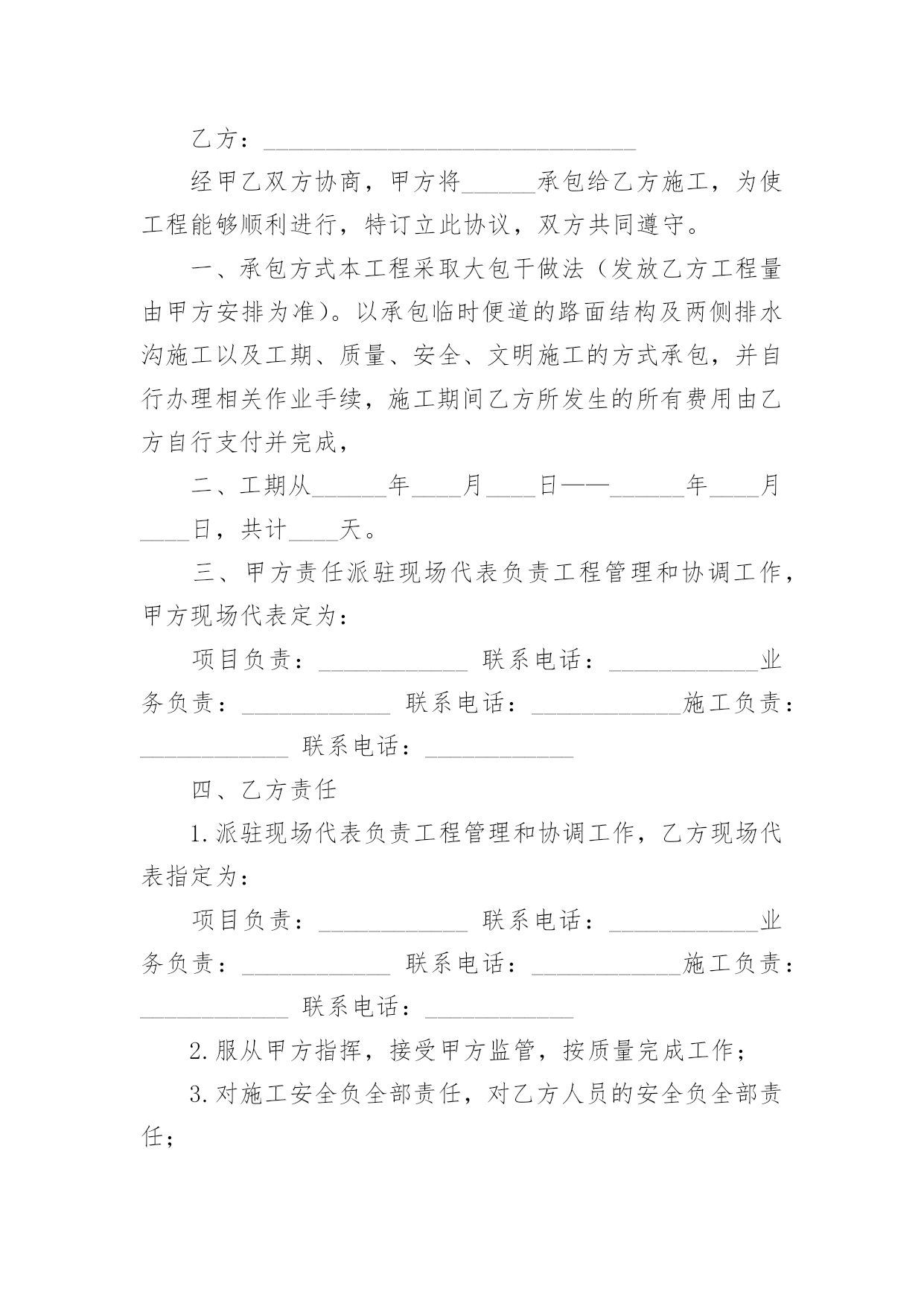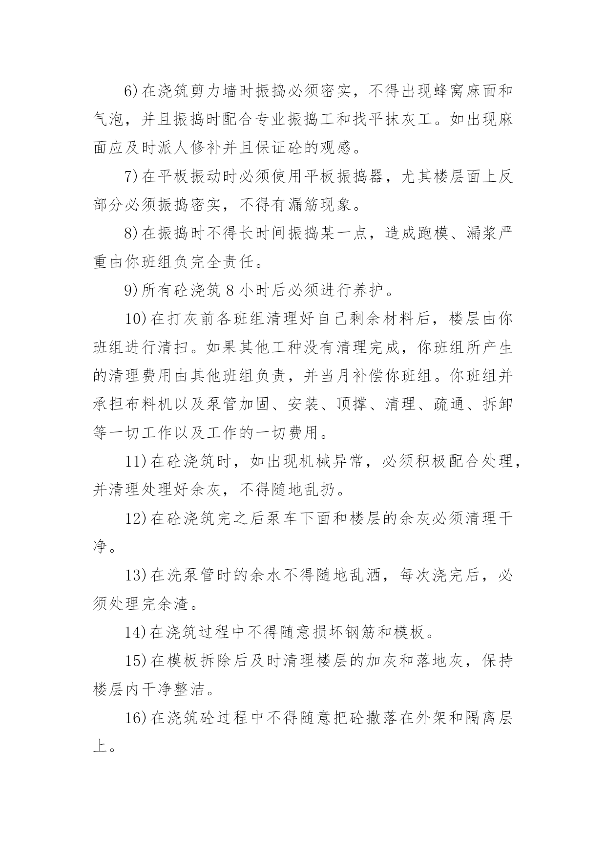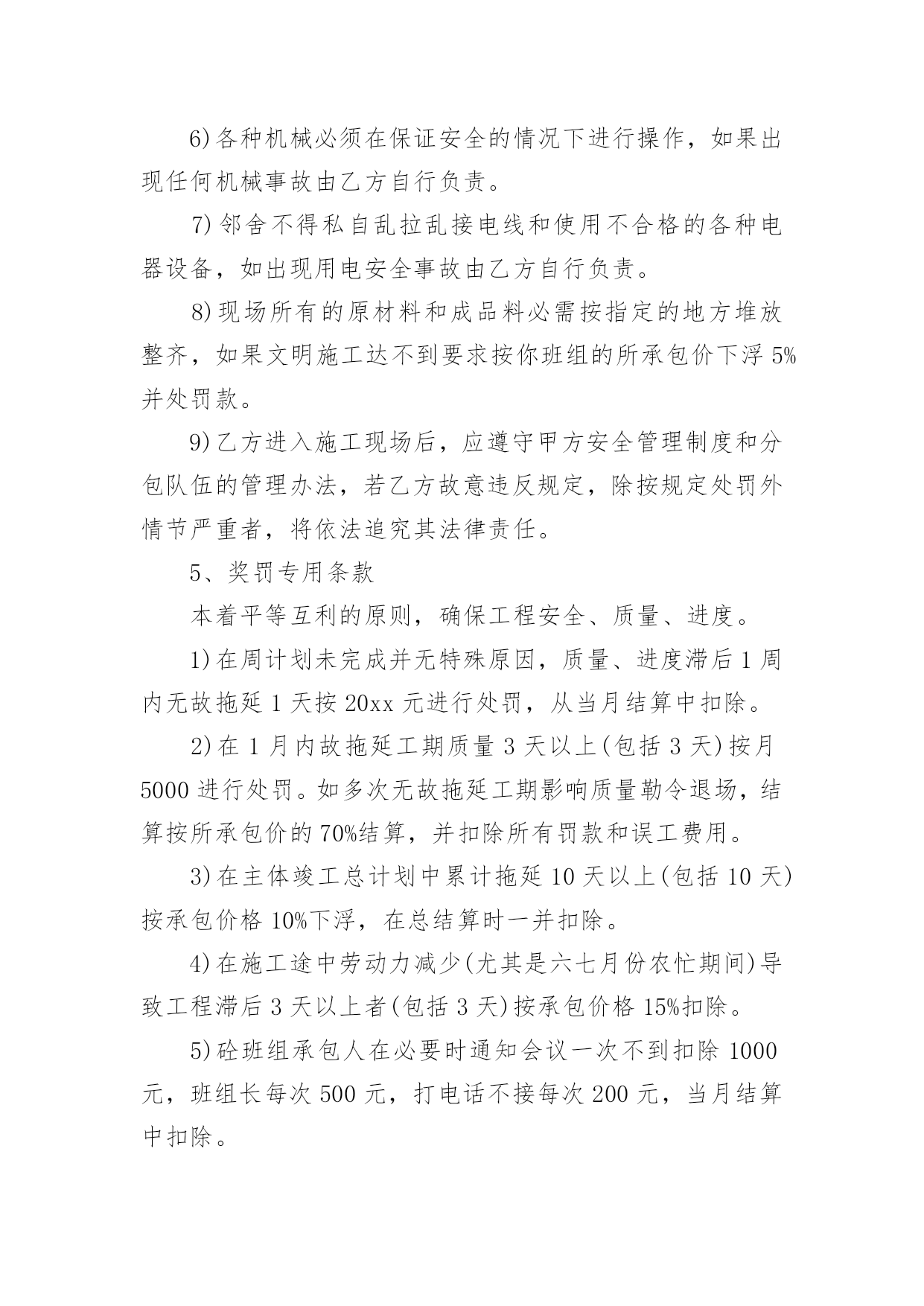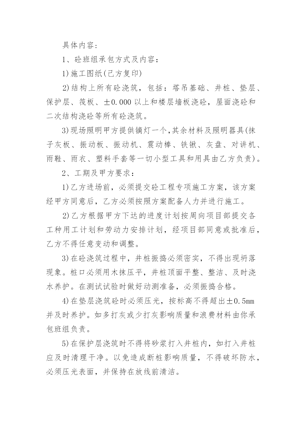施工承包的协议书在学习、工作生活中,协议使用的情况越来越多,协议能够成为双方当事人的合法依据。那么相关的协议到底怎么写呢?下面是小编精心整理的施工承包的协议书,欢迎大家分享。施工承包的协议书1甲方(发包人):乙方(承包人):根据《中华人民共和国合同法》、《建筑法》等相关规定,经甲乙双方协商甲方将工程项目劳务承包给乙方,由乙方组织安排劳务和劳动力并具体施工,甲乙双方本着平等自愿、互利互惠、奖罚分明的原则,特签署本合同,双方共同遵照执行。第一条、项目名称、地址:第二条、承包方式:施工劳务人员大包干,部分小材料与机械。第三条、承包内容及范围:第四条、工期及甲方要求第五条、承包价格及结算方式第六条、安全文明施工要求第七条、奖罚专用条款第八条、其他未尽事宜具体内容:1、砼班组承包方式及内容:1)施工图纸(己方复印)2)结构上所有砼浇筑,包括:塔吊基础、井桩、垫层、保护层、筏板、±0.000以上和楼层墙板浇砼,屋面浇砼和二次结构浇砼等所有砼浇筑。3)现场照明甲方提供镝灯一个,其余材料及照明器具(抹子灰板、振动板、振动机、震动棒、铁锹、灰盘、对讲机、雨鞋、雨衣、塑料手套等一切小型工具和用具由乙方负责)。2、工期及甲方要求:1)乙方进场前,必须提交砼工程专项施工方案,该方案经甲方同意后,乙方必须按照方案配备人力并进行施工。2)乙方根据甲方下达的进度计划按周向项目部提交各工种用工计划和劳动力安排计划,经项目部同意或批准后,乙方不得任意变动和调整。3)在砼浇筑过程中,井桩振捣必须密实,不得出现坍落现象。桩口必须用木抹压平,井桩顶面平整、整洁、及时浇水养护。在测试试验时做好动测准备,必须振捣合格。4)在垫层浇筑砼时必须压光,按标高不得超出±0.5mm并及时养护。如多打灰或少打灰影响质量和浪费材料由你承包班组负责。5)在保护层浇筑时不得将砂浆打入井桩内,如打入井桩应及时清理干净。以免造成断桩影响质量,不得破坏防水,必须压光表面,并保持在放线前清洁。6)在浇筑剪力墙时振捣必须密实,不得出现蜂窝麻面和气泡,并且振捣时配合专业振捣工和找平抹灰工。如出现麻面应及时派人修补并且保证砼的观感。7)在平板振动时必须使用平板振捣器,尤其楼层面上反部分必须振捣密实,不得有漏筋现象。8)在振捣时不得长时间振捣某一点,造成跑模、漏浆严重由你班组负完全责任。9)所有砼浇筑8小时后必须进行养护。10)在打灰前各班组清理好自己剩余材料后,楼层由你班组进行清扫。如果其他工种没有清理完成,你班组所产生的清理费用由其他班组负责,并当月补偿你班组。你班组并承担布料机以及泵管加固、安装、顶撑、清理、疏通、拆卸等一切工作以及工作的一切费用。11)在砼浇筑时,如出现机械异常,必须积极配合处理,并清理处理好余灰,不得随地乱扔。12)在砼浇筑完之后泵车下面和楼层的余灰必须清理干净。13)在洗泵管时的余水不得随地乱洒,每次浇完后,必须处理完余渣。14)在浇筑过程中不得随意损坏钢筋和模板。15)在模板拆除后及时清理楼层的加灰和落地灰,保持楼层内干净整洁。16)在浇筑砼过程中不得随意把砼撒落在外架和隔离层上。如有以上各种情况将进行处罚,并且勒令你班组及时处理。17)必须服从现场值班人员的管理和安排18)在浇筑前必须堵好地面与墙角的缝隙以及楼梯踏步口钢丝网绑扎等。3、承包价格与结算方式:垫层、保护层、筏板每立方米20元,筏板以上每立方米30元结算(其中清理楼层每立方3元),每月按你班组所完成的工程量的60%结算(结算方量以公司结算为主)。年底结算80%,剩余工程量结算在建设单位验收竣工之后付清。4、安全文明施工:1)砼的`损耗不得超出控制范围,如超出按原材料照价赔偿。2)各种机械操作必须是专业操作人员持证作业,其他人不得私自使用,并且所有机械由专人管理和维修,如损坏在当月结算中按原价扣除。3)为了体现文明施工和规范的劳务单位,上班时必须佩戴好安全器具不得在上班喝酒。在我公司不得打架滋事,不得野蛮施工。4)操作面必须保持整洁,工完料清,不得随地大小便,丢弃垃圾和杂物。5)各工种必须保护好成品,严格按《成品保护措施》进行施工。任何班组破坏任何班组的成品按原费用的2倍赔偿,在当月结算中扣除。6)各种机械必须在保证安全的情况下进行操作,如果出现任何机械事故由乙方自行负责。7)邻舍不得私自乱拉乱接电线和使用不合格的各种电器设备,如出现用电安全事故由乙方自行负责。8)现场所有的原材料和成品料必需按指定的地方堆放整齐,如果文明施工达不到要求按你班组的所承包价下浮5%并处罚款。9)乙方进入施工现场后,应遵守甲方安全管理制度和分包队伍的管理办法,若乙方故意违反规定,除按规定处罚外情节严重者,将依法追究其法律责任。5、奖罚专用条款本着平等互利的原则,确保工程安全、质量、进度。1)在周计划未完成并无特殊原因,质量、进度滞