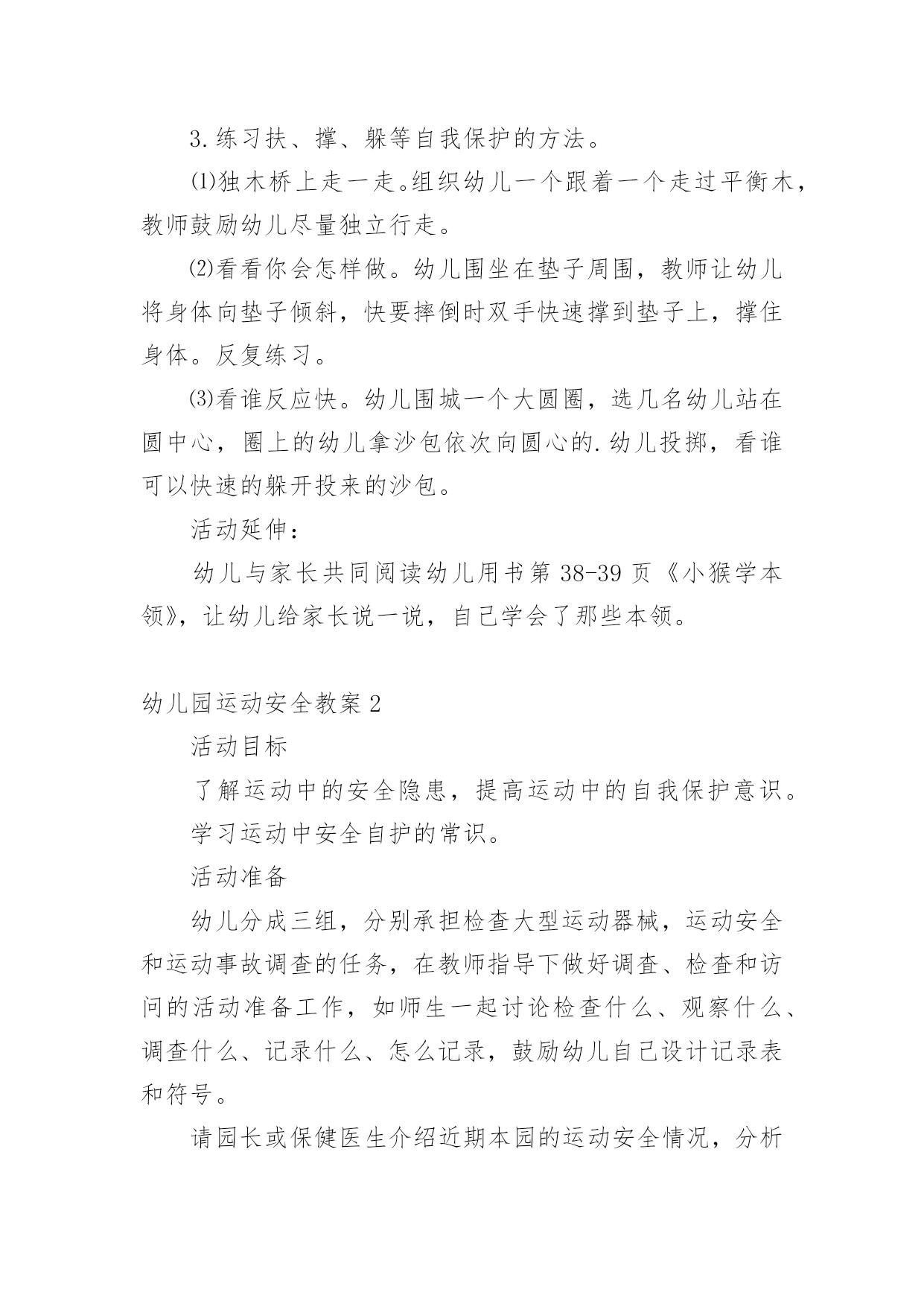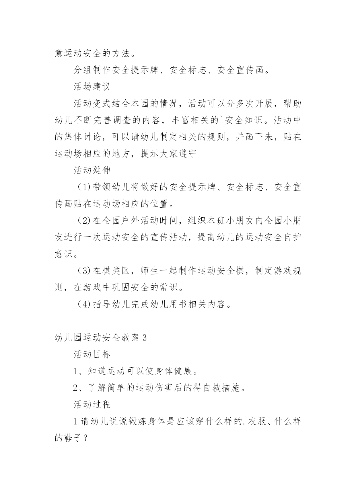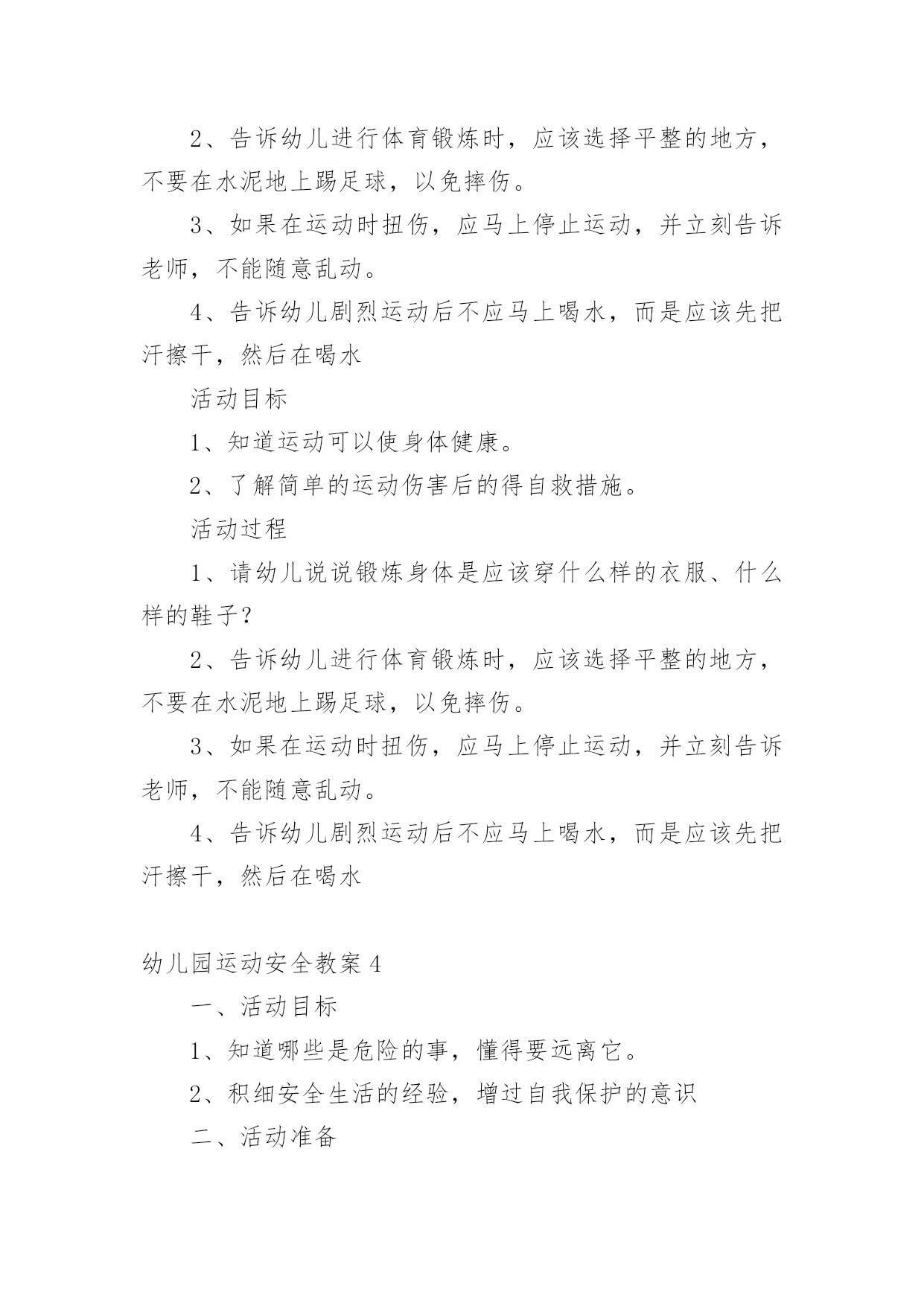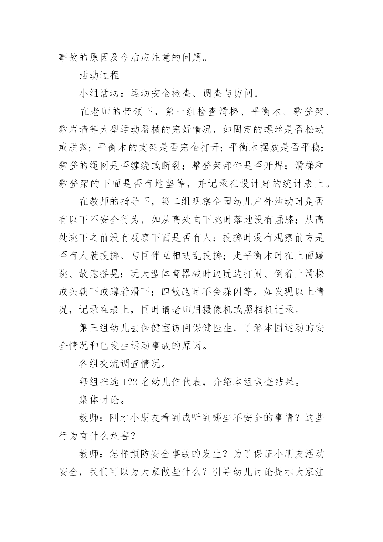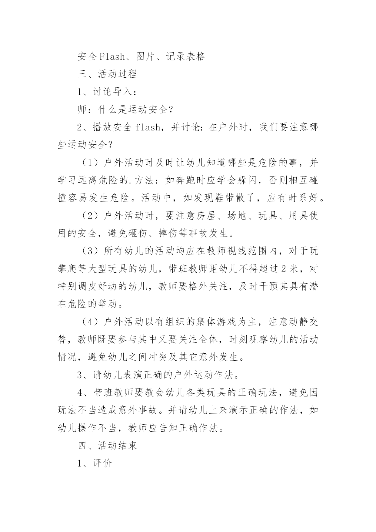 幼儿园运动安全教案作为一名教职工,编写教案是必不可少的,教案是教学活动的总的组织纲领和行动方案。写教案需要注意哪些格式呢?以下是小编收集整理的幼儿园运动安全教案,供大家参考借鉴,希望可以帮助到有需要的朋友。幼儿园运动安全教案1活动目标:1.掌握扶、撑、躲等自我保护的方法。2.知道在户外活动时要关爱他人,遵守活动规则。活动准备:1.平衡木、沙包、垫子。2.多媒体教学资源《小猴学本领图片》。活动过程:1.引导幼儿倾听故事并理解故事内容。⑴播放多媒体教学资源《小猴学本领》的图片,教师讲述故事。⑵请幼儿说一说:小猴为什么要学本领?小猴学到了那些本领?这些本领对小猴有哪些帮助?2.引导幼儿学习扶、撑、躲等自我保护的方法。⑴组织幼儿学习扶、撑、躲的动作。教师逐一演示的动作要领,供幼儿学习模仿。⑵引导幼儿讨论:小朋友在什么情况下会用这些本领?3.练习扶、撑、躲等自我保护的方法。⑴独木桥上走一走。组织幼儿一个跟着一个走过平衡木,教师鼓励幼儿尽量独立行走。⑵看看你会怎样做。幼儿围坐在垫子周围,教师让幼儿将身体向垫子倾斜,快要摔倒时双手快速撑到垫子上,撑住身体。反复练习。⑶看谁反应快。幼儿围城一个大圆圈,选几名幼儿站在圆中心,圈上的幼儿拿沙包依次向圆心的.幼儿投掷,看谁可以快速的躲开投来的沙包。活动延伸:幼儿与家长共同阅读幼儿用书第38-39页《小猴学本领》,让幼儿给家长说一说,自己学会了那些本领。幼儿园运动安全教案2活动目标了解运动中的安全隐患,提高运动中的自我保护意识。学习运动中安全自护的常识。活动准备幼儿分成三组,分别承担检查大型运动器械,运动安全和运动事故调查的任务,在教师指导下做好调査、检査和访问的活动准备工作,如师生一起讨论检查什么、观察什么、调查什么、记录什么、怎么记录,鼓励幼儿自己设计记录表和符号。请园长或保健医生介绍近期本园的运动安全情况,分析事故的原因及今后应注意的问题。活动过程小组活动:运动安全检査、调査与访问。在老师的带领下,第一组检查滑梯、平衡木、攀登架、攀岩墙等大型运动器械的完好情况,如固定的螺丝是否松动或脱落;平衡木的支架是否完全打开;平衡木摆放是否平稳;攀登的绳网是否缠绕或断裂;攀登架部件是否开焊;滑梯和攀登架的下面是否有地垫等,并记录在设计好的统计表上。在教师的指导下,第二组观察全园幼儿户外活动时是否有以下不安全行为,如从高处向下跳时落地没有屈膝;从高处跳下之前没有观察下面是否有人;投掷时没有观察前方是否有人就投掷、与同伴互相胡乱投掷;走平衡木时在上面蹦跳、故意摇晃;玩大型体育器械时边玩边打闹、倒着上滑梯或头朝下或蹲着滑下;四散跑时不会躲闪等。如发现以上情况,记录在表上,同时请老师用摄像机或照相机记录。第三组幼儿去保健室访问保健医生,了解本园运动的安全情况和已发生运动事故的原因。各组交流调查情况。每组推选1?2名幼儿作代表,介绍本组调查结果。集体讨论。教师:刚才小朋友看到或听到哪些不安全的事情?这些行为有什么危害?教师:怎样预防安全事故的发生?为了保证小朋友活动安全,我们可以为大家做些什么?引导幼儿讨论提示大家注意运动安全的方法。分组制作安全提示牌、安全标志、安全宣传画。活场建议活动变式结合本园的情况,活动可以分多次开展,帮助幼儿不断完善调查的内容,丰富相关的`安全知识。活动中的集体讨论,可以请幼儿制定相关的规则,并画下来,贴在运动场相应的地方,提示大家遵守活动延伸(1)带领幼儿将做好的安全提示牌、安全标志、安全宣传画贴在运动场相应的位置。(2)在全园户外活动时间,组织本班小朋友向全园小朋友进行一次运动安全的宣传活动,提髙幼儿的运动安全自护意识。(3)在棋类区,师生一起制作运动安全棋,制定游戏规则,在游戏中巩固安全的常识。(4)指导幼儿完成幼儿用书相关内容。幼儿园运动安全教案3活动目标1、知道运动可以使身体健康。2、了解简单的运动伤害后的得自救措施。活动过程1请幼儿说说锻炼身体是应该穿什么样的.衣服、什么样的鞋子?2、告诉幼儿进行体育锻炼时,应该选择平整的地方,不要在水泥地上踢足球,以免摔伤。3、如果在运动时扭伤,应马上停止运动,并立刻告诉老师,不能随意乱动。4、告诉幼儿剧烈运动后不应马上喝水,而是应该先把汗擦干,然后在喝水活动目标1、知道运动可以使身体健康。2、了解简单的运动伤害后的得自救措施。活动过程1、请幼儿说说锻炼身体是应该穿什么样的衣服、什么样的鞋子?2、告诉幼儿进行体育锻炼时,应该选择平整的地方,不要在水泥地上踢足球,以免摔伤。3、如果在运动时扭伤,应马上停止运动,并立刻告诉老师,不能随意乱动。4、告诉幼儿剧烈运动后不应马上喝水,而是应该先把汗擦干,然后在喝水幼儿园运动安全教案4一、活动目标1、知道哪些是危险的事,懂得要远离它。2、积细安全生活的经验,增过自我保护的意识二、活动准备安全Flash、