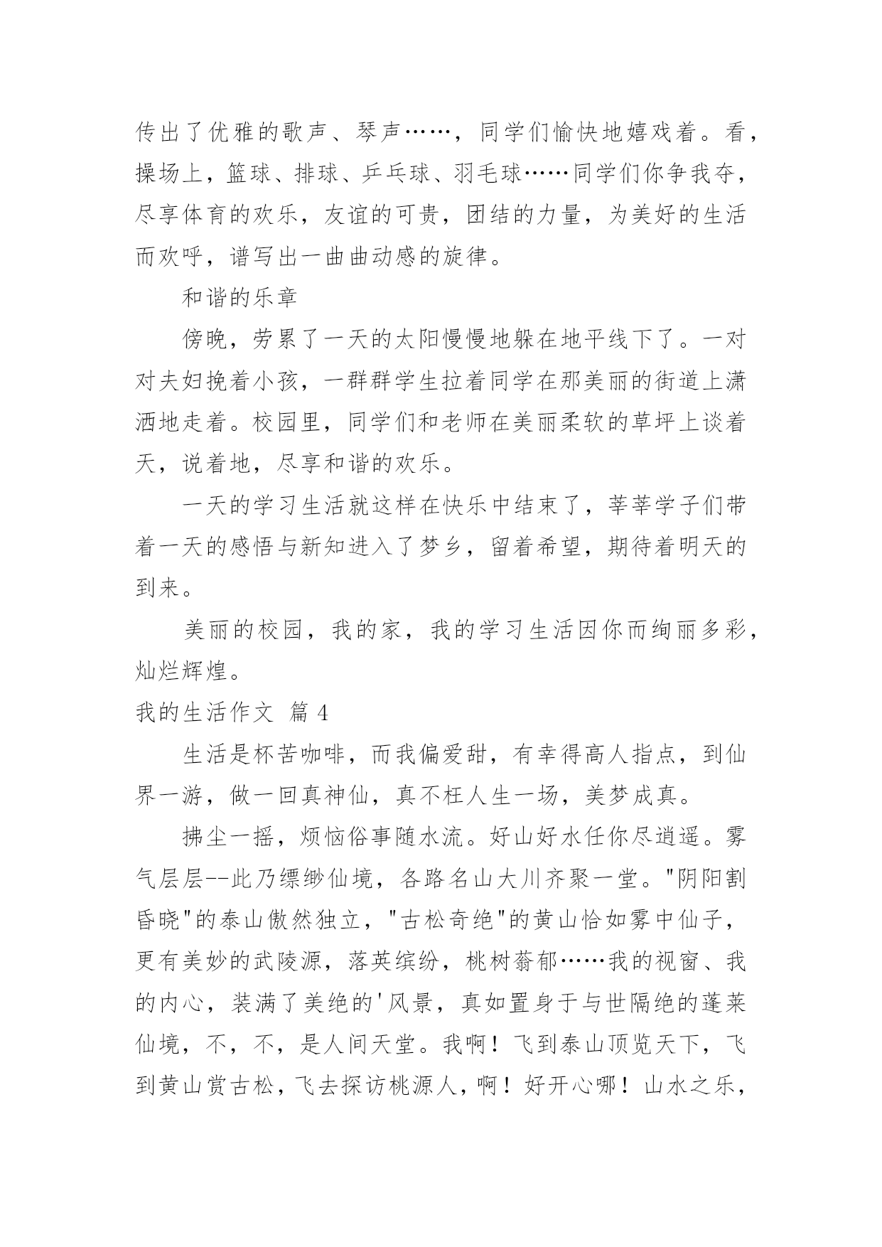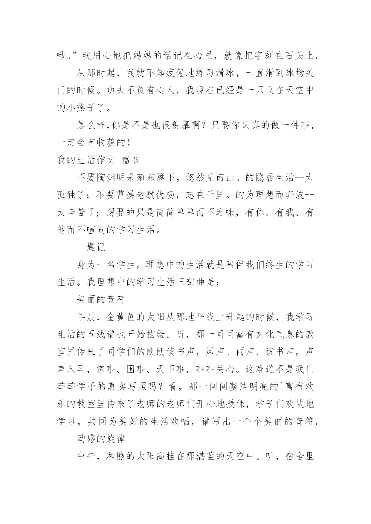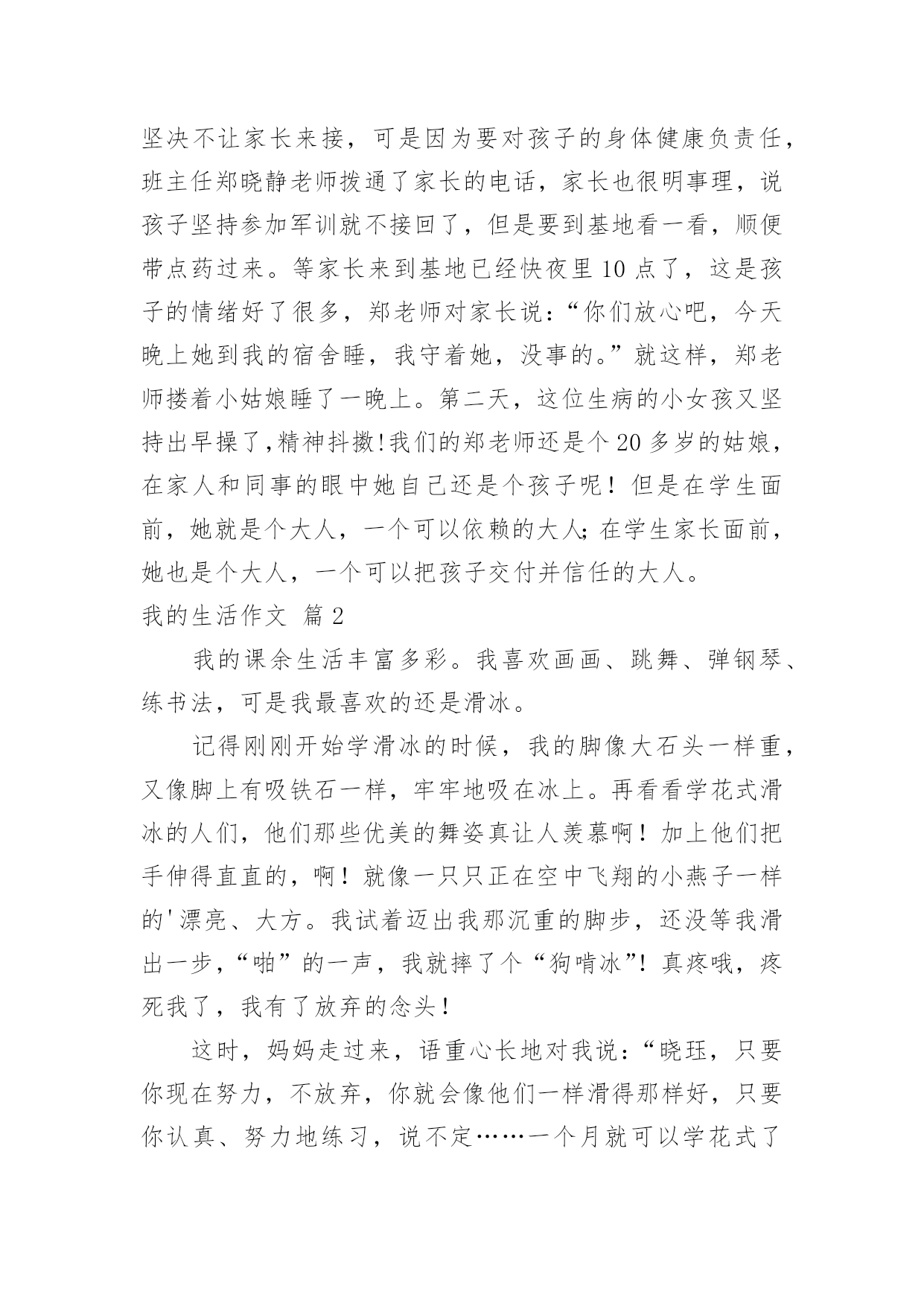 我的生活作文【实用】我的生活作文四篇在学习、工作或生活中,大家对作文都不陌生吧,作文根据写作时限的不同可以分为限时作文和非限时作文。那么你有了解过作文吗?下面是小编为大家整理的我的生活作文4篇,欢迎大家分享。我的生活作文篇120xx年8月27日全校初一新生近700人冒着酷暑顶着烈日来到了训练基地进行为期五天的军训。在这五天的军训中,班主任老师们及工作人员和同学们一起吃住在训练基地,这五天的军训留下了太多的感动和太多的思考,撷取一些点滴记忆和大家分享。拾金不昧好同学。军训的第一天,一年级五班的高志坤同学在训练场上捡到了人民币300元,在第一时间交到了班主任老师手中,班主任老师及时和基地所有班主任、教官取得联系,经过大家分头查询,迅速查明这钱是一年级四班的一位不慎丢失的,正在焦急之时,高志坤同学及时将他丢失的欠款交还给他。高志坤同学拾金不昧的精神不仅让失主感动不已也让所有班主任老师及教官甚为感动,这是多么好的'孩子呀!老师搂着学生睡。一年级四班的一位女生感冒了,可能因为训练强度比起平日的生活苦了很多,体力不支,第一天晚上就无精打采,但是这位同学极坚强,吃了校医给的药片坚决不让家长来接,可是因为要对孩子的身体健康负责任,班主任郑晓静老师拨通了家长的电话,家长也很明事理,说孩子坚持参加军训就不接回了,但是要到基地看一看,顺便带点药过来。等家长来到基地已经快夜里10点了,这是孩子的情绪好了很多,郑老师对家长说:“你们放心吧,今天晚上她到我的宿舍睡,我守着她,没事的。”就这样,郑老师搂着小姑娘睡了一晚上。第二天,这位生病的小女孩又坚持出早操了,精神抖擞!我们的郑老师还是个20多岁的姑娘,在家人和同事的眼中她自己还是个孩子呢!但是在学生面前,她就是个大人,一个可以依赖的大人;在学生家长面前,她也是个大人,一个可以把孩子交付并信任的大人。我的生活作文篇2我的课余生活丰富多彩。我喜欢画画、跳舞、弹钢琴、练书法,可是我最喜欢的还是滑冰。记得刚刚开始学滑冰的时候,我的脚像大石头一样重,又像脚上有吸铁石一样,牢牢地吸在冰上。再看看学花式滑冰的人们,他们那些优美的舞姿真让人羡慕啊!加上他们把手伸得直直的,啊!就像一只只正在空中飞翔的小燕子一样的'漂亮、大方。我试着迈出我那沉重的脚步,还没等我滑出一步,“啪”的一声,我就摔了个“狗啃冰”!真疼哦,疼死我了,我有了放弃的念头!这时,妈妈走过来,语重心长地对我说:“晓珏,只要你现在努力,不放弃,你就会像他们一样滑得那样好,只要你认真、努力地练习,说不定……一个月就可以学花式了哦。”我用心地把妈妈的话记在心里,就像把字刻在石头上。从那时起,我就不知疲倦地练习滑冰,一直滑到冰场关门的时候。功夫不负有心人,我现在已经是一只飞在天空中的小燕子了。怎么样,你是不是也很羡慕啊?只要你认真的做一件事,一定会有收获的!我的生活作文篇3不要陶渊明采菊东篱下,悠然见南山。的隐居生活--太孤独了;不要曹操老骥伏枥,志在千里。的为理想而奔波--太辛苦了;想要的只是简简单单而不乏味,有你、有我、有他而不喧闹的学习生活。--题记身为一名学生,理想中的生活就是陪伴我们终生的学习生活。我理想中的学习生活三部曲是:美丽的音符早晨,金黄色的太阳从那地平线上升起的时候,我学习生活的五线谱也开始描绘。听,那一间间富有文化气息的教室里传来了同学们的朗朗读书声,风声、雨声、读书声,声声入耳,家事、国事、天下事,事事关心。这难道不是我们莘莘学子的真实写照吗?看,那一间间整洁明亮的`富有欢乐的教室里传来了老师的老师们开心地授课,学子们欢快地学习,共同为美好的生活欢唱,谱写出一个个美丽的音符。动感的旋律中午,和煦的太阳高挂在那湛蓝的天空中。听,宿舍里传出了优雅的歌声、琴声……,同学们愉快地嬉戏着。看,操场上,篮球、排球、乒乓球、羽毛球……同学们你争我夺,尽享体育的欢乐,友谊的可贵,团结的力量,为美好的生活而欢呼,谱写出一曲曲动感的旋律。和谐的乐章傍晚,劳累了一天的太阳慢慢地躲在地平线下了。一对对夫妇挽着小孩,一群群学生拉着同学在那美丽的街道上潇洒地走着。校园里,同学们和老师在美丽柔软的草坪上谈着天,说着地,尽享和谐的欢乐。一天的学习生活就这样在快乐中结束了,莘莘学子们带着一天的感悟与新知进入了梦乡,留着希望,期待着明天的到来。美丽的校园,我的家,我的学习生活因你而绚丽多彩,灿烂辉煌。我的生活作文篇4生活是杯苦咖啡,而我偏爱甜,有幸得高人指点,到仙界一游,做一回真神仙,真不枉人生一场,美梦成真。拂尘一摇,烦恼俗事随水流。好山好水任你尽逍遥。雾气层层--此乃缥缈仙境,各路名山大川齐聚一堂。"阴阳割昏晓"的泰山傲然独立,"古松奇绝"的黄山恰如雾中仙子,更有美妙的武陵源,落英缤纷,桃树蓊郁……我的视窗、我的内心,装满了美绝的'风景,真如置身于与世隔绝的蓬莱仙境,