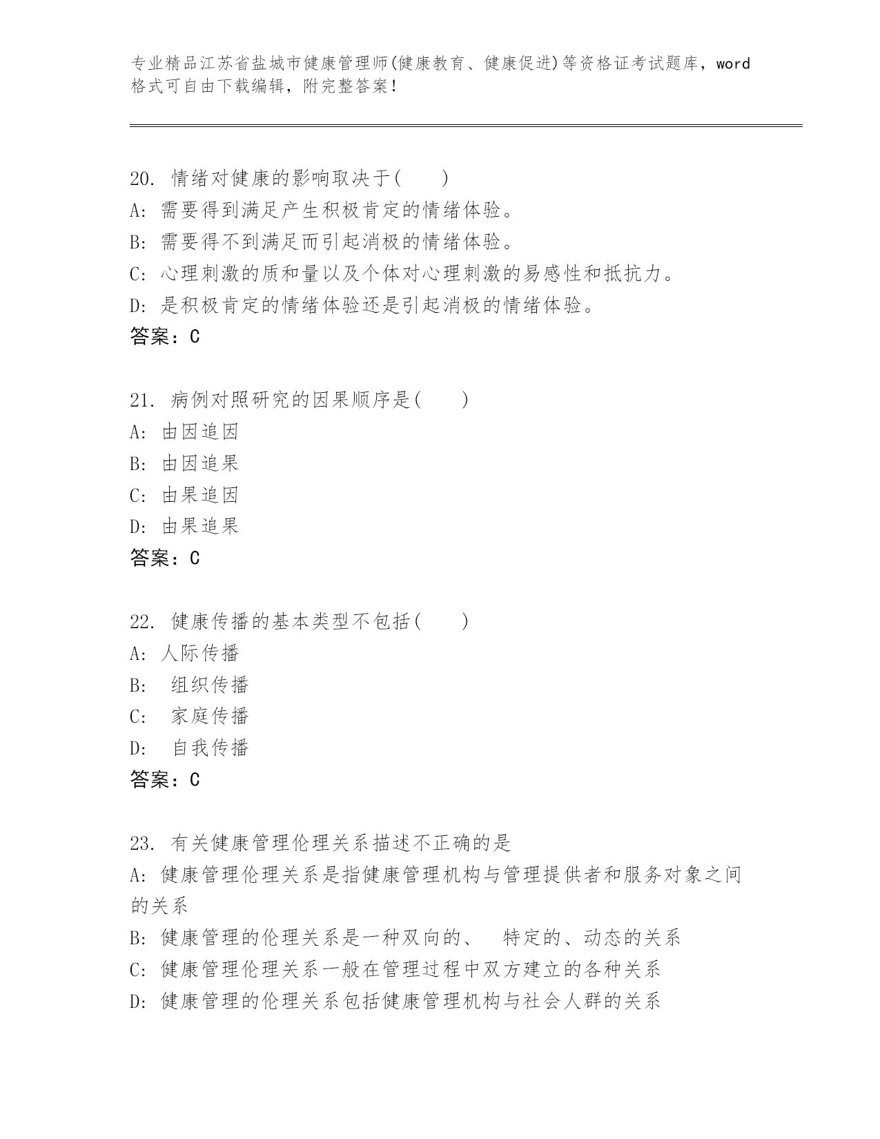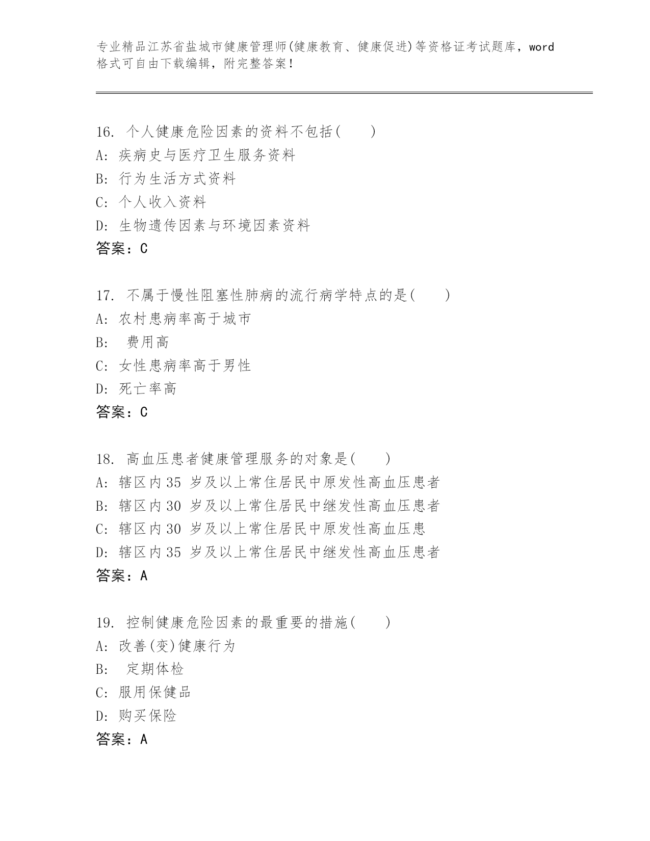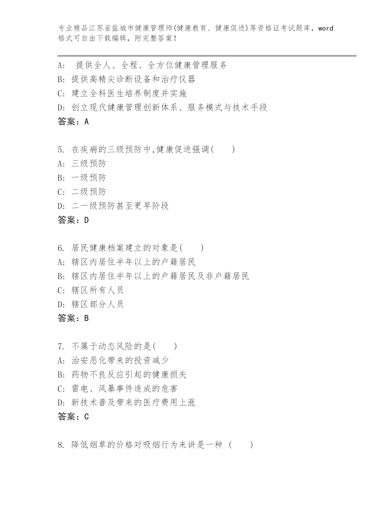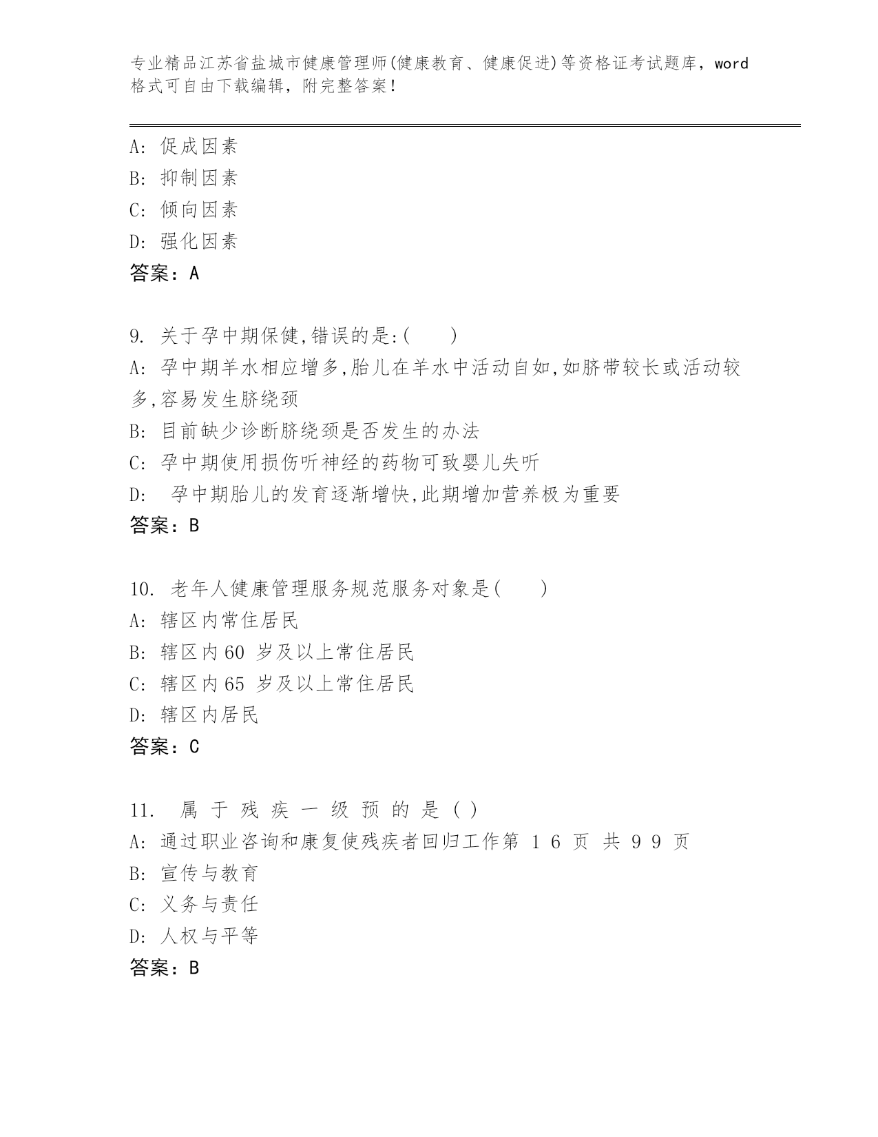 精品江苏省盐城市健康管理师(健康教育、健康促进)等资格证考试内部题库精品(A卷)