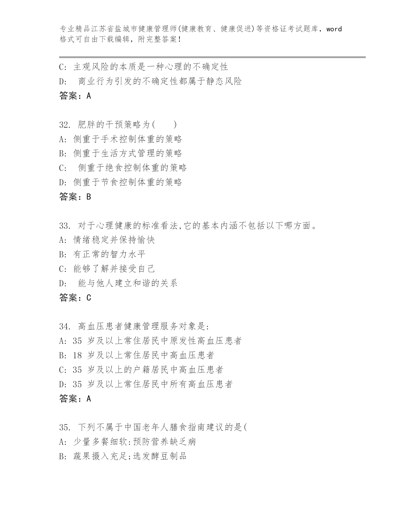精品江苏省盐城市健康管理师(健康教育、健康促进)等资格证考试内部题库精品(A卷).docx