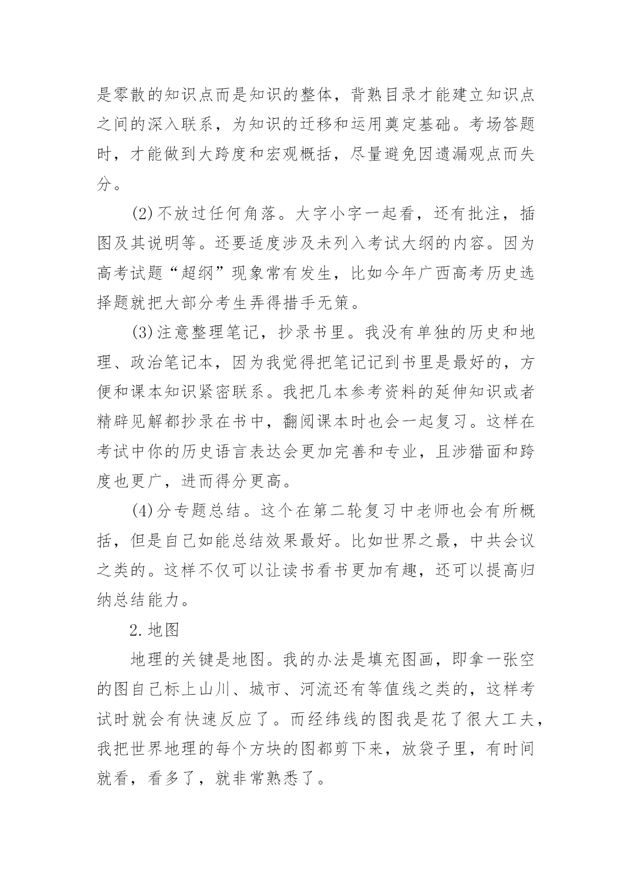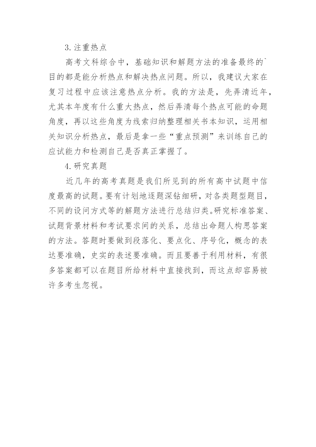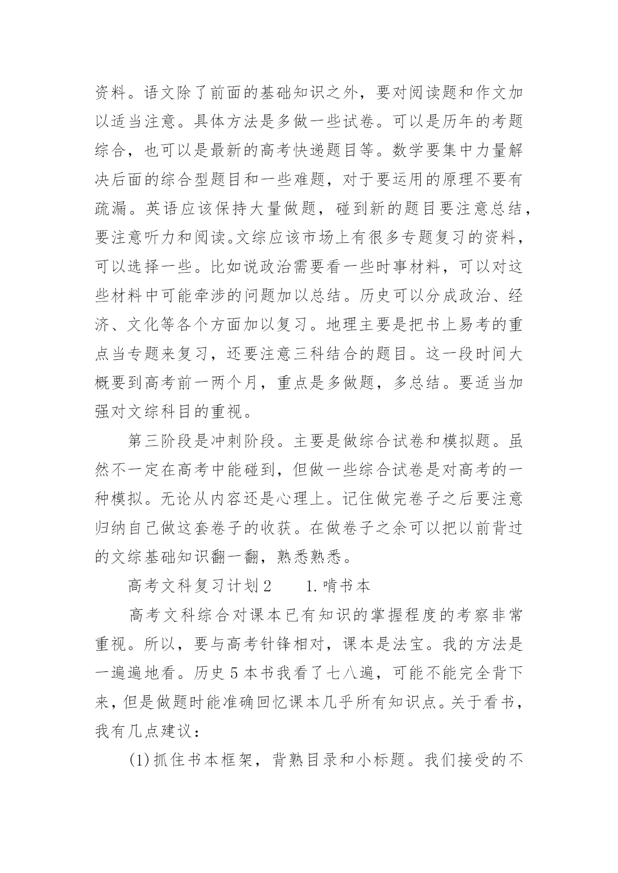 高考文科复习计划高考文科复习计划在复习中要加强复习的方法,复习对进一步巩固学习成绩起着重要的作用,在复习时我们要立足于“打实基础,有所创新。”那么优秀的复习计划是什么样的呢?以下是小编整理的高考文科复习计划,欢迎大家借鉴与参考,希望对大家有所帮助。高考文科复习计划1复习的计划应该总体上跟着老师的步骤走,在此同时自己制定计划并执行。如果自己有特殊情况再加以调整。我是文科,基本上最后的复习是分成三轮。第一轮是全面撒网式的复习。把高中课本按顺序过一遍(语文除外)。该背的东西在这一轮复习要基本搞定,数学要把不同的章节中的基础知识巩固一遍,能把内容跨度较小的题目基本解决(如果你的要求比较高的话),英语要把高一到高三的知识点重过一遍,这个过程应该有一套比较好的题量比较大的资料。文综跟着老师的复习过程走就可以,重点还是要把基础知识巩固背熟。语文要多注意积累,字音、字形等方面需要注意,该背的古文等要背熟。这一时期大概从高二暑假到高三上学期结束(不同的地方在具体时间安排上可能不同),文科生应该把更多的重点放在语数外上。第二阶段是属于专题性质的复习。这一阶段在跟着老师的`步骤走之外,最好自己再找一些适合自己的专题性质的资料。语文除了前面的基础知识之外,要对阅读题和作文加以适当注意。具体方法是多做一些试卷。可以是历年的考题综合,也可以是最新的高考快递题目等。数学要集中力量解决后面的综合型题目和一些难题,对于要运用的原理不要有疏漏。英语应该保持大量做题,碰到新的题目要注意总结,要注意听力和阅读。文综应该市场上有很多专题复习的资料,可以选择一些。比如说政治需要看一些时事材料,可以对这些材料中可能牵涉的问题加以总结。历史可以分成政治、经济、文化等各个方面加以复习。地理主要是把书上易考的重点当专题来复习,还要注意三科结合的题目。这一段时间大概要到高考前一两个月,重点是多做题,多总结。要适当加强对文综科目的重视。第三阶段是冲刺阶段。主要是做综合试卷和模拟题。虽然不一定在高考中能碰到,但做一些综合试卷是对高考的一种模拟。无论从内容还是心理上。记住做完卷子之后要注意归纳自己做这套卷子的收获。在做卷子之余可以把以前背过的文综基础知识翻一翻,熟悉熟悉。高考文科复习计划21.啃书本高考文科综合对课本已有知识的掌握程度的考察非常重视。所以,要与高考针锋相对,课本是法宝。我的方法是一遍遍地看。历史5本书我看了七八遍,可能不能完全背下来,但是做题时能准确回忆课本几乎所有知识点。关于看书,我有几点建议:(1)抓住书本框架,背熟目录和小标题。我们接受的不是零散的知识点而是知识的整体,背熟目录才能建立知识点之间的深入联系,为知识的迁移和运用奠定基础。考场答题时,才能做到大跨度和宏观概括,尽量避免因遗漏观点而失分。(2)不放过任何角落。大字小字一起看,还有批注,插图及其说明等。还要适度涉及未列入考试大纲的内容。因为高考试题“超纲”现象常有发生,比如今年广西高考历史选择题就把大部分考生弄得措手无策。(3)注意整理笔记,抄录书里。我没有单独的历史和地理、政治笔记本,因为我觉得把笔记记到书里是最好的,方便和课本知识紧密联系。我把几本参考资料的延伸知识或者精辟见解都抄录在书中,翻阅课本时也会一起复习。这样在考试中你的历史语言表达会更加完善和专业,且涉猎面和跨度也更广,进而得分更高。(4)分专题总结。这个在第二轮复习中老师也会有所概括,但是自己如能总结效果最好。比如世界之最,中共会议之类的。这样不仅可以让读书看书更加有趣,还可以提高归纳总结能力。2.地图地理的关键是地图。我的办法是填充图画,即拿一张空的图自己标上山川、城市、河流还有等值线之类的,这样考试时就会有快速反应了。而经纬线的图我是花了很大工夫,我把世界地理的每个方块的图都剪下来,放袋子里,有时间就看,看多了,就非常熟悉了。3.注重热点高考文科综合中,基础知识和解题方法的准备最终的`目的都是能分析热点和解决热点问题。所以,我建议大家在复习过程中应该注意热点分析。我的方法是,先弄清近年,尤其本年度有什么重大热点,然后弄清每个热点可能的命题角度,再以这些角度为线索归纳整理相关书本知识,运用相关知识分析热点,最后是拿一些“重点预测”来训练自己的应试能力和检测自己是否真正掌握了。4.研究真题近几年的高考真题是我们所见到的所有高中试题中信度最高的试题。要有计划地逐题深钻细研,对各类题型题目,不同的设问方式等的解题方法进行总结归类。研究标准答案、试题背景材料和考试要求间的关系,总结出命题人构思答案的方法。答题时要做到段落化、要点化、序号化,概念的表达要准确,史实的表述要准确。而且要善于利用材料,有很多答案都可以在题目所给材料中直接找到,而这点却容易被许多考生忽视。