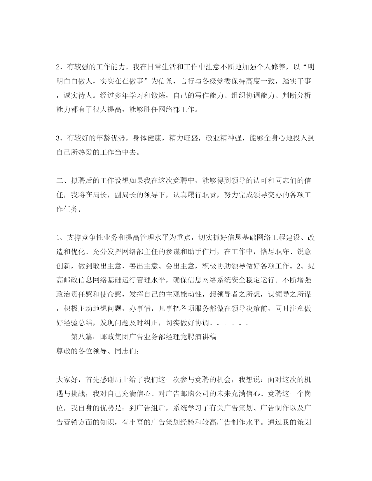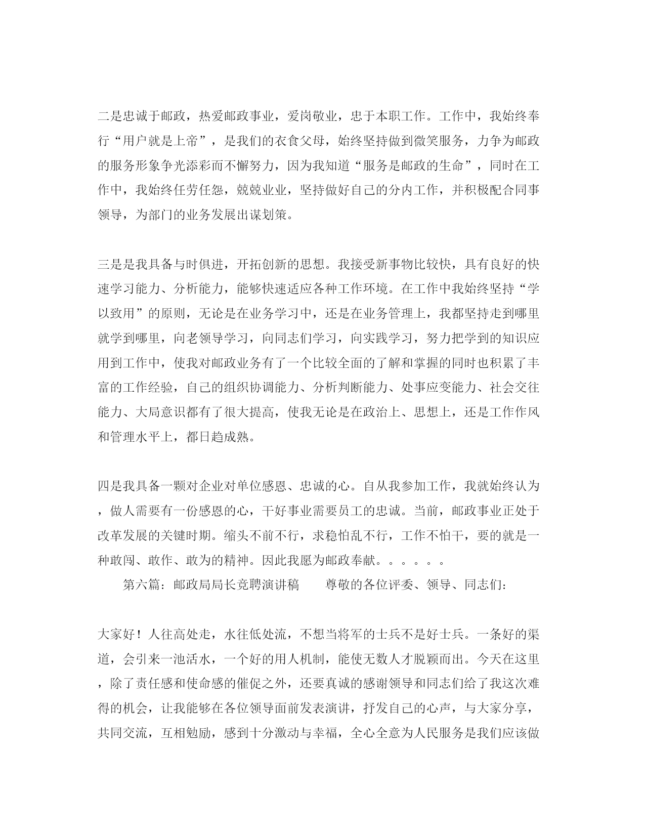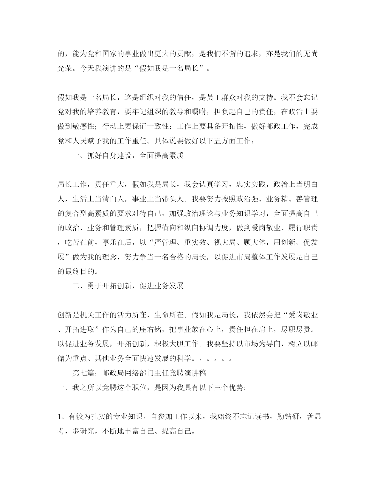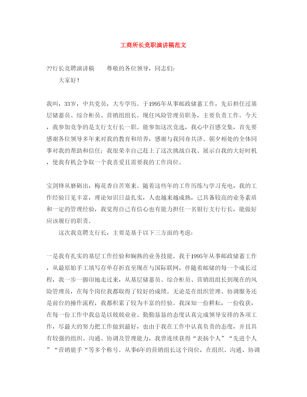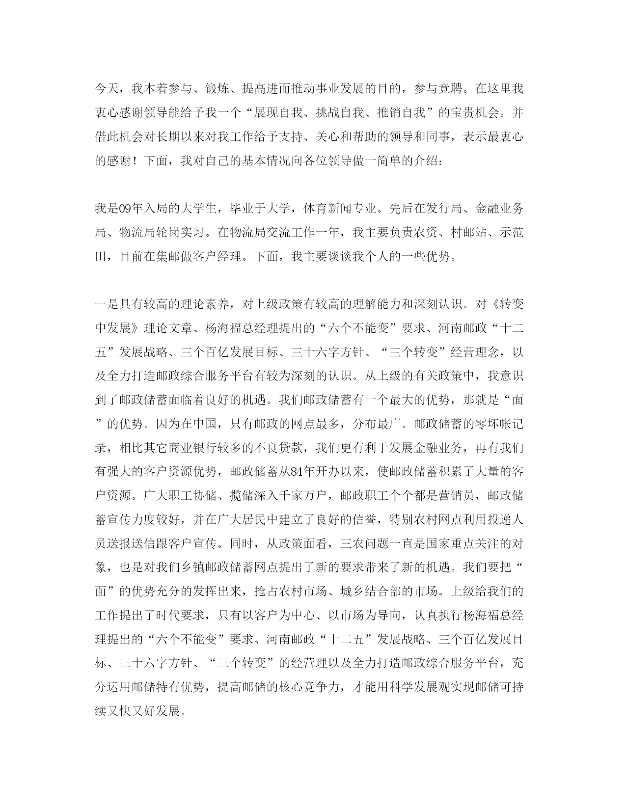 此资料由网络收集而来,如有侵权请告知上传者立即删除。资料共分享,我们负责传递知识。工商所长竞职演讲稿范文??行长竞聘演讲稿尊敬的各位领导,同志们:大家好!我叫,33岁,中共党员,大专学历。于1995年从事邮政储蓄工作,先后担任过基层储蓄员、综合柜员、营销组组长。现任风险管理员职务,主要负责工作。今天,我参加竞争的是支行支行长一职。能参加这次竞选,我心中百感交集,首先要感谢各位领导多年来对我的教育和培养,感谢与我同舟共济、朝夕相处的全体同事对我的帮助和信任;我很荣幸自己赶上了这次挑战自我、展示自我的大好时机,使我有机会争取一个我喜爱且需要我的工作岗位。宝剑锋从磨砺出,梅花香自苦寒来。随着这些年的工作历练与学习充电,我的工作经验日见丰富,理论知识日益扎实,人也越来越成熟,已具备较高的业务素质和一定的管理经验,我觉得自己有信心也有能力担任一名银行支行行长,能做好应该履行的职责。这次我竞聘支行长,主要是基于以下三方面的考虑:一是我有扎实的基层工作经验和娴熟的业务技能。我于1995年从事邮政储蓄工作,从最原始手工填写存单存折直至现在与国际联网,伴随着邮储的每一个成长过程,我一步一脚印地走过来,从基层储蓄员、综合柜员、营销组组长到现在的风险管理员,在每个岗位我都取得了较好的成绩。无论是在组织管理、协调服务还是前台的操作流程,我都积累了较为丰富的经验。我深知一份耕耘,一份收获,在每一份工作中我总是以兢兢业业、勤勤恳恳的态度认真完成领导安排的各项工作,尽最大的努力把工作做到最好,也由于我在工作中认真负责的态度,并且具有较强的组织、沟通、协调及管理能力,我曾连续获得“表扬个人”“先进个人”“营销能手“等多个称号。从事6年的营销组长这个岗位,在组织、沟通、协调及管理方面让我积累了丰富的经验和心得,并且通过在金融业十几年的切身体会的发展让我对这个行业有着深刻的见解,对金融风险以及如何把控风险也有着较全面的认识。另外,在多年的工作中,我始终不忘充实自己,坚持实践中学习、学习中实践,完善自我,提高自我。由于我多年来多岗位的磨练练就了我娴熟的业务能力,特别是银行管理方面的知识。这些,都有利于今后工作的展开。我相信这是我竞争诚信支行行长的最大优势,使我能更快、更好地进入角色,顺利地开展工作。二是我熟知支行长的岗位职责。支行长的岗位职责是重要的,也是包罗万象、非常繁杂的,它既要负责支行的行政管理,又要搞好交叉营销等经营业务,还要考虑支行的发展。支行长工作优劣以及能否开创新局面关键取决于否有一个坚定不移地贯彻了总行方针、政策;是否能积极主动配合全局,勇于创新具有较强组织能力和良好素质修养;是否善于博采众长带领大家团结一致、万众一心、协调工作领导集体。对工作职责的清醒认识和明确定位使我在思想上做好了迎接挑战的准备。重要的是我能够站在全局的角度,全方位地思考问题,并说出自己的想法,也许有利于推进支行的工作发展。三是热情与冷静并存。工作中我总能清醒的意识到肩负的责任,在职业生涯中未曾在原则。。。。。。第四篇:邮政局副局长个人竞聘演讲稿尊敬的各位领导,同事们:大家好!今天,我站在这里,心情非常激动。我本着进一步锻炼自己,为单位多做贡献的宗旨,参加本次邮局副局长竞聘。首先非常感谢单位,为我们提供了一个这么好的竞争平台,让我们可以在这里展现风采,同时,更要感谢多年来一直关心、帮助我的领导和同事们。我叫,今年岁,年进入邮局工作,先后从事过等工作。回首过去年的工作,在单位领导和同仁们的支持和帮助下,我从一个新兵逐渐成长为一个有担当、业务熟练的工作人员。我认为,对于今天的竞聘,我有以下几方面的优势:一是具有勇挑重担的信心。面对瞬息万变的国际国内形势,服务行业竞争日趋激烈。我们邮局认清形势,并抓住我国经济发展和国家出台的一系列优惠政策,搞好我们邮政的改革和发展。提出了在转变中发展,在发展中转变的口号。企业要发展,就必须有专业的团队来服好务。建设一支专业素质高的人才和领导队伍才是根本之道。我坚信,自己能够胜任这项光荣而艰巨的任务。二是具有丰富的工作经验经过多年的基层锻炼,我对邮局相关的业务非常熟悉。并且工作中,我始终不忘充实自己,坚持干中学、学中干,完善自我,提高自我。在我们邮局改革发展的新征途中,需要我们转变思想,强化创新意识,强化为民服务的意识,大力推进“三个转变”的实施,并结合咱们河南悠久而丰富的历史文化,成为大力宣传我们中原文化的主要载体之一。三是具备良好的人际沟通能力和组织协调能力。在工作中尊重领导,团结同事,坚持做到识大体顾大局,能够坚持原则而又不失灵活,处理问题思路清晰,头绪分明。特别是经过年来岗位上的学习和锻炼,使自己的业务能力、组织协调能力、分析判断能力、领导掌控能力都有了较大的提高,使自己一步一步走向成熟。。。。。。第五
