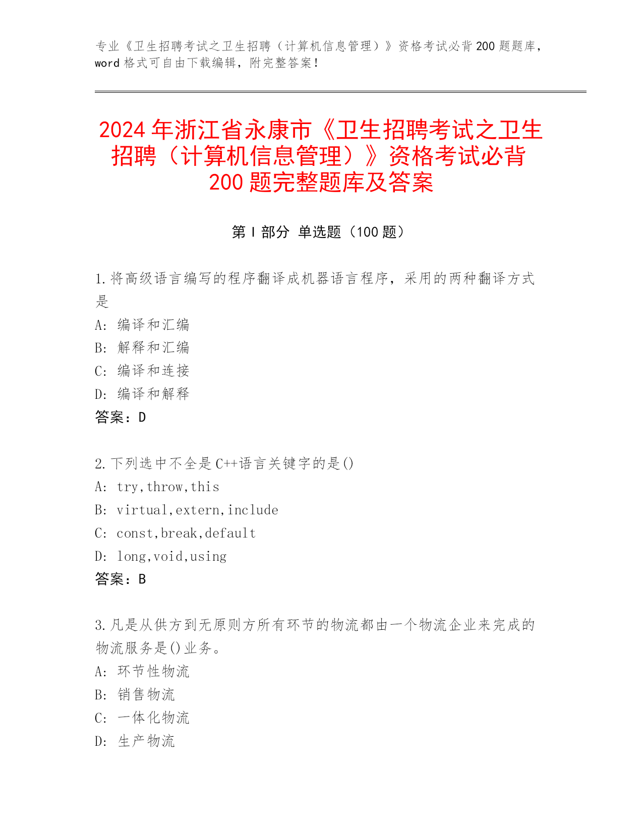 2024年浙江省永康市《卫生招聘考试之卫生招聘(计算机信息管理)》考试必背200题完整题库及参考答案(基础题)