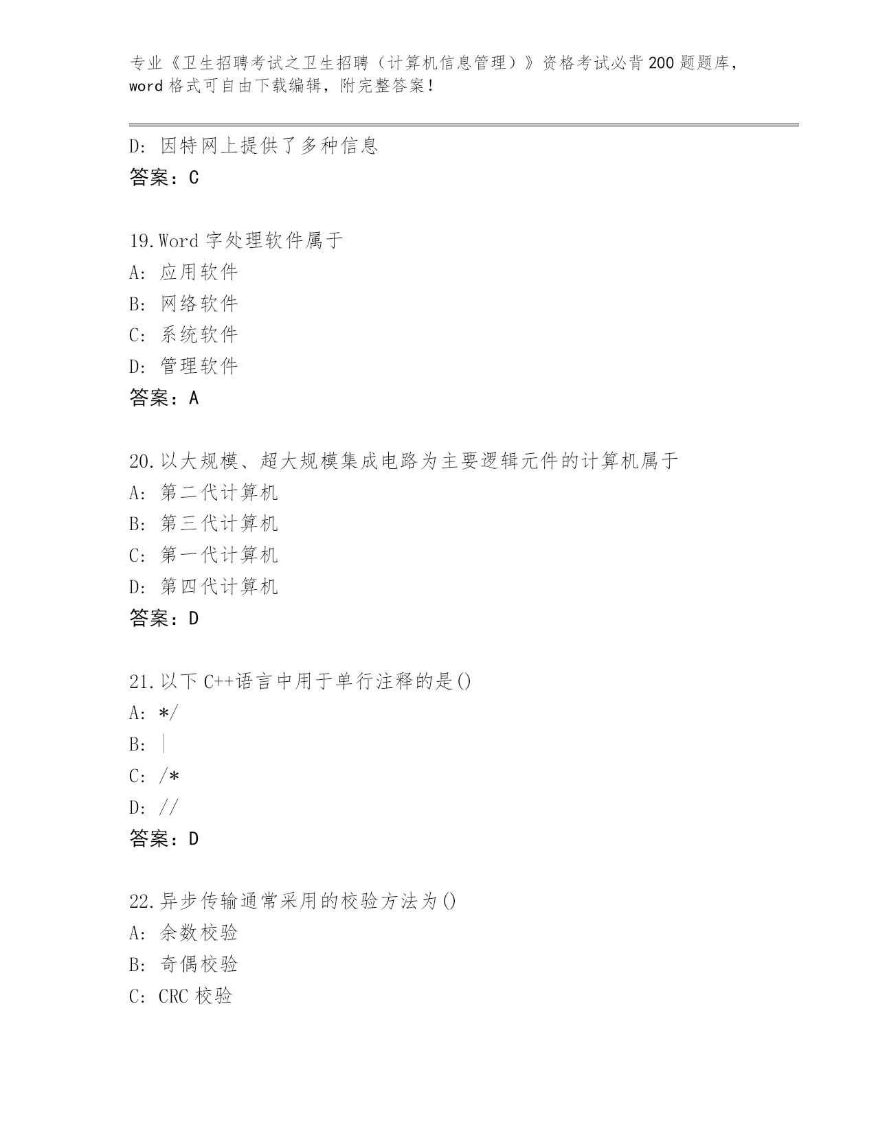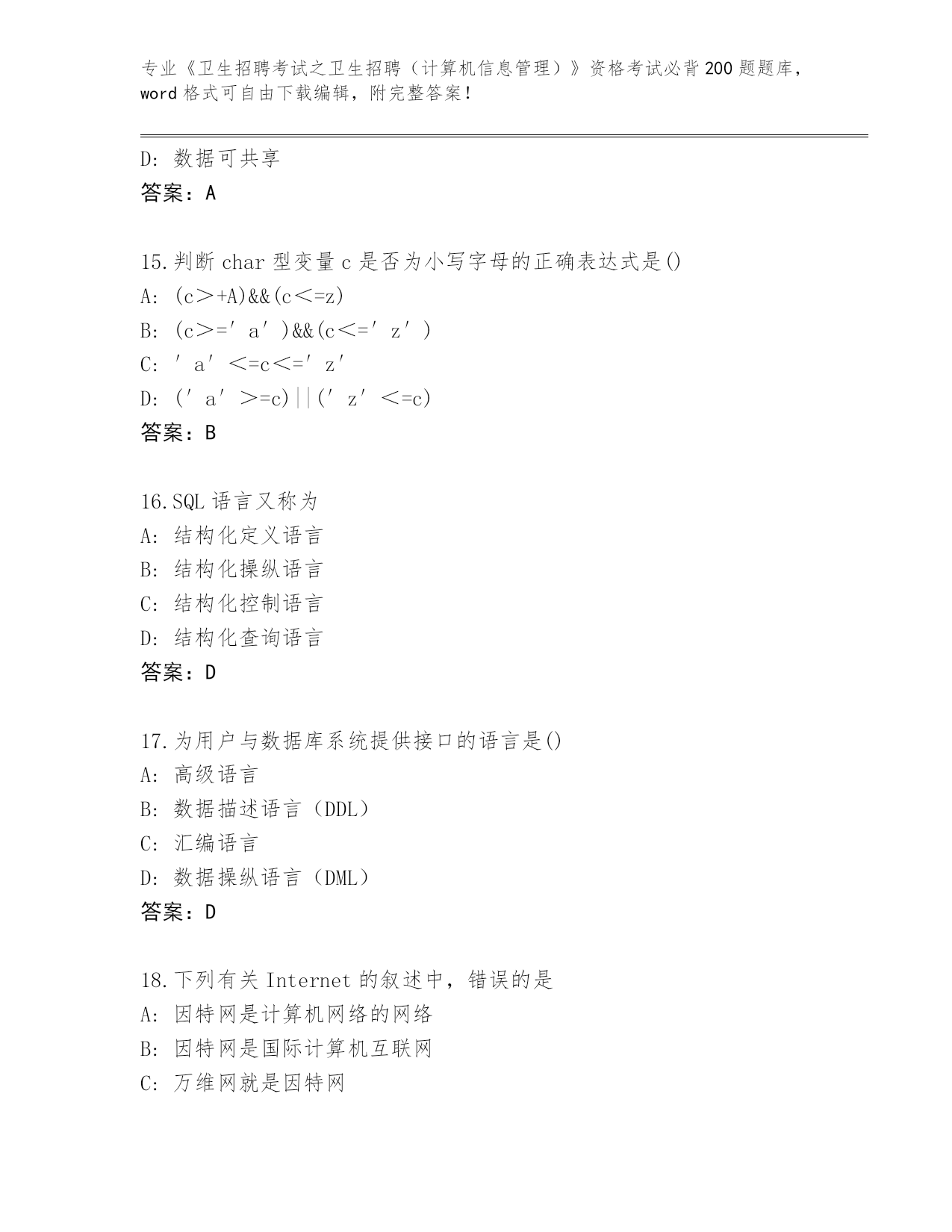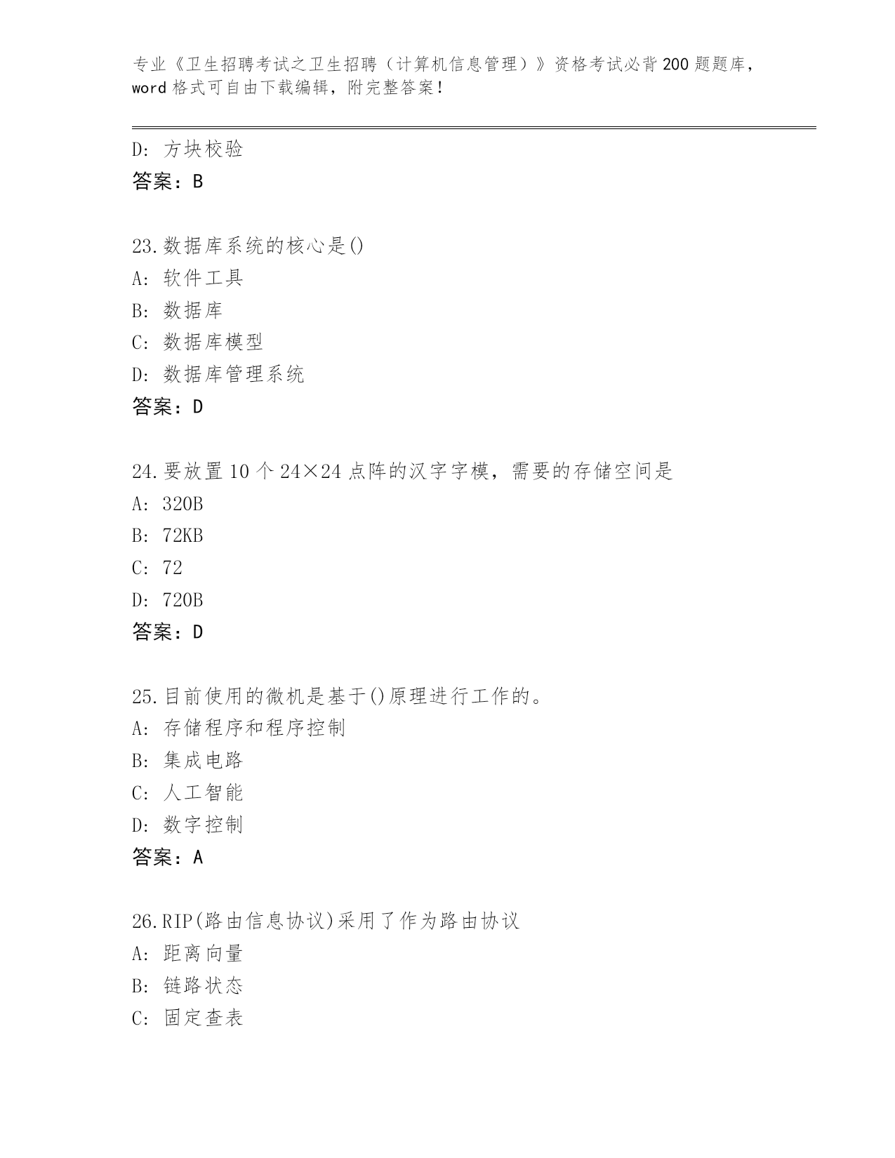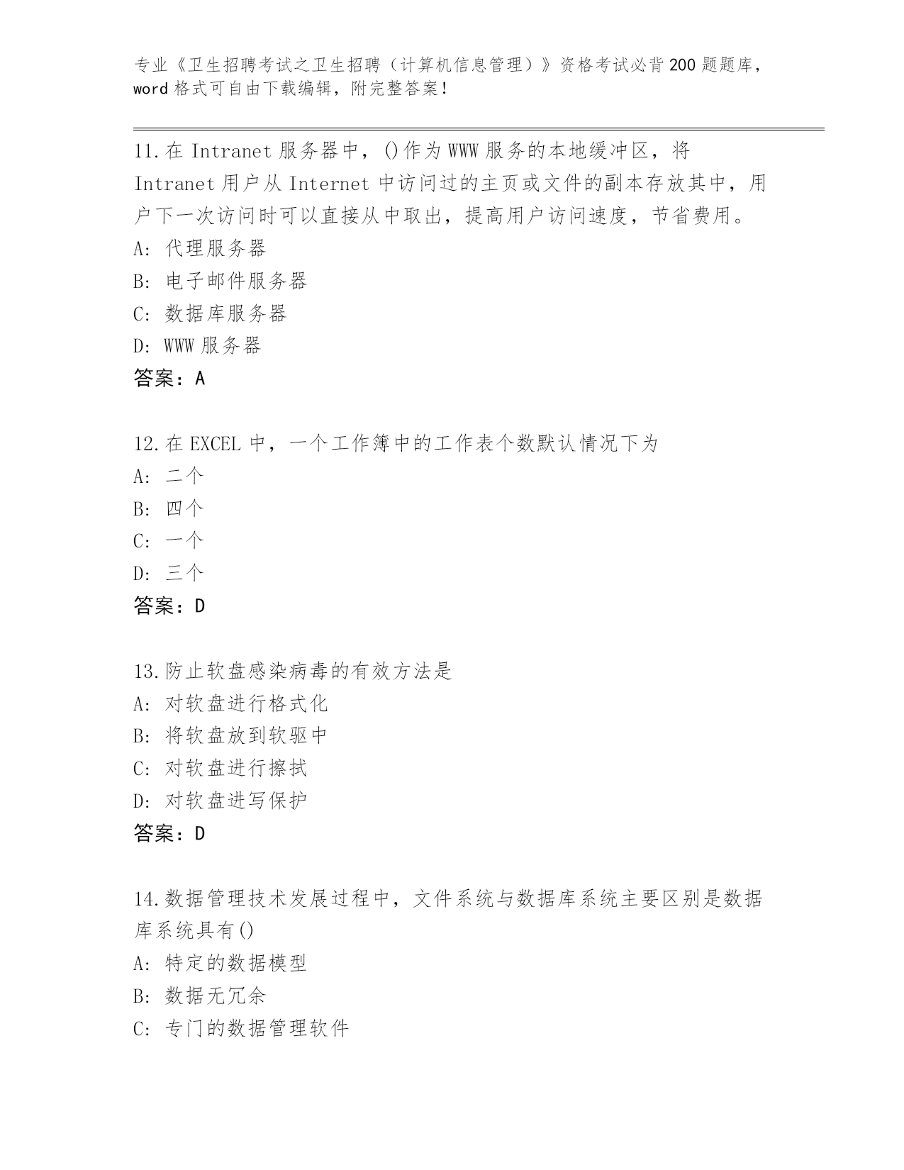浙江省历年《卫生招聘考试之卫生招聘(计算机信息管理)》资格考试必背200题题库及答案下载