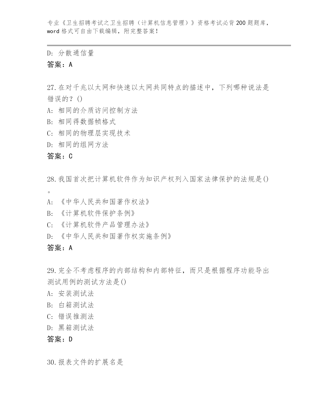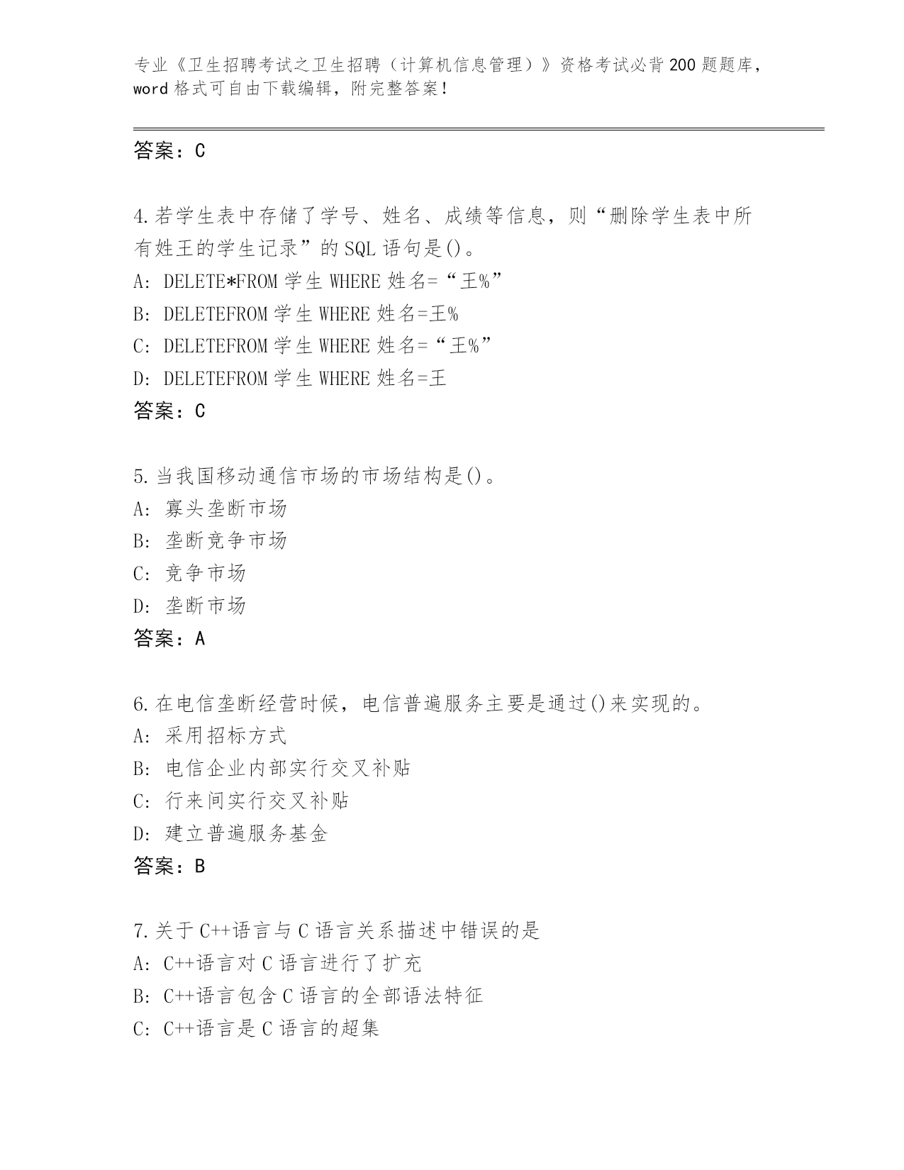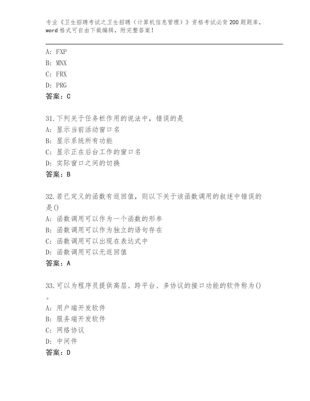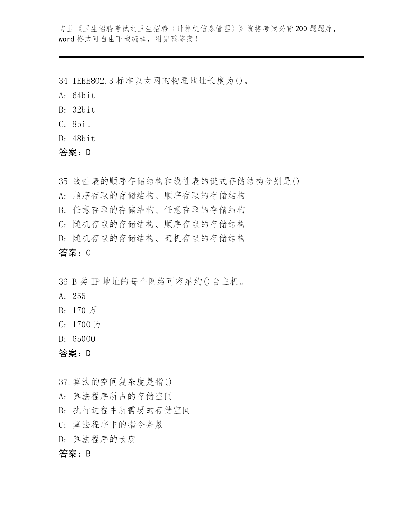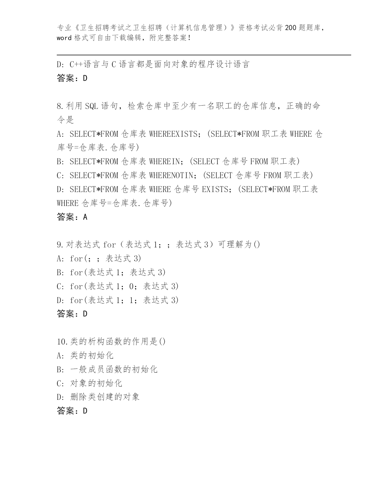 浙江省历年《卫生招聘考试之卫生招聘(计算机信息管理)》资格考试必背200题题库及答案下载