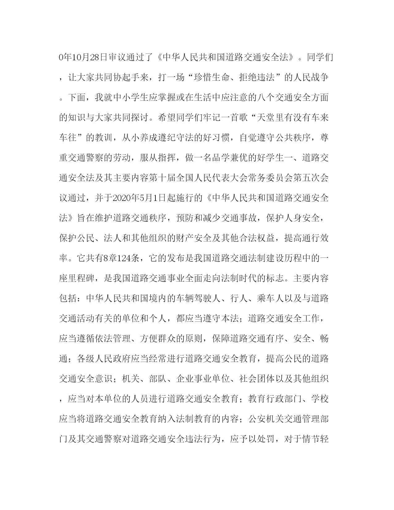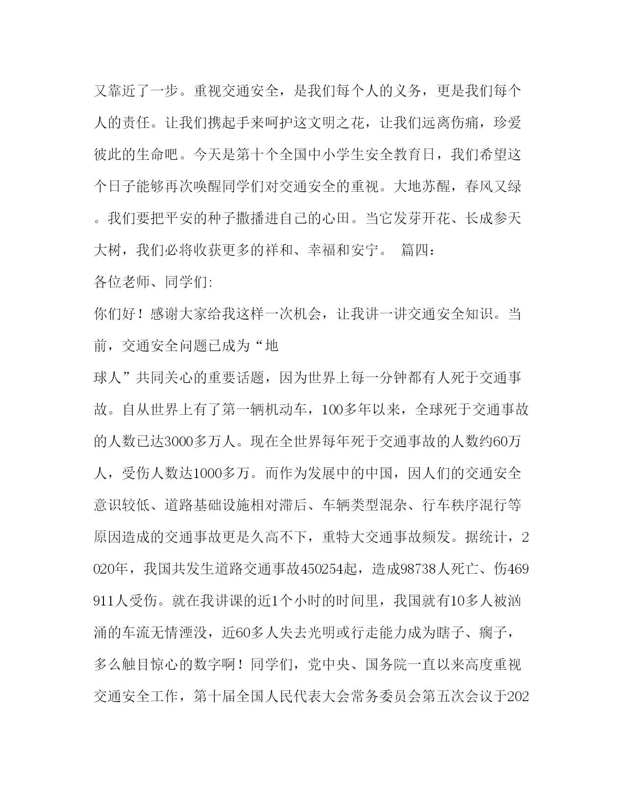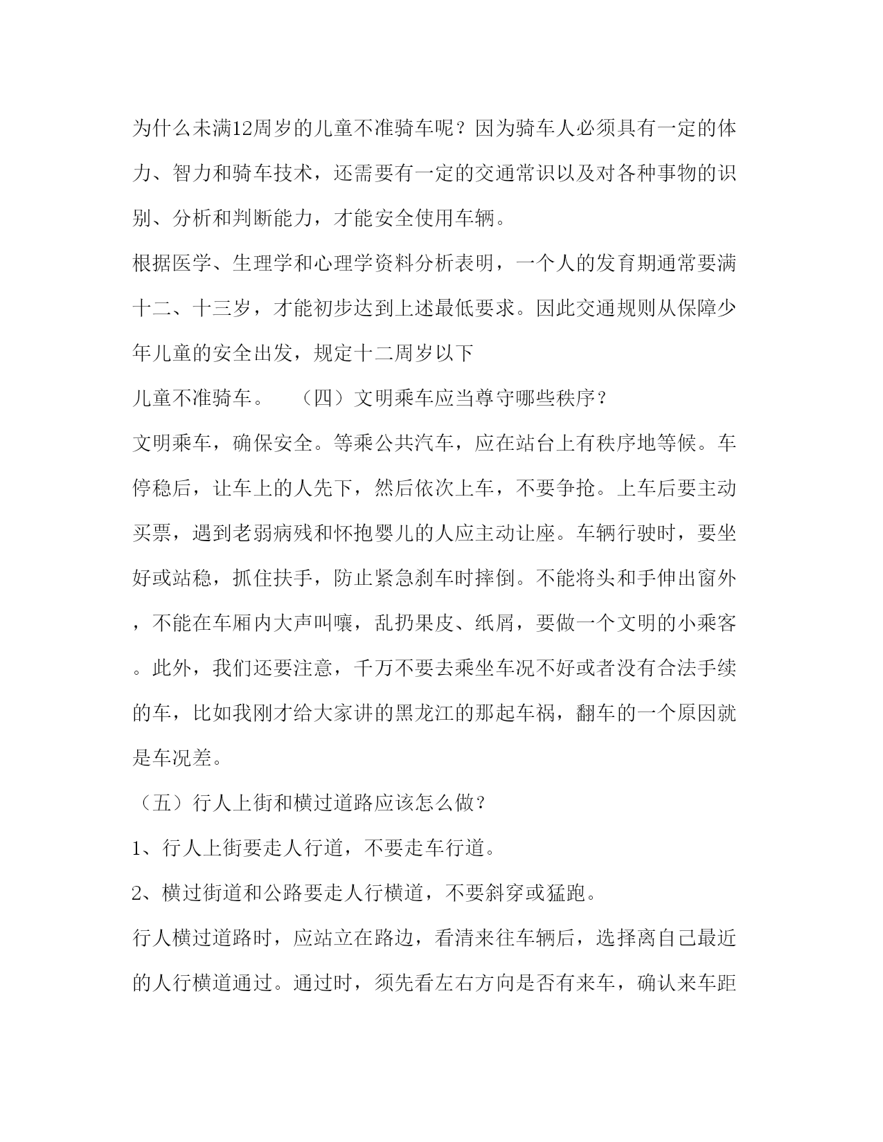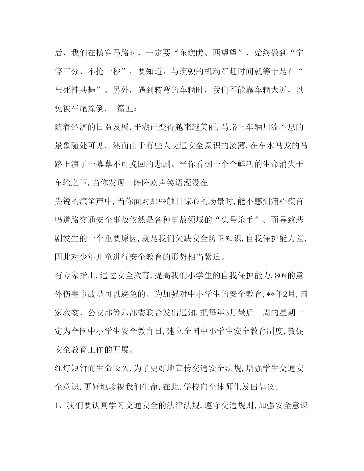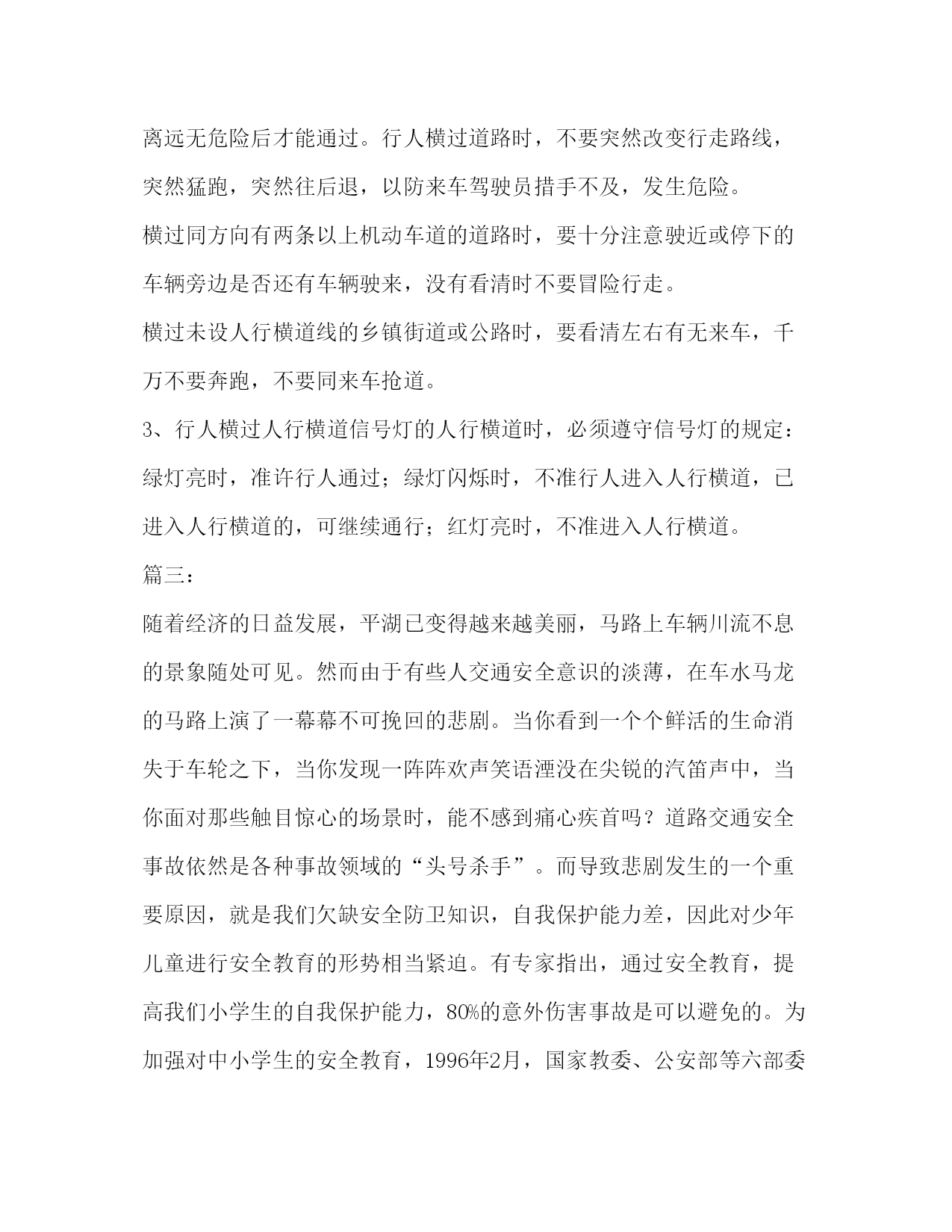PAGE此资料由网络收集而来,如有侵权请告知上传者立即删除。资料共分享,我们负责传递知识。学习交通安全知识演讲稿篇一:交通安全教育演讲稿篇一:交通安全教育演讲稿范文同学们,就在全国第九个中小学生安全教育日前后,全国发生了多起安全事故。xx年2月8日晚,湖北省红岩中学学生宿舍发生火灾,烧毁房屋三间、床铺、被褥等物品,损失1.5万余元;xx年3月25日,安徽省太和县坟台中学和坟台小学联合举办法制报告会,学生在上厕所时,由于人多拥挤,导致墙体倒塌,致使1名学生死亡,1名学生被砸伤;xx年3月27日,湖南省益阳市安化县发生了一起车辆违章行驶,车速过快,在道路拐变处发生翻车,30名受伤乘客中有12名中、小学生;xx年3月28日,我省张家港市梁丰中学组织学生春游,在返回途中发生重大道路交通事故,造成9人死亡,24人受伤;xx年3月29日,我省南通市如东县双甸高级中学因食用不卫生的食物37名同学中毒。在看我们学校,由于少数同学课间乱跑、打斗,发生同学之间相撞、摔伤等安全事故多起。上个月五年级有个同学,中午放学铃响过,他就冲出教室,追打同学,自己摔在楼梯口,摔断了骨头,花了一万多元,目前身上还留着钢板,六个月后还要开第二刀。同学们听了上述一笔笔血的教训后,不知道你们想了什么。我想,同学们至少会想到:这些教训无论发生在谁的身上会给受害者人身造成伤害、甚至死亡;会给受害者家庭造成极大的损失;会给学校正常教学秩序造成混乱;会给社会造成不稳定影响。至少会想到:假如我们平时重视交通安全,遵守交通规则,就不会出现交通事故,起码可以减少;假如我们注意饮食卫生,不食路边摊点不卫生食品,就不会发生食物中毒;假如我们不从楼梯的扶手上下滑,上下楼梯靠右行,假如我们课间不追逐打闹,不翻爬院墙,不用石子乱砸??我们就会少发生,甚至不发生流血事件。至少会想到:这些伤害事件是能避免的。有关专家认为,通过教育和预防,80%的中小学生意外伤害事故是可以避免的。安全第一,警钟常鸣,希望我们每一个学生都要做到:1、遵守交通规则,注意交通安全,骑车同学要不骑英雄车,骑车不带人,步行同学过马路时要走斑马线,穿过马路要左右看看,等到没有车辆通过时,方可过去。2、不吃路边摊点上的不卫生食品,有病要及时到医院就诊。3、课间不追逐、不打闹,上下楼梯靠右行,不从楼梯的扶手上上下滑,行至拐变处,要放慢脚步,预防相撞。4、运动时,要遵守运动规则,注意自我保护。5、不翻爬院墙,即使是球出院墙,也不允许翻院墙,可告知老师,用其他方法解决,要杜绝用石子砸人。同学们,希望我们每天平平安安到校,高高兴兴回家,让我们一起来创建我们的平安校园吧。篇二:下面我先给大家讲一下交通法规中和我们有关的一些规定:(一)交通法规对行人的要求有哪些?很多时候,我们上公路都是步行的,所以我们先来了解一下交通法规对行人的要求。交通法规对行人的要求有:1、遵守车辆、行人各行其道的规定,借道通行时,应当让在其本道内行驶的车辆或行人优先通行;2、遵守“红灯停、绿灯行、黄灯闪烁多注意”的原则;3、必须遵守交通标志和标线的规定,服从交通警察的指挥与管理;4、不要在道路上爬车、追车、强行拦车、抛物击车或在道路上躺卧、纳凉、聚众围观等;5、不要强迫、纵容他人违反交通法规,同时对任何人违反交通法规都有劝阻和控告的权利。(二)在放学和集体外出时应怎样做?在放学路上,要遵守纪律排好队,在教师的护送下,有秩序地在人行道上行走。过马路时,要走人行横道。我们走路要走人行道。在没有人行道的地方,应靠路边行走。走路时,思想要集中,不能一边走一边玩耍或一边看书,不能三五成群并排行走,更不能追赶车辆嬉戏打闹。集体外出活动,要有教师的带领,排成两列纵队,在人行道上行走。不要随便离开队伍。不要在队伍里你推我拉,嬉戏打闹。不做妨碍交通安全的事,不在交通拥挤的地方集队、停留,以免影响他人通行。过公路时,应走人行横道。在没有人行横道的路段要看清路面情况,在没有车辆行驶时,抓紧时间通过。(三)未满12周岁的儿童不准骑车。为什么未满12周岁的儿童不准骑车呢?因为骑车人必须具有一定的体力、智力和骑车技术,还需要有一定的交通常识以及对各种事物的识别、分析和判断能力,才能安全使用车辆。根据医学、生理学和心理学资料分析表明,一个人的发育期通常要满十二、十三岁,才能初步达到上述最低要求。因此交通规则从保障少年儿童的安全出发,规定十二周岁以下儿童不准骑车。(四)文明乘车应当尊守哪些秩序?文明乘车,确保安全。等乘公共汽车,应在站台上有秩序地等候。车停稳后,让车上的人先下,然后依次上车,不要争抢。上车后要主动买票,遇到老弱病残和怀抱婴儿的人应主动让座。车辆行驶时,要坐好或站稳,抓住扶手,防止紧急刹车时摔倒。不能将头和手伸出窗外,不能在车厢内大声叫嚷,乱扔果皮、纸屑,要做