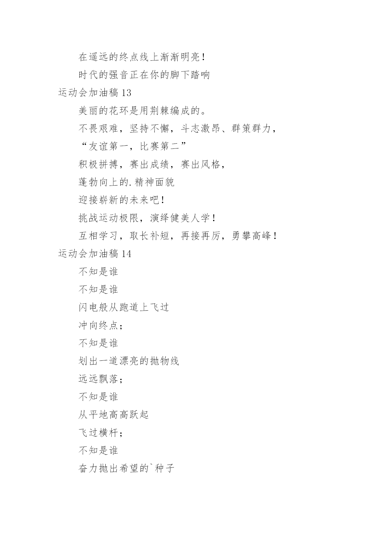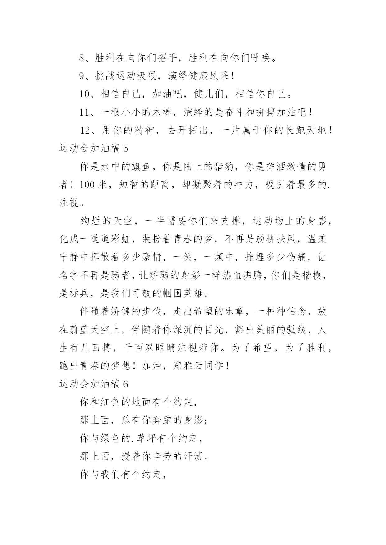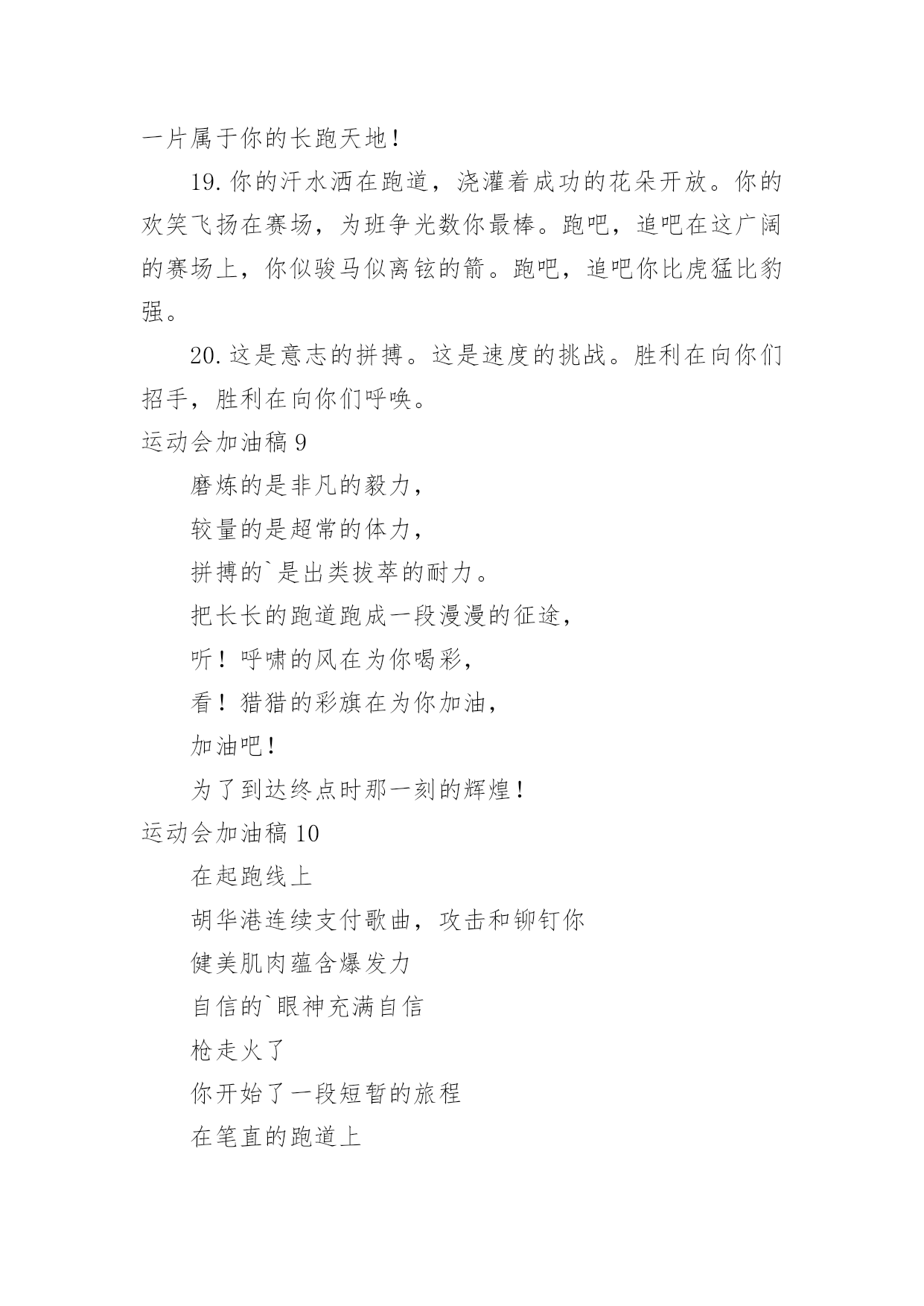 运动会加油稿(优选)运动会加油稿15篇在不断进步的社会中,越来越多地方需要用到加油稿,借助加油稿可以表达对对方的鼓励和支持。相信很多朋友都对写加油稿感到非常苦恼吧,下面是小编收集整理的运动会加油稿,欢迎大家借鉴与参考,希望对大家有所帮助。运动会加油稿1微微的风,远远的地方吹来一阵微风,夹着轻轻的私语。侧耳仔细听,那是同学们的加油声,裁判的枪声,就像一种音乐,为我校第xx届运动会伴奏的音乐。夏夜蛙虫的鸣唱,春晨鸟雀的啾唧,这些自然的声音都不及一声枪响令人震惊,似乎身体里的血液都为之沸腾。我们怀着期待的心情,绚丽的梦理,像每一个传说里的'英雄一样,把梦想和汗水一起调和密封,然后潜心等待那注定的时刻。加油啊,xx班,我们或许会忘记童年生活的美好点滴,但我们不会忘记操场上有你那矫健的身影。运动会加油稿2激情与呐喊幻化为无穷的力量,盘旋而上直击青天。万里碧空映照着扆山学子的活力、青春、团结与智慧。黑白跑道间一次又一次的追逐,沙坑中腾起的一阵又一阵沙幕,跳高区的一次又一次飞跃,草坪上伴着尘土的一次又一次的齐心协力。无不深深印烙在我的.记忆。运动会的角逐接近尾声,但运动、团结之韵将高声奏响。中学阶段另一个激烈的赛场等着我们,跑步高歌上大学是我们不懈的追求。加油吧,运动员们,加油吧,扆山学子,当磨砺的锋剑直击天空,必将先芒万丈,来自苦寒的红梅,必将香飘万里!运动会加油稿3看!那一面面迎风飘舞的彩旗,是一朵朵盛开的鲜花;听!那一阵阵惊天动地的欢呼,是回响在耳边胜利的风声。运动场上的`你们,是胜利的标志,运动场上的你们,是青春的赞叹。去吧!去迎接那伟大的挑战,去吧!去做一名追风的少年。你的汗水洒在跑道,浇灌着成功的花朵开放。你的欢笑飞扬在赛场,为班争光数你最棒。跑吧,追吧,在这广阔的赛场上,你似骏马似离弦的箭。跑吧,追吧你比虎猛比豹强!,加油!你最棒!运动会加油稿41、加油吧,运动员!终点就在我们眼前!2、坚持的信念是我们期盼的眼神,加油吧健儿们。3、看,那健儿们奋勇拼搏的身影!4、离开起点,是一种勇气。驰骋赛场,是一种胜利。5、论何成功,谈何荣辱,心中的.信念只有一个:拼搏!6、亲爱的健儿们,向前冲!我们在为你鼓掌。7、让我们一起高呼:我们能行我们能赢!8、胜利在向你们招手,胜利在向你们呼唤。9、挑战运动极限,演绎健康风采!10、相信自己,加油吧,健儿们,相信你自己。11、一根小小的木棒,演绎的是奋斗和拼搏加油吧!12、用你的精神,去开拓出,一片属于你的长跑天地!运动会加油稿5你是水中的旗鱼,你是陆上的猎豹,你是挥洒激情的勇者!100米,短暂的距离,却凝聚着的冲力,吸引着最多的.注视。绚烂的天空,一半需要你们来支撑,运动场上的身影,化成一道道彩虹,装扮着青春的梦,不再是弱柳扶风,温柔宁静中挥散着多少豪情,一笑,一频中,掩埋多少伤痛,让名字不再是弱者,让矫弱的身影一样热血沸腾,你们是楷模,是标兵,是我们可敬的帼国英雄。伴随着矫健的步伐,走出希望的乐章,一种种信念,放在蔚蓝天空上,伴随着你深沉的目光,豁出美丽的弧线,人生有几回搏,千百双眼睛注视着你。为了希望,为了胜利,跑出青春的梦想!加油,郑雅云同学!运动会加油稿6你和红色的地面有个约定,那上面,总有你奔跑的身影;你与绿色的.草坪有个约定,那上面,浸着你辛劳的汗渍。你与我们有个约定,说你必须要赢,也必须会赢。枪声响了四百米九秒却又相几个世纪你喊着跑着迈开大步跨过世纪致接力赛小小接力棒,连着你和我,牵着你的情,动着我的心。这是团结的象征,这是友谊的传递者。把握这天,创造辉煌的明天!写给接力赛小小接力棒,棒棒有力量,传出了友谊,传出了默契,传出了期望。每一次接力棒的交接,无不凝积着大家的希冀,那是充满团结的力量之棒!甩开鹰是的双臂,迈开闪电似的双腿,加油吧!运动会加油稿7走在队伍最前面的是我们一年级的小朋友。看!他们穿着整齐的服装,挥动着手中的小旗,正向主席台走来。别看他们年纪小,个个都精神抖擞,充满生机,充满活力,一张张天真无邪的.笑脸上洒满灿烂的阳光,他们是这次运动会的新生力量,多像是一群可爱的小天使哟!相信他们一定会以自己出色的表现为运动会增添新的色彩。小小的运动健儿们,祝你们成为本届运动会上最亮丽的一道风景线。运动会加油稿81.心中坚定的信念,脚下沉稳的步伐,你用行动告诉我们一个不变之理,没有走不完的路,没有过不了的山,成功正在终点冲着你高高的招手,用你那顽强的意志去努力,去迎接终点的鲜花与掌声,相信成功必须是属于你。2.你用行动述说着过城的重要,没有无尽的终点,没有无法攀登的险峰,希望载着终点在向你微笑,拼搏吧!经历是一种精彩,迸发你全部的能量,成功是你汗水的写照。3.虽然你们在场上的时间很短暂,但你们的身影依然停留在人们的脑海里,因为你们是赛场上最可爱的人。4.萧瑟的秋风,挡不住你们破