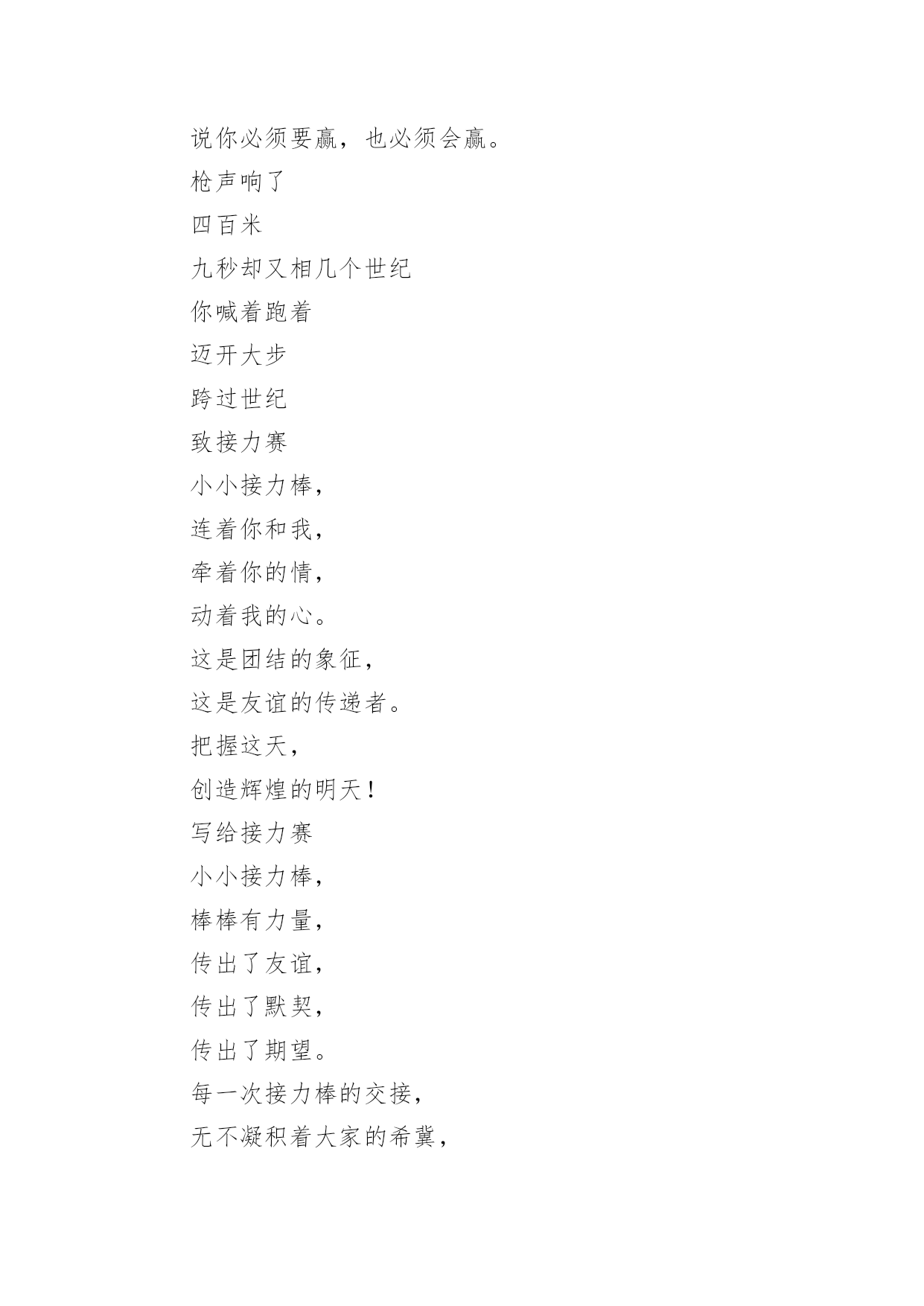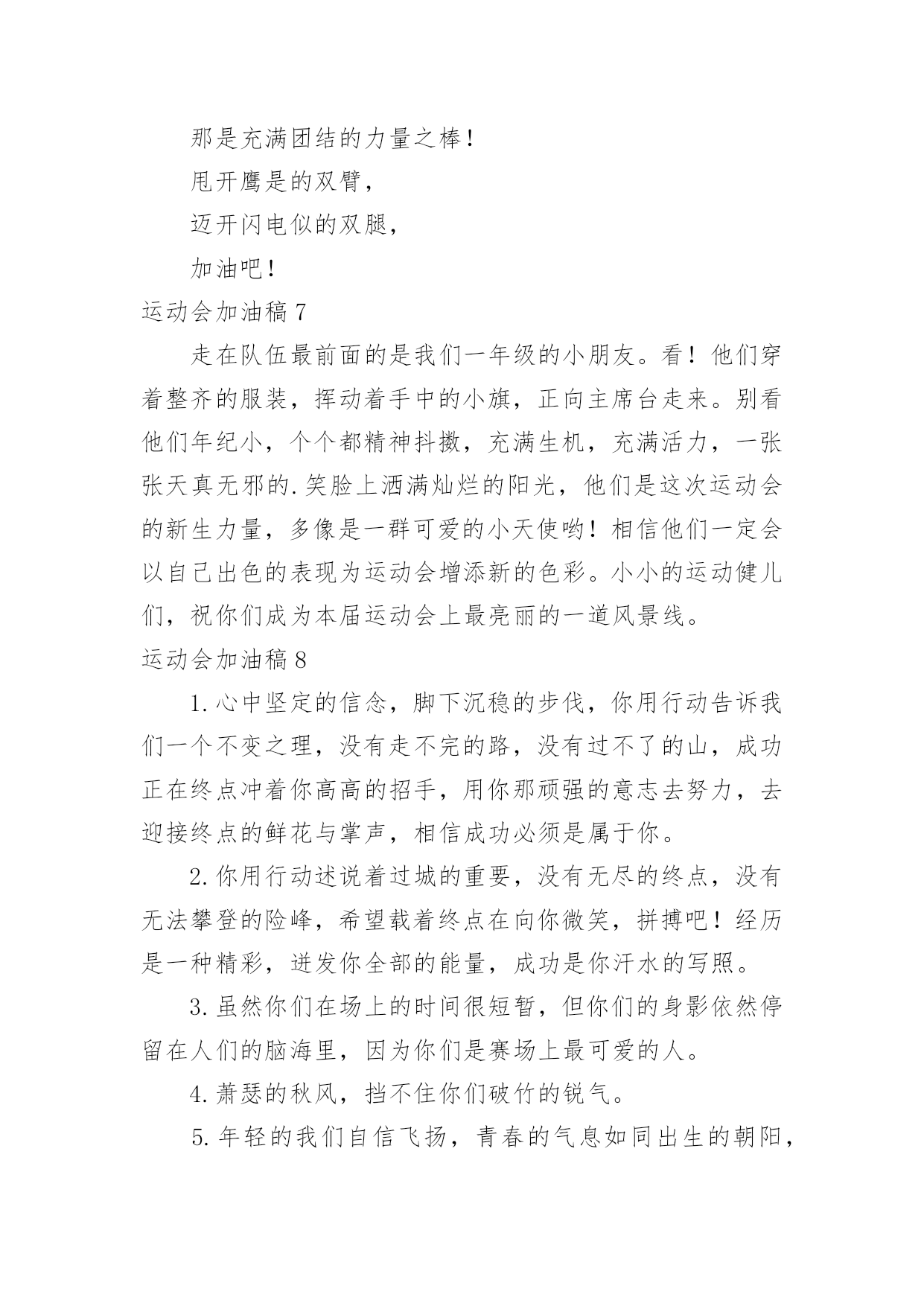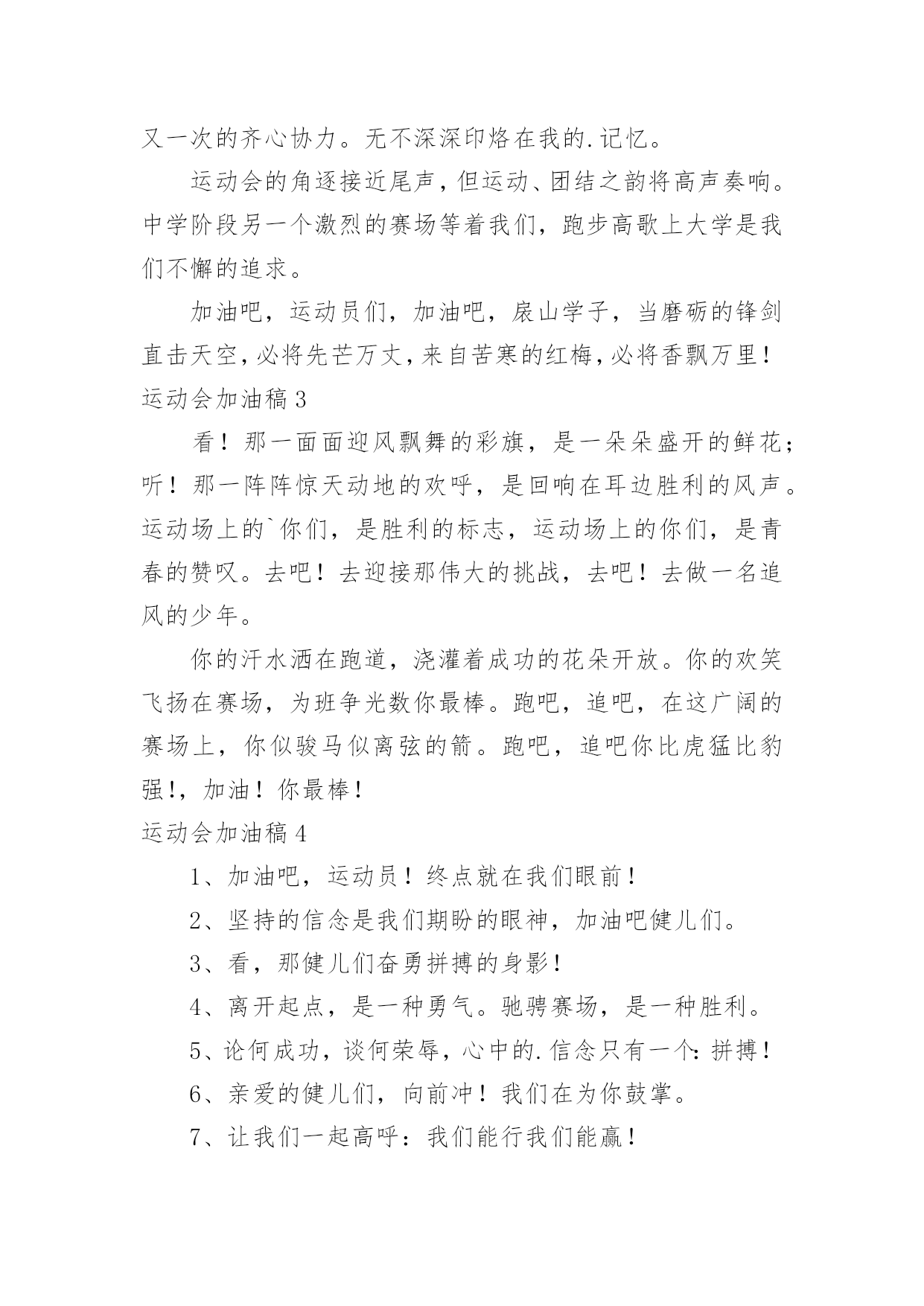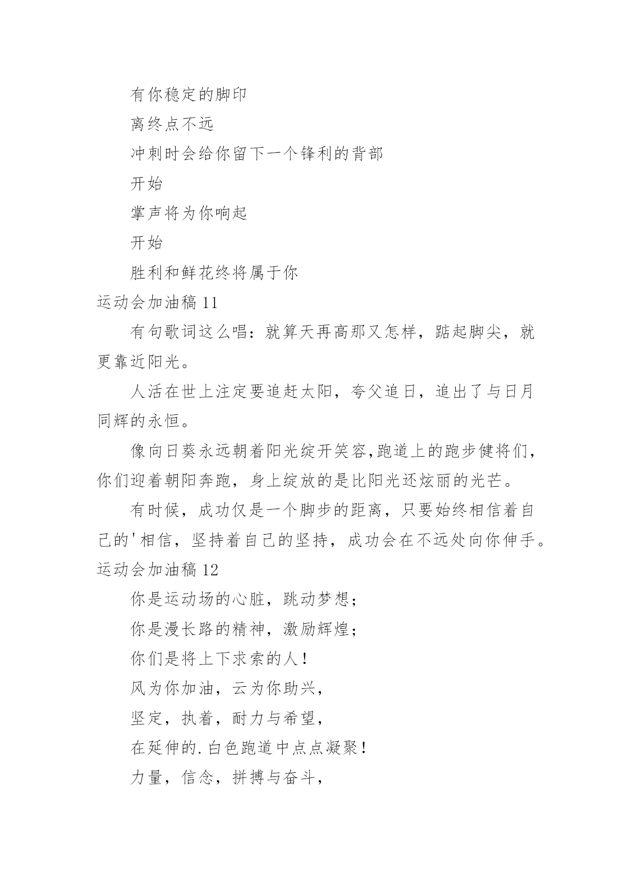 运动会加油稿(优选)运动会加油稿15篇在不断进步的社会中,越来越多地方需要用到加油稿,借助加油稿可以表达对对方的鼓励和支持。相信很多朋友都对写加油稿感到非常苦恼吧,下面是小编收集整理的运动会加油稿,欢迎大家借鉴与参考,希望对大家有所帮助。运动会加油稿1微微的风,远远的地方吹来一阵微风,夹着轻轻的私语。侧耳仔细听,那是同学们的加油声,裁判的枪声,就像一种音乐,为我校第xx届运动会伴奏的音乐。夏夜蛙虫的鸣唱,春晨鸟雀的啾唧,这些自然的声音都不及一声枪响令人震惊,似乎身体里的血液都为之沸腾。我们怀着期待的心情,绚丽的梦理,像每一个传说里的'英雄一样,把梦想和汗水一起调和密封,然后潜心等待那注定的时刻。加油啊,xx班,我们或许会忘记童年生活的美好点滴,但我们不会忘记操场上有你那矫健的身影。运动会加油稿2激情与呐喊幻化为无穷的力量,盘旋而上直击青天。万里碧空映照着扆山学子的活力、青春、团结与智慧。黑白跑道间一次又一次的追逐,沙坑中腾起的一阵又一阵沙幕,跳高区的一次又一次飞跃,草坪上伴着尘土的一次又一次的齐心协力。无不深深印烙在我的.记忆。运动会的角逐接近尾声,但运动、团结之韵将高声奏响。中学阶段另一个激烈的赛场等着我们,跑步高歌上大学是我们不懈的追求。加油吧,运动员们,加油吧,扆山学子,当磨砺的锋剑直击天空,必将先芒万丈,来自苦寒的红梅,必将香飘万里!运动会加油稿3看!那一面面迎风飘舞的彩旗,是一朵朵盛开的鲜花;听!那一阵阵惊天动地的欢呼,是回响在耳边胜利的风声。运动场上的`你们,是胜利的标志,运动场上的你们,是青春的赞叹。去吧!去迎接那伟大的挑战,去吧!去做一名追风的少年。你的汗水洒在跑道,浇灌着成功的花朵开放。你的欢笑飞扬在赛场,为班争光数你最棒。跑吧,追吧,在这广阔的赛场上,你似骏马似离弦的箭。跑吧,追吧你比虎猛比豹强!,加油!你最棒!运动会加油稿41、加油吧,运动员!终点就在我们眼前!2、坚持的信念是我们期盼的眼神,加油吧健儿们。3、看,那健儿们奋勇拼搏的身影!4、离开起点,是一种勇气。驰骋赛场,是一种胜利。5、论何成功,谈何荣辱,心中的.信念只有一个:拼搏!6、亲爱的健儿们,向前冲!我们在为你鼓掌。7、让我们一起高呼:我们能行我们能赢!8、胜利在向你们招手,胜利在向你们呼唤。9、挑战运动极限,演绎健康风采!10、相信自己,加油吧,健儿们,相信你自己。11、一根小小的木棒,演绎的是奋斗和拼搏加油吧!12、用你的精神,去开拓出,一片属于你的长跑天地!运动会加油稿5你是水中的旗鱼,你是陆上的猎豹,你是挥洒激情的勇者!100米,短暂的距离,却凝聚着的冲力,吸引着最多的.注视。绚烂的天空,一半需要你们来支撑,运动场上的身影,化成一道道彩虹,装扮着青春的梦,不再是弱柳扶风,温柔宁静中挥散着多少豪情,一笑,一频中,掩埋多少伤痛,让名字不再是弱者,让矫弱的身影一样热血沸腾,你们是楷模,是标兵,是我们可敬的帼国英雄。伴随着矫健的步伐,走出希望的乐章,一种种信念,放在蔚蓝天空上,伴随着你深沉的目光,豁出美丽的弧线,人生有几回搏,千百双眼睛注视着你。为了希望,为了胜利,跑出青春的梦想!加油,郑雅云同学!运动会加油稿6你和红色的地面有个约定,那上面,总有你奔跑的身影;你与绿色的.草坪有个约定,那上面,浸着你辛劳的汗渍。你与我们有个约定,说你必须要赢,也必须会赢。枪声响了四百米九秒却又相几个世纪你喊着跑着迈开大步跨过世纪致接力赛小小接力棒,连着你和我,牵着你的情,动着我的心。这是团结的象征,这是友谊的传递者。把握这天,创造辉煌的明天!写给接力赛小小接力棒,棒棒有力量,传出了友谊,传出了默契,传出了期望。每一次接力棒的交接,无不凝积着大家的希冀,那是充满团结的力量之棒!甩开鹰是的双臂,迈开闪电似的双腿,加油吧!运动会加油稿7走在队伍最前面的是我们一年级的小朋友。看!他们穿着整齐的服装,挥动着手中的小旗,正向主席台走来。别看他们年纪小,个个都精神抖擞,充满生机,充满活力,一张张天真无邪的.笑脸上洒满灿烂的阳光,他们是这次运动会的新生力量,多像是一群可爱的小天使哟!相信他们一定会以自己出色的表现为运动会增添新的色彩。小小的运动健儿们,祝你们成为本届运动会上最亮丽的一道风景线。运动会加油稿81.心中坚定的信念,脚下沉稳的步伐,你用行动告诉我们一个不变之理,没有走不完的路,没有过不了的山,成功正在终点冲着你高高的招手,用你那顽强的意志去努力,去迎接终点的鲜花与掌声,相信成功必须是属于你。2.你用行动述说着过城的重要,没有无尽的终点,没有无法攀登的险峰,希望载着终点在向你微笑,拼搏吧!经历是一种精彩,迸发你全部的能量,成功是你汗水的写照。3.虽然你们在场上的时间很短暂,但你们的身影依然停留在人们的脑海里,因为你们是赛场上最可爱的人。4.萧瑟的秋风,挡不住你们破