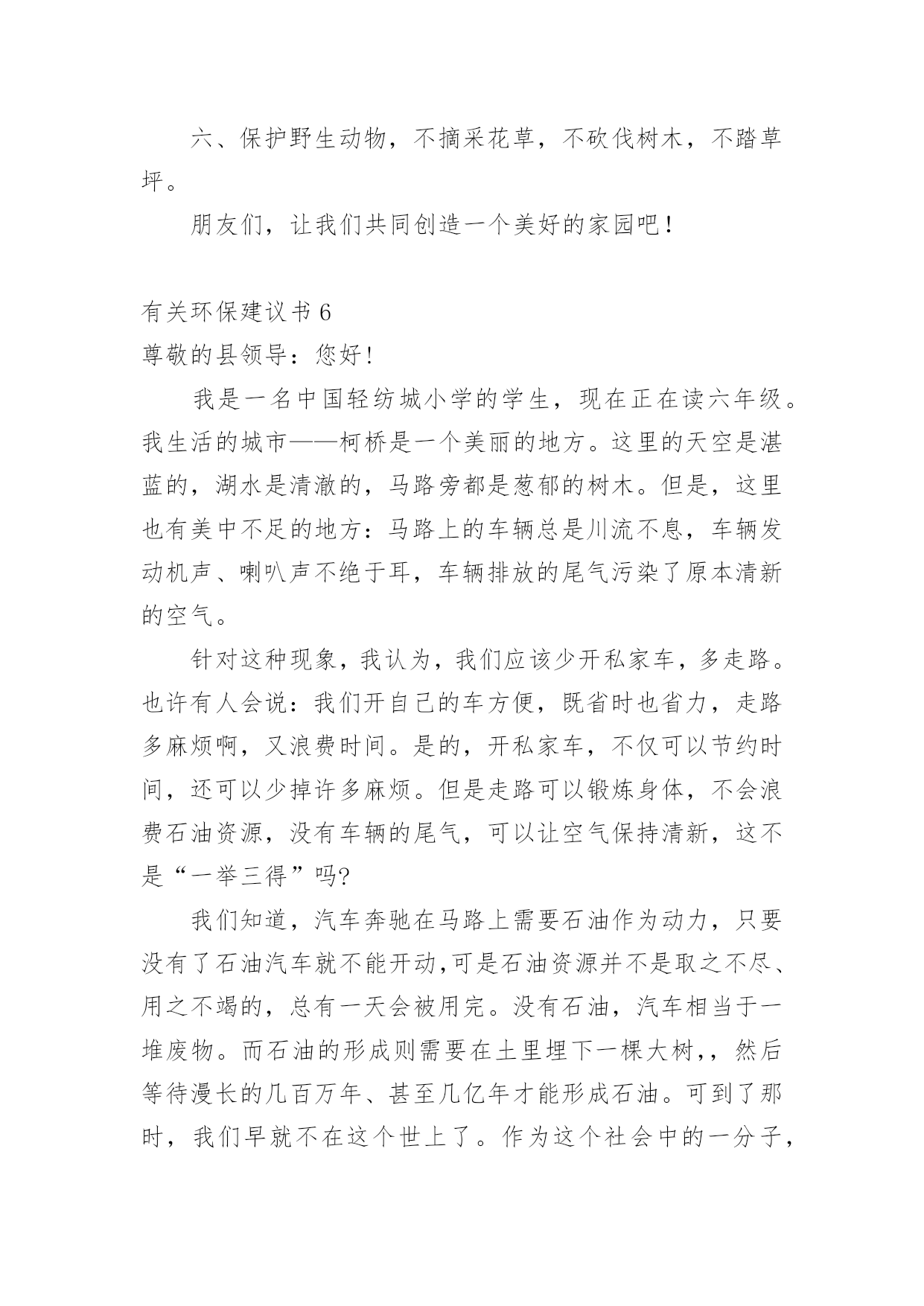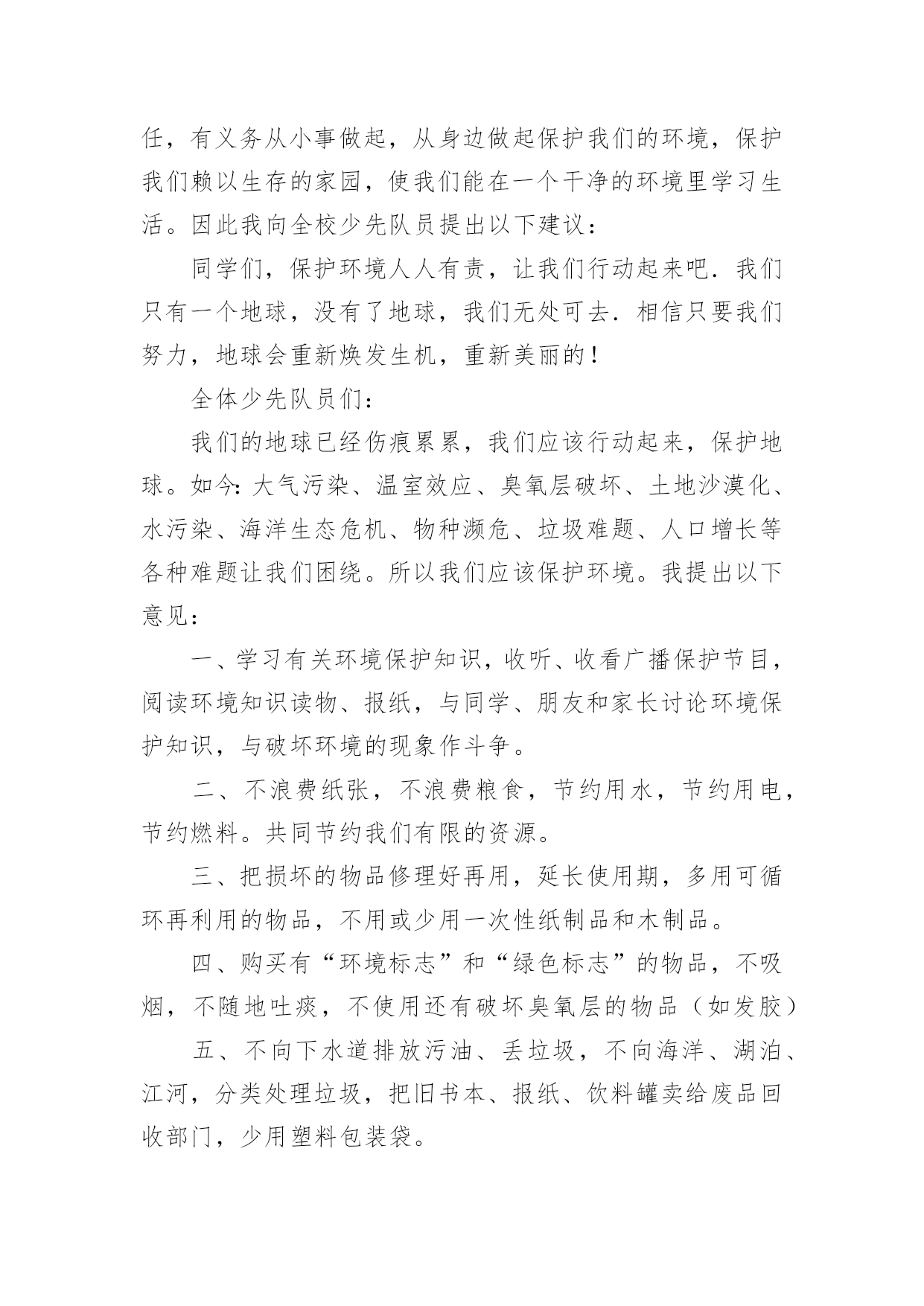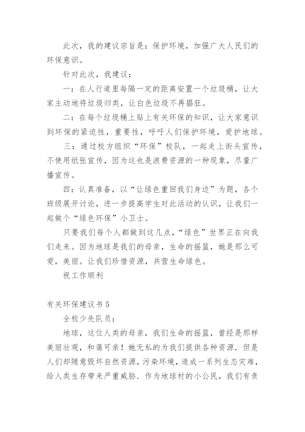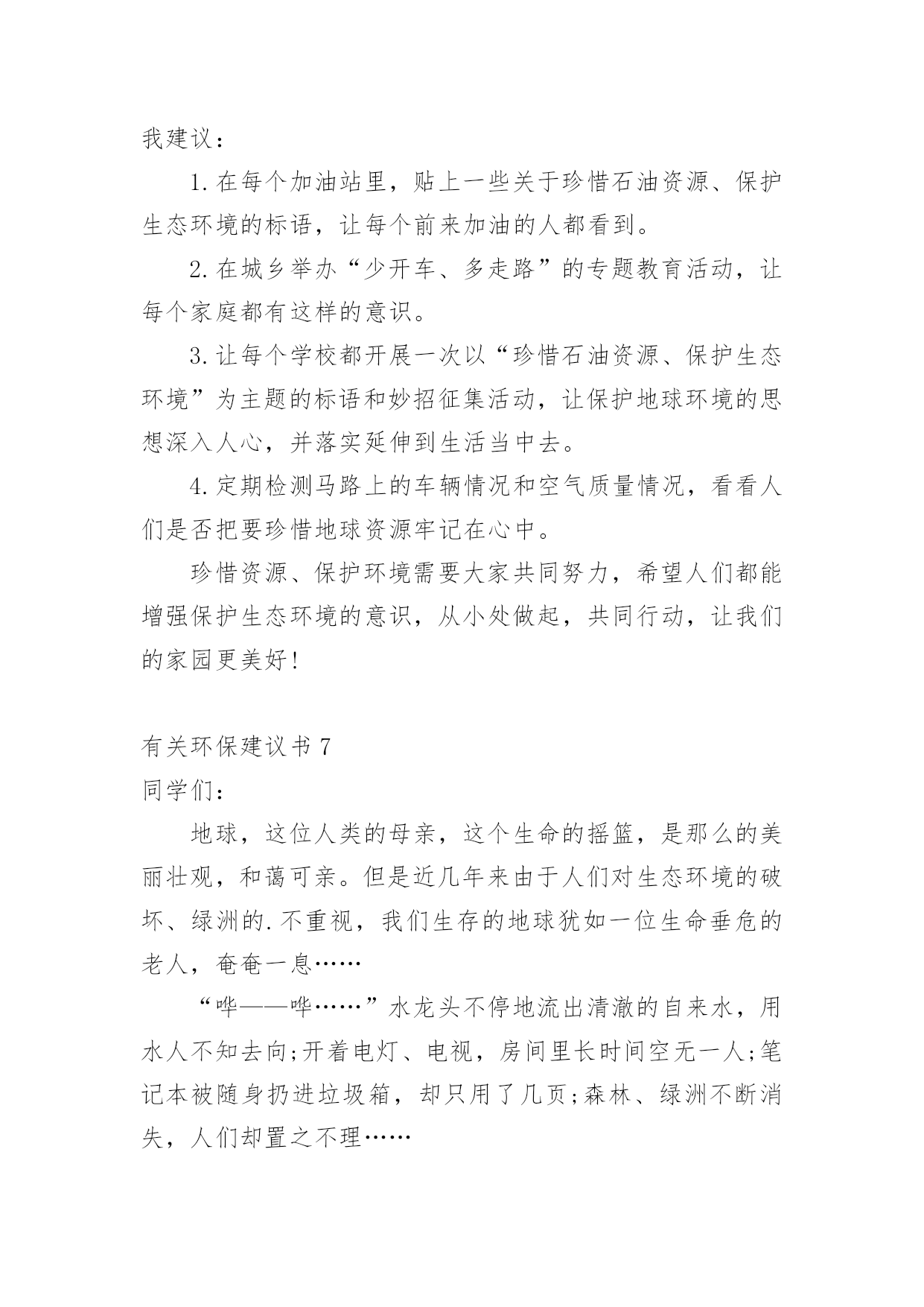 环保建议书有关环保建议书(集合15篇)在现在的社会生活中,建议书的使用频率越来越高,建议书是一连串的管理实践,往往有着至关重要的作用。如何写一份恰当的建议书呢?以下是小编整理的有关环保建议书,希望能够帮助到大家。有关环保建议书1尊敬的校领导:我在美丽的光华学校已经呆了六年之久了,校园的大花坛,五彩缤纷,各种各样的花汇聚一坛,犹如奥林匹克的火坛的翻版。校园的小树林,春天,嫩绿的树枝冒出一个个可爱的小绿头;夏天,绿树成荫,是大部分学生休闲、娱乐的好去处;秋天,一棵棵树都披上了淡黄的衣装;冬天,积雪漫漫,校园披上雪白的冬衣,犹如雪上的乐园。校园的后操场,一眼望去,都是绿油油的草坪,躺在草坪上,风儿拂过,令人神清气爽。但是,在这环境优美,学风纯朴的美丽校园里,也有些不尽人意的地方。例如:一到运动会之时,草坪上就有许多垃圾,塑料袋,食品包装袋,一次性的水杯遍地都是,这些都是同学们的“杰作”,这些杰作不仅给绿油油的草坪来了一个“绚丽的装饰”,更给人一种厌恶的气息。不仅仅如此,每周星期六,同学们这天下午可以去买零食、可以自由活动……但是在同学们休闲放松的时候,也是他们制造垃圾的时候。教室里,走廊上到处都是同学们扔的垃圾,清洁工老爷爷弓着腰要干到很晚才能清理干净。由此,我向校领导提出以下几点建议:1。开展“环保小卫士”的活动,组织同学们将可回收垃圾收集起来,并到有关地点换取相关的奖励。2。组织一次大扫除活动,让全体同学们来打扫教学楼,打扫校园,体会一下清洁工叔叔阿姨的辛苦,增强环保的意识。3。举办讲座,用一些事例教育同学们保护环境,少用一次性产品,减少白色污染。4、在校园的每一个地方都贴上保护环境的标语,让同学们时时刻刻地记住这些标语,并能用自己的行动去保护环境。尊敬的校领导,我希望我们要像爱爸爸妈妈那样爱我们的校园,让校园在我们的精心呵护下变得更加绚丽多姿、让我们行动起来,让美丽的校园抹上一层七彩的荧光吧!有关环保建议书2尊敬的市民们:你是否知道,地球资源正在枯竭?你又是否知道,全世界平均每分钟损失耕地40万平方米,11万平方米土地沙漠化,排入江河污水85万吨……而这些问题的原因都来自人类。千年林消失在无情的刀斧下;超市中的人们接二连三地拿走塑料袋;数不胜数的一次性餐具被埋进土里;清洁用水不可再循环使用,只能流入下水道;人不在房间里,房间里的电器却还开着……甚至连3件衣服都要洗衣机来洗!这些看似无关大事的细节,合起来却是一个又一个惊心动魄的数据。而这背后,都是因为人们缺乏环境保护意识,缺乏危机感,任由自己带着贪婪的目光,把地球破坏得惨不忍睹,限塑令成了纸上谈兵。我们或许认为撕掉一张还可以用的纸,浪费一粒米,流掉一小堆水没有关系,但你是否算过全国的用量?这都是造成地球资源枯竭的原因。我们必须做到低碳环保生活,让以上事情成为过去。现在,让我来提几条建议:一、出门尽量骑单车,或者乘公交、地铁,最好不开私家车。二、超市购物用专门的购物袋,减少塑料袋的使用次数。三、学会垃圾分类,将可回收物单独放置,一段时间后交给有关部门制作再生物品。四、淘米水洗菜,洗菜水浇花,尽量手洗衣服,尽可能循环用水。五、作业纸等纸类相对干净,可以用来折纸或当草稿,最好是送到可回收垃圾桶,等待相关工厂做再生纸。俗说“滴水成河,粒米成箩”,“善待地球就是善待自己”。希望你们能采纳我的建议,尽自己的一份力来保护地球母亲!有关环保建议书3广大市民们:你们好!地球,这位人类的母亲,这个生命的摇篮,是那样的美丽壮观,和蔼可亲。但是,由于我们的滥砍滥伐,由于我们随意毁坏自然环境——地球那头美丽的秀发变得稀稀疏疏;地球那饱满的身躯变得骨瘦如柴;地球那容光焕发的面孔变得皱皱巴巴。一条条“皱纹”刻在了“母亲”的脸上!看看我们身边:一些工厂为了自身的利益,肆意破坏自然资源,那原本清澈见底的小溪,碧波荡漾的河水,现在变得混浊不堪、臭气熏天!马路上的那些川流不息的汽车尾部,喷出的一团团黑色烟雾,好似一条条张牙舞爪的黑龙,破坏了城市的环境,毁坏着人们的身心!为了让地球母亲展开那久违的笑容,我还想向大家发出一些忠告:1、不要乱丢乱扔,影响市容市貌!2、出门时不要忘记关灯,以免浪费一度电!3、洗完手请立即关水龙头,以免浪费一滴水!4、不要在公共场所吸烟,既对自身不好,还污染空气!5、养宠物的市民请不要让狗狗随地大小便,既污染环境,又污染风景!6、我们要爱护树木花草,不要随便砍伐,践踏绿色树木和草地,种一棵树就开辟了一片新蓝天!9、一只小小的塑料袋在我们的生活中是微不足道的,它大约0.4克。可是我们每天只消费一个,就会产生4吨的塑料袋垃圾,所以请不要用塑料袋,减少白色污染!10、每个人都有享受一次性筷子的权利。或许你不曾想过,哪怕我们每一个人这辈子只用过一次,我国也得砍掉15万棵生长了20年的大树。我国每