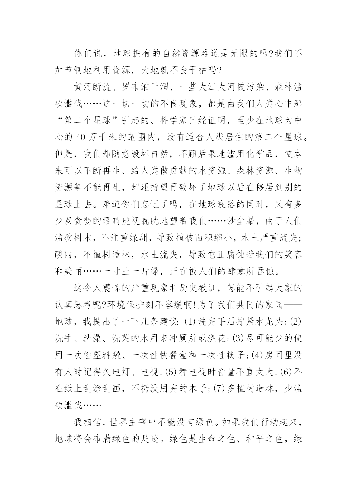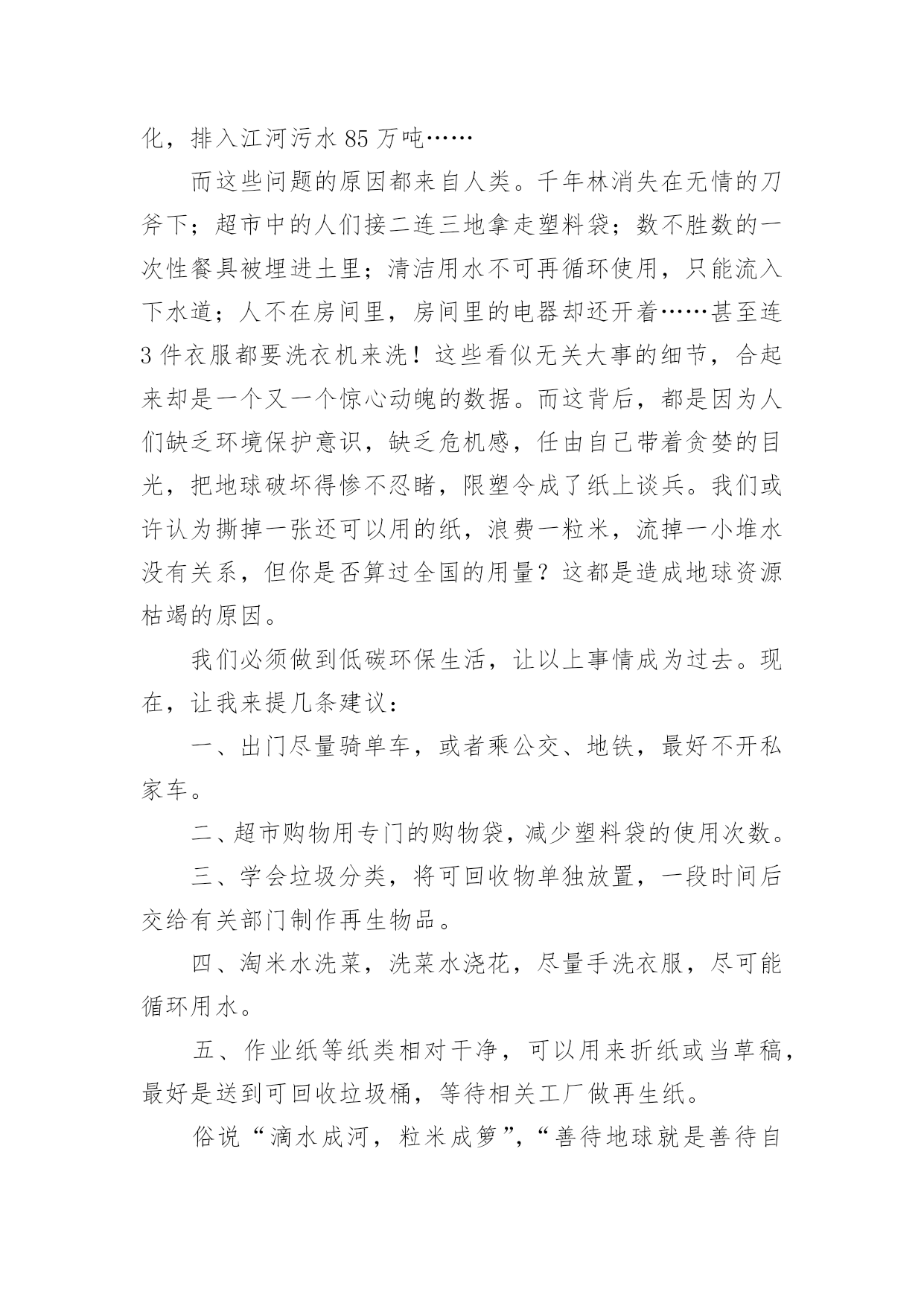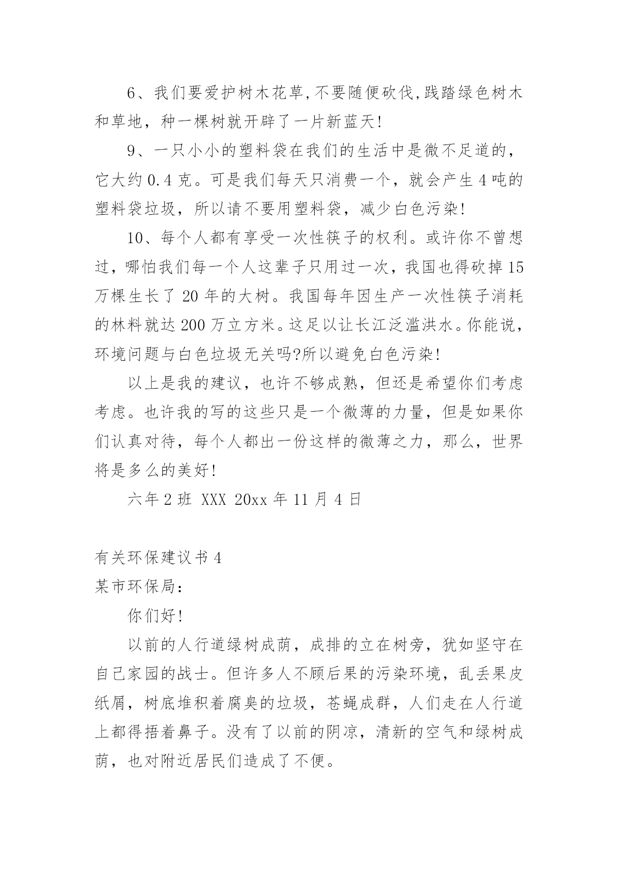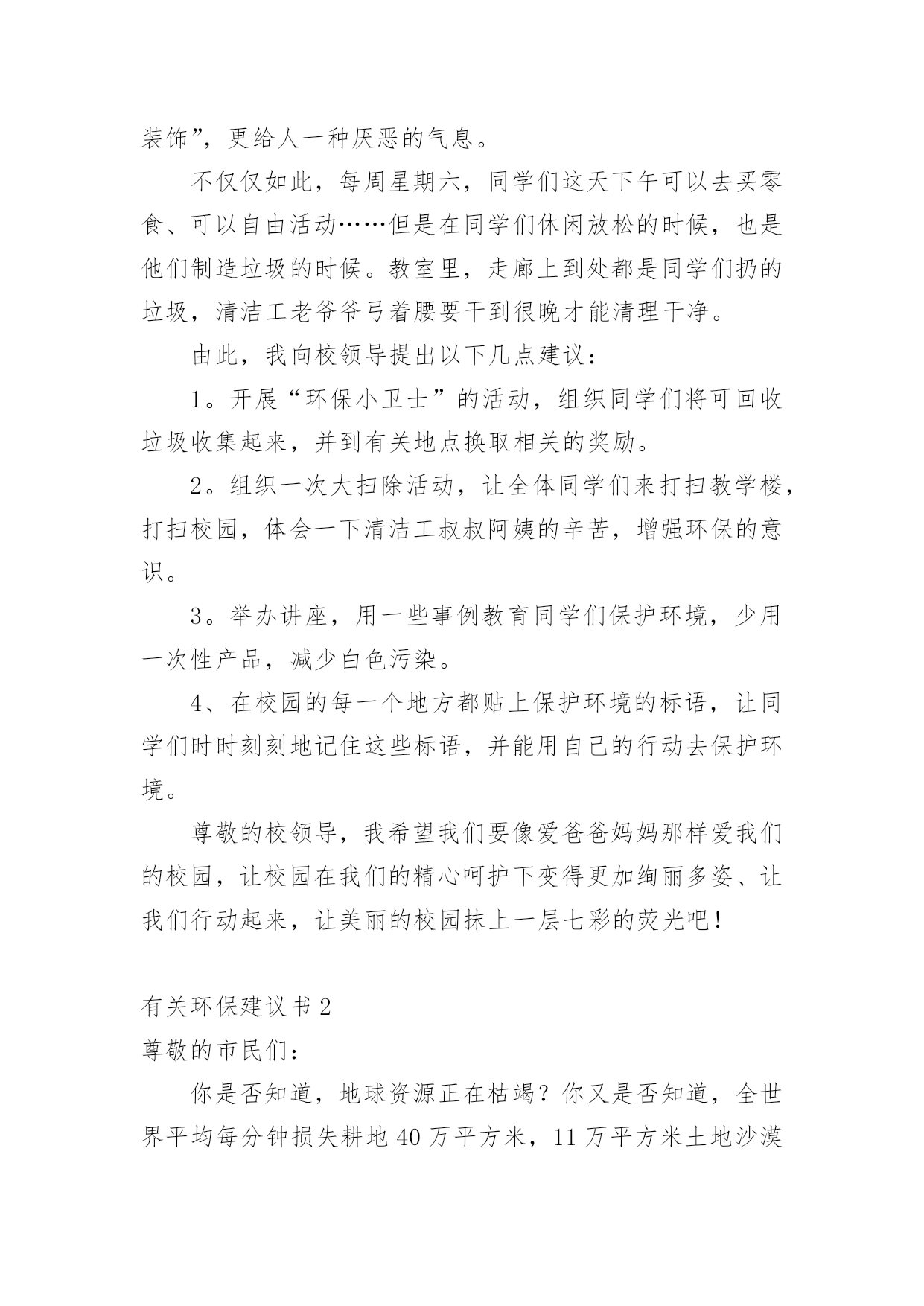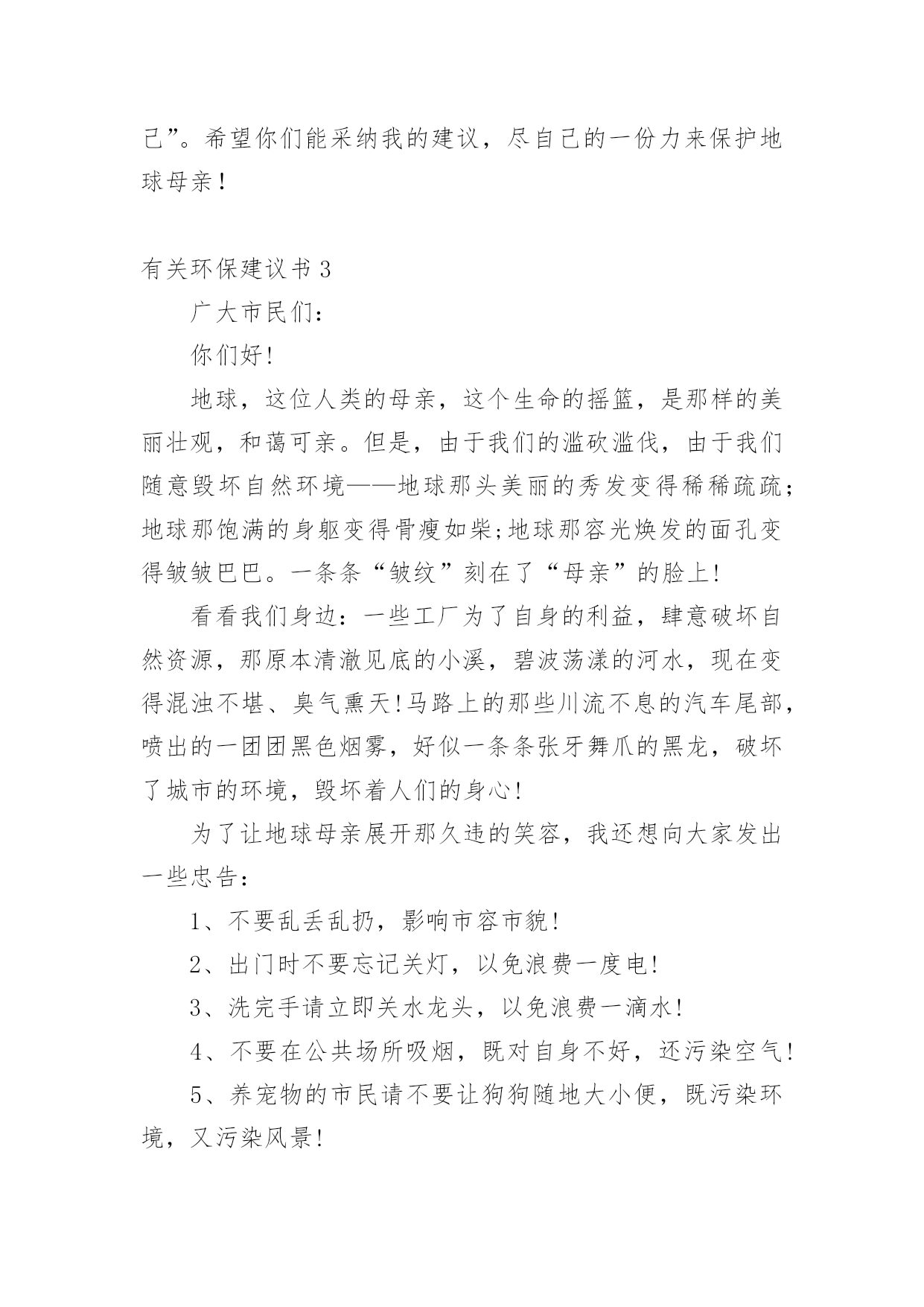 环保建议书有关环保建议书(集合15篇)在现在的社会生活中,建议书的使用频率越来越高,建议书是一连串的管理实践,往往有着至关重要的作用。如何写一份恰当的建议书呢?以下是小编整理的有关环保建议书,希望能够帮助到大家。有关环保建议书1尊敬的校领导:我在美丽的光华学校已经呆了六年之久了,校园的大花坛,五彩缤纷,各种各样的花汇聚一坛,犹如奥林匹克的火坛的翻版。校园的小树林,春天,嫩绿的树枝冒出一个个可爱的小绿头;夏天,绿树成荫,是大部分学生休闲、娱乐的好去处;秋天,一棵棵树都披上了淡黄的衣装;冬天,积雪漫漫,校园披上雪白的冬衣,犹如雪上的乐园。校园的后操场,一眼望去,都是绿油油的草坪,躺在草坪上,风儿拂过,令人神清气爽。但是,在这环境优美,学风纯朴的美丽校园里,也有些不尽人意的地方。例如:一到运动会之时,草坪上就有许多垃圾,塑料袋,食品包装袋,一次性的水杯遍地都是,这些都是同学们的“杰作”,这些杰作不仅给绿油油的草坪来了一个“绚丽的装饰”,更给人一种厌恶的气息。不仅仅如此,每周星期六,同学们这天下午可以去买零食、可以自由活动……但是在同学们休闲放松的时候,也是他们制造垃圾的时候。教室里,走廊上到处都是同学们扔的垃圾,清洁工老爷爷弓着腰要干到很晚才能清理干净。由此,我向校领导提出以下几点建议:1。开展“环保小卫士”的活动,组织同学们将可回收垃圾收集起来,并到有关地点换取相关的奖励。2。组织一次大扫除活动,让全体同学们来打扫教学楼,打扫校园,体会一下清洁工叔叔阿姨的辛苦,增强环保的意识。3。举办讲座,用一些事例教育同学们保护环境,少用一次性产品,减少白色污染。4、在校园的每一个地方都贴上保护环境的标语,让同学们时时刻刻地记住这些标语,并能用自己的行动去保护环境。尊敬的校领导,我希望我们要像爱爸爸妈妈那样爱我们的校园,让校园在我们的精心呵护下变得更加绚丽多姿、让我们行动起来,让美丽的校园抹上一层七彩的荧光吧!有关环保建议书2尊敬的市民们:你是否知道,地球资源正在枯竭?你又是否知道,全世界平均每分钟损失耕地40万平方米,11万平方米土地沙漠化,排入江河污水85万吨……而这些问题的原因都来自人类。千年林消失在无情的刀斧下;超市中的人们接二连三地拿走塑料袋;数不胜数的一次性餐具被埋进土里;清洁用水不可再循环使用,只能流入下水道;人不在房间里,房间里的电器却还开着……甚至连3件衣服都要洗衣机来洗!这些看似无关大事的细节,合起来却是一个又一个惊心动魄的数据。而这背后,都是因为人们缺乏环境保护意识,缺乏危机感,任由自己带着贪婪的目光,把地球破坏得惨不忍睹,限塑令成了纸上谈兵。我们或许认为撕掉一张还可以用的纸,浪费一粒米,流掉一小堆水没有关系,但你是否算过全国的用量?这都是造成地球资源枯竭的原因。我们必须做到低碳环保生活,让以上事情成为过去。现在,让我来提几条建议:一、出门尽量骑单车,或者乘公交、地铁,最好不开私家车。二、超市购物用专门的购物袋,减少塑料袋的使用次数。三、学会垃圾分类,将可回收物单独放置,一段时间后交给有关部门制作再生物品。四、淘米水洗菜,洗菜水浇花,尽量手洗衣服,尽可能循环用水。五、作业纸等纸类相对干净,可以用来折纸或当草稿,最好是送到可回收垃圾桶,等待相关工厂做再生纸。俗说“滴水成河,粒米成箩”,“善待地球就是善待自己”。希望你们能采纳我的建议,尽自己的一份力来保护地球母亲!有关环保建议书3广大市民们:你们好!地球,这位人类的母亲,这个生命的摇篮,是那样的美丽壮观,和蔼可亲。但是,由于我们的滥砍滥伐,由于我们随意毁坏自然环境——地球那头美丽的秀发变得稀稀疏疏;地球那饱满的身躯变得骨瘦如柴;地球那容光焕发的面孔变得皱皱巴巴。一条条“皱纹”刻在了“母亲”的脸上!看看我们身边:一些工厂为了自身的利益,肆意破坏自然资源,那原本清澈见底的小溪,碧波荡漾的河水,现在变得混浊不堪、臭气熏天!马路上的那些川流不息的汽车尾部,喷出的一团团黑色烟雾,好似一条条张牙舞爪的黑龙,破坏了城市的环境,毁坏着人们的身心!为了让地球母亲展开那久违的笑容,我还想向大家发出一些忠告:1、不要乱丢乱扔,影响市容市貌!2、出门时不要忘记关灯,以免浪费一度电!3、洗完手请立即关水龙头,以免浪费一滴水!4、不要在公共场所吸烟,既对自身不好,还污染空气!5、养宠物的市民请不要让狗狗随地大小便,既污染环境,又污染风景!6、我们要爱护树木花草,不要随便砍伐,践踏绿色树木和草地,种一棵树就开辟了一片新蓝天!9、一只小小的塑料袋在我们的生活中是微不足道的,它大约0.4克。可是我们每天只消费一个,就会产生4吨的塑料袋垃圾,所以请不要用塑料袋,减少白色污染!10、每个人都有享受一次性筷子的权利。或许你不曾想过,哪怕我们每一个人这辈子只用过一次,我国也得砍掉15万棵生长了20年的大树。我国每