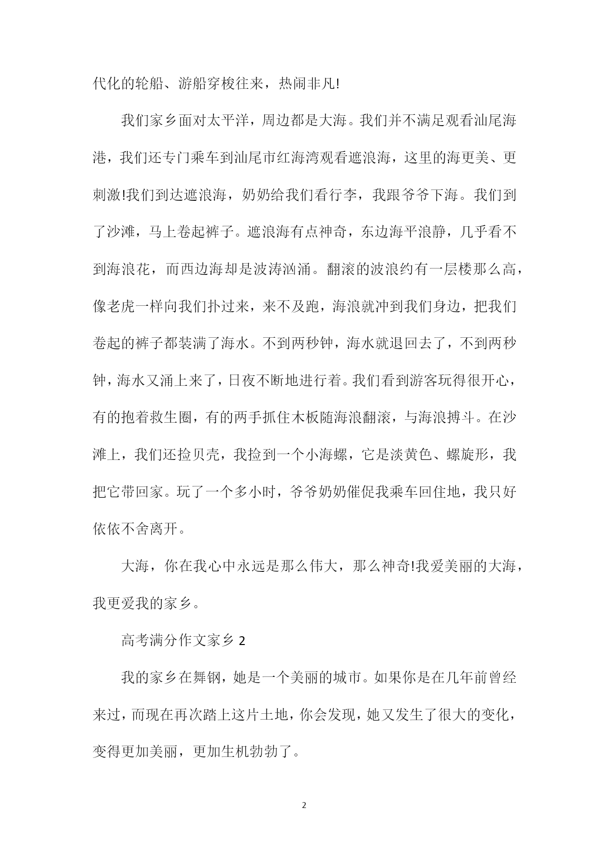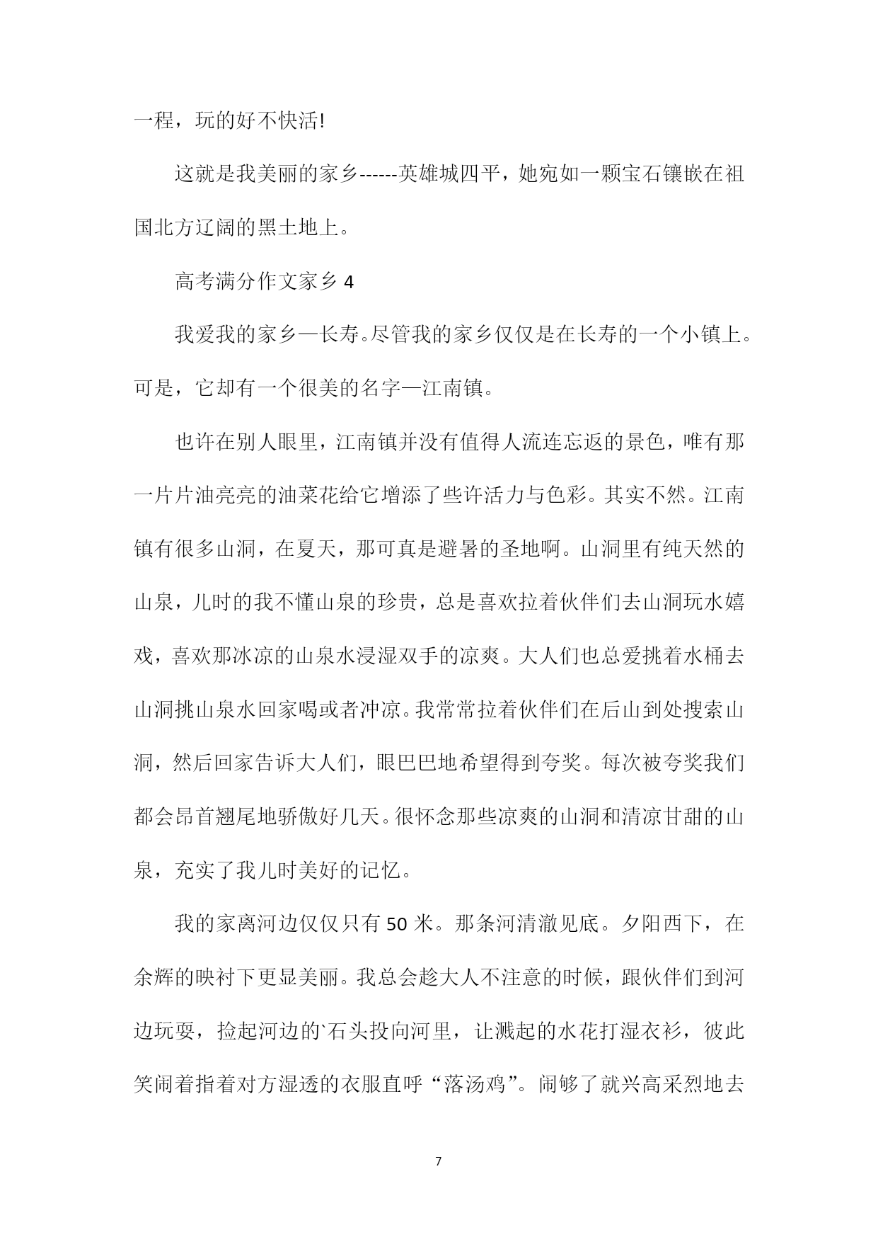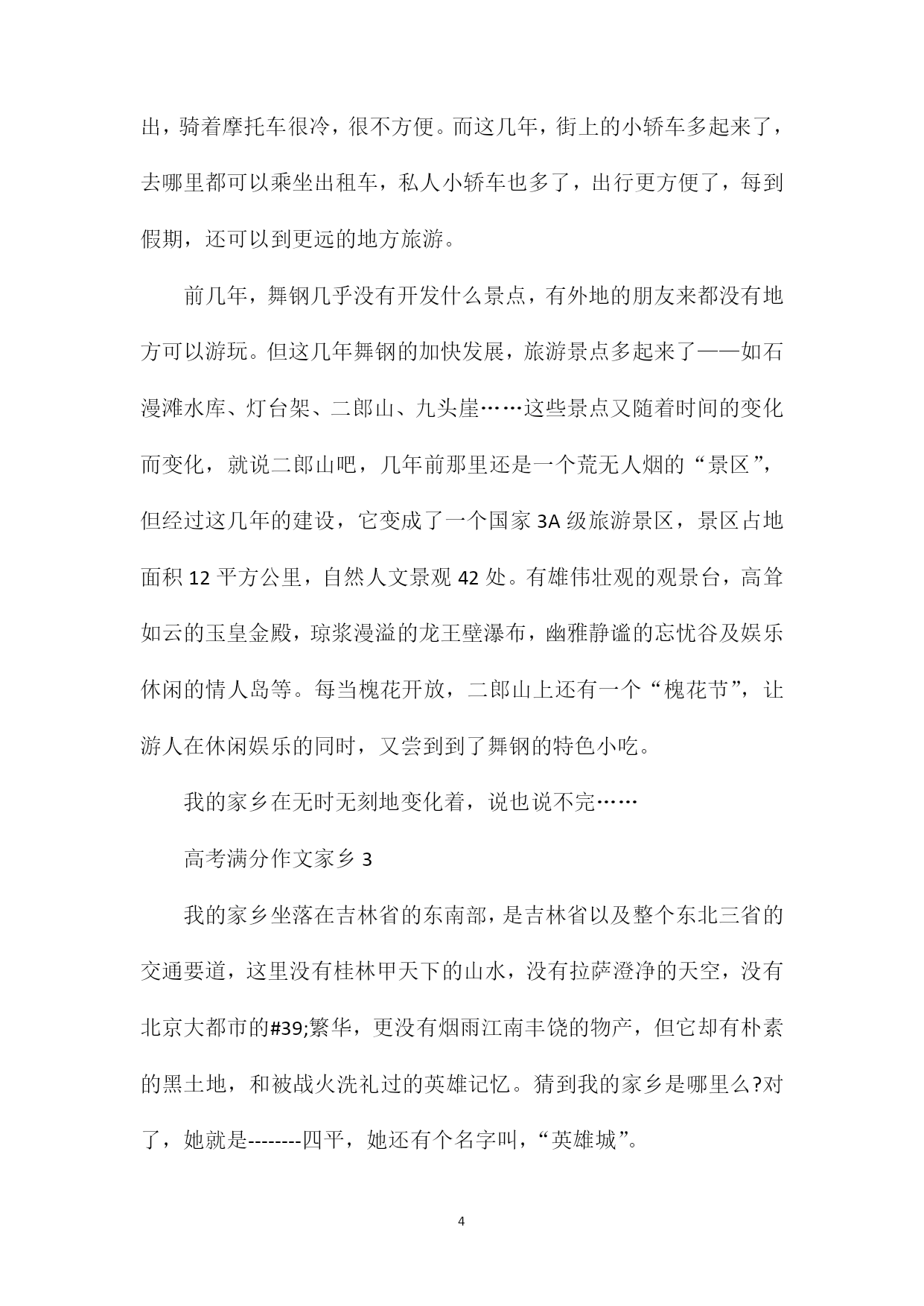 PAGEPAGE19高考满分作文家乡家乡,是在外漂泊的游子停靠的港弯,游子心中永远的栖息地。那么关于高考家乡作文,我们要怎么写呢?下面xx给大家分享高考满分作文家乡的内容,希望能够帮助大家,欢迎阅读!高考满分作文家乡1我的家乡汕尾,是一座美丽的海滨城市。每年我跟爷爷奶奶至少要回汕尾一次,每次我都和大人一起去观看大海。气势磅礴的大海让我深深迷恋和向往。我们回家乡,多数住在蓝岛假日酒店。我们住的地方离大海很近,约300多米。站在海岸上,我们看到数不清的渔船停靠在海港码头,我们听到海水的翻滚声,海风的吹拂声吹到我们的脸上,感到很舒服。我们还在码头乘船过渡到对面新港,新港山旁边伸出一条“沙舌”,约两公里长,它把汕尾渔港隔开分成两部分。“沙舌”坝内风平浪静,方便渔船停靠,尤其刮起台风,所有船只都来“避风港”避风;“沙舌”坝外是波浪滚滚的大海,海水特别清、特别蓝。沙滩上的海沙特别白、特别细。“沙舌”坝种上了树,保护汕尾的生态环境。站在“沙舌”坝上,举目远眺,浩瀚的大海铺展在远方,它与天相接,它与天相连。时而翻滚,时而平静的海面在阳光照耀下,闪烁着无数耀眼的金光,那一道道金光犹如一颗颗明亮的星星在闪动。海面上现代化的轮船、游船穿梭往来,热闹非凡!我们家乡面对太平洋,周边都是大海。我们并不满足观看汕尾海港,我们还专门乘车到汕尾市红海湾观看遮浪海,这里的海更美、更刺激!我们到达遮浪海,奶奶给我们看行李,我跟爷爷下海。我们到了沙滩,马上卷起裤子。遮浪海有点神奇,东边海平浪静,几乎看不到海浪花,而西边海却是波涛汹涌。翻滚的波浪约有一层楼那么高,像老虎一样向我们扑过来,来不及跑,海浪就冲到我们身边,把我们卷起的裤子都装满了海水。不到两秒钟,海水就退回去了,不到两秒钟,海水又涌上来了,日夜不断地进行着。我们看到游客玩得很开心,有的抱着救生圈,有的两手抓住木板随海浪翻滚,与海浪搏斗。在沙滩上,我们还捡贝壳,我捡到一个小海螺,它是淡黄色、螺旋形,我把它带回家。玩了一个多小时,爷爷奶奶催促我乘车回住地,我只好依依不舍离开。大海,你在我心中永远是那么伟大,那么神奇!我爱美丽的大海,我更爱我的家乡。高考满分作文家乡2我的家乡在舞钢,她是一个美丽的城市。如果你是在几年前曾经来过,而现在再次踏上这片土地,你会发现,她又发生了很大的变化,变得更加美丽,更加生机勃勃了。前几年,舞钢还有不少泥泞的小路,每当遇到下雨天,总是坑坑洼洼的,积了一窝又一窝的泥水,很不好走。每当我走在路上,旁边有汽车经过时,总难免被飞溅的泥水弄脏衣服。一不小心,还会踩入泥水窝里。听妈妈说,以前她们上班时,要经过一条坑坑洼洼的小路,经常有积水,上班的时候就深一脚浅一脚地走,走到单位裤腿就湿了。而现在,那些又小又窄又泥泞的路已不见了踪影,一条条柏油马路笔直而开阔,碰到下雨天再也不用发愁了,路面很平滑,骑自行车再也不费劲了。前几年,我们的学校教室里还没有空调,只有三个吊在房顶上的电扇。在夏天,教室里又闷又热,那几个电扇根本就起不了太大的作用。现在,教室里装上了空调,当夏天来临的时候,教室里再也不热了。听爷爷说,他五十年代末来舞钢工作时,没有什么大的商场。而现在,街边商铺林立,大商场一家连着一家,里面的商品琳琅满目,十分丰富,我想买什么都可以买到,真是太方便了。街道还很干净整洁,随意乱丢垃圾的现象没有了,环卫工人在辛勤地做着保洁的工作……这不仅说明人们的环保意识提高了,更说明人们的生活水平提高了。舞钢在变化,人们也在变化。前几年,大街上有很多自行车和摩托车,小轿车比较少。冬天外出,骑着摩托车很冷,很不方便。而这几年,街上的小轿车多起来了,去哪里都可以乘坐出租车,私人小轿车也多了,出行更方便了,每到假期,还可以到更远的地方旅游。前几年,舞钢几乎没有开发什么景点,有外地的朋友来都没有地方可以游玩。但这几年舞钢的加快发展,旅游景点多起来了——如石漫滩水库、灯台架、二郎山、九头崖……这些景点又随着时间的变化而变化,就说二郎山吧,几年前那里还是一个荒无人烟的“景区”,但经过这几年的建设,它变成了一个国家3A级旅游景区,景区占地面积12平方公里,自然人文景观42处。有雄伟壮观的观景台,高耸如云的玉皇金殿,琼浆漫溢的龙王壁瀑布,幽雅静谧的忘忧谷及娱乐休闲的情人岛等。每当槐花开放,二郎山上还有一个“槐花节”,让游人在休闲娱乐的同时,又尝到到了舞钢的特色小吃。我的家乡在无时无刻地变化着,说也说不完……高考满分作文家乡3我的家乡坐落在吉林省的东南部,是吉林省以及整个东北三省的交通要道,这里没有桂林甲天下的山水,没有拉萨澄净的天空,没有北京大都市的#39;繁华,更没有烟雨江南丰饶的物产,但它却有朴素的黑土地,和被战火洗礼过的英雄记忆。猜到我的家乡是哪里么?对了,她就是