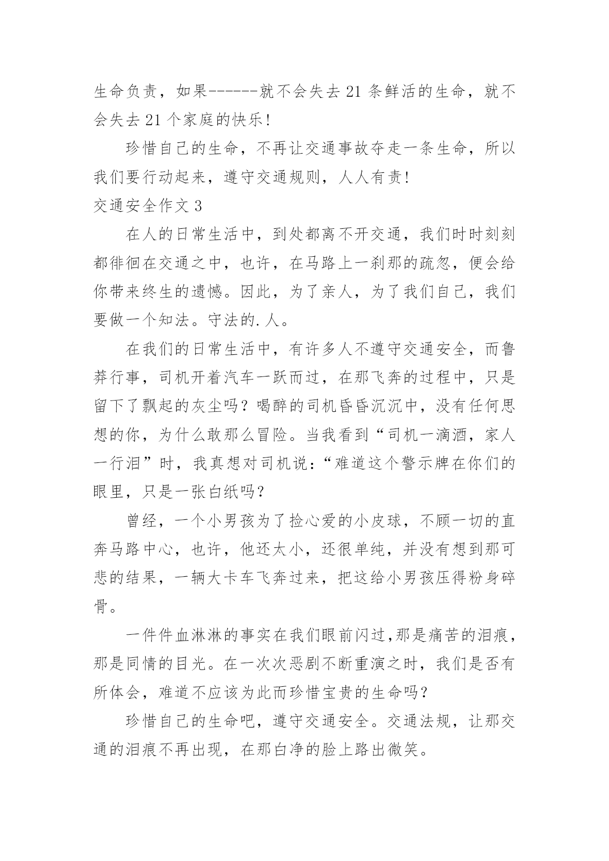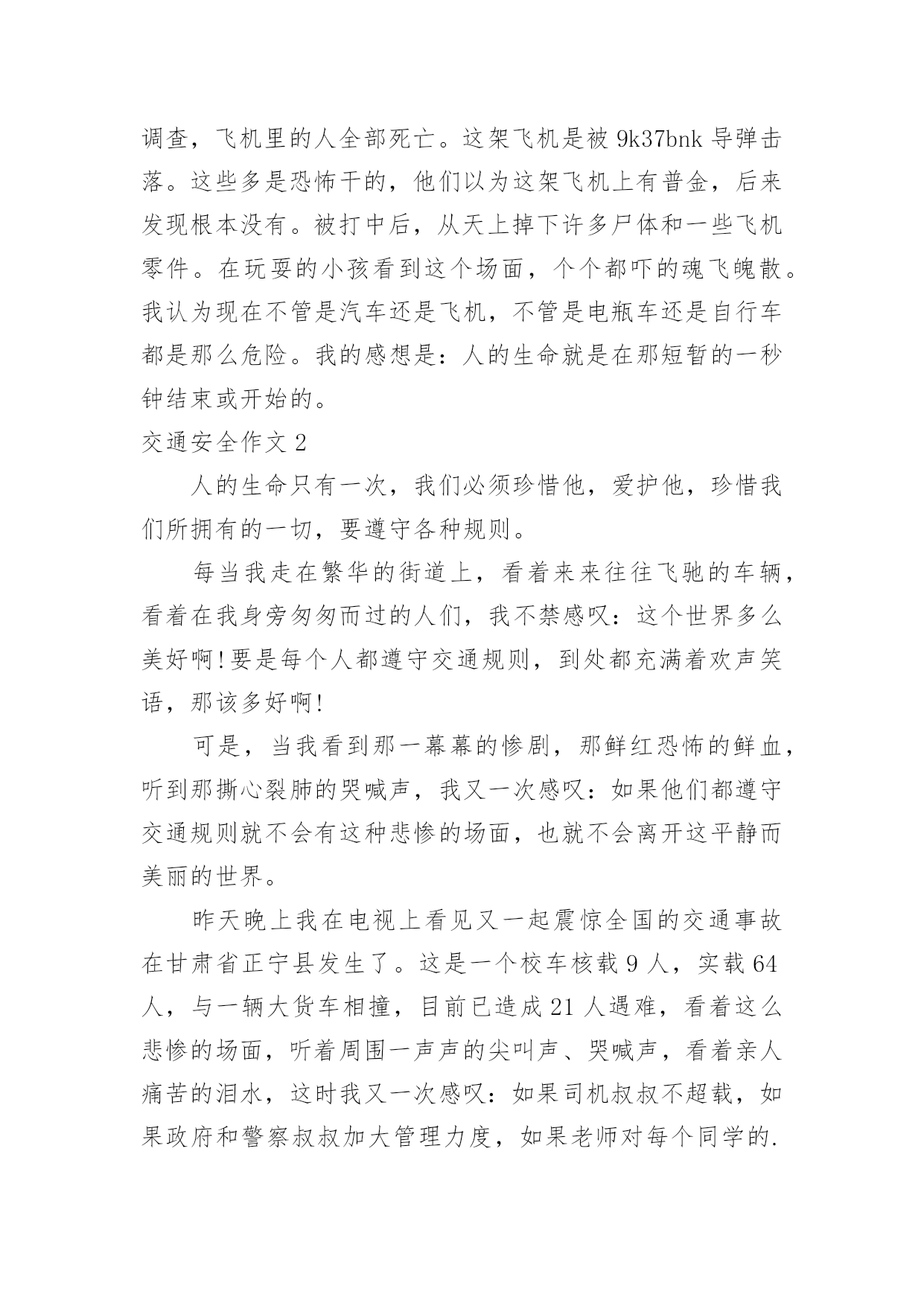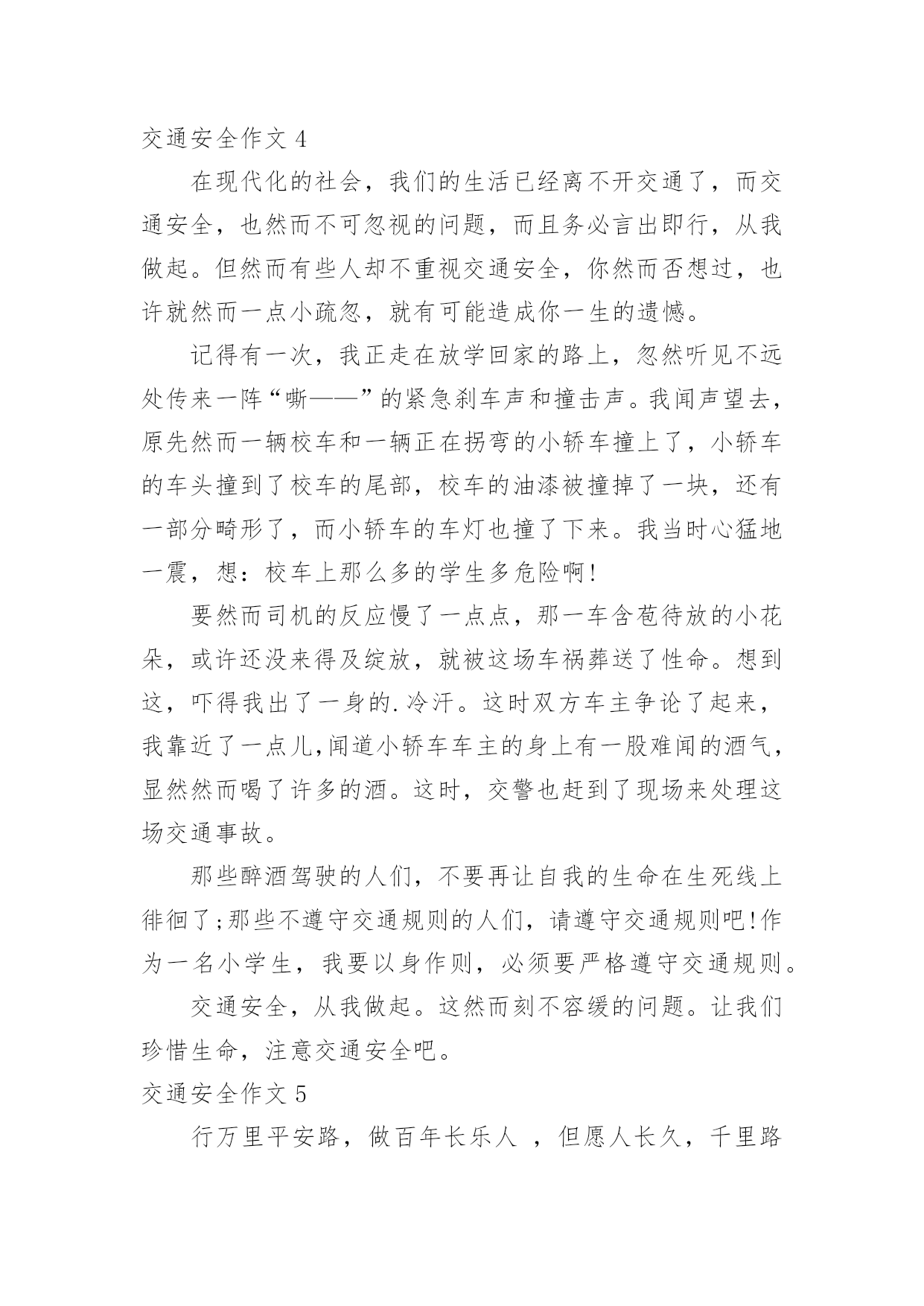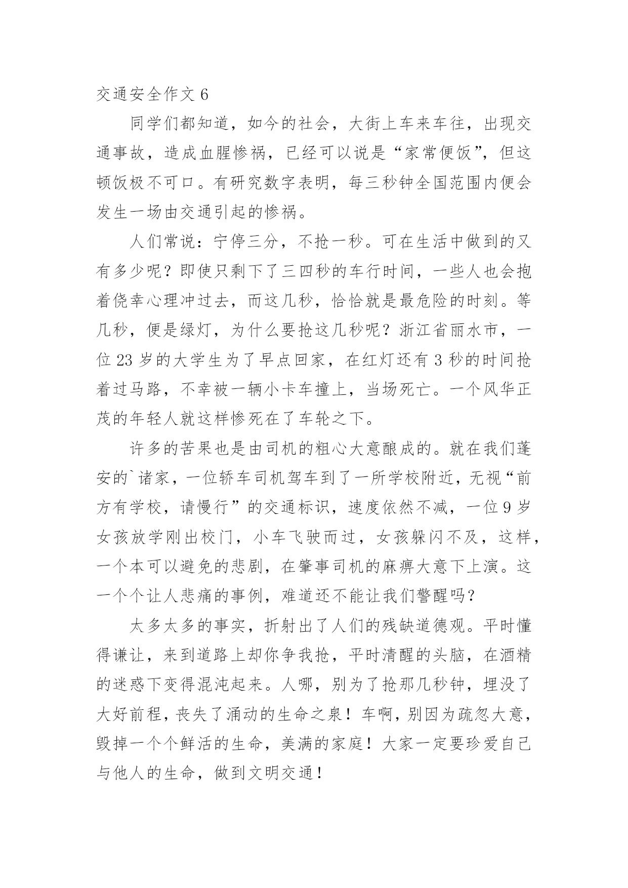 交通安全作文[热]交通安全作文在平平淡淡的日常中,大家都经常看到作文的身影吧,作文是人们把记忆中所存储的有关知识、经验和思想用书面形式表达出来的记叙方式。你知道作文怎样才能写的好吗?下面是小编收集整理的交通安全作文,仅供参考,欢迎大家阅读。交通安全作文1每次放学的时候,老师会提醒我们过马路时要注意安全,寒假的时候,老师会提醒我们放鞭炮时要注意安全,暑假的时侯,老师会提醒我们游泳时要注意安全。在众多交通工具中,我认为飞机是最安全的,然而,就在今年发生了多件飞机失事的事件,其中最重要的是20xx年3月8日马航mh370失踪事件,这一架飞机上有两百多人,其中中国人就有100多人。这架飞机失去联系时,各个国家都出一份力去寻找,这正所谓一方有难,八分支援。一天过去了,一个月过去了,都还没有线索,飞机上的乘客的'家属都非常着急,有的在痛哭,有的在等待,还有的在不停的拨打着电话号码······这架飞机一找就是四个月,还没有下落。20xx年7月18日马航mh17只飞行了5个小时之后,就坠毁了。这架飞机上乘有280名乘客和15名机组人员,据调查,飞机里的人全部死亡。这架飞机是被9k37bnk导弹击落。这些多是恐怖干的,他们以为这架飞机上有普金,后来发现根本没有。被打中后,从天上掉下许多尸体和一些飞机零件。在玩耍的小孩看到这个场面,个个都吓的魂飞魄散。我认为现在不管是汽车还是飞机,不管是电瓶车还是自行车都是那么危险。我的感想是:人的生命就是在那短暂的一秒钟结束或开始的。交通安全作文2人的生命只有一次,我们必须珍惜他,爱护他,珍惜我们所拥有的一切,要遵守各种规则。每当我走在繁华的街道上,看着来来往往飞驰的车辆,看着在我身旁匆匆而过的人们,我不禁感叹:这个世界多么美好啊!要是每个人都遵守交通规则,到处都充满着欢声笑语,那该多好啊!可是,当我看到那一幕幕的惨剧,那鲜红恐怖的鲜血,听到那撕心裂肺的哭喊声,我又一次感叹:如果他们都遵守交通规则就不会有这种悲惨的场面,也就不会离开这平静而美丽的世界。昨天晚上我在电视上看见又一起震惊全国的交通事故在甘肃省正宁县发生了。这是一个校车核载9人,实载64人,与一辆大货车相撞,目前已造成21人遇难,看着这么悲惨的场面,听着周围一声声的尖叫声、哭喊声,看着亲人痛苦的泪水,这时我又一次感叹:如果司机叔叔不超载,如果政府和警察叔叔加大管理力度,如果老师对每个同学的.生命负责,如果------就不会失去21条鲜活的生命,就不会失去21个家庭的快乐!珍惜自己的生命,不再让交通事故夺走一条生命,所以我们要行动起来,遵守交通规则,人人有责!交通安全作文3在人的日常生活中,到处都离不开交通,我们时时刻刻都徘徊在交通之中,也许,在马路上一刹那的疏忽,便会给你带来终生的遗憾。因此,为了亲人,为了我们自己,我们要做一个知法。守法的.人。在我们的日常生活中,有许多人不遵守交通安全,而鲁莽行事,司机开着汽车一跃而过,在那飞奔的过程中,只是留下了飘起的灰尘吗?喝醉的司机昏昏沉沉中,没有任何思想的你,为什么敢那么冒险。当我看到“司机一滴酒,家人一行泪”时,我真想对司机说:“难道这个警示牌在你们的眼里,只是一张白纸吗?曾经,一个小男孩为了捡心爱的小皮球,不顾一切的直奔马路中心,也许,他还太小,还很单纯,并没有想到那可悲的结果,一辆大卡车飞奔过来,把这给小男孩压得粉身碎骨。一件件血淋淋的事实在我们眼前闪过,那是痛苦的泪痕,那是同情的目光。在一次次恶剧不断重演之时,我们是否有所体会,难道不应该为此而珍惜宝贵的生命吗?珍惜自己的生命吧,遵守交通安全。交通法规,让那交通的泪痕不再出现,在那白净的脸上路出微笑。交通安全作文4在现代化的社会,我们的生活已经离不开交通了,而交通安全,也然而不可忽视的问题,而且务必言出即行,从我做起。但然而有些人却不重视交通安全,你然而否想过,也许就然而一点小疏忽,就有可能造成你一生的遗憾。记得有一次,我正走在放学回家的路上,忽然听见不远处传来一阵“嘶——”的紧急刹车声和撞击声。我闻声望去,原先然而一辆校车和一辆正在拐弯的小轿车撞上了,小轿车的车头撞到了校车的尾部,校车的油漆被撞掉了一块,还有一部分畸形了,而小轿车的车灯也撞了下来。我当时心猛地一震,想:校车上那么多的学生多危险啊!要然而司机的反应慢了一点点,那一车含苞待放的小花朵,或许还没来得及绽放,就被这场车祸葬送了性命。想到这,吓得我出了一身的.冷汗。这时双方车主争论了起来,我靠近了一点儿,闻道小轿车车主的身上有一股难闻的酒气,显然然而喝了许多的酒。这时,交警也赶到了现场来处理这场交通事故。那些醉酒驾驶的人们,不要再让自我的生命在生死线上徘徊了;那些不遵守交通规则的人们,请遵守交通规则吧!作为一名小学生,我要以身作则,必须要严格遵守交通规则。交通安全,从我做起。这然而刻不容