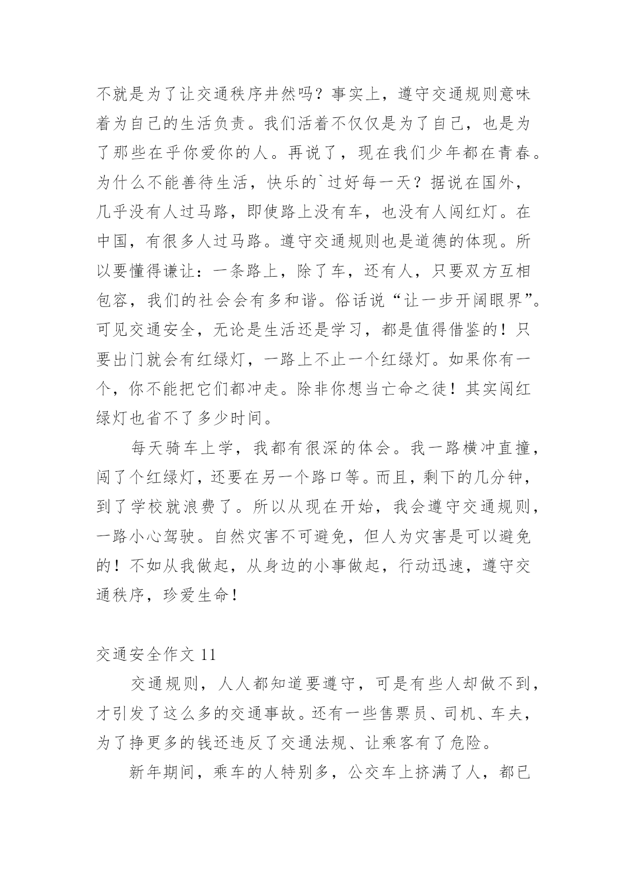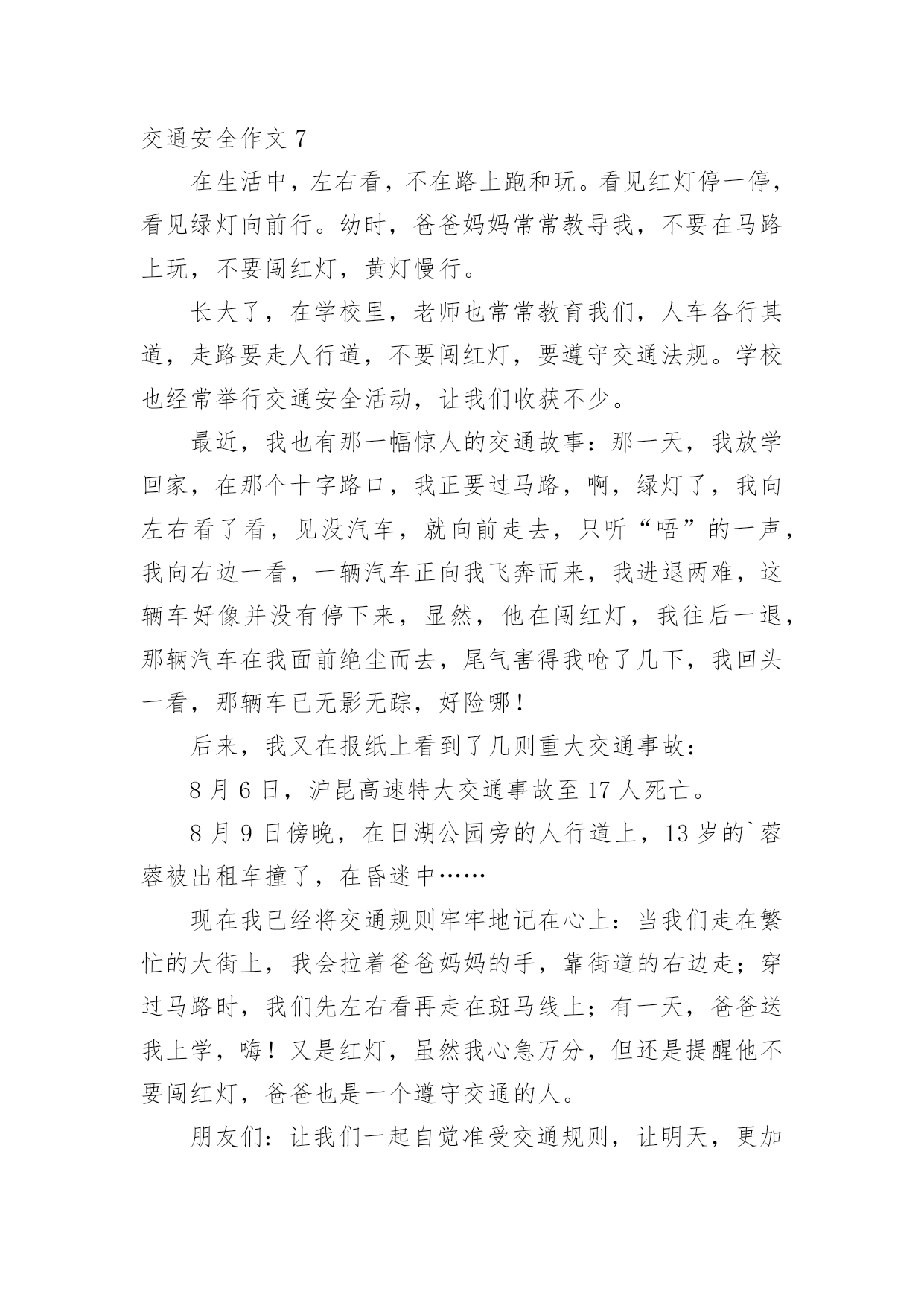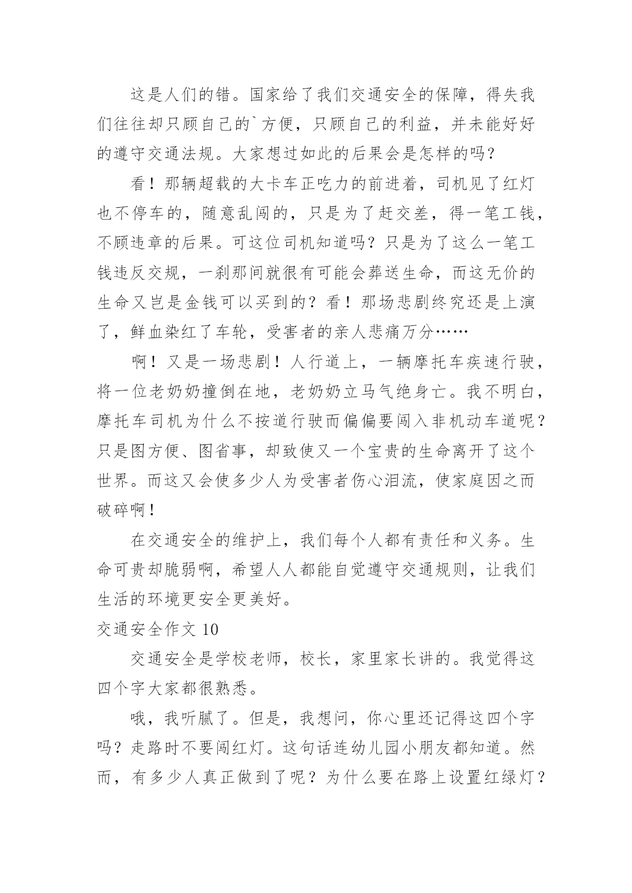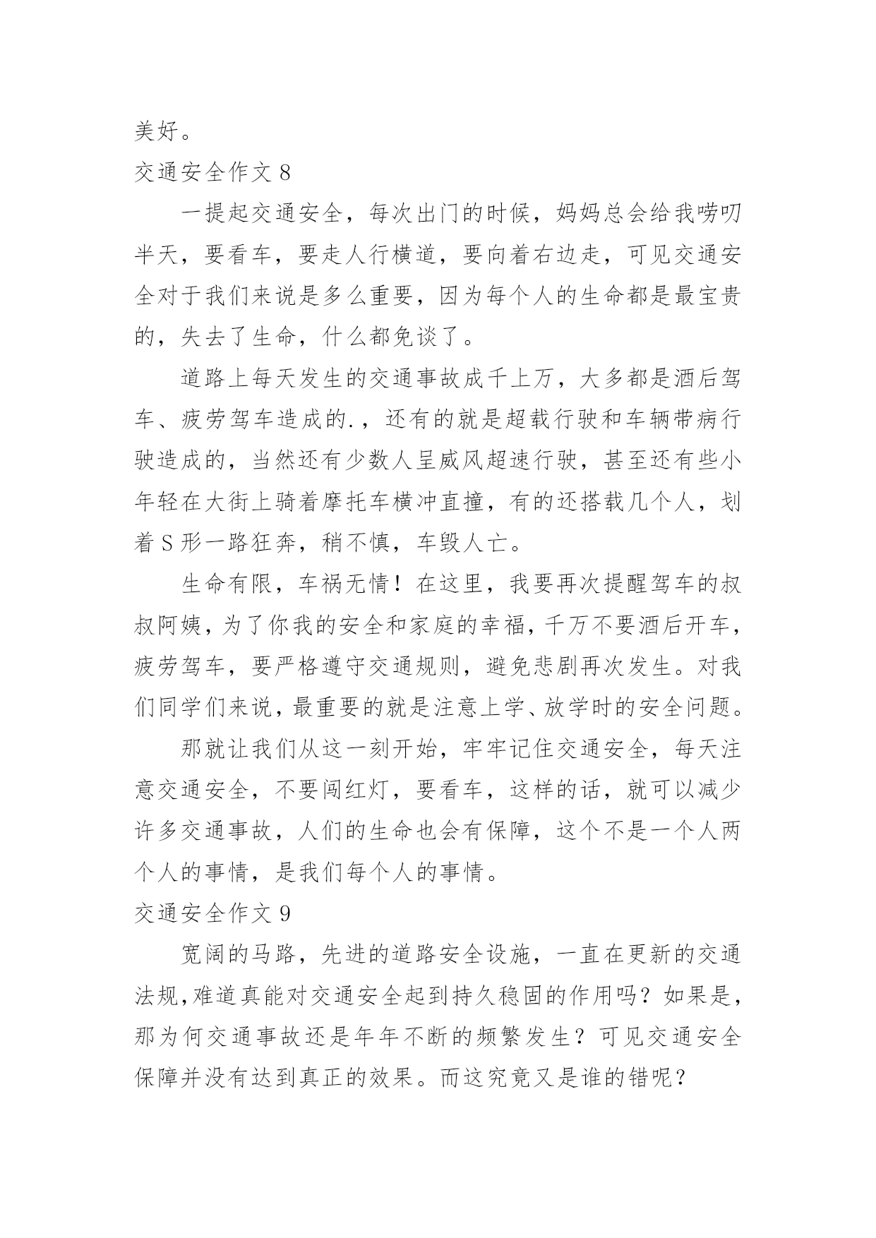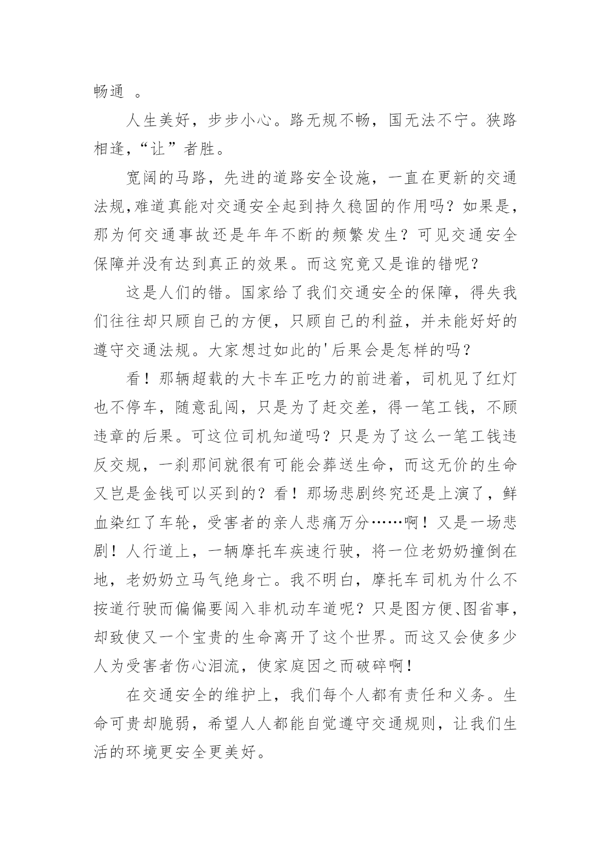 交通安全作文[热]交通安全作文在平平淡淡的日常中,大家都经常看到作文的身影吧,作文是人们把记忆中所存储的有关知识、经验和思想用书面形式表达出来的记叙方式。你知道作文怎样才能写的好吗?下面是小编收集整理的交通安全作文,仅供参考,欢迎大家阅读。交通安全作文1每次放学的时候,老师会提醒我们过马路时要注意安全,寒假的时候,老师会提醒我们放鞭炮时要注意安全,暑假的时侯,老师会提醒我们游泳时要注意安全。在众多交通工具中,我认为飞机是最安全的,然而,就在今年发生了多件飞机失事的事件,其中最重要的是20xx年3月8日马航mh370失踪事件,这一架飞机上有两百多人,其中中国人就有100多人。这架飞机失去联系时,各个国家都出一份力去寻找,这正所谓一方有难,八分支援。一天过去了,一个月过去了,都还没有线索,飞机上的乘客的'家属都非常着急,有的在痛哭,有的在等待,还有的在不停的拨打着电话号码······这架飞机一找就是四个月,还没有下落。20xx年7月18日马航mh17只飞行了5个小时之后,就坠毁了。这架飞机上乘有280名乘客和15名机组人员,据调查,飞机里的人全部死亡。这架飞机是被9k37bnk导弹击落。这些多是恐怖干的,他们以为这架飞机上有普金,后来发现根本没有。被打中后,从天上掉下许多尸体和一些飞机零件。在玩耍的小孩看到这个场面,个个都吓的魂飞魄散。我认为现在不管是汽车还是飞机,不管是电瓶车还是自行车都是那么危险。我的感想是:人的生命就是在那短暂的一秒钟结束或开始的。交通安全作文2人的生命只有一次,我们必须珍惜他,爱护他,珍惜我们所拥有的一切,要遵守各种规则。每当我走在繁华的街道上,看着来来往往飞驰的车辆,看着在我身旁匆匆而过的人们,我不禁感叹:这个世界多么美好啊!要是每个人都遵守交通规则,到处都充满着欢声笑语,那该多好啊!可是,当我看到那一幕幕的惨剧,那鲜红恐怖的鲜血,听到那撕心裂肺的哭喊声,我又一次感叹:如果他们都遵守交通规则就不会有这种悲惨的场面,也就不会离开这平静而美丽的世界。昨天晚上我在电视上看见又一起震惊全国的交通事故在甘肃省正宁县发生了。这是一个校车核载9人,实载64人,与一辆大货车相撞,目前已造成21人遇难,看着这么悲惨的场面,听着周围一声声的尖叫声、哭喊声,看着亲人痛苦的泪水,这时我又一次感叹:如果司机叔叔不超载,如果政府和警察叔叔加大管理力度,如果老师对每个同学的.生命负责,如果------就不会失去21条鲜活的生命,就不会失去21个家庭的快乐!珍惜自己的生命,不再让交通事故夺走一条生命,所以我们要行动起来,遵守交通规则,人人有责!交通安全作文3在人的日常生活中,到处都离不开交通,我们时时刻刻都徘徊在交通之中,也许,在马路上一刹那的疏忽,便会给你带来终生的遗憾。因此,为了亲人,为了我们自己,我们要做一个知法。守法的.人。在我们的日常生活中,有许多人不遵守交通安全,而鲁莽行事,司机开着汽车一跃而过,在那飞奔的过程中,只是留下了飘起的灰尘吗?喝醉的司机昏昏沉沉中,没有任何思想的你,为什么敢那么冒险。当我看到“司机一滴酒,家人一行泪”时,我真想对司机说:“难道这个警示牌在你们的眼里,只是一张白纸吗?曾经,一个小男孩为了捡心爱的小皮球,不顾一切的直奔马路中心,也许,他还太小,还很单纯,并没有想到那可悲的结果,一辆大卡车飞奔过来,把这给小男孩压得粉身碎骨。一件件血淋淋的事实在我们眼前闪过,那是痛苦的泪痕,那是同情的目光。在一次次恶剧不断重演之时,我们是否有所体会,难道不应该为此而珍惜宝贵的生命吗?珍惜自己的生命吧,遵守交通安全。交通法规,让那交通的泪痕不再出现,在那白净的脸上路出微笑。交通安全作文4在现代化的社会,我们的生活已经离不开交通了,而交通安全,也然而不可忽视的问题,而且务必言出即行,从我做起。但然而有些人却不重视交通安全,你然而否想过,也许就然而一点小疏忽,就有可能造成你一生的遗憾。记得有一次,我正走在放学回家的路上,忽然听见不远处传来一阵“嘶——”的紧急刹车声和撞击声。我闻声望去,原先然而一辆校车和一辆正在拐弯的小轿车撞上了,小轿车的车头撞到了校车的尾部,校车的油漆被撞掉了一块,还有一部分畸形了,而小轿车的车灯也撞了下来。我当时心猛地一震,想:校车上那么多的学生多危险啊!要然而司机的反应慢了一点点,那一车含苞待放的小花朵,或许还没来得及绽放,就被这场车祸葬送了性命。想到这,吓得我出了一身的.冷汗。这时双方车主争论了起来,我靠近了一点儿,闻道小轿车车主的身上有一股难闻的酒气,显然然而喝了许多的酒。这时,交警也赶到了现场来处理这场交通事故。那些醉酒驾驶的人们,不要再让自我的生命在生死线上徘徊了;那些不遵守交通规则的人们,请遵守交通规则吧!作为一名小学生,我要以身作则,必须要严格遵守交通规则。交通安全,从我做起。这然而刻不容