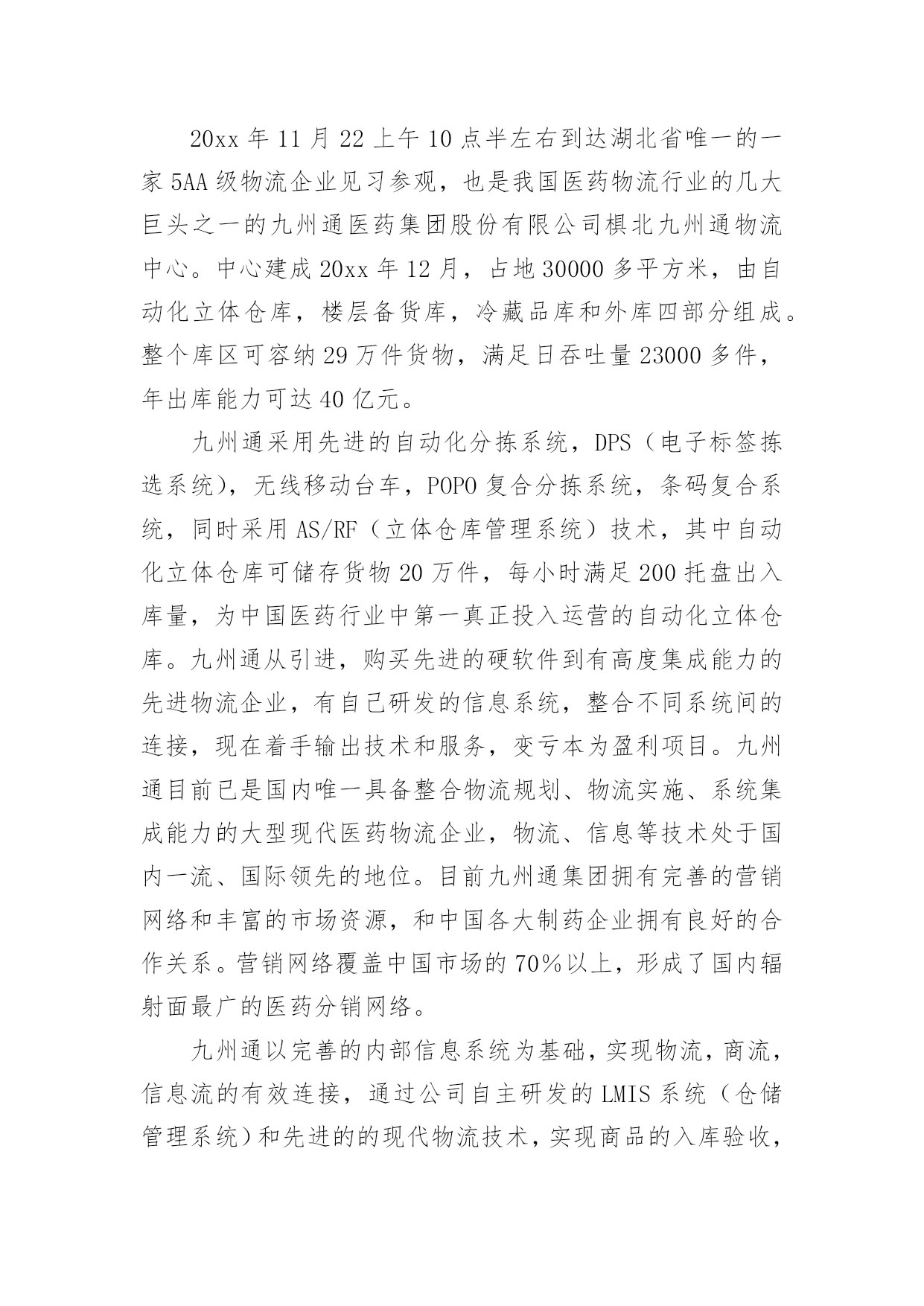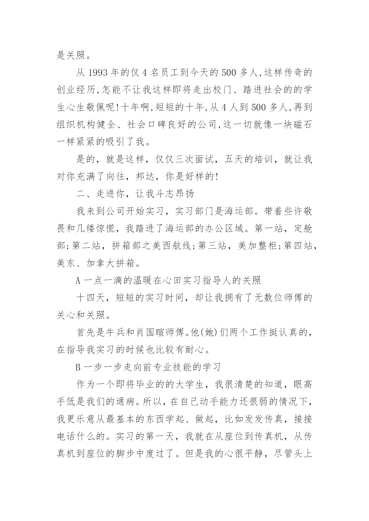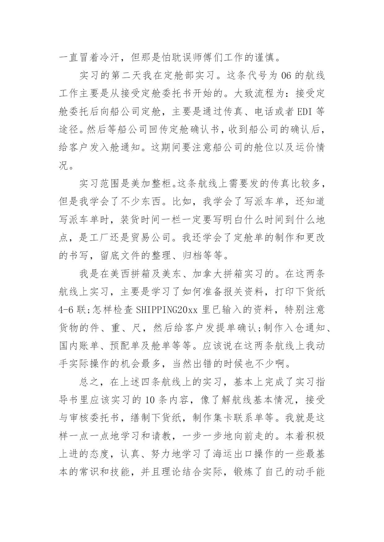 物流公司实习总结物流公司实习总结总结是事后对某一阶段的学习、工作或其完成情况加以回顾和分析的一种书面材料,它有助于我们寻找工作和事物发展的规律,从而掌握并运用这些规律,因此十分有必须要写一份总结哦。总结一般是怎么写的呢?以下是小编帮大家整理的物流公司实习总结,仅供参考,希望能够帮助到大家。物流公司实习总结1一、走近你,让我充满向往当我在毕业生人才交流会上向海程邦达国际货运代理有限公司投出我的求职简历时,我并不知道,这一份简历会把我带进一个怎样的世界,我将走上一条怎样的路。心底的自信强溢在脸上,又带着那样的迷惑,不安和好奇,参加过三次面试,见到的始终是充满干劲的脸。我获得了参加公司培训的机会。也曾有过很多故事,但命运还是让我走近了你,海程邦达,走近了你,也更让我充满了向往和渴望。短短的五天培训,像一个小小的切口,通过它,我看到了什么是优秀,什么是爱岗敬业,什么是邦达的好员工。五天里,从海运到空运,从报关到报检,那么多优秀的主管熟练地讲着自己工作中的经验。谈到公司,谈到工作,他(她)们眼睛里闪烁着自信的光芒;谈起未来,谈起我们,他(她)们言语里尽是关照。从1993年的仅4名员工到今天的500多人,这样传奇的创业经历,怎能不让我这样即将走出校门、踏进社会的的学生心生敬佩呢!十年啊,短短的十年,从4人到500多人,再到组织机构健全、社会口碑良好的公司,这一切就像一块磁石一样紧紧的吸引了我。是的,就是这样,仅仅三次面试,五天的培训,就让我对你充满了向往,邦达,你是好样的!二、走进你,让我斗志昂扬我来到公司开始实习,实习部门是海运部。带着些许敬畏和几缕惊慌,我踏进了海运部的办公区域。第一站,定舱部;第二站,拼箱部之美西航线;第三站,美加整柜;第四站,美东、加拿大拼箱。A一点一滴的温暖在心田实习指导人的关照十四天,短短的实习时间,却让我拥有了无数位师傅的关心和关照。首先是牛兵和肖国暄师傅。他(她)们两个工作挺认真的,在指导我实习的时候也比较有耐心。B一步一步走向前专业技能的学习作为一个即将毕业的的大学生,我很清楚的知道,眼高手低是我们的通病。所以,在自己动手能力还很弱的情况下,我更乐意从最基本的东西学起、做起,比如发发传真,接接电话什么的。实习的第一天,我就在从座位到传真机,从传真机到座位的脚步中度过了。但是我的心很平静,尽管头上一直冒着冷汗,但那是怕耽误师傅们工作的谨慎。实习的第二天我在定舱部实习。这条代号为06的航线工作主要是从接受定舱委托书开始的。大致流程为:接受定舱委托后向船公司定舱,主要是通过传真、电话或者EDI等途径。然后等船公司回传定舱确认书,收到船公司的确认后,给客户发入舱通知。这期间要注意船公司的舱位以及运价情况。实习范围是美加整柜。这条航线上需要发的传真比较多,但是我学会了不少东西。比如,我学会了写派车单,还知道写派车单时,装货时间一栏一定要写明白什么时间到什么地点,是工厂还是贸易公司。我还学会了定舱单的制作和更改的书写,留底文件的整理、归档等等。我是在美西拼箱及美东、加拿大拼箱实习的。在这两条航线上实习,主要是学习了如何准备报关资料,打印下货纸4-6联;怎样检查SHIPPING20xx里已输入的资料,特别注意货物的件、重、尺,然后给客户发提单确认;制作入仓通知、国内账单、预配单及舱单等等。应该说在这两条航线上我动手实际操作的机会最多,当然出错的时候也不少啊。总之,在上述四条航线上的实习,基本上完成了实习指导书里应该实习的10条内容,像了解航线基本情况,接受与审核委托书,缮制下货纸,制作集卡联系单等。我就是这样一点一点地学习和请教,一步一步地向前走的。本着积极上进的态度,认真、努力地学习了海运出口操作的一些最基本的常识和技能,并且理论结合实际,锻炼了自己的动手能力。物流公司实习总结2一、实习目的1、了解Xx商贸有限公司物流中心的运作结构和配送业务;2、加深对物流配送中心和分销经营的认识和理解;3、对物流有更加深入的理解。二、实习单位概况Xx商贸有限公司,前身为“Xx贸易商行”,主要经营饮料、食品、日用百货、酒类等的分销物流业务,代理和分销近百个国内外著名品牌,网络覆盖整个珠三角州,员工人数800多人。是目前华南地区最大的快速消费品分销企业。1990年Xx商贸行成立,成功取得了百事可乐、杨协成等产品的Xx分销权。1993年成为怡宝纯净水Xx地区的独家代理,并从饮料批发向全面代理制转型。1994年成立Xx商贸公司。1995年导入品牌代理制,逐步拓宽跨区域分销网络,建立佛山等分公司。1996年与怡宝公司、珠江啤酒结成战略合作伙伴,为公司壮大发展奠定了更为坚实的基础。20xx年在Xx投资建设了占地10万平方米的物流中心。20xx年斥巨资引进国际先进的物流信息管理系统。20xx年与日本住友商事、加藤产业等国际大公司合作,改制成