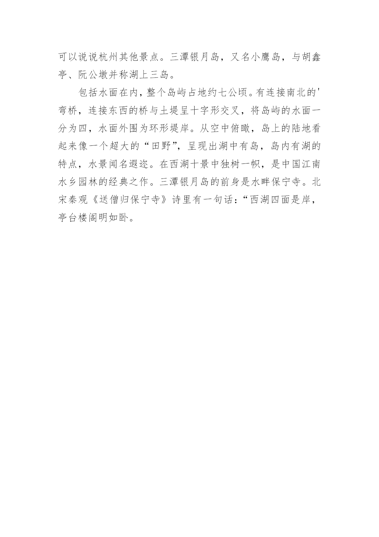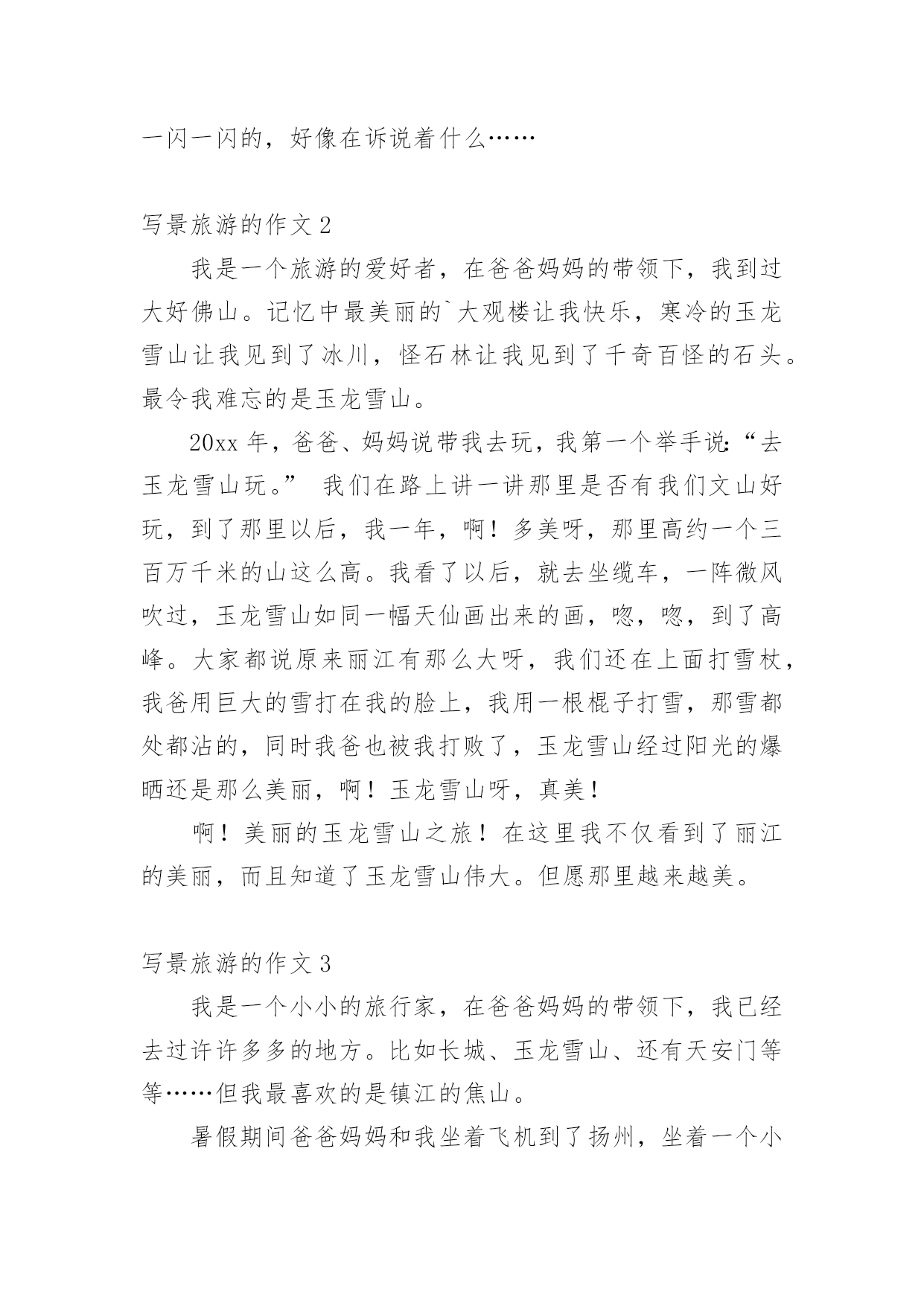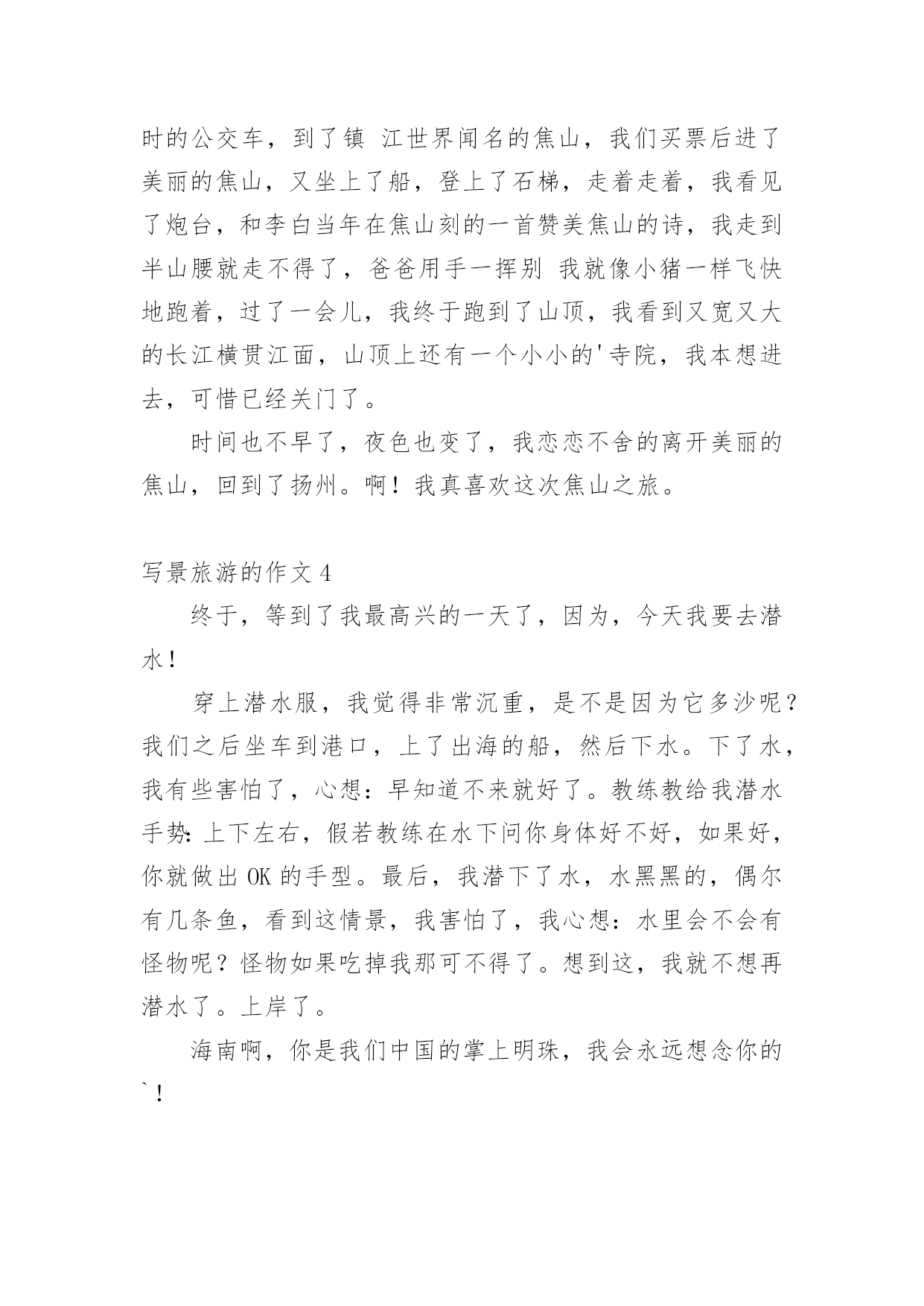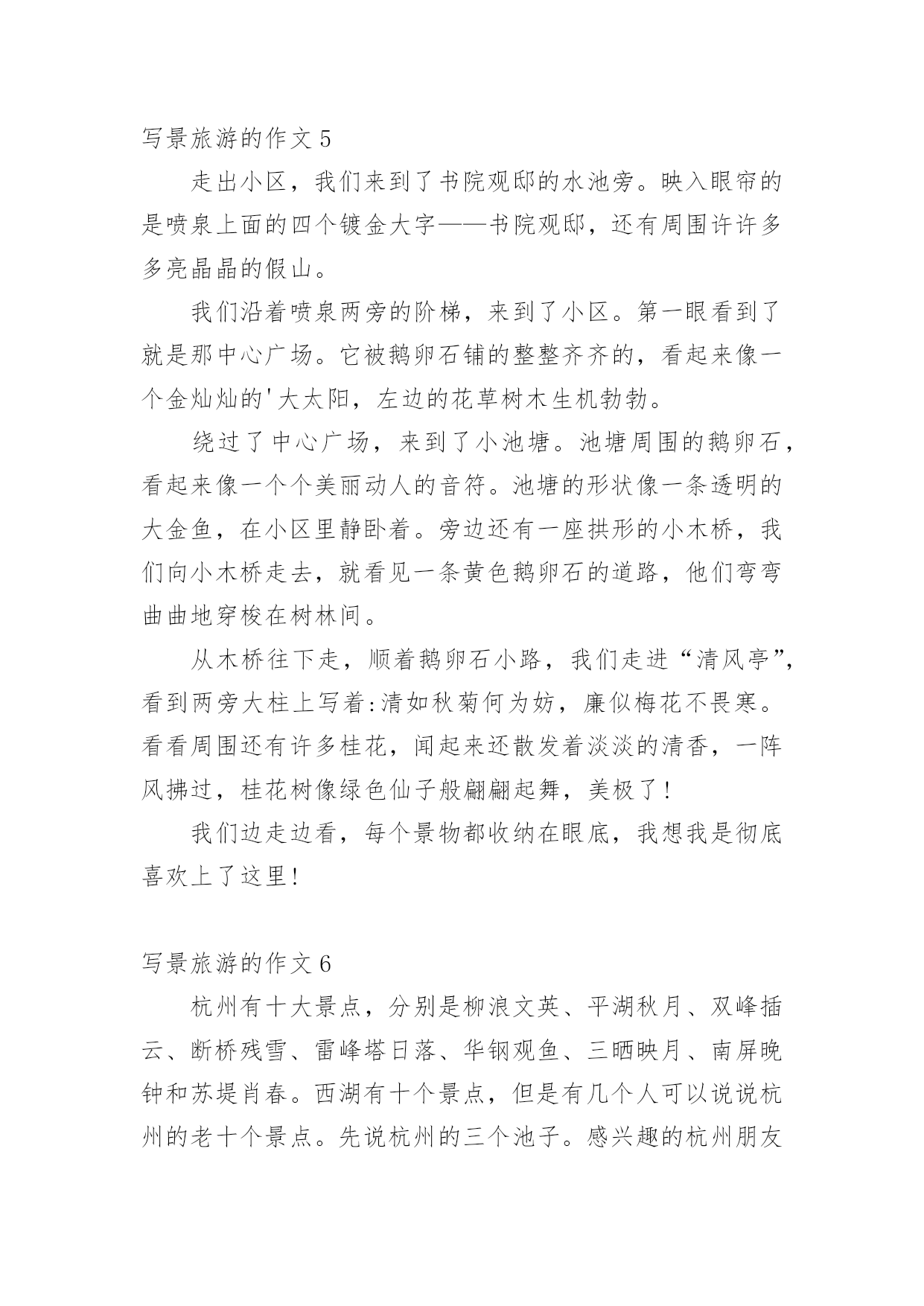 写景旅游的作文无论是在学校还是在社会中,大家或多或少都会接触过作文吧,作文是人们把记忆中所存储的有关知识、经验和思想用书面形式表达出来的记叙方式。你所见过的作文是什么样的呢?下面是小编精心整理的写景旅游的作文,欢迎大家分享。写景旅游的作文1大家应该都知道,三亚是个旅游圣地。那里的大海十分美丽。我去过许多不同的海湾,但三亚这名叫亚龙湾的海湾景色我还是头一次见。那里的海水,宛如一块海蓝宝石。走近浅滩,往海里看,海底的沙子看得清清楚楚。看到水天相接的地方,天空与大海融为一体。蓝天仿佛是一匹碧蓝的绸缎,而白云,就是镶嵌在上面洁白无瑕的玉饰。那里还绿草如茵,草绿得像一条碧绿的.地毯。光脚走在上面,感觉像是走在羽毛堆或棉花堆上。那里的沙子,又白、又细、又软。在沙滩上走走,沐浴在金色的阳光下,望着被阳光照得波光粼粼的海面,身心会感到无比的放松。晚上,浪花拍打着沙滩。那声音犹如一首催眠曲,“哗啦哗啦,哗啦哗啦……”伴你入眠。繁星调皮地眨着眼睛,一闪一闪的,好像在诉说着什么……写景旅游的作文2我是一个旅游的爱好者,在爸爸妈妈的带领下,我到过大好佛山。记忆中最美丽的`大观楼让我快乐,寒冷的玉龙雪山让我见到了冰川,怪石林让我见到了千奇百怪的石头。最令我难忘的是玉龙雪山。20xx年,爸爸、妈妈说带我去玩,我第一个举手说:“去玉龙雪山玩。”我们在路上讲一讲那里是否有我们文山好玩,到了那里以后,我一年,啊!多美呀,那里高约一个三百万千米的山这么高。我看了以后,就去坐缆车,一阵微风吹过,玉龙雪山如同一幅天仙画出来的画,唿,唿,到了高峰。大家都说原来丽江有那么大呀,我们还在上面打雪杖,我爸用巨大的雪打在我的脸上,我用一根棍子打雪,那雪都处都沾的,同时我爸也被我打败了,玉龙雪山经过阳光的爆晒还是那么美丽,啊!玉龙雪山呀,真美!啊!美丽的玉龙雪山之旅!在这里我不仅看到了丽江的美丽,而且知道了玉龙雪山伟大。但愿那里越来越美。写景旅游的作文3我是一个小小的旅行家,在爸爸妈妈的带领下,我已经去过许许多多的地方。比如长城、玉龙雪山、还有天安门等等……但我最喜欢的是镇江的焦山。暑假期间爸爸妈妈和我坐着飞机到了扬州,坐着一个小时的公交车,到了镇江世界闻名的焦山,我们买票后进了美丽的焦山,又坐上了船,登上了石梯,走着走着,我看见了炮台,和李白当年在焦山刻的一首赞美焦山的诗,我走到半山腰就走不得了,爸爸用手一挥别我就像小猪一样飞快地跑着,过了一会儿,我终于跑到了山顶,我看到又宽又大的长江横贯江面,山顶上还有一个小小的'寺院,我本想进去,可惜已经关门了。时间也不早了,夜色也变了,我恋恋不舍的离开美丽的焦山,回到了扬州。啊!我真喜欢这次焦山之旅。写景旅游的作文4终于,等到了我最高兴的一天了,因为,今天我要去潜水!穿上潜水服,我觉得非常沉重,是不是因为它多沙呢?我们之后坐车到港口,上了出海的船,然后下水。下了水,我有些害怕了,心想:早知道不来就好了。教练教给我潜水手势:上下左右,假若教练在水下问你身体好不好,如果好,你就做出OK的手型。最后,我潜下了水,水黑黑的,偶尔有几条鱼,看到这情景,我害怕了,我心想:水里会不会有怪物呢?怪物如果吃掉我那可不得了。想到这,我就不想再潜水了。上岸了。海南啊,你是我们中国的掌上明珠,我会永远想念你的`!写景旅游的作文5走出小区,我们来到了书院观邸的水池旁。映入眼帘的是喷泉上面的四个镀金大字——书院观邸,还有周围许许多多亮晶晶的假山。我们沿着喷泉两旁的阶梯,来到了小区。第一眼看到了就是那中心广场。它被鹅卵石铺的整整齐齐的,看起来像一个金灿灿的'大太阳,左边的花草树木生机勃勃。绕过了中心广场,来到了小池塘。池塘周围的鹅卵石,看起来像一个个美丽动人的音符。池塘的形状像一条透明的大金鱼,在小区里静卧着。旁边还有一座拱形的小木桥,我们向小木桥走去,就看见一条黄色鹅卵石的道路,他们弯弯曲曲地穿梭在树林间。从木桥往下走,顺着鹅卵石小路,我们走进“清风亭”,看到两旁大柱上写着:清如秋菊何为妨,廉似梅花不畏寒。看看周围还有许多桂花,闻起来还散发着淡淡的清香,一阵风拂过,桂花树像绿色仙子般翩翩起舞,美极了!我们边走边看,每个景物都收纳在眼底,我想我是彻底喜欢上了这里!写景旅游的作文6杭州有十大景点,分别是柳浪文英、平湖秋月、双峰插云、断桥残雪、雷峰塔日落、华钢观鱼、三晒映月、南屏晚钟和苏堤肖春。西湖有十个景点,但是有几个人可以说说杭州的老十个景点。先说杭州的三个池子。感兴趣的杭州朋友可以说说杭州其他景点。三潭银月岛,又名小鹰岛,与胡鑫亭、阮公墩并称湖上三岛。包括水面在内,整个岛屿占地约七公顷。有连接南北的'弯桥,连接东西的桥与土堤呈十字形交叉,将岛屿的水面一分为四,水面外围为环形堤岸。从空中俯瞰,岛上的陆地看起来像一个超大的“田野”,呈现出湖中有岛,岛内有湖的特点,