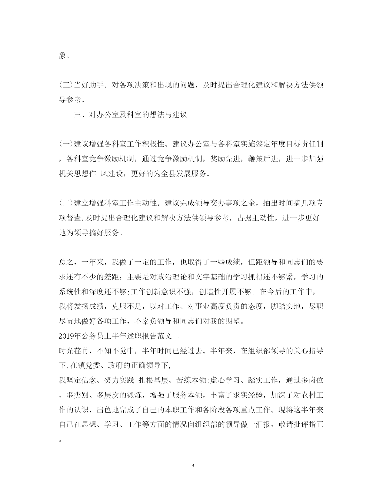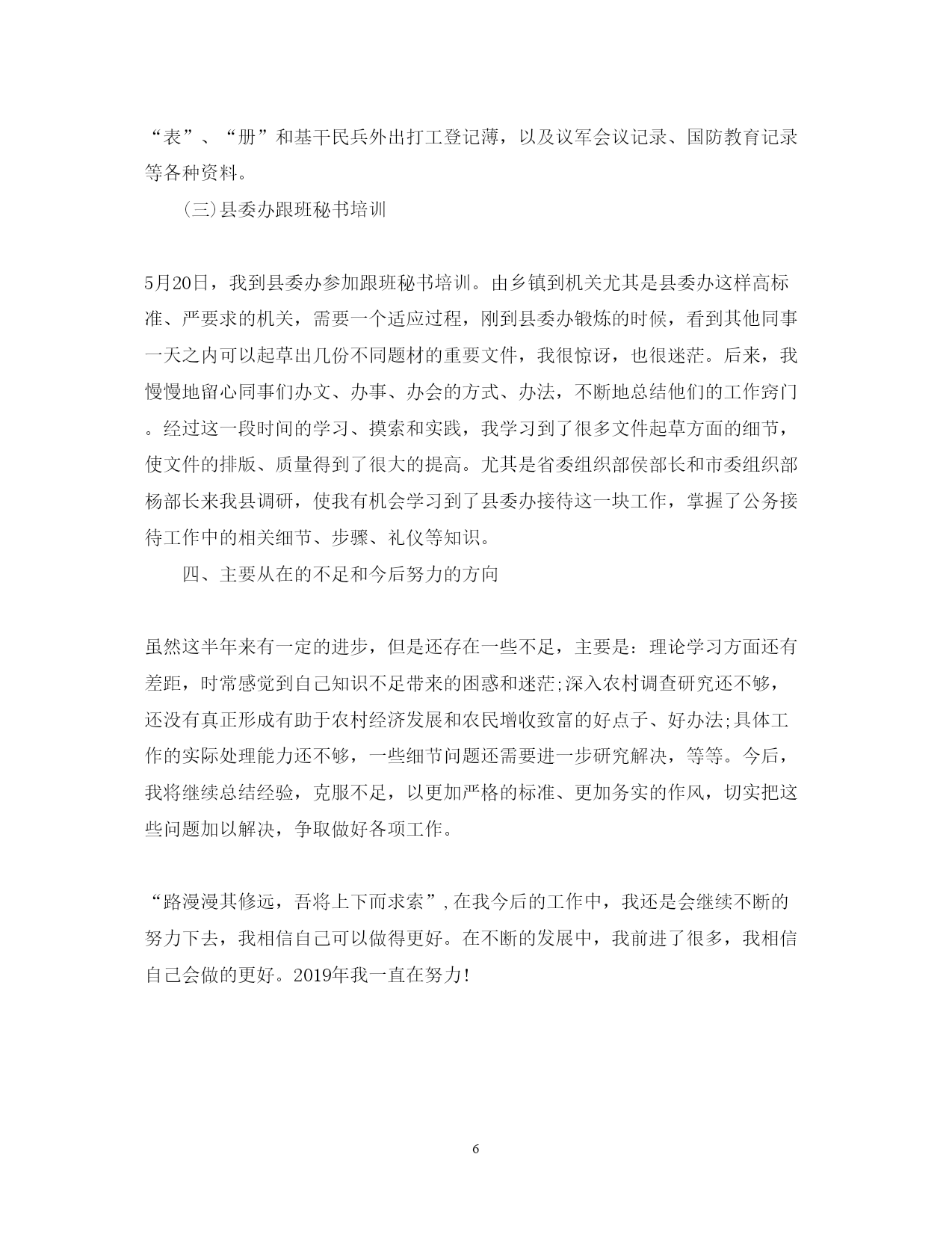 此资料由网络收集而来,如有侵权请告知上传者立即删除。资料共分享,我们负责传递知识。PAGEPAGE62020年公务员上半年述职报告在工作中,以制度、纪律规范自己的一切言行,严格遵守机关各项规章制度,尊重领导,团结同志,谦虚谨慎,下面是整理的关于2019年公务员上半年述职报告范文,欢迎阅读!2019年公务员上半年述职报告范文一今年,我从通讯员岗位转到督查岗位后,在办公室领导和机关全体同志的关怀、帮助、支持下,紧紧围绕县委督查室的中心工作,充分发挥岗位职能,不断改进工作办法,提高工作效率,以“服从领导、团结同志、认真学习、扎实工作”为准则,始终坚持高标准、严要求,较好地完成了各项工作任务。我始终把学习放在重要位置,努力在提高自身综合素质上下功夫。在政治学习方面,通过学习邓小平理论及“三个代表”的重要思想,尤其是学习xx届五中全会精神,进一步增强了党性,提高了自己政治洞察力,牢固树立了全心全意为人民服务的宗旨和正确的世界观、人生观、价值观。一、一年来的工作表现(一)强化形象,提高自身素质。为做好督查工作,我坚持严格要求自己,注重以身作则,以诚待人,一是爱岗敬业讲奉献。综合部门的工作最大地规律就是“无规律”,因此,我正确认识自身的工作和价值,正确处理苦与乐,得与失、个人利益和集体利益的关系,坚持甘于奉献、诚实敬业,二是锤炼业务讲提高。经过半年的学习和锻炼,自己在文字功夫上取得一定的进步,撰写督查专报12份、调研报告10余篇。利用办公室学习资料传阅或为各部门校稿的同时,细心学习他人长处,改掉自己不足,并虚心向领导、同事请教,在不断学习和探索中使自己在文字材料上有所提高。(二)严于律已,不断加强作风建设。一年来我对自身严格要求,始终把耐得平淡、舍得付出、默默无闻作为自己的准则,始终把作风建设的重点放在严谨、细致、扎实、求实、脚踏实地埋头苦干上。在工作中,以制度、纪律规范自己的一切言行,严格遵守机关各项规章制度,尊重领导,团结同志,谦虚谨慎,主动接受来自各方面的意见,不断改进工作;坚持做到不利于机关形象的事不做,不利于机关形象的话不说,积极维护机关的良好形象。(三)强化职能,做好服务工作。工作中,我注重把握根本,努力提高服t务水平。科室人手少,工作量大,这就需要科室人员团结协作。在这一年里,遇到各类活动和会议,我都积极配合做好会务工作,与同事心往一处想,劲往一处使,不会计较干得多,干得少,只希望把工作圆满完成。二、工作中的不足与今后的努力方向一年来的工作虽然取得了一定的成绩,但也存在一些不足,主要是思想解放程度还不够,学习、服务上还不够,和有经验的同事比较还有一定差距,材料上还在基本格式上徘徊,内容上缺少纵深挖掘的延伸,在今后工作中,我一定认真总结经验,克服不足,努力把工作做得更好。(一)发扬吃苦耐劳精神。面对督查事务杂、任务重的工作性质,不怕吃苦,主动找事干,做到“眼勤、嘴勤、手勤、腿勤”,积极适应各种艰苦环境,在繁重的工作中磨练意志,增长才干。(二)发扬孜孜不倦的进取精神。加强学习,勇于实践,博览群书,在向书本学习的同时注意收集各类信息,广泛吸取各种“营养”;同时,讲究学习办法,端正学习态度,提高学习效率,努力培养自己具有扎实的理论功底、辩证的思维办法、正确的思想观点、踏实的工作作风。力求把工作做得更好,树立办公室的良好形象。(三)当好助手。对各项决策和出现的问题,及时提出合理化建议和解决方法供领导参考。三、对办公室及科室的想法与建议(一)建议增强各科室工作积极性。建议办公室与各科室实施签定年度目标责任制,各科室竞争激励机制,通过竞争激励机制,奖励先进,鞭策后进,进一步加强机关思想作风建设,更好的为全县发展服务。(二)建立增强科室工作主动性。建议完成领导交办事项之余,抽出时间搞几项专项督查,及时提出合理化建议和解决方法供领导参考,占据主动性,进一步更好地为领导搞好服务。总之,一年来,我做了一定的工作,也取得了一些成绩,但距领导和同志们的要求还有不少的差距:主要是对政治理论和文字基础的学习抓得还不够紧,学习的系统性和深度还不够;工作创新意识不强,创造性开展不够。在今后的工作中,我将发扬成绩,克服不足,以对工作、对事业高度负责的态度,脚踏实地,尽职尽责地做好各项工作,不辜负领导和同志们对我的期望。2019年公务员上半年述职报告范文二时光荏苒,不知不觉中,半年时间已经过去。半年来,在组织部领导的关心指导下,在镇党委、政府的正确领导下,我坚定信念、努力实践;扎根基层、苦练本领;虚心学习、踏实工作,通过多岗位、多类别、多层次的锻炼,增强了服务本领,丰富了求实经验,加深了对农村工作的认识,出色地完成了自己的本职工作和各阶段各项重点工作。现将这半年来自己在思想、学习、工作等方面的情况向组织部的领导