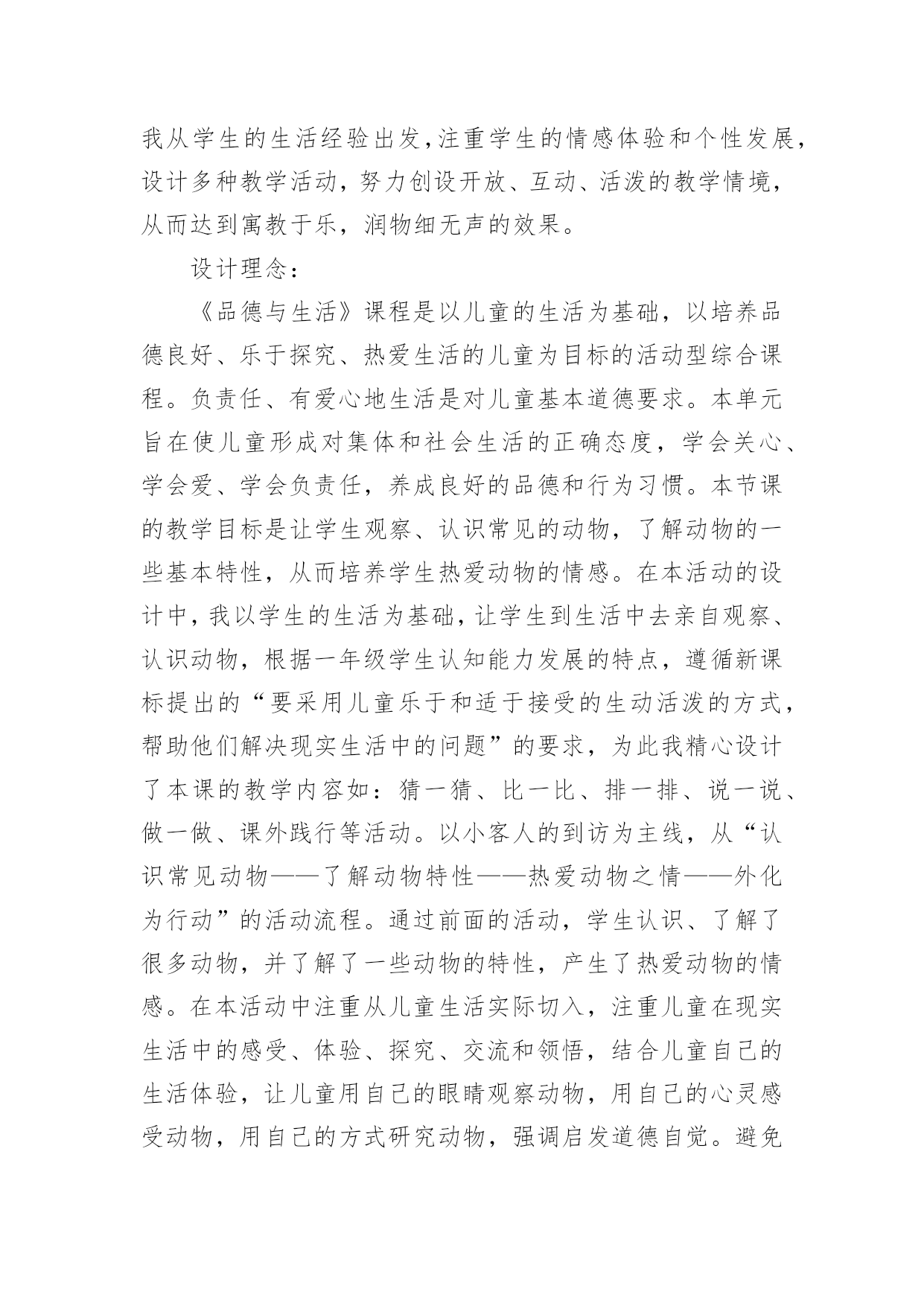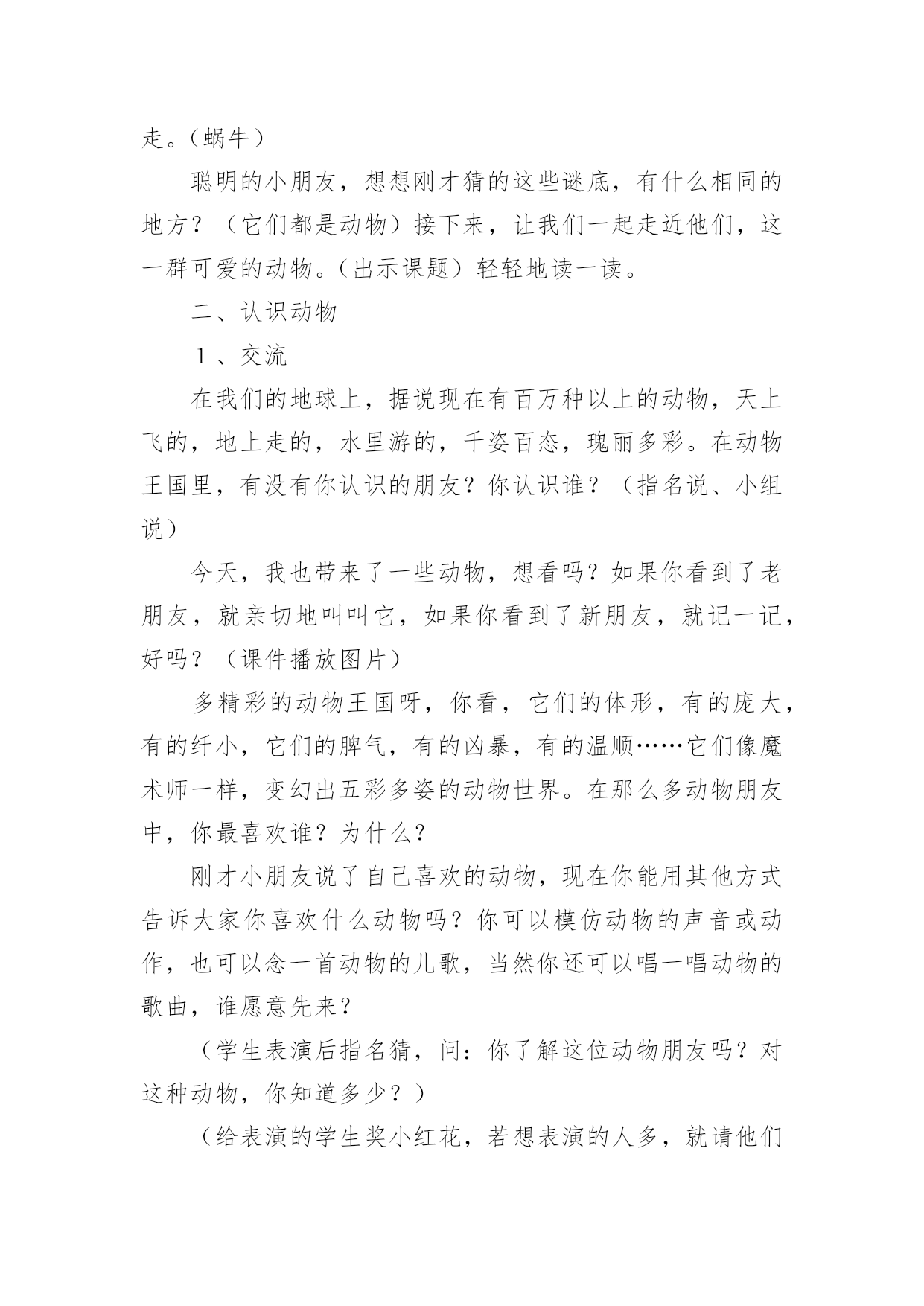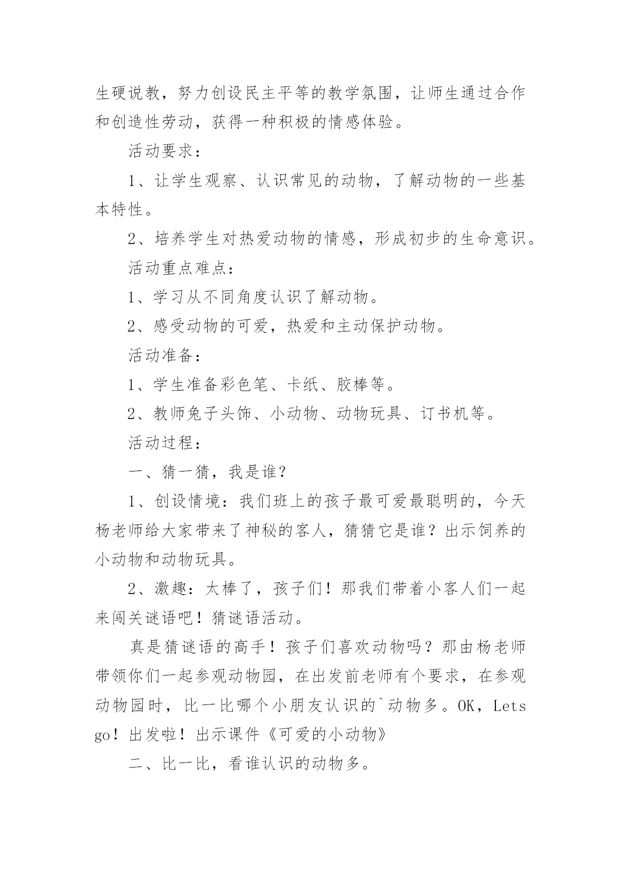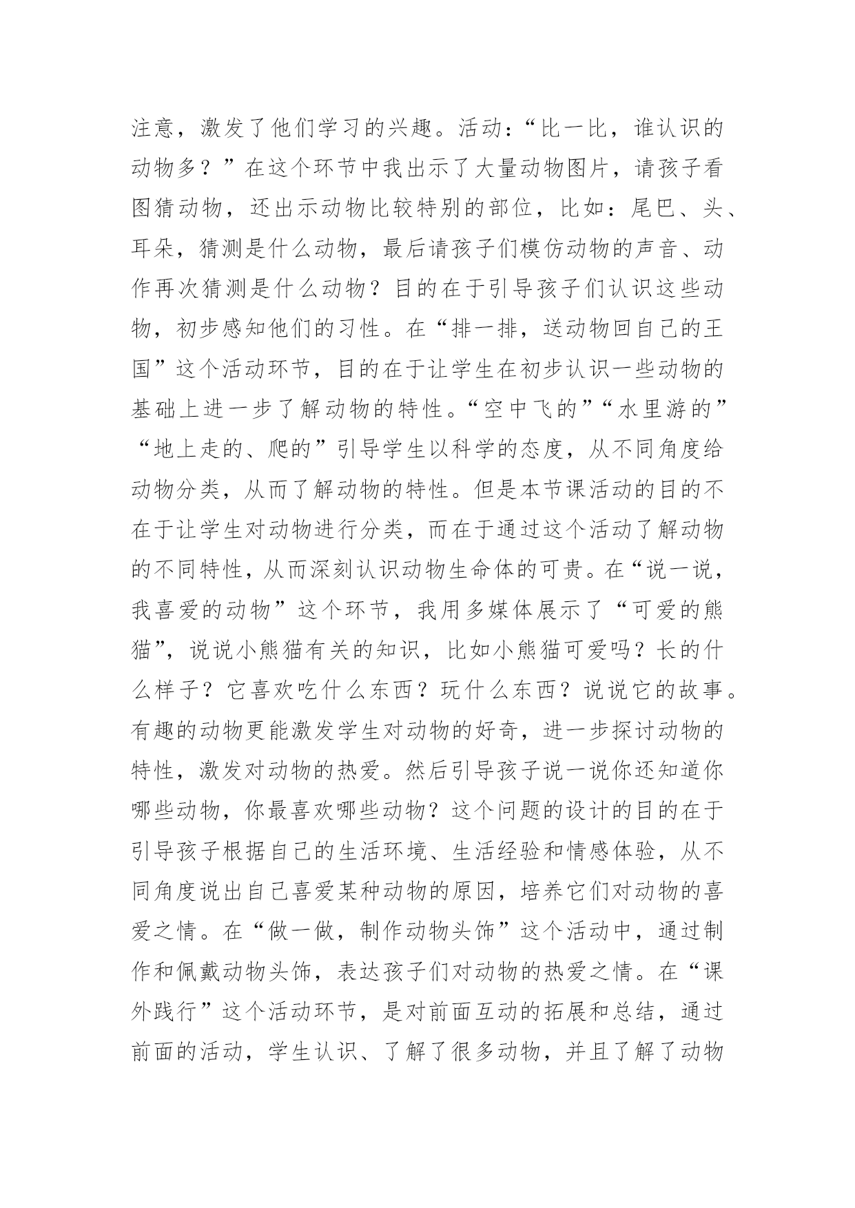 《可爱的动物》教学设计《可爱的动物》教学设计范文作为一名为他人授业解惑的教育工作者,就不得不需要编写教学设计,教学设计是对学业业绩问题的解决措施进行策划的过程。我们该怎么去写教学设计呢?以下是小编为大家整理的《可爱的动物》教学设计范文,欢迎大家借鉴与参考,希望对大家有所帮助。《可爱的动物》教学设计范文1教学目标:1、通过查看资料、互相交流等途径,初步了解动物的有关知识。2、激发喜爱动物、关爱动物的情感,能尽自己的能力保护动物。教学准备:学生:课前了解动物的有关知识。教师:课件、小红花教学预设:一、猜谜导入小朋友喜欢猜谜语吗?看谁听得仔细,猜得快。1、说他像鸡不是鸡,尾巴长长拖到地,张开尾巴摆一摆,花花绿绿真美丽。(孔雀)2、说它是头牛,不会拉犁头,说它力气小,能背屋子走。(蜗牛)聪明的小朋友,想想刚才猜的这些谜底,有什么相同的地方?(它们都是动物)接下来,让我们一起走近他们,这一群可爱的动物。(出示课题)轻轻地读一读。二、认识动物1、交流在我们的地球上,据说现在有百万种以上的动物,天上飞的,地上走的,水里游的,千姿百态,瑰丽多彩。在动物王国里,有没有你认识的朋友?你认识谁?(指名说、小组说)今天,我也带来了一些动物,想看吗?如果你看到了老朋友,就亲切地叫叫它,如果你看到了新朋友,就记一记,好吗?(课件播放图片)多精彩的动物王国呀,你看,它们的体形,有的庞大,有的纤小,它们的脾气,有的凶暴,有的温顺……它们像魔术师一样,变幻出五彩多姿的动物世界。在那么多动物朋友中,你最喜欢谁?为什么?刚才小朋友说了自己喜欢的动物,现在你能用其他方式告诉大家你喜欢什么动物吗?你可以模仿动物的声音或动作,也可以念一首动物的儿歌,当然你还可以唱一唱动物的歌曲,谁愿意先来?(学生表演后指名猜,问:你了解这位动物朋友吗?对这种动物,你知道多少?)(给表演的学生奖小红花,若想表演的人多,就请他们找自己的好朋友交流)2、找朋友动物给我们的生活带来了很多启示。现在,咱们来玩个游戏————找朋友,你觉得谁和谁是朋友?请好朋友拉起手来。三、保护动物1、动物是我们的朋友,可你们知道吗?就在我们的身边,却有许多无辜的小动物受到伤害,你们看(课件播放图片,教师配乐旁白:黑猩猩穿上了漂亮的红裙子,在表演走钢丝,也许你们会觉得很有趣,可你们知道吗?为了博得观众的小生,它们挨了多少鞭子,受了多少苦呀!可爱的'小鸟,蓝天才是它的家呀,可现在,它被捆住了双脚,牢笼成了它的家。是谁在河里丢了这样一个铁夹?它夹住了野鸭的脚,多疼啊,野鸭动也动不了,它不能和小伙伴们一起痛快的玩了。油船上400吨燃油泄漏到海里,小企鹅们成了最大的受害者。燃油会使企鹅的羽毛受到伤害,如果不及时洗去,它们很可能被冻死,也可能再也不能下水捕鱼。河水被污染了,成千上万的鱼被夺去了生命,它们浮在水面上,再也无法快活地游了。看,你看,公熊睁着一双无助的眼睛看着我们。也许它在想:人啊,人类啊,为什么这样对待我们动物,我们难道不是朋友吗?)看了这些,你想说点什么吗?2、当你看到我们身边有这样的情况时,你会怎么办?请你来说一说。四、总结保护动物就是保护我们自己,让我们行动起来,关爱身边的小动物,让我们的生活变得更加美好!《可爱的动物》教学设计范文2教分析材:《可爱的动物》是小学《品德与生活》实验教材中第二册第五单元《我爱美丽的生命》主题单元中二级主题活动《让我走近你》下的三级主题活动中的内容。《我爱美丽的生命》它体现了《全日制义务教育品德与生活课程标准(实验稿)》中“为保护周围的环境做力所能及的事,有初步的生态意识”的内容要求,让孩子们真切地感受到动植物是有生命的,它们需要人类的关心和爱护,让孩子们用自己的行动保护身边的动植物。生命可贵,人人都要懂得珍爱生命。而动植物也都有美丽的生命。《可爱的动物》一课旨在让学生观察、了解常见的动物,懂得它们也在追求生命。学情分析:一年级的学生年龄小,认知能力有限,但对孩子们来说,喜爱动物之情与生俱来,并对其中一种或者几种尤为感兴趣,这种兴趣将激发他们主动去观察认识动物。所以在上课时,我从学生的生活经验出发,注重学生的情感体验和个性发展,设计多种教学活动,努力创设开放、互动、活泼的教学情境,从而达到寓教于乐,润物细无声的效果。设计理念:《品德与生活》课程是以儿童的生活为基础,以培养品德良好、乐于探究、热爱生活的儿童为目标的活动型综合课程。负责任、有爱心地生活是对儿童基本道德要求。本单元旨在使儿童形成对集体和社会生活的正确态度,学会关心、学会爱、学会负责任,养成良好的品德和行为习惯。本节课的教学目标是让学生观察、认识常见的动物,了解动物的一些基本特性,从而培养学生热爱动物的情感。在本活动的设计中,我以学生的生活为基础,让学生到生活中去亲自观察、认识动物,根据一年级学生认知能力发展的特点