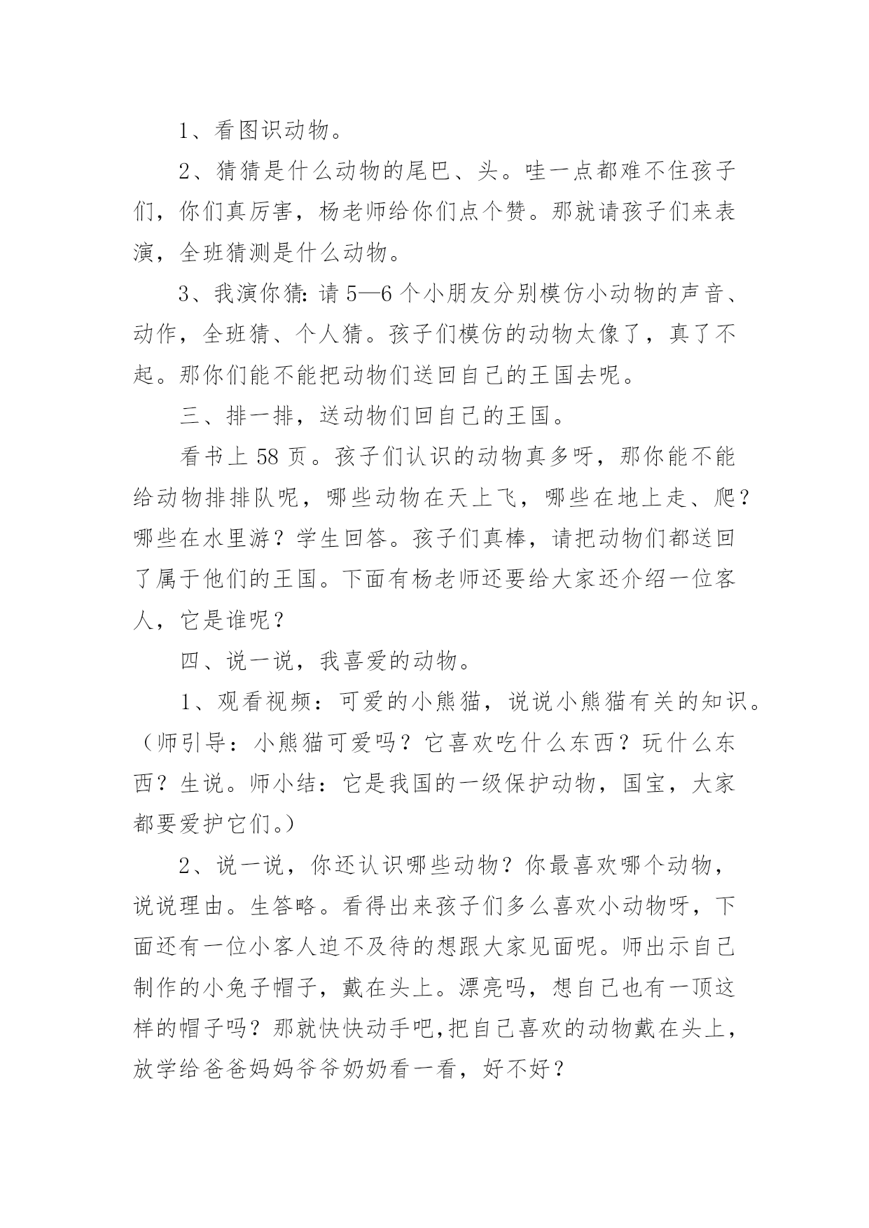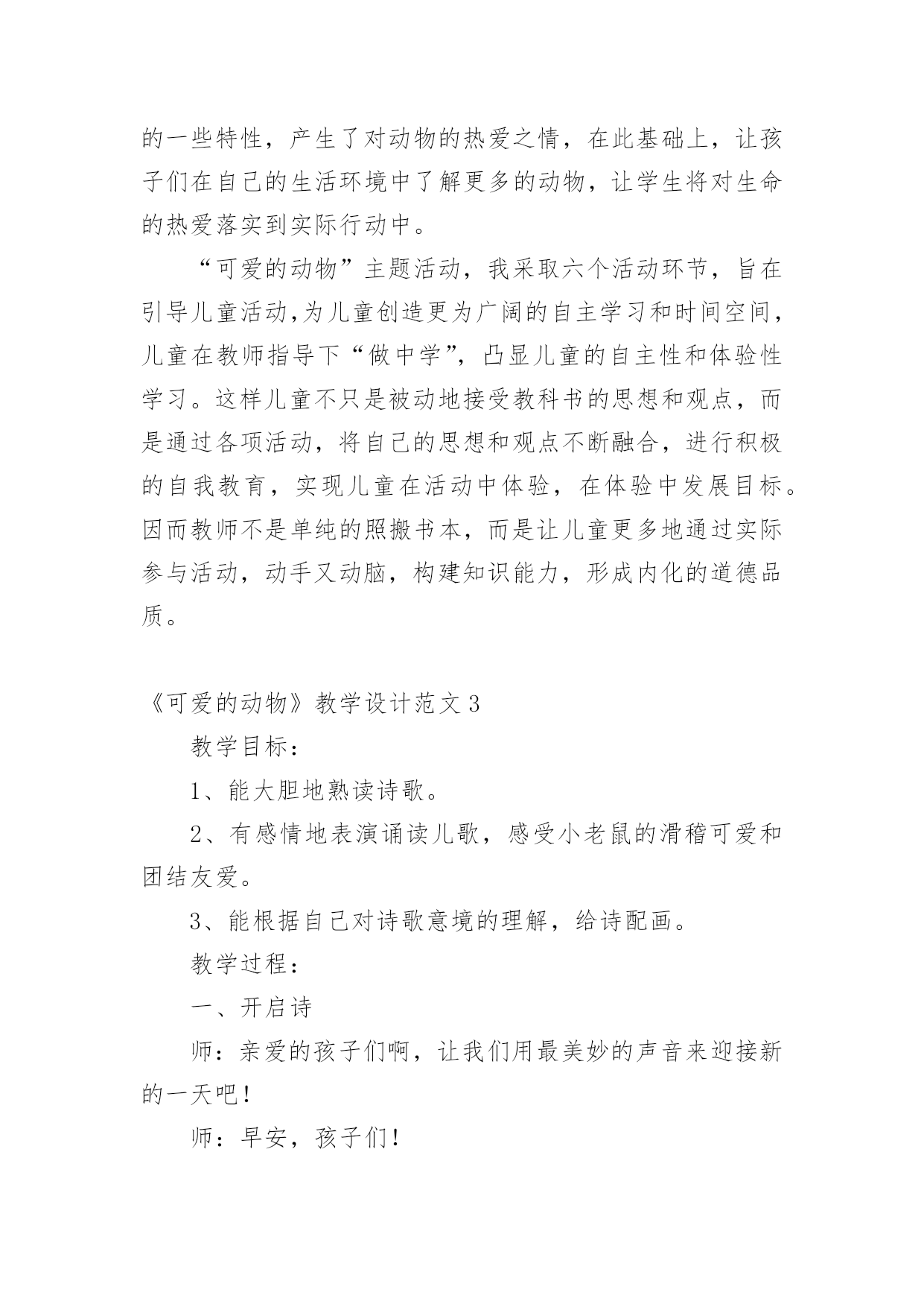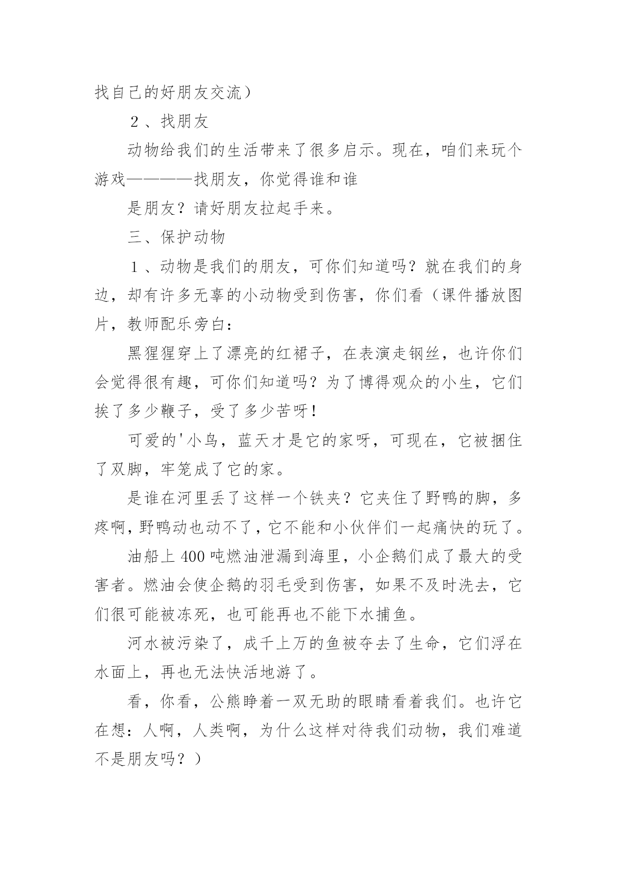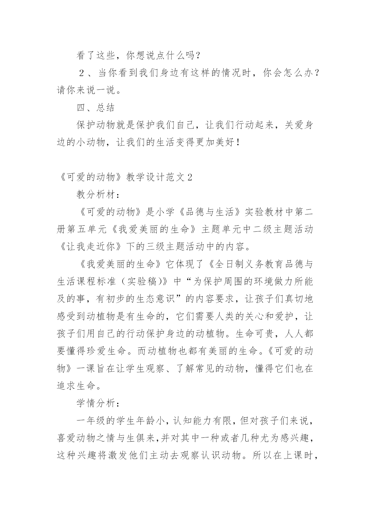 《可爱的动物》教学设计《可爱的动物》教学设计范文作为一名为他人授业解惑的教育工作者,就不得不需要编写教学设计,教学设计是对学业业绩问题的解决措施进行策划的过程。我们该怎么去写教学设计呢?以下是小编为大家整理的《可爱的动物》教学设计范文,欢迎大家借鉴与参考,希望对大家有所帮助。《可爱的动物》教学设计范文1教学目标:1、通过查看资料、互相交流等途径,初步了解动物的有关知识。2、激发喜爱动物、关爱动物的情感,能尽自己的能力保护动物。教学准备:学生:课前了解动物的有关知识。教师:课件、小红花教学预设:一、猜谜导入小朋友喜欢猜谜语吗?看谁听得仔细,猜得快。1、说他像鸡不是鸡,尾巴长长拖到地,张开尾巴摆一摆,花花绿绿真美丽。(孔雀)2、说它是头牛,不会拉犁头,说它力气小,能背屋子走。(蜗牛)聪明的小朋友,想想刚才猜的这些谜底,有什么相同的地方?(它们都是动物)接下来,让我们一起走近他们,这一群可爱的动物。(出示课题)轻轻地读一读。二、认识动物1、交流在我们的地球上,据说现在有百万种以上的动物,天上飞的,地上走的,水里游的,千姿百态,瑰丽多彩。在动物王国里,有没有你认识的朋友?你认识谁?(指名说、小组说)今天,我也带来了一些动物,想看吗?如果你看到了老朋友,就亲切地叫叫它,如果你看到了新朋友,就记一记,好吗?(课件播放图片)多精彩的动物王国呀,你看,它们的体形,有的庞大,有的纤小,它们的脾气,有的凶暴,有的温顺……它们像魔术师一样,变幻出五彩多姿的动物世界。在那么多动物朋友中,你最喜欢谁?为什么?刚才小朋友说了自己喜欢的动物,现在你能用其他方式告诉大家你喜欢什么动物吗?你可以模仿动物的声音或动作,也可以念一首动物的儿歌,当然你还可以唱一唱动物的歌曲,谁愿意先来?(学生表演后指名猜,问:你了解这位动物朋友吗?对这种动物,你知道多少?)(给表演的学生奖小红花,若想表演的人多,就请他们找自己的好朋友交流)2、找朋友动物给我们的生活带来了很多启示。现在,咱们来玩个游戏————找朋友,你觉得谁和谁是朋友?请好朋友拉起手来。三、保护动物1、动物是我们的朋友,可你们知道吗?就在我们的身边,却有许多无辜的小动物受到伤害,你们看(课件播放图片,教师配乐旁白:黑猩猩穿上了漂亮的红裙子,在表演走钢丝,也许你们会觉得很有趣,可你们知道吗?为了博得观众的小生,它们挨了多少鞭子,受了多少苦呀!可爱的'小鸟,蓝天才是它的家呀,可现在,它被捆住了双脚,牢笼成了它的家。是谁在河里丢了这样一个铁夹?它夹住了野鸭的脚,多疼啊,野鸭动也动不了,它不能和小伙伴们一起痛快的玩了。油船上400吨燃油泄漏到海里,小企鹅们成了最大的受害者。燃油会使企鹅的羽毛受到伤害,如果不及时洗去,它们很可能被冻死,也可能再也不能下水捕鱼。河水被污染了,成千上万的鱼被夺去了生命,它们浮在水面上,再也无法快活地游了。看,你看,公熊睁着一双无助的眼睛看着我们。也许它在想:人啊,人类啊,为什么这样对待我们动物,我们难道不是朋友吗?)看了这些,你想说点什么吗?2、当你看到我们身边有这样的情况时,你会怎么办?请你来说一说。四、总结保护动物就是保护我们自己,让我们行动起来,关爱身边的小动物,让我们的生活变得更加美好!《可爱的动物》教学设计范文2教分析材:《可爱的动物》是小学《品德与生活》实验教材中第二册第五单元《我爱美丽的生命》主题单元中二级主题活动《让我走近你》下的三级主题活动中的内容。《我爱美丽的生命》它体现了《全日制义务教育品德与生活课程标准(实验稿)》中“为保护周围的环境做力所能及的事,有初步的生态意识”的内容要求,让孩子们真切地感受到动植物是有生命的,它们需要人类的关心和爱护,让孩子们用自己的行动保护身边的动植物。生命可贵,人人都要懂得珍爱生命。而动植物也都有美丽的生命。《可爱的动物》一课旨在让学生观察、了解常见的动物,懂得它们也在追求生命。学情分析:一年级的学生年龄小,认知能力有限,但对孩子们来说,喜爱动物之情与生俱来,并对其中一种或者几种尤为感兴趣,这种兴趣将激发他们主动去观察认识动物。所以在上课时,我从学生的生活经验出发,注重学生的情感体验和个性发展,设计多种教学活动,努力创设开放、互动、活泼的教学情境,从而达到寓教于乐,润物细无声的效果。设计理念:《品德与生活》课程是以儿童的生活为基础,以培养品德良好、乐于探究、热爱生活的儿童为目标的活动型综合课程。负责任、有爱心地生活是对儿童基本道德要求。本单元旨在使儿童形成对集体和社会生活的正确态度,学会关心、学会爱、学会负责任,养成良好的品德和行为习惯。本节课的教学目标是让学生观察、认识常见的动物,了解动物的一些基本特性,从而培养学生热爱动物的情感。在本活动的设计中,我以学生的生活为基础,让学生到生活中去亲自观察、认识动物,根据一年级学生认知能力发展的特点