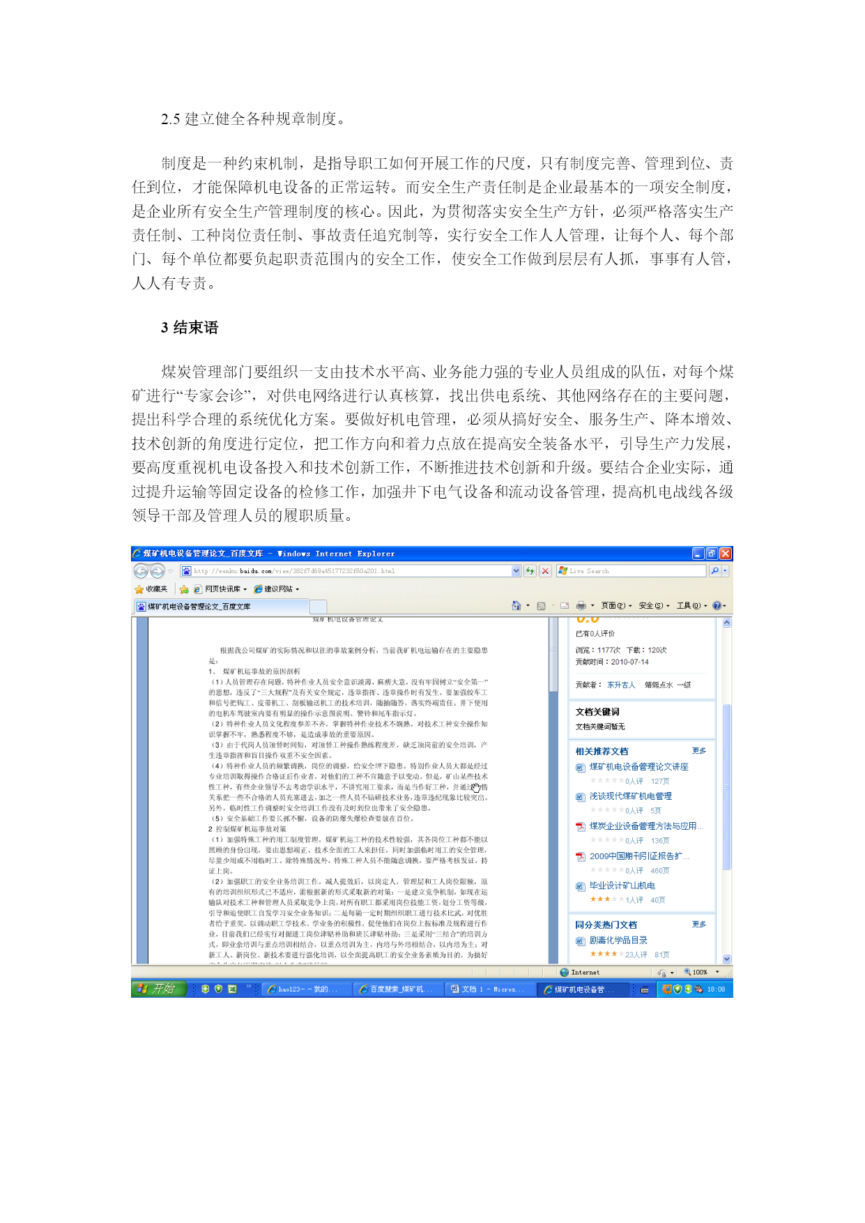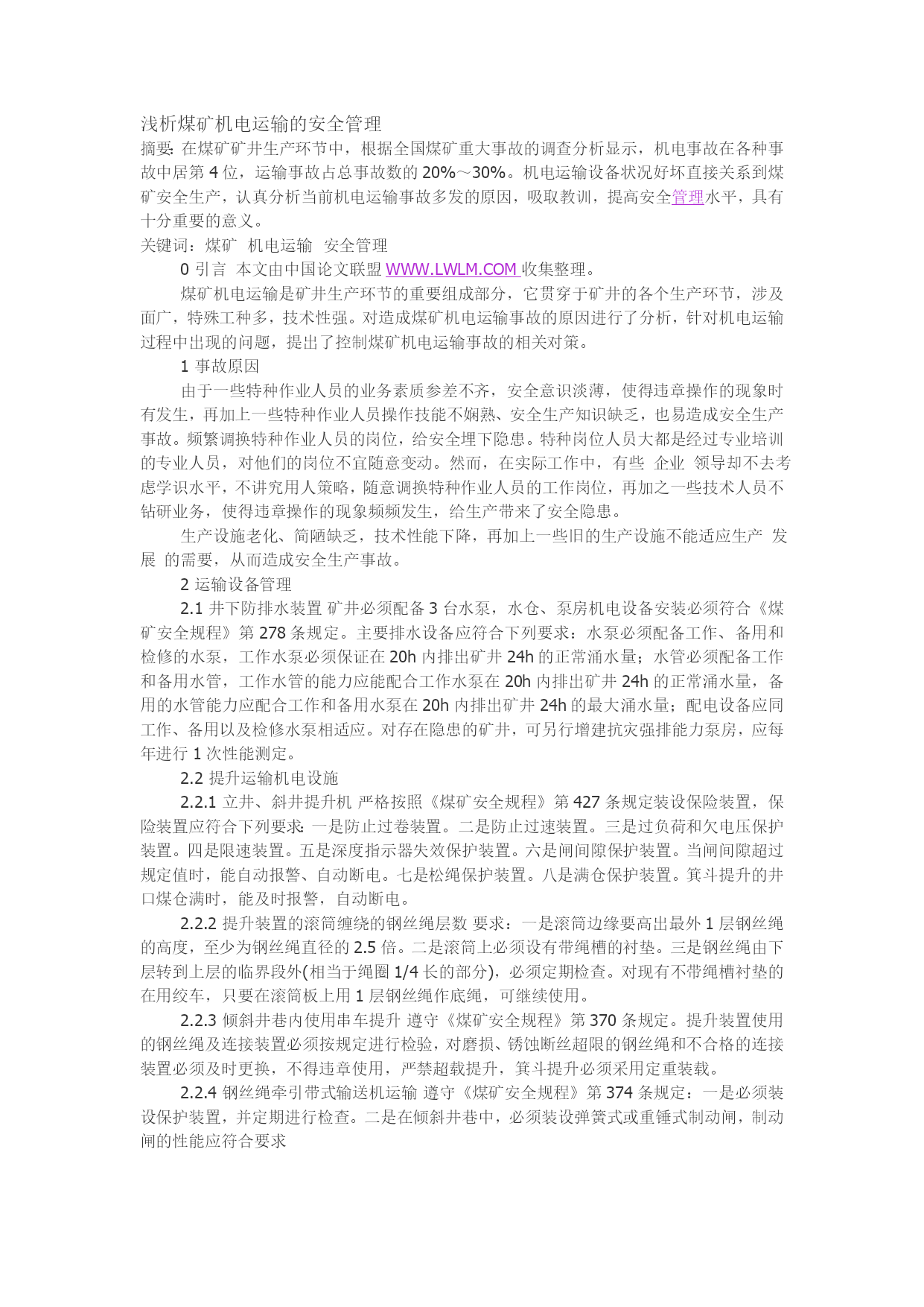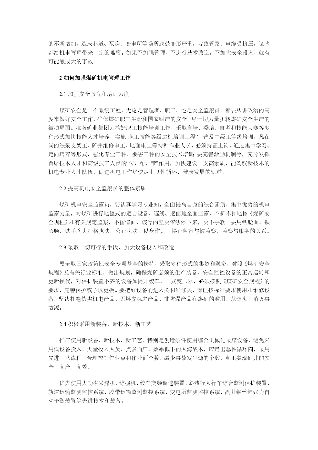 浅析如何加强煤矿机电安全管理工作摘要:近年来,随着各煤矿企业不断引进新技术,机械化水平不断提高,对煤矿机电的管理也日趋完善,但是当前煤矿机电管理工作中还存在机电监察力度和深度不够、超能力生产与设备老化、设备投入不足等问题。本文针对煤矿机电管理工作中存在的问题进行探讨。关键词:煤矿;机电管理根据现场管理中存在的问题,结合实际情况进行了分析研究,提出应对措施。1煤矿机电管理工作中存在的问题1.1机电监察力度和深度不够煤矿机电安全监察员在认识和素质上也有差距,煤矿机电专业性强,所涉及的知识面相当广泛,要求监察人员素质全面,而现行的执行标准有时又无详细的操作说明,甚至有的还有一定的回旋余地,无十分准确而清楚的界限,这就不可避免地造成监察过程中有时难以把握。煤矿机电安全监察员大多从基层而来,深知基层之甘苦,有时一下难以完全放下情面。在专业性很强的机电安全监察中,又由于专业监察人员少,而机电运输系统战线长、范围广,安全监察普遍采用抽查式,监察的随机性大,缺乏全面性,缺乏主动性。矿井机电较其他专业复杂,而现场监察中,基本上放在设备状况,是否失去防爆性能,一些表面现象掩盖不少深层次问题,缺乏对管理制度、安全性能、动态情况的了解。在监察中,自己去动手、去打开开关、去检查各类保护、去翻阅各类记录资料,深入采掘工作面、深入机房、深入到车间、区队发现问题、督促被检单位整改的情况少。1.2超能力生产与设备老化近年来,受经济快速发展的强劲拉动以及煤炭作为我国基础能源和重要原料的战略地位的影响,煤炭产量激增,未来仍将处在高位增长阶段,受利益驱动,煤炭企业常把生产任务摆在第一位,而机电安全则摆在被动应付生产、充当配角的位置,设备“连轴转”现象很普遍,没有足够的检修保养时间。由于历史原因,安全装备和设备投入欠帐较多,随着煤矿安全生产的需要,对这些在用的设备提出了新的要求,国有煤矿中老绞车、老的防爆高压开关、未更换的非阻燃胶带、老主扇等数量很多。这些设备中,主提升机单线制动,高压开关保护不全,主扇满足不了矿井风量负压的要求,存在隐患很多,加之这些年对设备的技术测定不及时,测试手段落后,对存在的问题难以发现,事故隐患不少。1.3深部开采对机电管理的影响随着矿井延深开采,矿井的垂深一般都在600~800m,有的已达1000m以上,多水平提升,接力排水,造成了供电线路加长、负荷增加、网络复杂的现象。深部开采地温和压力的不断增加,造成巷道、泵房、变电所等场所底鼓变形严重,导致管路、电缆受挤压,这些都给机电管理带来一定的难度。如果不加强管理,不进行技术改造,不加大安全投入,就有可能酿成大的事故。2如何加强煤矿机电管理工作2.1加强安全教育和培训力度煤矿安全是一个系统工程,无论是管理者、职工、还是安全监察员,都要从讲政治的高度来做好安全工作,确保煤矿职工生命和国家财产的安全,尽一切力量扭转煤矿安全生产的被动局面。淮南矿业集团为搞好职工技能培训工作,采取自培、委培、自考和技能大赛等多种形式加快技能人才培养,实施“职工技能等级达标培训工程”,普及中级工等级培训,凡在岗的综采支架工、矿井维修电工、地面电工等特种作业人员,必须持证上岗,通过集中学习、定向培养等形式,强化专业工种、要害工种的安全技术培训;要完善激励机制等,充分发挥首席技术人才和高级技工人员的“传、帮、带”作用,加快建设一支高素质、能驾驭新技术的机电专业人才队伍,促进机电工作尽快走上良性循环、健康发展的轨道。2.2提高机电安全监察员的整体素质煤矿机电安全监察员,要认真学习专业知,全面提高自身的综合素质,集中优势的机电监察力量,对煤矿进行地毯式的逐台设备、逐线、逐面地全面监察,不折不扣地按《煤矿安全规程》和有关规定监察,不留情面,该停的坚决依法停下来,决不手软。要用铁脸面、铁心肠、铁手腕去严格执法,公正执法,以身作则,摆正监察与被监察、监察与服务的关系。2.3采取一切可行的手段,加大设备投入和改造要争取国家政策性安全专项基金的扶持,采取多种形式的集资和融资,对照《煤矿安全规程》及有关行业标准,做出规划,确保煤矿必须的生产装备、安全监控设备的正常运转和更新换代,对保护装置不齐的设备如提升绞车、干式变压器,必须按照《煤矿安全规程》的要求,完善保护或予以更换。要把好设备的进入关和维修关,保证按标准要求使用和维修设备,坚决杜绝伪劣机电产品、无煤安标志产品、非防爆产品在煤矿的滥用,从源头上消灭事故源。2.4积极采用新装备、新技术、新工艺推广使用新设备、新技术、新工艺,特别是创造条件使用综合机械化采煤设备,避免采用低设备投入、大量投入人员、点多面广、效率低下的人海战术,应走出恶性循环圈,采用先进工艺流程,合理控制作业点和作业面个数,减少事故发生源的个数,真正实现矿井的安全、高产、高效。优先