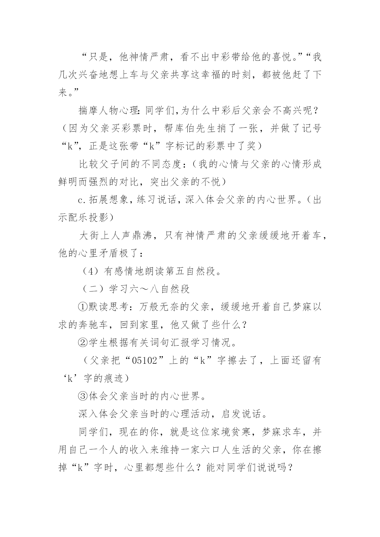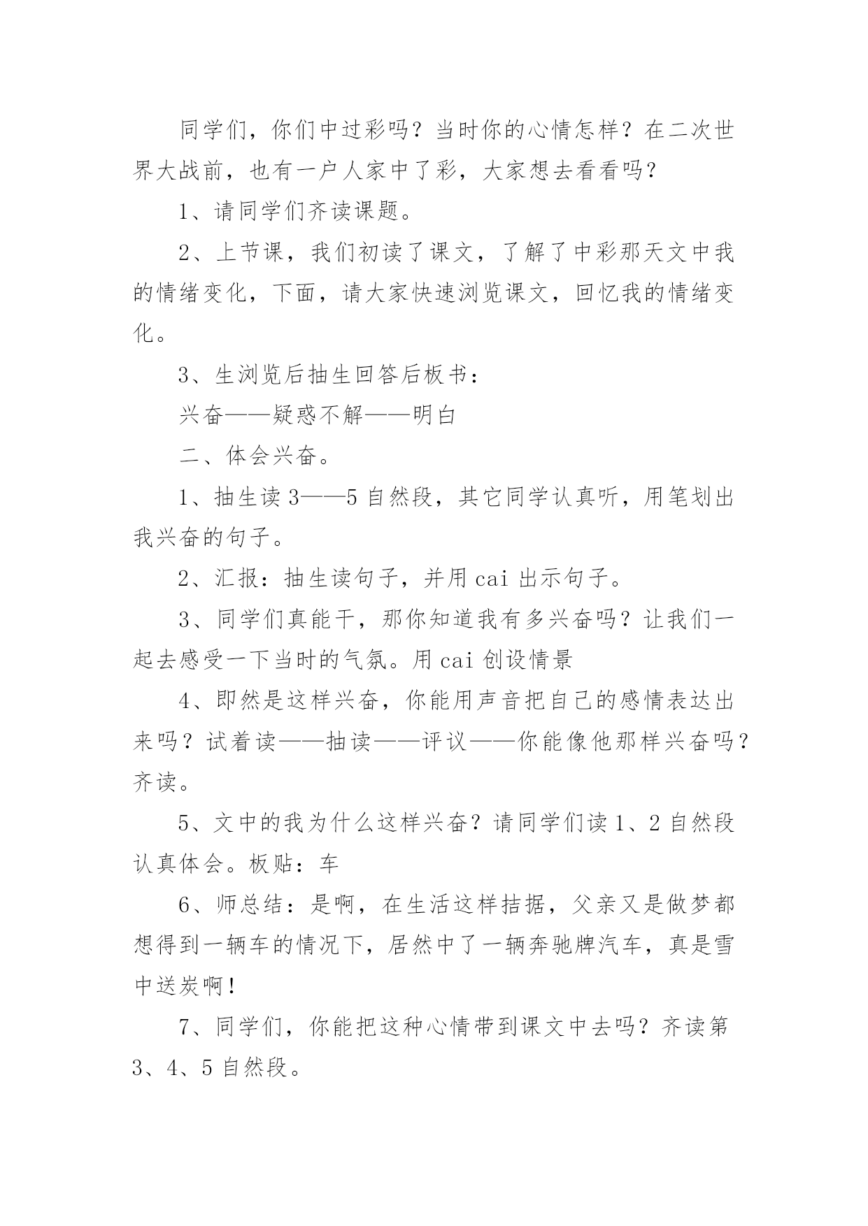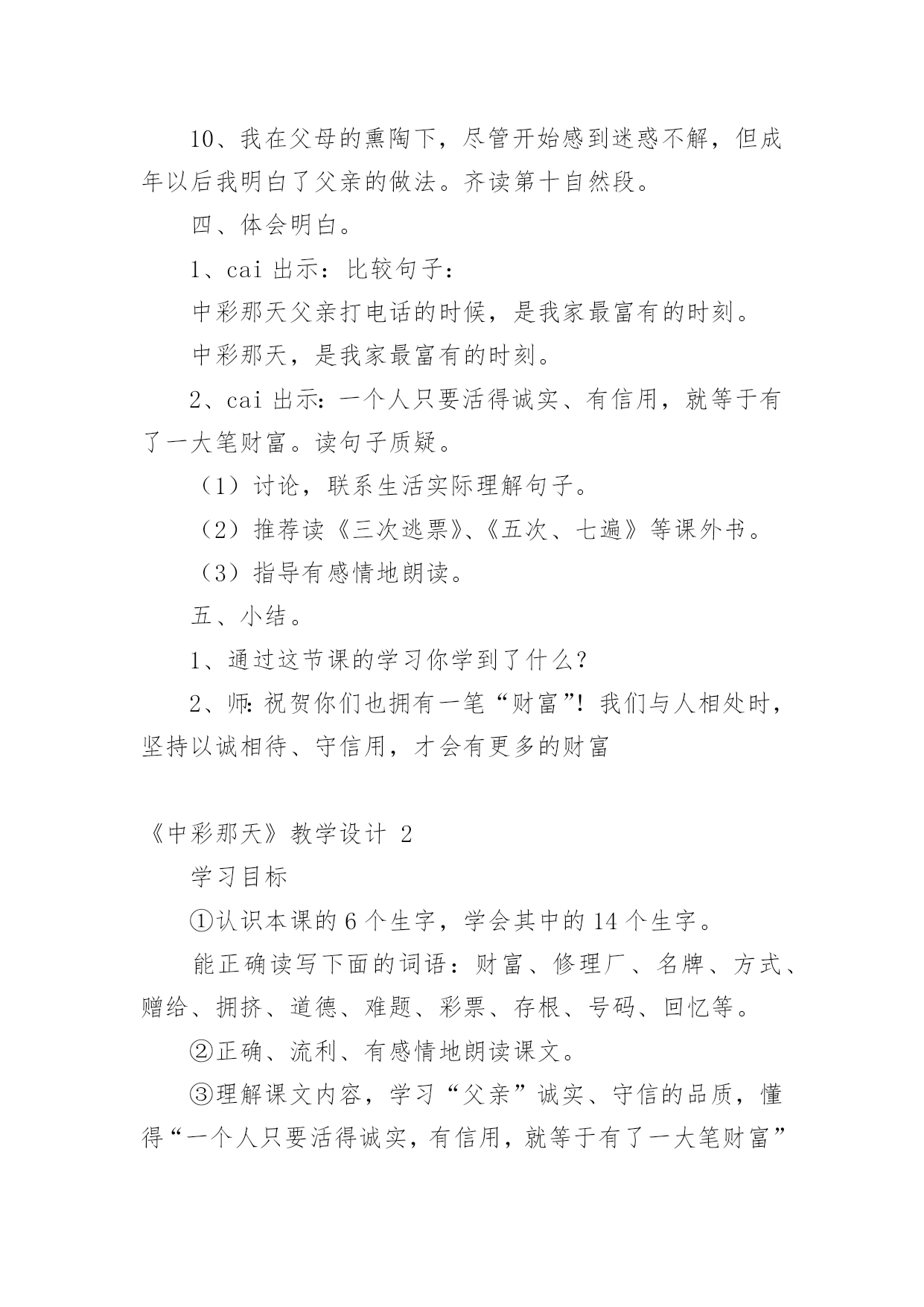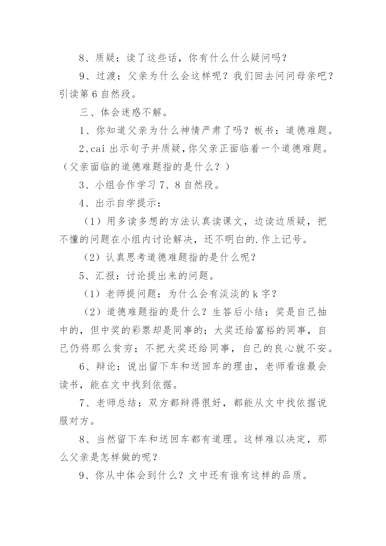 《中彩那天》教学设计《中彩那天》教学设计15篇作为一位杰出的教职工,时常要开展教学设计的准备工作,教学设计是把教学原理转化为教学材料和教学活动的计划。那么问题来了,教学设计应该怎么写?下面是小编整理的《中彩那天》教学设计,仅供参考,希望能够帮助到大家。《中彩那天》教学设计1教学目标:1、正确、流利、有感情地朗读课文。2、会用联系上下文来理解重点句子3、理解课文内容,学习“父亲”诚实、守信的优秀品质。教学重点、难点:理解“父亲”面临的道德难题及重点句子和含义深刻的句子。教具准备:多媒体课件。教学过程:第二课时一、谈话引入。同学们,你们中过彩吗?当时你的心情怎样?在二次世界大战前,也有一户人家中了彩,大家想去看看吗?1、请同学们齐读课题。2、上节课,我们初读了课文,了解了中彩那天文中我的情绪变化,下面,请大家快速浏览课文,回忆我的情绪变化。3、生浏览后抽生回答后板书:兴奋——疑惑不解——明白二、体会兴奋。1、抽生读3——5自然段,其它同学认真听,用笔划出我兴奋的句子。2、汇报:抽生读句子,并用cai出示句子。3、同学们真能干,那你知道我有多兴奋吗?让我们一起去感受一下当时的气氛。用cai创设情景4、即然是这样兴奋,你能用声音把自己的感情表达出来吗?试着读——抽读——评议——你能像他那样兴奋吗?齐读。5、文中的我为什么这样兴奋?请同学们读1、2自然段认真体会。板贴:车6、师总结:是啊,在生活这样拮据,父亲又是做梦都想得到一辆车的情况下,居然中了一辆奔驰牌汽车,真是雪中送炭啊!7、同学们,你能把这种心情带到课文中去吗?齐读第3、4、5自然段。8、质疑:读了这些话,你有什么什么疑问吗?9、过渡:父亲为什么会这样呢?我们回去问问母亲吧?引读第6自然段。三、体会迷惑不解。1、你知道父亲为什么神情严肃了吗?板书:道德难题。2、cai出示句子并质疑,你父亲正面临着一个道德难题。(父亲面临的道德难题指的是什么?)3、小组合作学习7、8自然段。4、出示自学提示:(1)用多读多想的方法认真读课文,边读边质疑,把不懂的问题在小组内讨论解决,还不明白的.作上记号。(2)认真思考道德难题指的是什么呢?5、汇报:讨论提出来的问题。(1)老师提问题:为什么会有淡淡的k字?(2)道德难题指的是什么?生答后小结:奖是自己抽中的,但中奖的彩票却是同事的;大奖还给富裕的同事,自己仍将那么贫穷;不把大奖还给同事,自己的良心就不安。6、辩论:说出留下车和送回车的理由,老师看谁最会读书,能在文中找到依据。7、老师总结:双方都辩得很好,都能从文中找依据说服对方。8、当然留下车和送回车都有道理。这样难以决定,那么父亲是怎样做的呢?9、你从中体会到什么?文中还有谁有这样的品质。10、我在父母的熏陶下,尽管开始感到迷惑不解,但成年以后我明白了父亲的做法。齐读第十自然段。四、体会明白。1、cai出示:比较句子:中彩那天父亲打电话的时候,是我家最富有的时刻。中彩那天,是我家最富有的时刻。2、cai出示:一个人只要活得诚实、有信用,就等于有了一大笔财富。读句子质疑。(1)讨论,联系生活实际理解句子。(2)推荐读《三次逃票》、《五次、七遍》等课外书。(3)指导有感情地朗读。五、小结。1、通过这节课的学习你学到了什么?2、师:祝贺你们也拥有一笔“财富”!我们与人相处时,坚持以诚相待、守信用,才会有更多的财富《中彩那天》教学设计2学习目标①认识本课的6个生字,学会其中的14个生字。能正确读写下面的词语:财富、修理厂、名牌、方式、赠给、拥挤、道德、难题、彩票、存根、号码、回忆等。②正确、流利、有感情地朗读课文。③理解课文内容,学习“父亲”诚实、守信的品质,懂得“一个人只要活得诚实,有信用,就等于有了一大笔财富”这句话的含义。④想象人物的心理活动,体会情感。课前准备写着名言的投影片。第一课时●名言导入,直奔中心①导入:齐读一句名言:(出示投影)“一个人只要活得诚实,有信用,就等于有了一大笔财富。”一位普通的母亲朗读课文,通过这节课的学习,你除了记得这句话,还了解了哪些内容?(再次感知课文内容,引导学生明白父亲遇到了什么样的“道德难题”)●品析词句,探究父亲的心理变化过程(一)学习三~五自然段走向父亲的心灵深处,去细细品味这位家境贫寒的父亲,在中大奖后的那复杂而又矛盾的心理过程。①自读三~五自然段,并用“──”画出描写父亲中彩后表情的句子。②学生汇报学习情况,品析词句。a.中彩后的父亲有怎样的表情?(中彩获车──神情严肃)b.品读句子:“只是,他神情严肃,看不出中彩带给他的喜悦。”“我几次兴奋地想上车与父亲共享这幸福的时刻,都被他赶了下来。”揣摩人物心理:同学们,为什么中彩后父亲会不高兴呢?(因为父亲买彩票时,帮库伯先生捎了一张,并做了记号“k”,正是这张带“k”字标记的彩票中了奖)比较父子间的