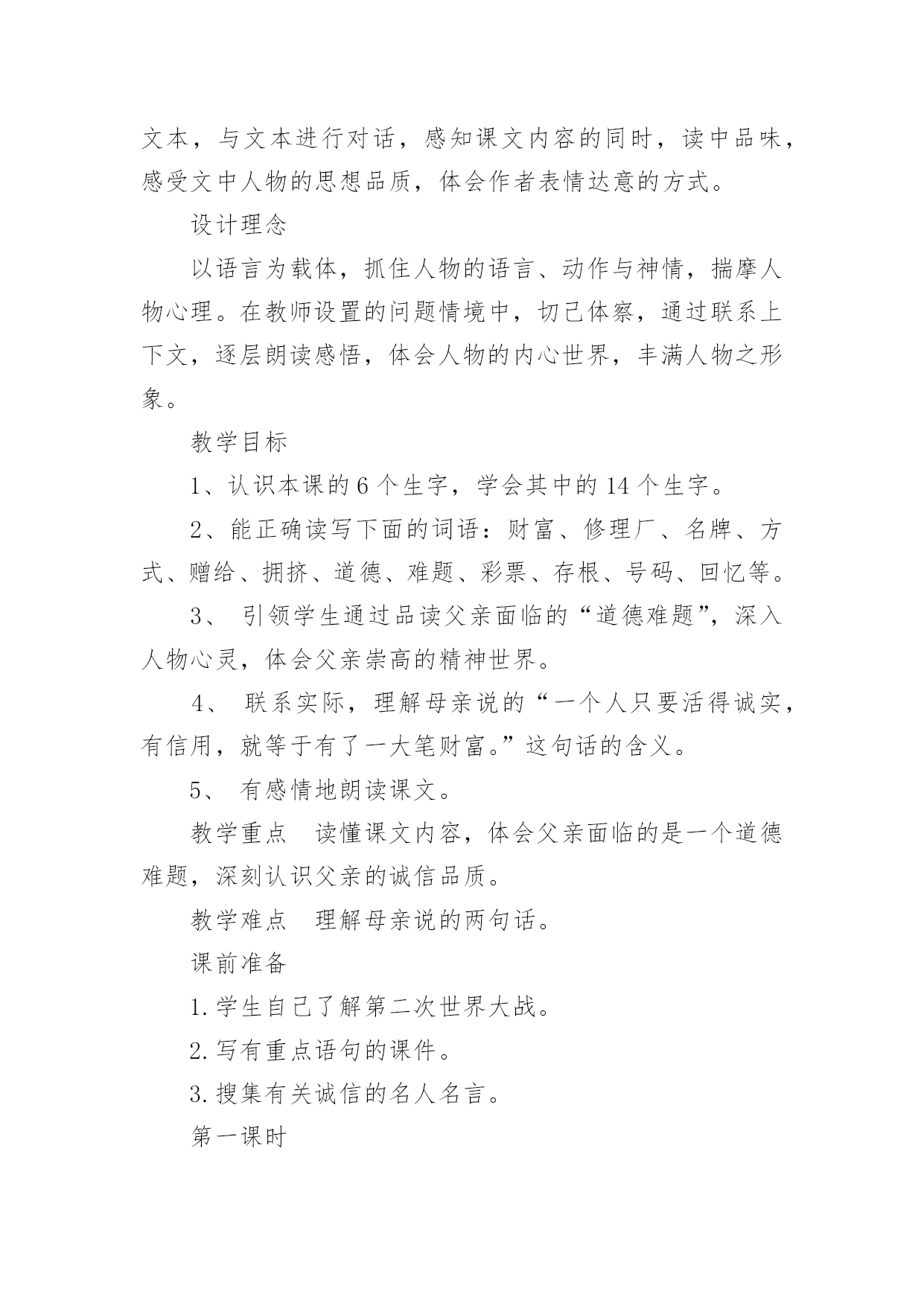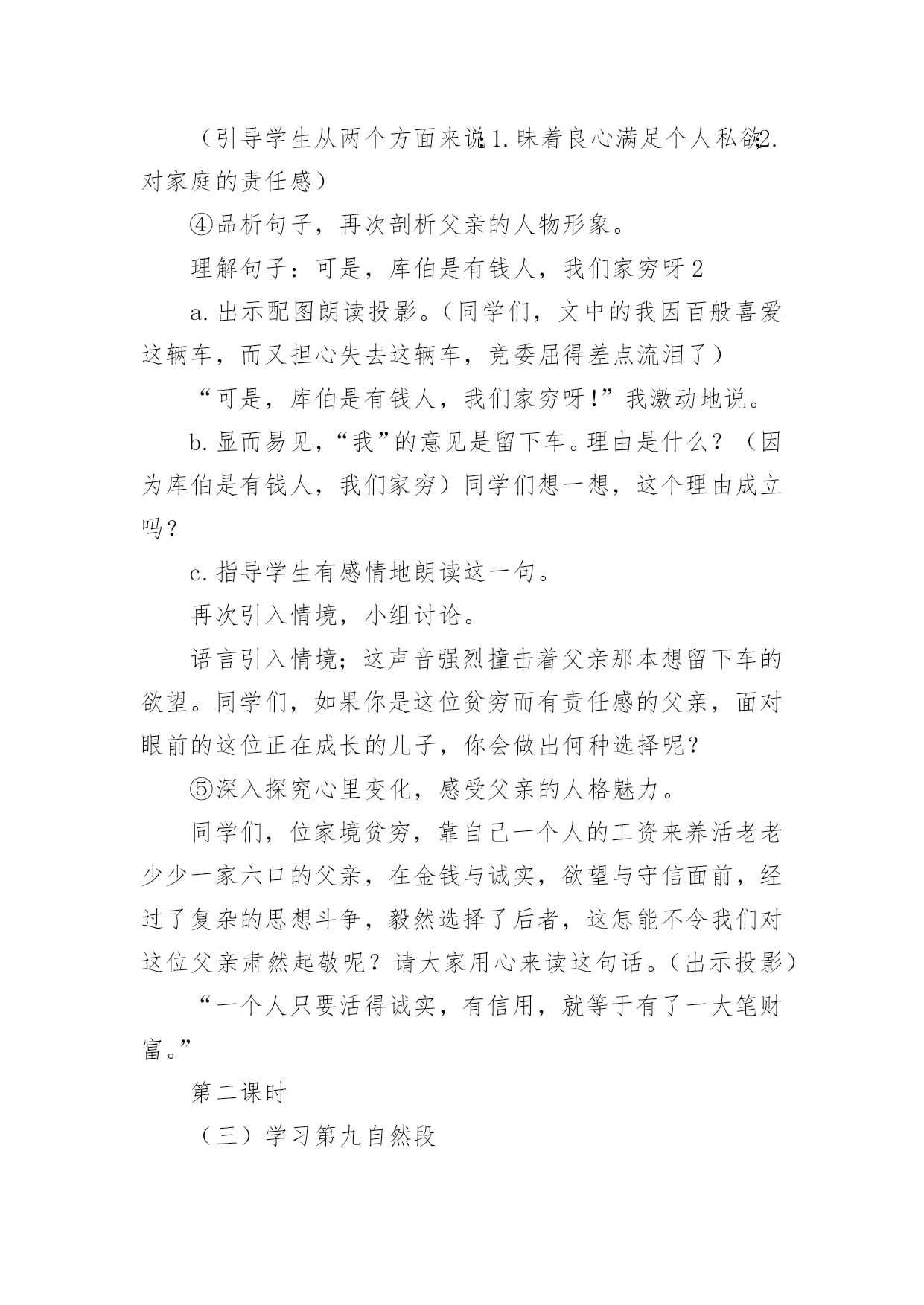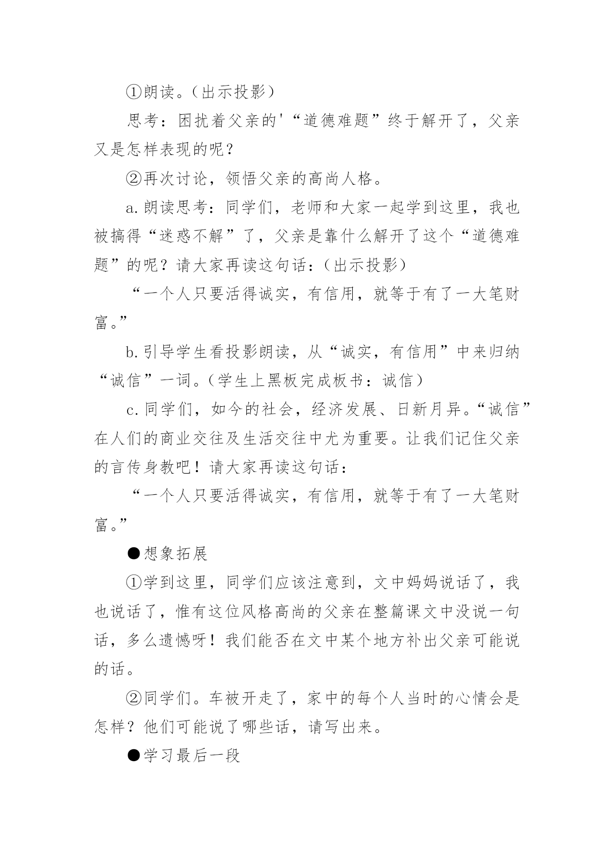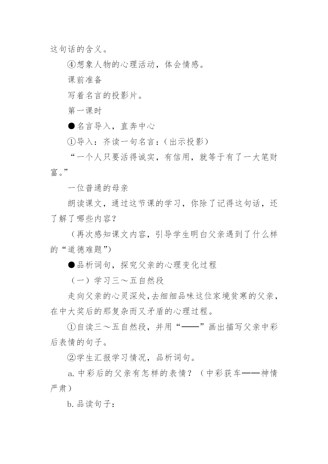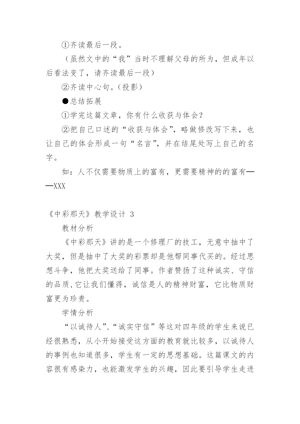 《中彩那天》教学设计《中彩那天》教学设计15篇作为一位杰出的教职工,时常要开展教学设计的准备工作,教学设计是把教学原理转化为教学材料和教学活动的计划。那么问题来了,教学设计应该怎么写?下面是小编整理的《中彩那天》教学设计,仅供参考,希望能够帮助到大家。《中彩那天》教学设计1教学目标:1、正确、流利、有感情地朗读课文。2、会用联系上下文来理解重点句子3、理解课文内容,学习“父亲”诚实、守信的优秀品质。教学重点、难点:理解“父亲”面临的道德难题及重点句子和含义深刻的句子。教具准备:多媒体课件。教学过程:第二课时一、谈话引入。同学们,你们中过彩吗?当时你的心情怎样?在二次世界大战前,也有一户人家中了彩,大家想去看看吗?1、请同学们齐读课题。2、上节课,我们初读了课文,了解了中彩那天文中我的情绪变化,下面,请大家快速浏览课文,回忆我的情绪变化。3、生浏览后抽生回答后板书:兴奋——疑惑不解——明白二、体会兴奋。1、抽生读3——5自然段,其它同学认真听,用笔划出我兴奋的句子。2、汇报:抽生读句子,并用cai出示句子。3、同学们真能干,那你知道我有多兴奋吗?让我们一起去感受一下当时的气氛。用cai创设情景4、即然是这样兴奋,你能用声音把自己的感情表达出来吗?试着读——抽读——评议——你能像他那样兴奋吗?齐读。5、文中的我为什么这样兴奋?请同学们读1、2自然段认真体会。板贴:车6、师总结:是啊,在生活这样拮据,父亲又是做梦都想得到一辆车的情况下,居然中了一辆奔驰牌汽车,真是雪中送炭啊!7、同学们,你能把这种心情带到课文中去吗?齐读第3、4、5自然段。8、质疑:读了这些话,你有什么什么疑问吗?9、过渡:父亲为什么会这样呢?我们回去问问母亲吧?引读第6自然段。三、体会迷惑不解。1、你知道父亲为什么神情严肃了吗?板书:道德难题。2、cai出示句子并质疑,你父亲正面临着一个道德难题。(父亲面临的道德难题指的是什么?)3、小组合作学习7、8自然段。4、出示自学提示:(1)用多读多想的方法认真读课文,边读边质疑,把不懂的问题在小组内讨论解决,还不明白的.作上记号。(2)认真思考道德难题指的是什么呢?5、汇报:讨论提出来的问题。(1)老师提问题:为什么会有淡淡的k字?(2)道德难题指的是什么?生答后小结:奖是自己抽中的,但中奖的彩票却是同事的;大奖还给富裕的同事,自己仍将那么贫穷;不把大奖还给同事,自己的良心就不安。6、辩论:说出留下车和送回车的理由,老师看谁最会读书,能在文中找到依据。7、老师总结:双方都辩得很好,都能从文中找依据说服对方。8、当然留下车和送回车都有道理。这样难以决定,那么父亲是怎样做的呢?9、你从中体会到什么?文中还有谁有这样的品质。10、我在父母的熏陶下,尽管开始感到迷惑不解,但成年以后我明白了父亲的做法。齐读第十自然段。四、体会明白。1、cai出示:比较句子:中彩那天父亲打电话的时候,是我家最富有的时刻。中彩那天,是我家最富有的时刻。2、cai出示:一个人只要活得诚实、有信用,就等于有了一大笔财富。读句子质疑。(1)讨论,联系生活实际理解句子。(2)推荐读《三次逃票》、《五次、七遍》等课外书。(3)指导有感情地朗读。五、小结。1、通过这节课的学习你学到了什么?2、师:祝贺你们也拥有一笔“财富”!我们与人相处时,坚持以诚相待、守信用,才会有更多的财富《中彩那天》教学设计2学习目标①认识本课的6个生字,学会其中的14个生字。能正确读写下面的词语:财富、修理厂、名牌、方式、赠给、拥挤、道德、难题、彩票、存根、号码、回忆等。②正确、流利、有感情地朗读课文。③理解课文内容,学习“父亲”诚实、守信的品质,懂得“一个人只要活得诚实,有信用,就等于有了一大笔财富”这句话的含义。④想象人物的心理活动,体会情感。课前准备写着名言的投影片。第一课时●名言导入,直奔中心①导入:齐读一句名言:(出示投影)“一个人只要活得诚实,有信用,就等于有了一大笔财富。”一位普通的母亲朗读课文,通过这节课的学习,你除了记得这句话,还了解了哪些内容?(再次感知课文内容,引导学生明白父亲遇到了什么样的“道德难题”)●品析词句,探究父亲的心理变化过程(一)学习三~五自然段走向父亲的心灵深处,去细细品味这位家境贫寒的父亲,在中大奖后的那复杂而又矛盾的心理过程。①自读三~五自然段,并用“──”画出描写父亲中彩后表情的句子。②学生汇报学习情况,品析词句。a.中彩后的父亲有怎样的表情?(中彩获车──神情严肃)b.品读句子:“只是,他神情严肃,看不出中彩带给他的喜悦。”“我几次兴奋地想上车与父亲共享这幸福的时刻,都被他赶了下来。”揣摩人物心理:同学们,为什么中彩后父亲会不高兴呢?(因为父亲买彩票时,帮库伯先生捎了一张,并做了记号“k”,正是这张带“k”字标记的彩票中了奖)比较父子间的