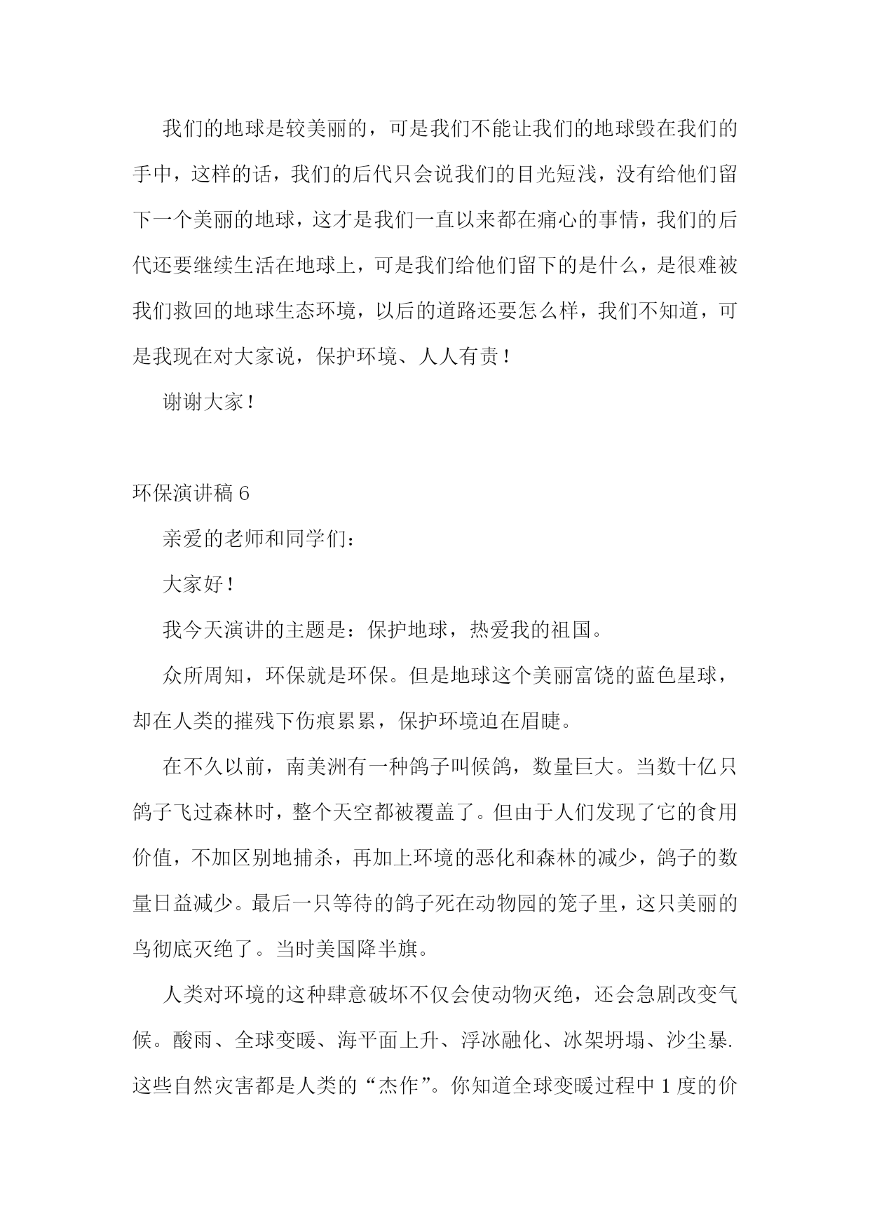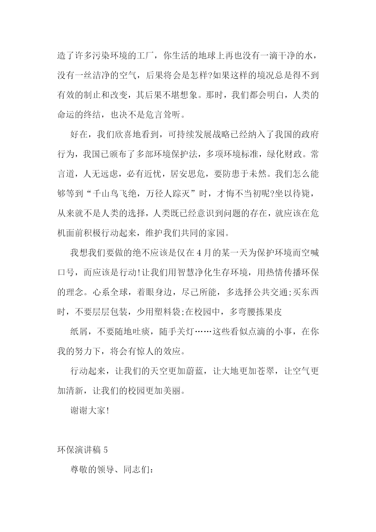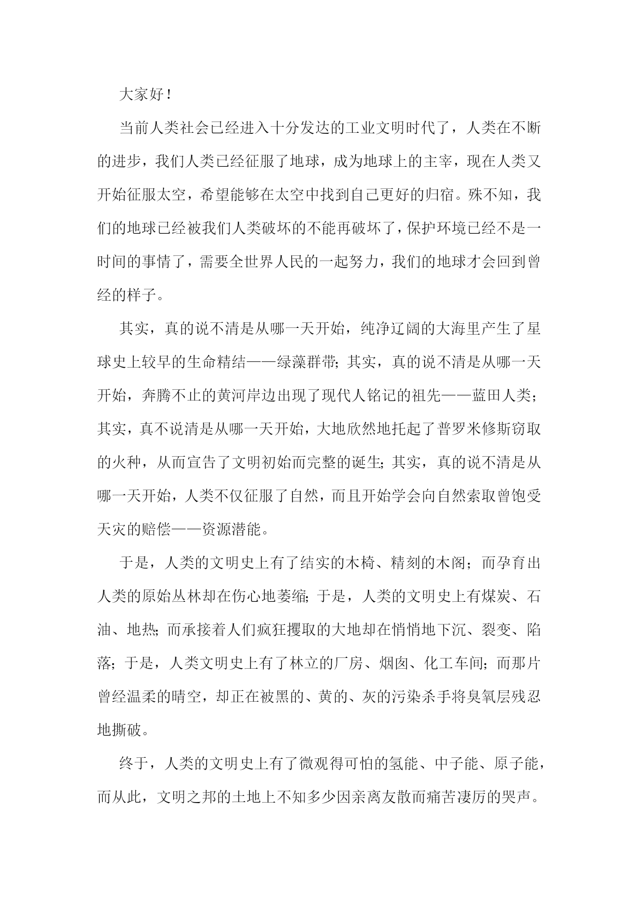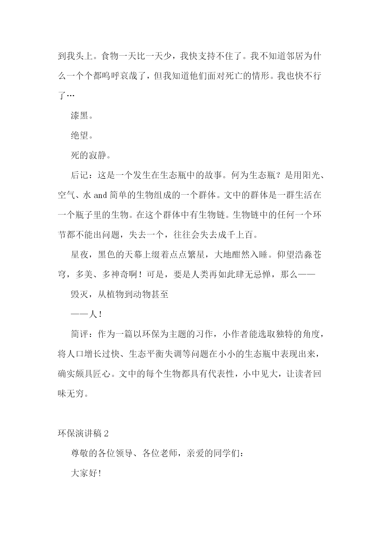 环保演讲稿15篇环保演讲稿1老师同学们:早上好!我认为美丽的生态造就未来,金鱼总要懒洋洋地洗几个小时的阳光浴。水草可受不了,一到这时就哭天喊地。而我,总把身子缩在壳里,蒙头睡大觉。骄阳似火,酷热,奇闷,简直要使我的细胞由颤抖而炸裂了。忍受,深深深呼吸。时间从20xx年的尾巴上掉到了20xx年的头上。我们这个生态瓶中没有什么大变化。太阳,去了还来;空气,陈年老酿;水,仍旧苦涩。日子像没有放盐的蛋炒饭。主人每天都用那双比我整个身体还大的牛眼盯着我们看。有时还把我们的家——这个生态瓶放在手上摇一摇,弄得瓶子里天翻地覆、不得安宁。金鱼的细胞分裂速度快得惊人,现在这里有很多小金鱼。氧气好像不多了。胸闷。忍受,深深深呼吸。水草成天被阳光晒得无精打采,金鱼则抱怨水中呛人的气味。我呢,总感到很热,好像生态瓶被无休止地加热,这估计就是什么温室效应吧。氧气不多了,呼吸急促。水草,那个辉煌一时的舞者,已经一片一片地凋零。“看来水草活不长了。”金鱼们幸灾乐祸。的确,水草的生命在今天或者明天就要停止。他是晒死的?呛死的?热死的?这无从说起。总之,生态瓶里是金鱼们的天下了。一转眼,又是几个昼夜,金鱼们也唉声叹气起来,终于一个个肚皮朝上了。而我,成天生活在恐惧之中,生怕死神的阴影哪一天也降到我头上。食物一天比一天少,我快支持不住了。我不知道邻居为什么一个个都呜呼哀哉了,但我知道他们面对死亡的情形。我也快不行了…漆黑。绝望。死的寂静。后记:这是一个发生在生态瓶中的故事。何为生态瓶?是用阳光、空气、水and简单的生物组成的一个群体。文中的群体是一群生活在一个瓶子里的生物。在这个群体中有生物链。生物链中的任何一个环节都不能出问题,失去一个,往往会失去成千上百。星夜,黑色的天幕上缀着点点繁星,大地酣然入睡。仰望浩淼苍穹,多美、多神奇啊!可是,要是人类再如此肆无忌惮,那么——毁灭,从植物到动物甚至——人!简评:作为一篇以环保为主题的习作,小作者能选取独特的角度,将人口增长过快、生态平衡失调等问题在小小的生态瓶中表现出来,确实颇具匠心。文中的每个生物都具有代表性,小中见大,让读者回味无穷。环保演讲稿2尊敬的各位领导、各位老师,亲爱的同学们:大家好!我叫xx,我是班里的文艺委员,我演讲的题目是《低碳生活,环保节能》。近几年,低碳环保这个词语越来越热门,因为低碳环保是一种生活方式。低碳生活是指生活作息中所耗用的能量,要尽量减少,从而减低碳排放量,特别是二氧化碳的。排放。每个人都知道,地球是我们赖以生存的家园,我们吸入氧气,呼出二氧化碳,我们不能不呼吸,所以,节能环保是我们早就应该做到的。有些人认为,低碳生活很艰难,其实不然,降低碳排放有很多方法,在我们日常生活中就可以做到,我们可以从衣食住行等各个方面来体现低碳环保,生活在这个世纪,低碳生活很快就会成为每个人都能做到的一种生活方式。低碳环保不只是一个口号,它还需要付出行动,让我们一起努力,将这个行动付诸于每一个人身上。我的演讲完毕,谢谢大家环保演讲稿3尊敬的各位领导、各位老师,亲爱的同学们:大家好!所有这些环境的恶化,足以引起人们对自身生存环境的重视。近年来,环境问题已超越了国界,成为世界性的热点问题之一,保护人类赖以生存的地球是世界各国人民的共同愿望。我园作为省级的绿色幼儿园更是应该走在环保队伍的最前列。我们将环保教育融入到幼儿园的学习、生活中,真正做到“环境教育,从娃娃抓起”。在年月我园全体幼儿就以自己独特的方式开展了一次别开生面的环保宣传活动。大班级小朋友以“垃圾回收,废品循环再造”为主题开展了一次“环保服装展”。小朋友们所展示的衣服全都是他们自己平日收集的废旧物品所制成的,造型独特,用材新颖,外表美观。当他们走在T台上的时候,心里一定在想着:叔叔、阿姨们,让我们一起来保护环境吧!中班级的小朋友当然也没有闲着,他们拿着横幅、标语组成了一只环保宣传对,以“保护环境,从我做起”为主题进行了社区环保宣传游行。小朋友们将自己制作的环保宣传标语放在社区的各个角落,提醒人们:节约用水、爱护草木、减少噪音等等。小班级的小朋友虽小但也毫不逊色,在幼儿园门外开展了大型长卷画活动,他们用绚丽的色彩告诉大家:“保护环境、你我有责”。在对孩子们进行环保教育时,我们除了让幼儿亲自参与到环保宣传中来以外,还将环保教育渗透到一日的教学中,各班级开展以环保为主题的小型教育教学活动,例如大一班在《水》的探索活动中,举行了一次以“珍爱绿水”为主题的知识竞赛活动。这次活动还邀请了爸爸妈妈们参加,使孩子们不仅巩固了所学的知识,增强了环保意识,还让家长参与到我们的环保队伍中,使家园的联系更进一步。“环境保护,教育为本”,我们会一直坚持这个理念将教学继续下去,让我们的下一代在升上太空,回头观